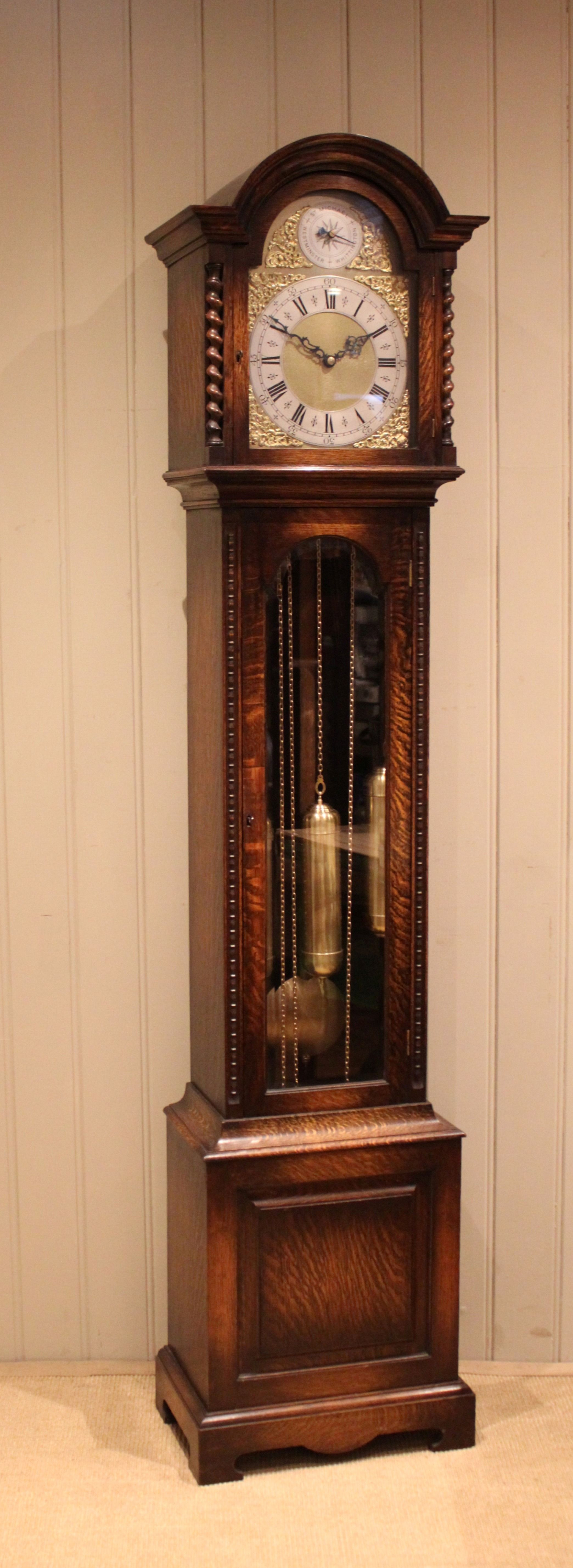 A solid oak Arts and Crafts mantel clock, having a solid oak case inlaid with copper and pewter stringing. It has an enamel dial with a bevel edge glass and a French 8 day lever platform movement.