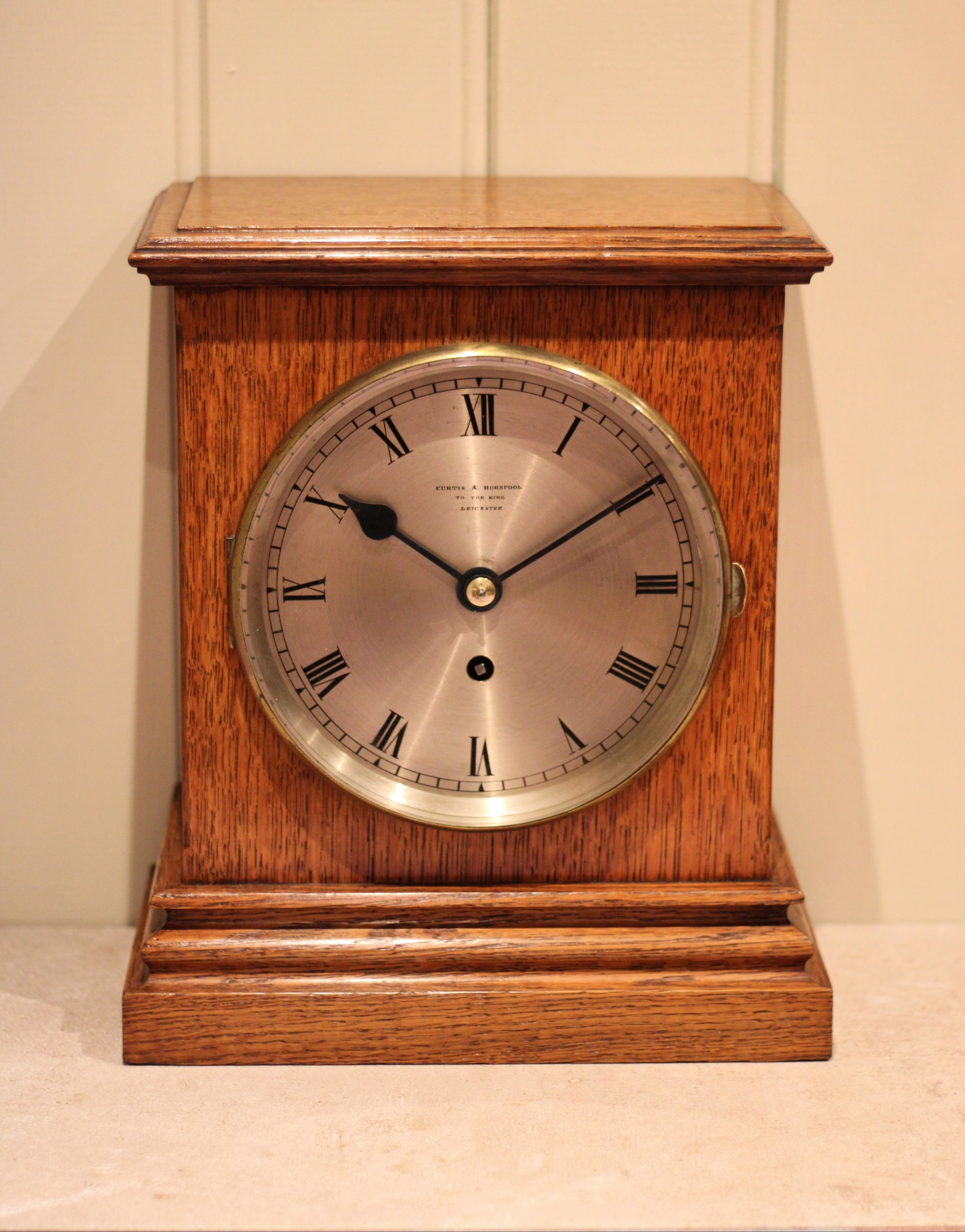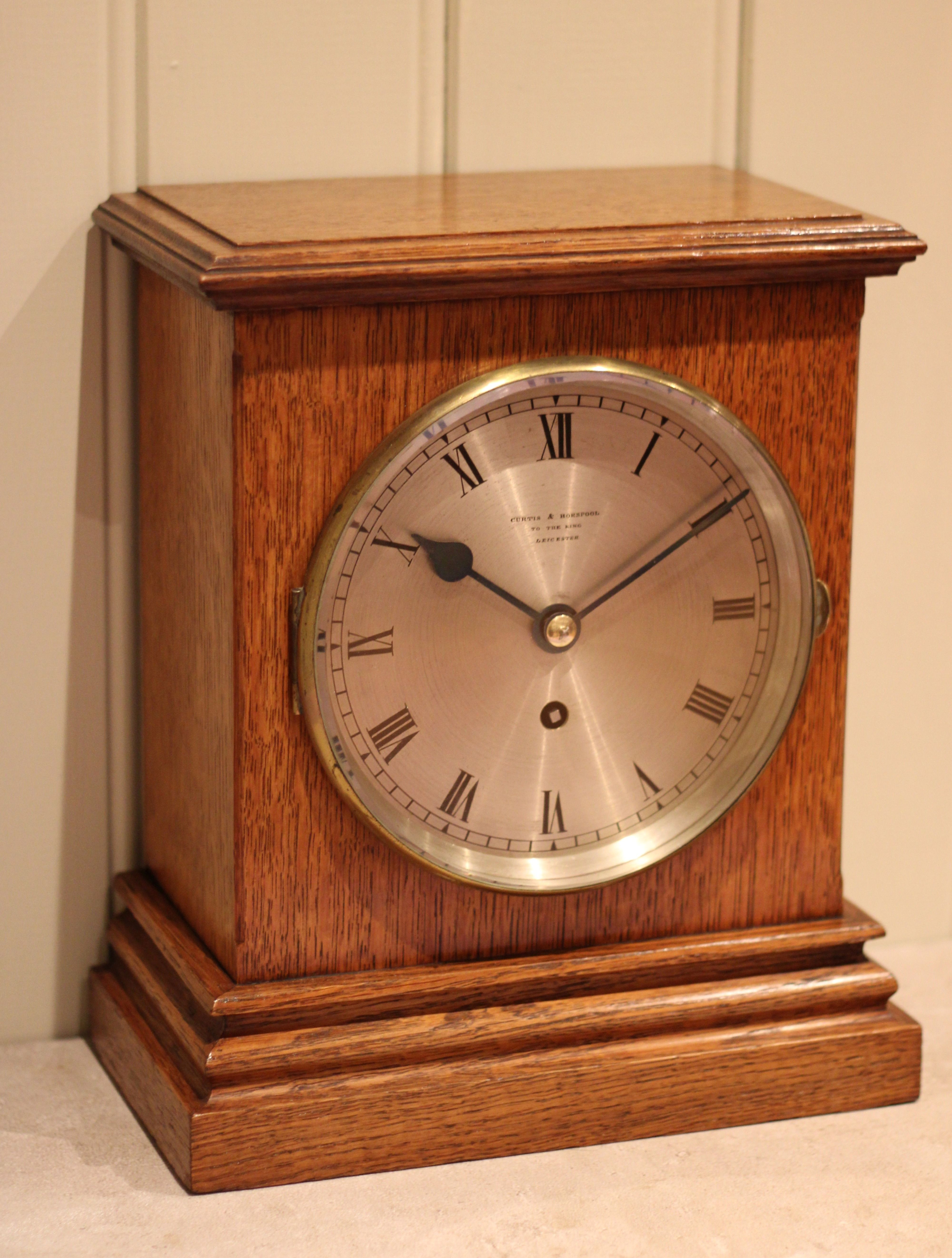 A small good quality English made mantel clock, dating to the early 20th Century. It has an domed top case, with boxwood stringing and figured bird's eye maple veneers throughout. The cast brass bezel has a bevel edge glass with an engraved silvered dial and is signed by the original retailers Cave of Leamington Spa. It has an 8 day movement with a lever platform and was made by the renown firm of Gillet and Johnston of Croydon.