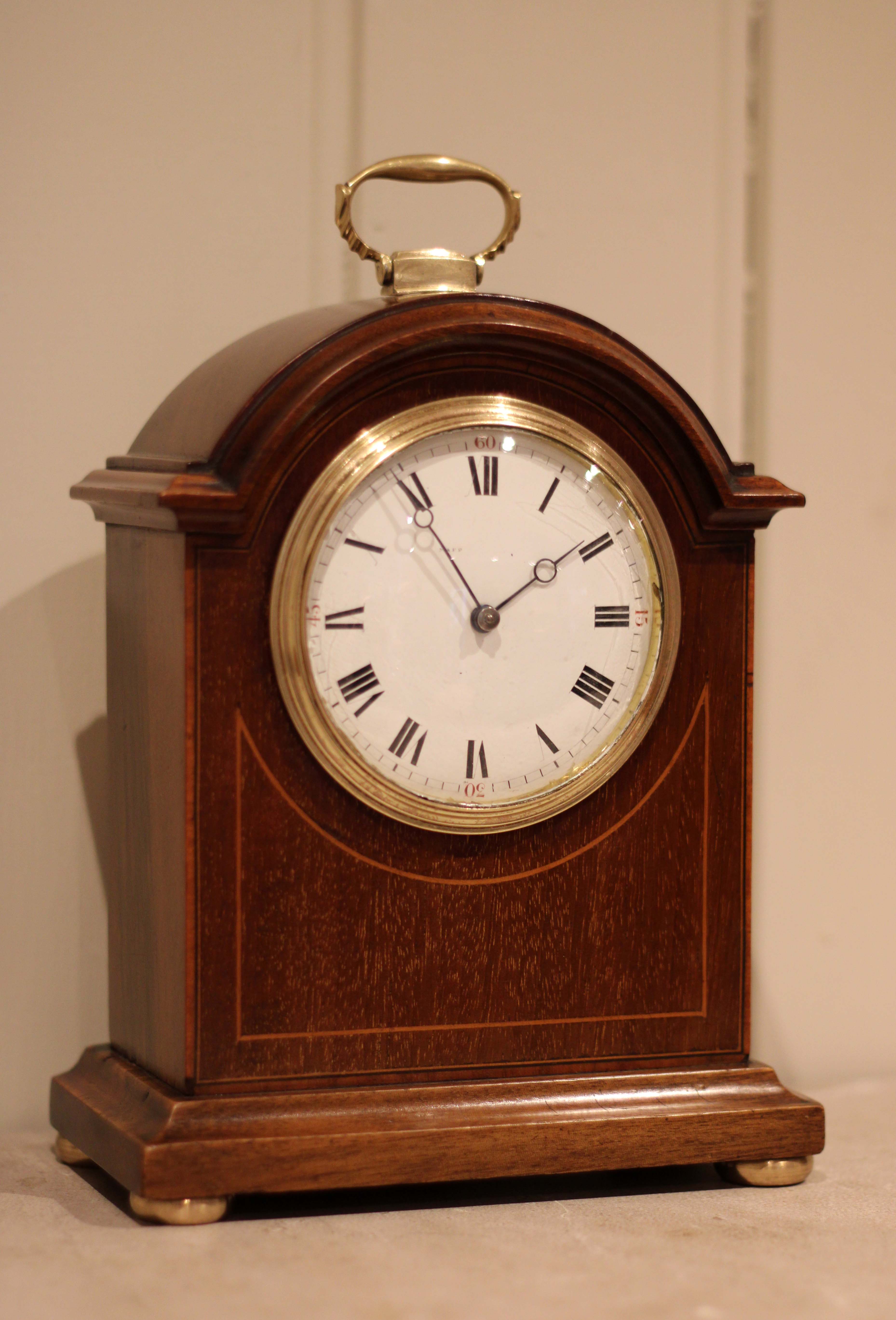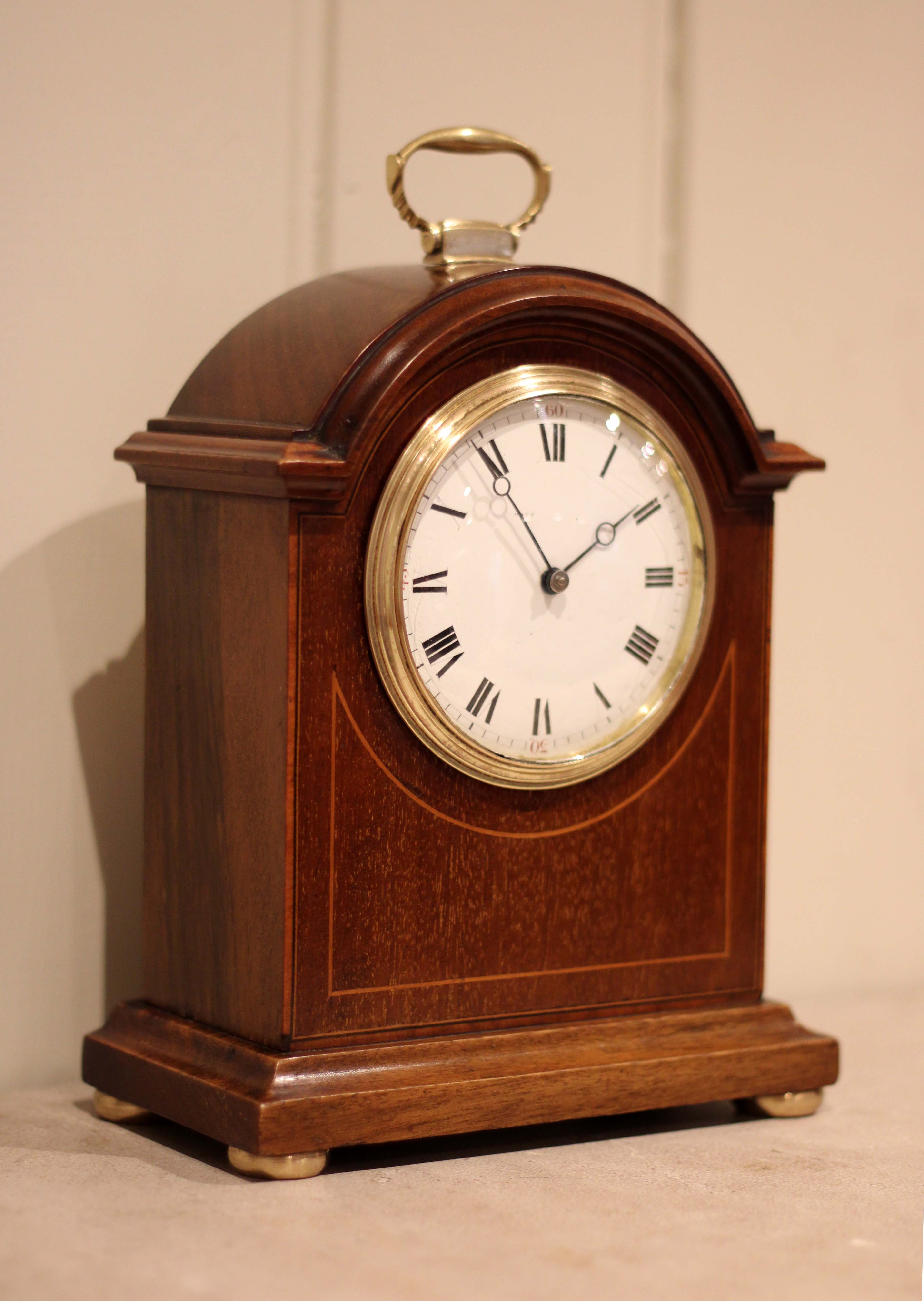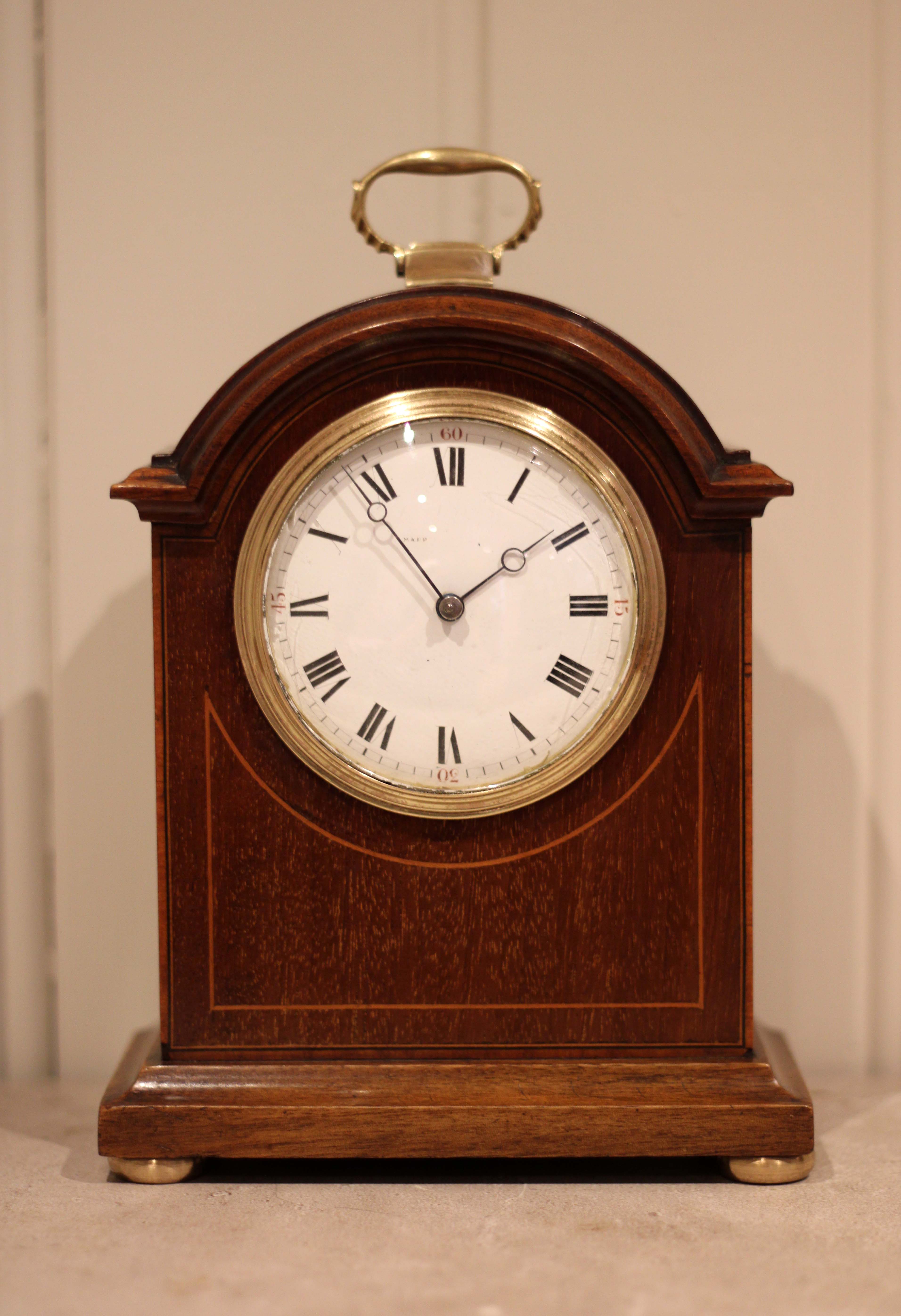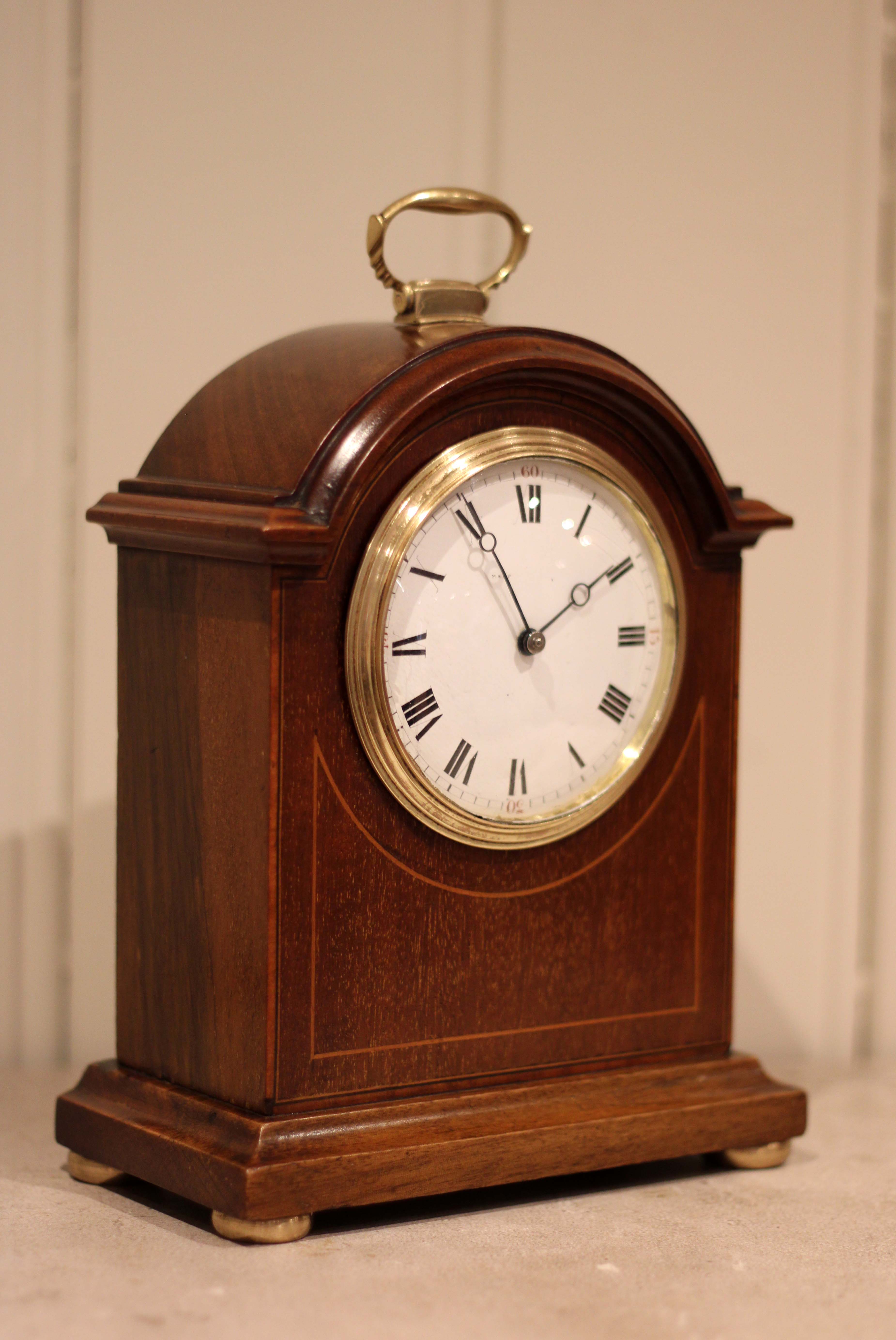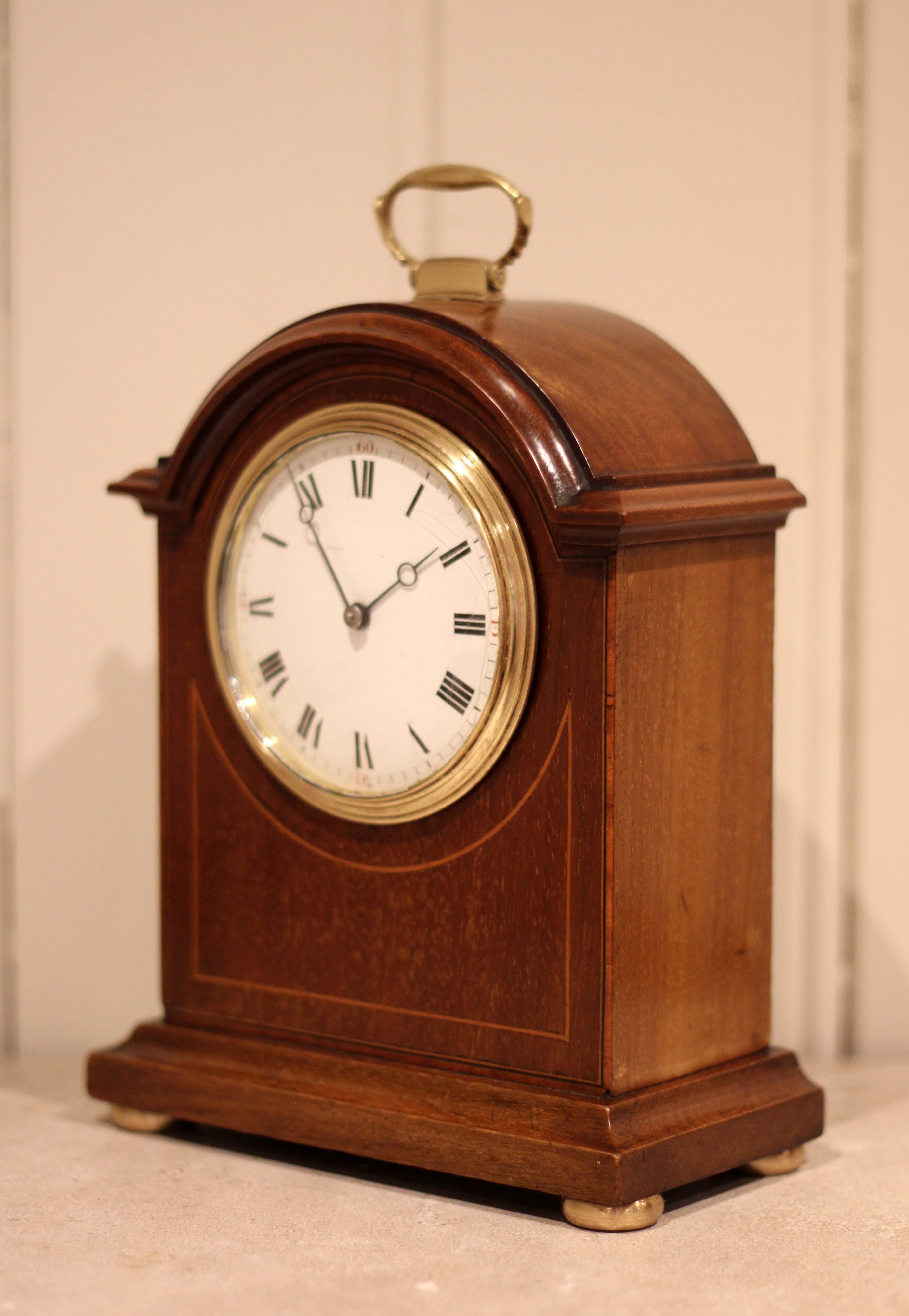 A small, solid mahogany mantel clock. The case has a break arch top, with a brass carrying handle and has a front panel inlaid with mahogany and boxwood stringing. It has a convex enamel dial, with a convex glass. The 8 day movement has a lever platform escapement.(England, c. 1910)