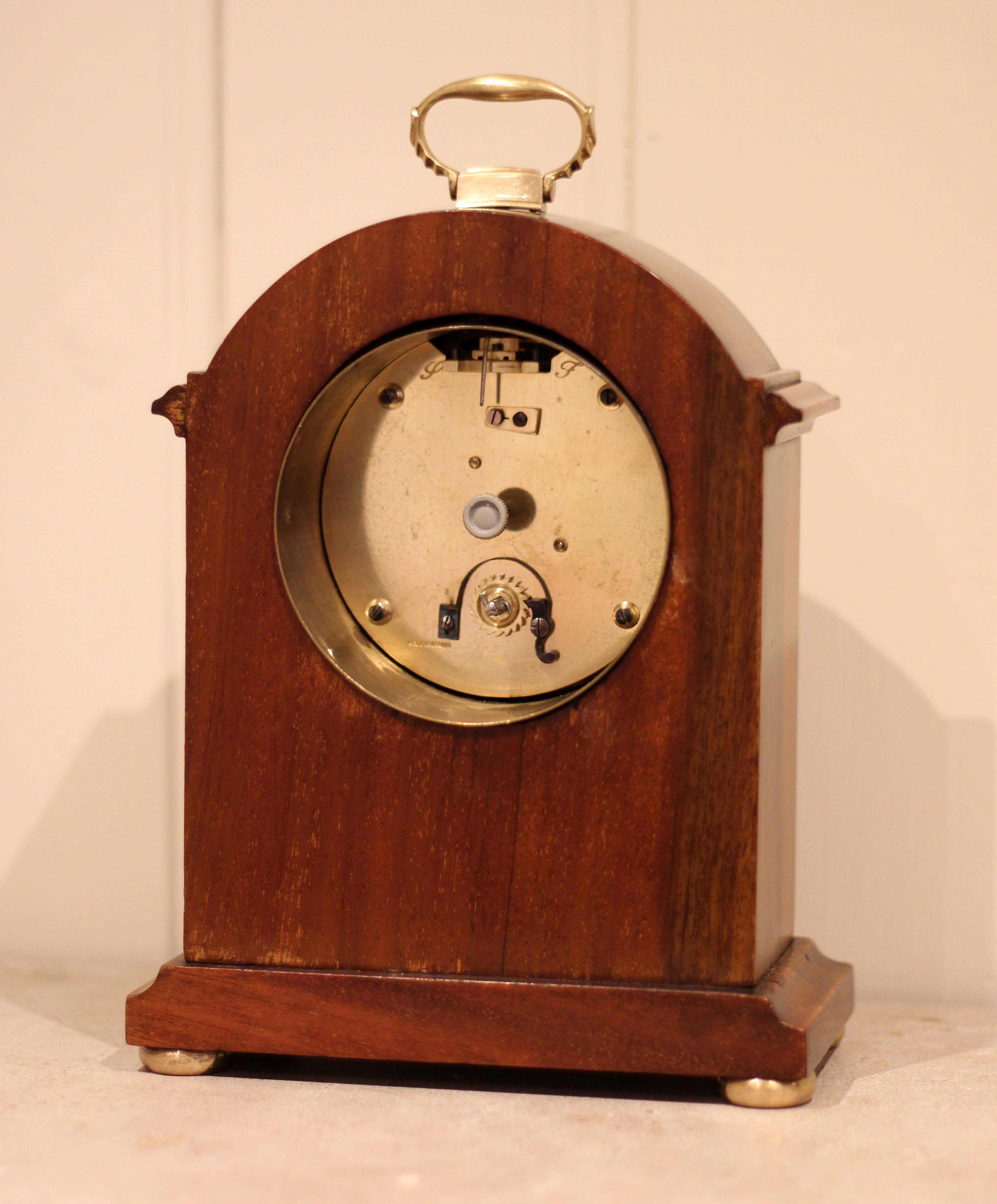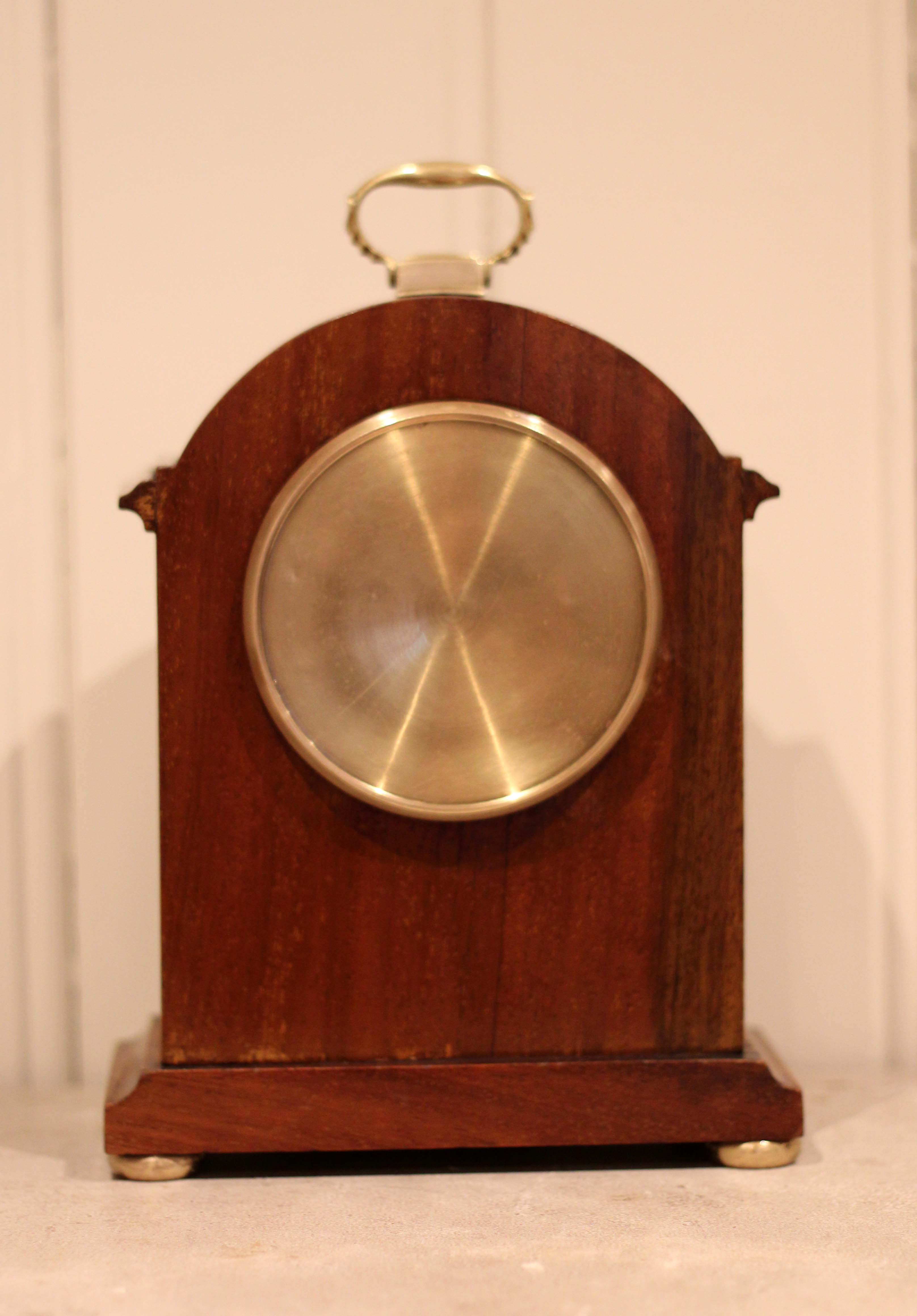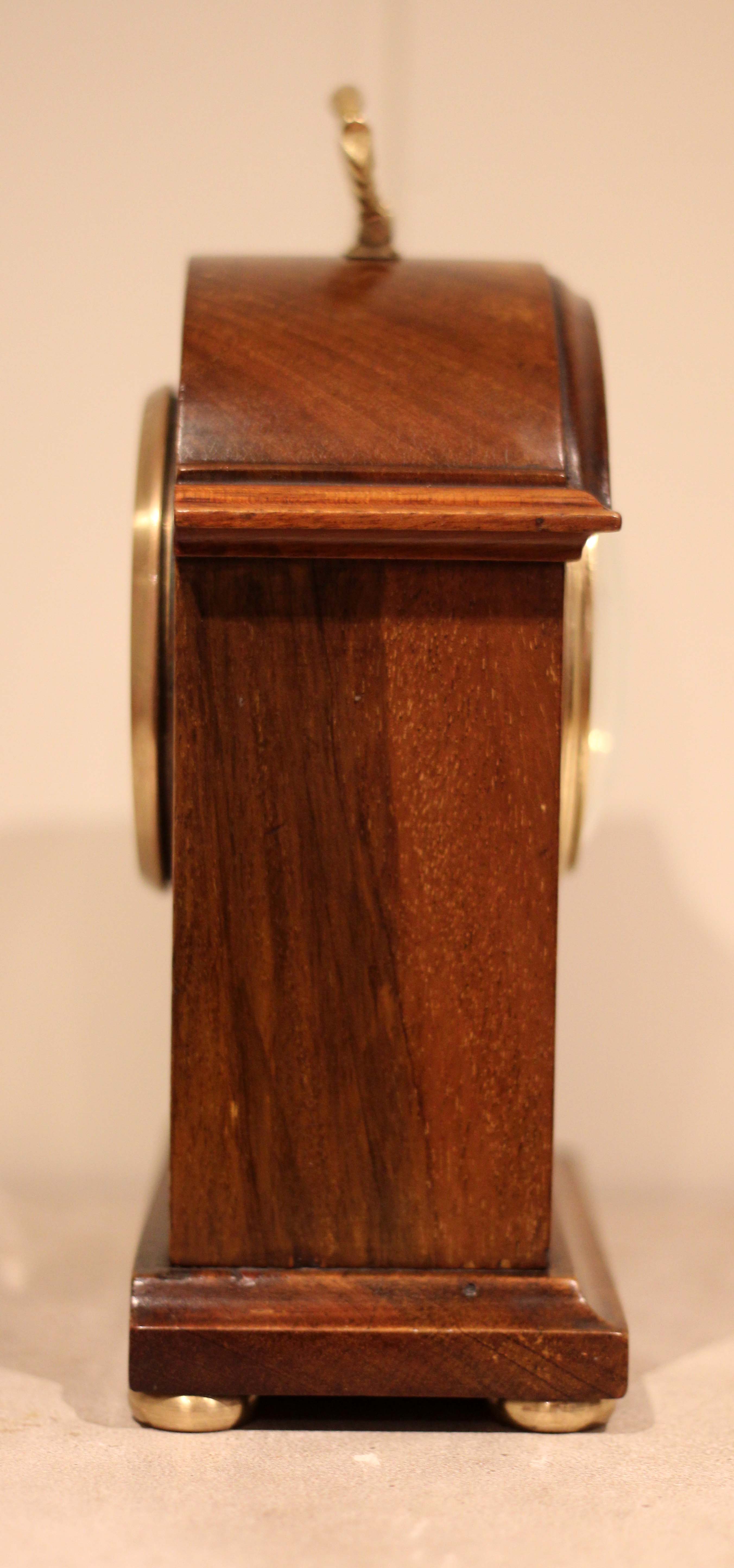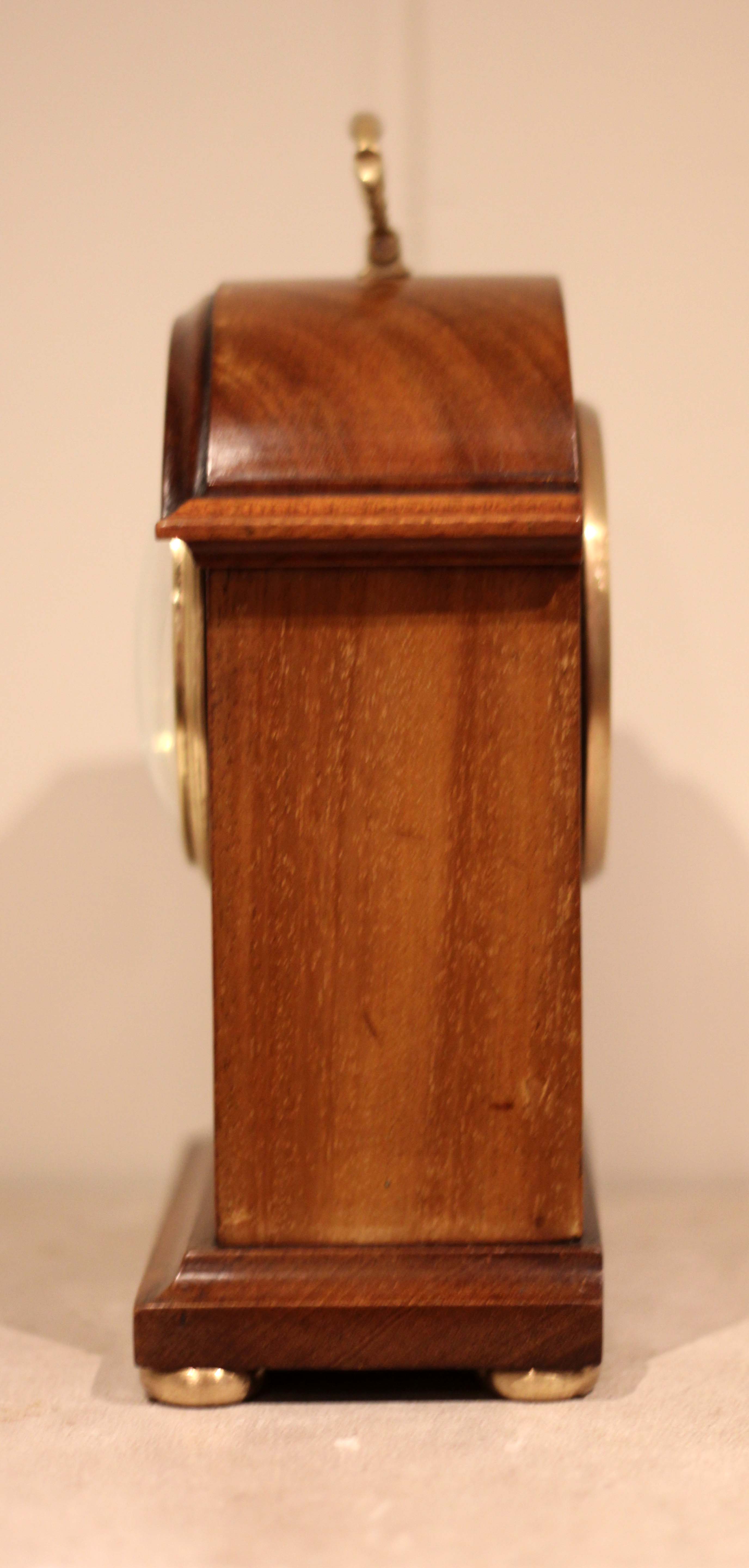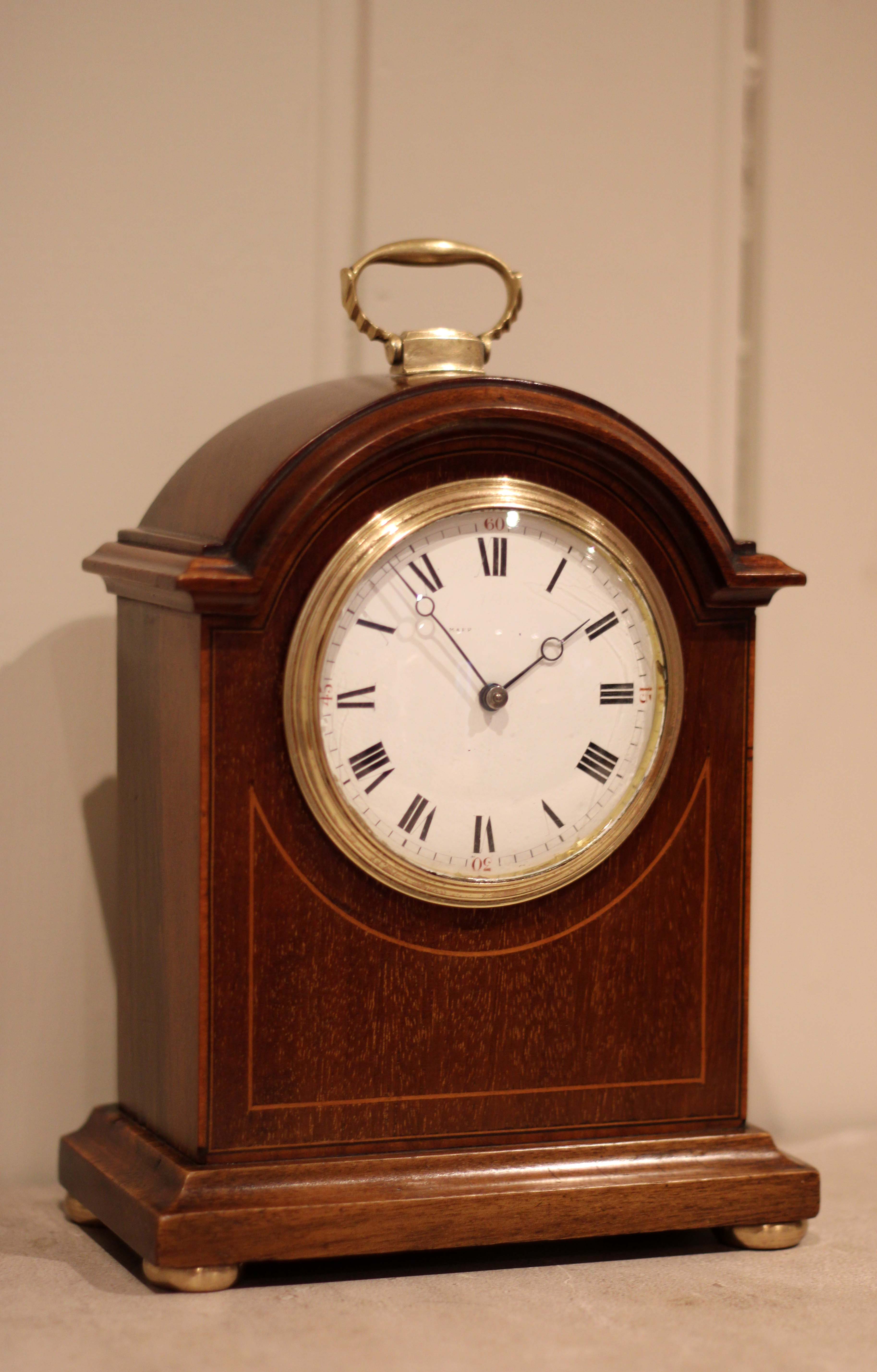 A small, solid mahogany mantel clock. The case has a break arch top, with a brass carrying handle and has a front panel inlaid with mahogany and boxwood stringing. It has a convex enamel dial, with a convex glass. The 8 day movement has a lever platform escapement.(England, c. 1910)