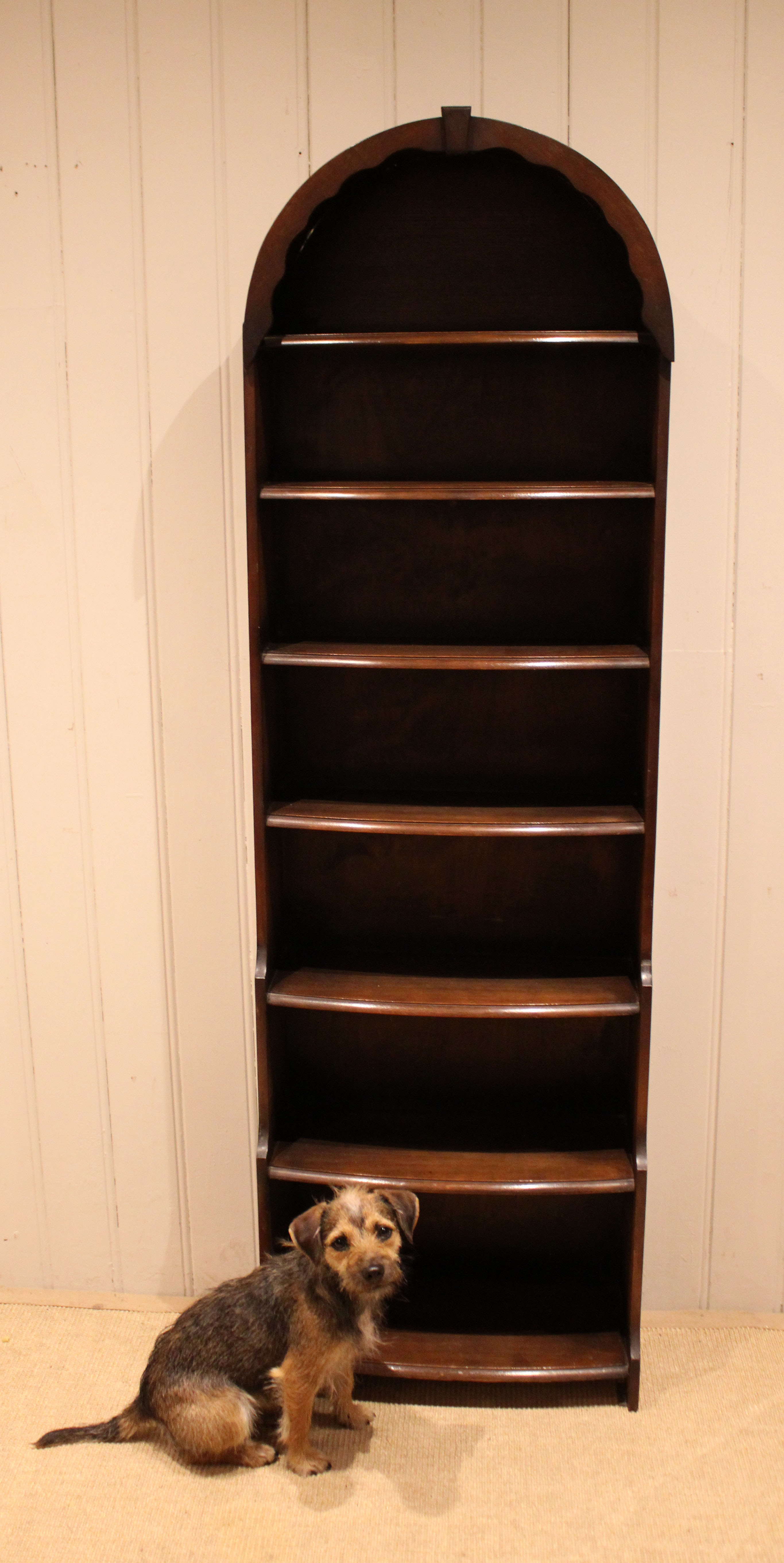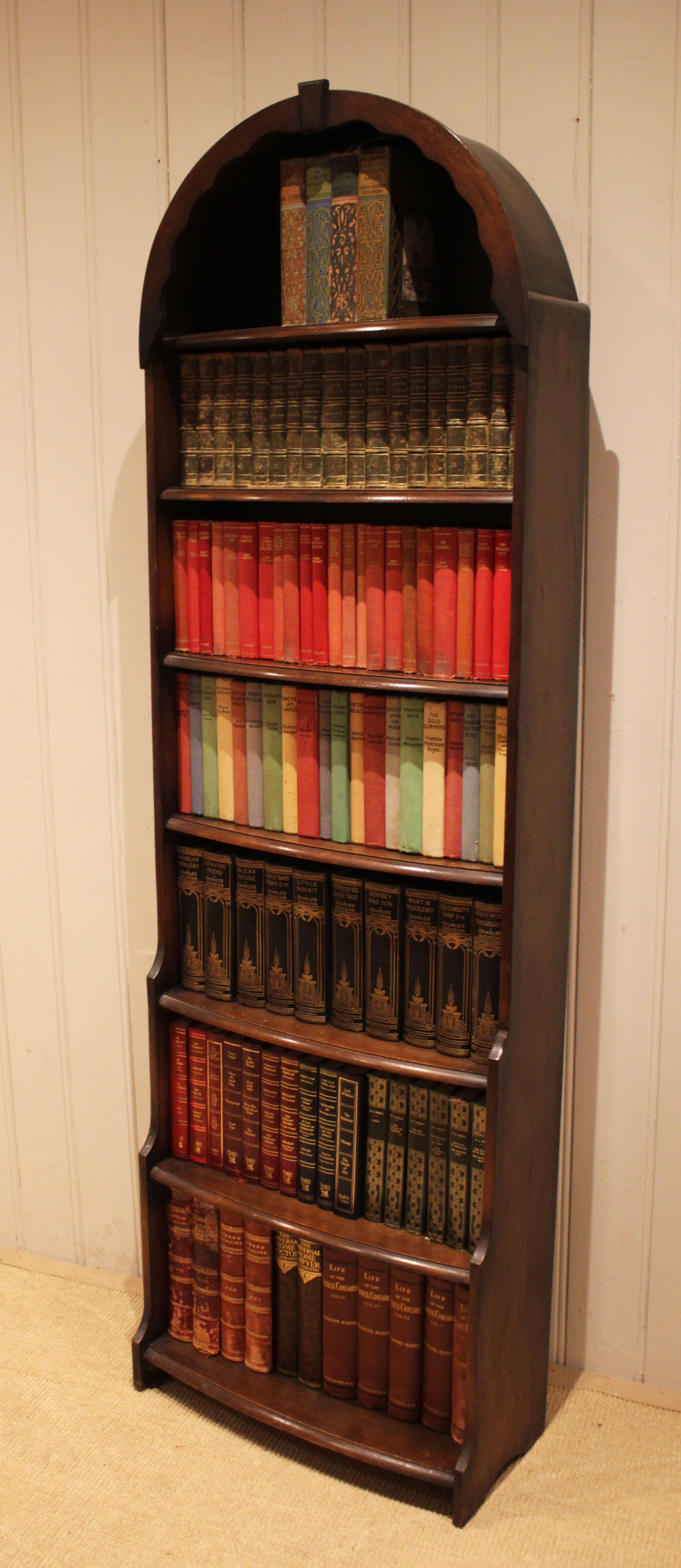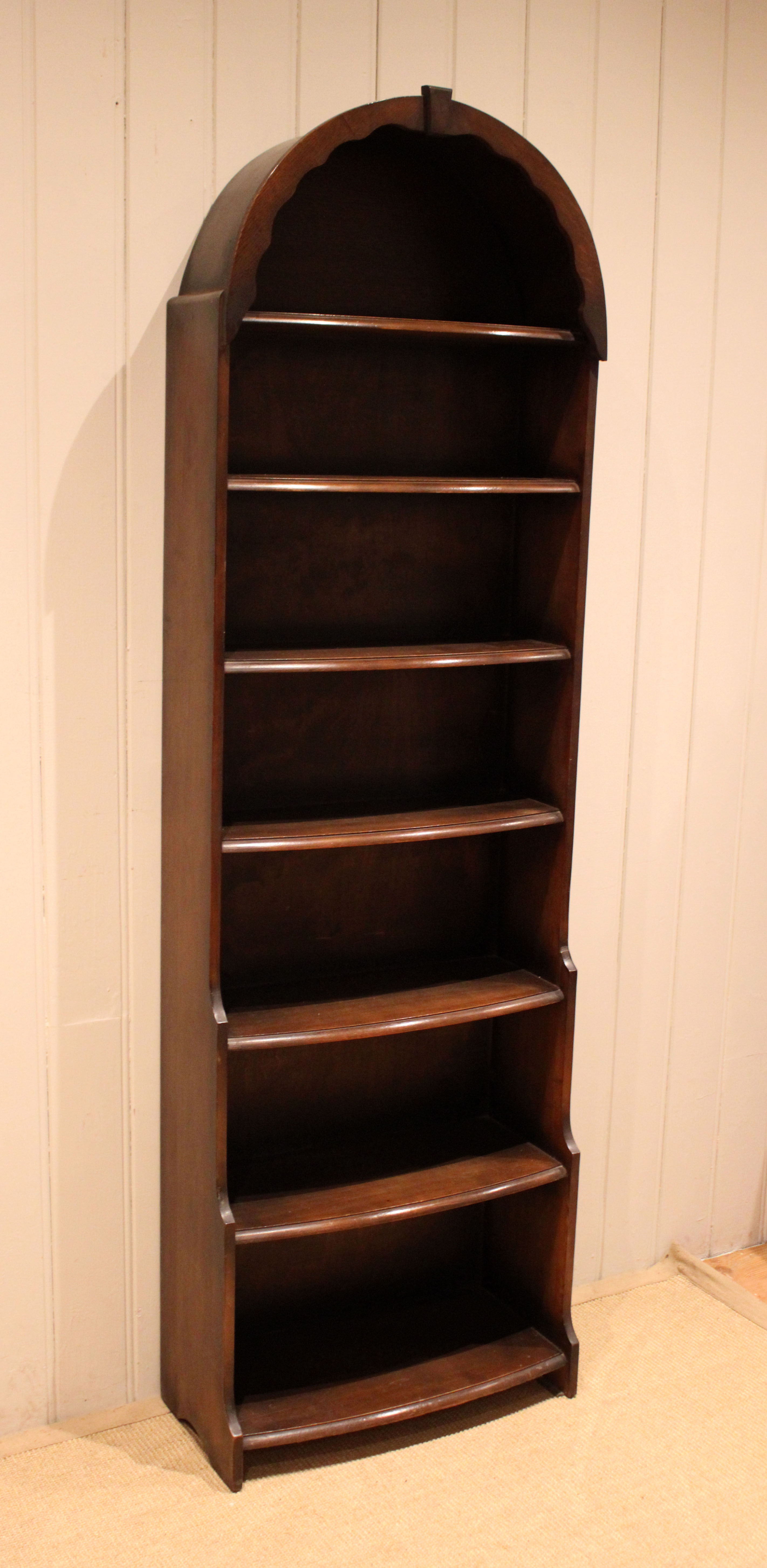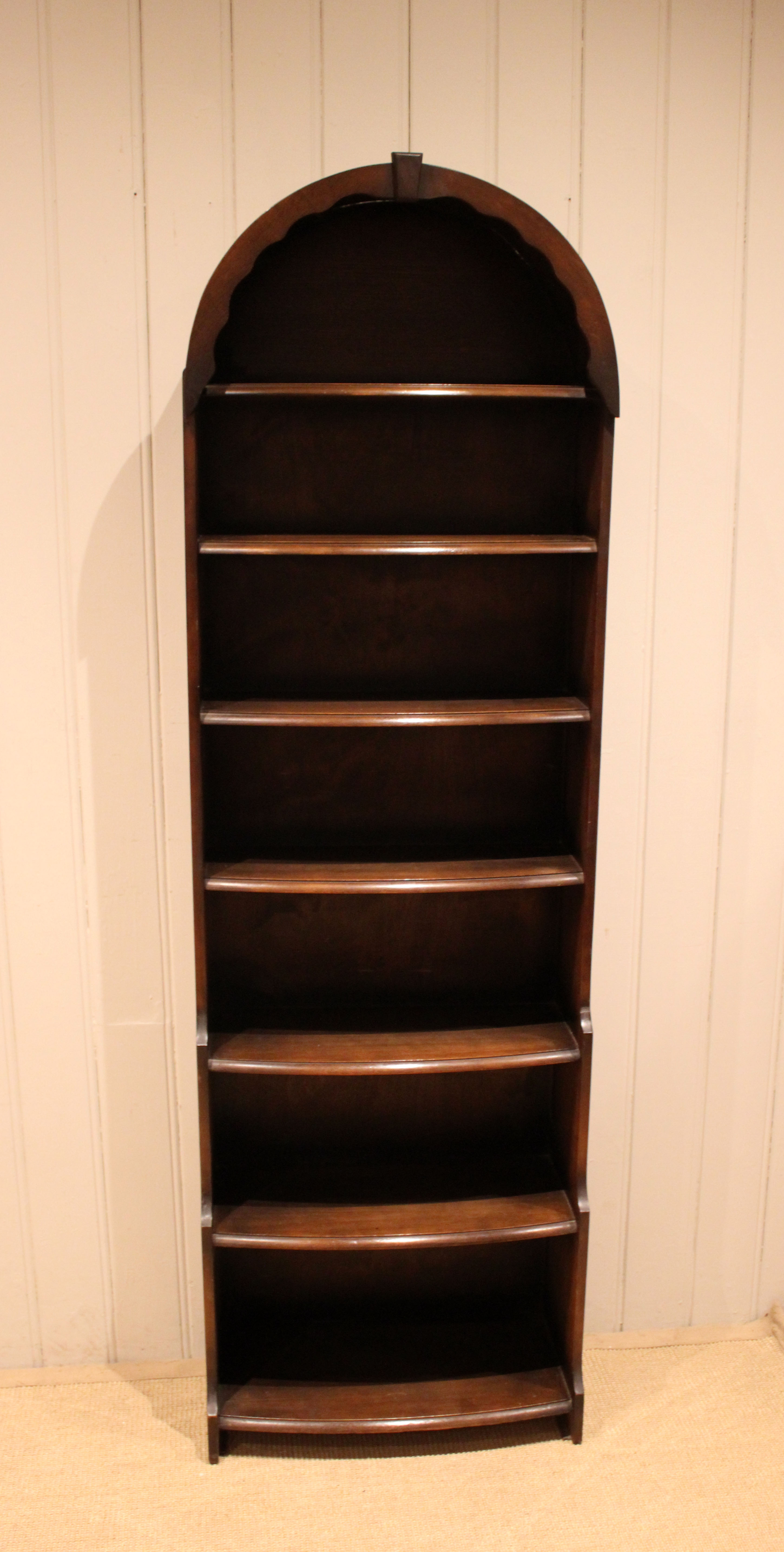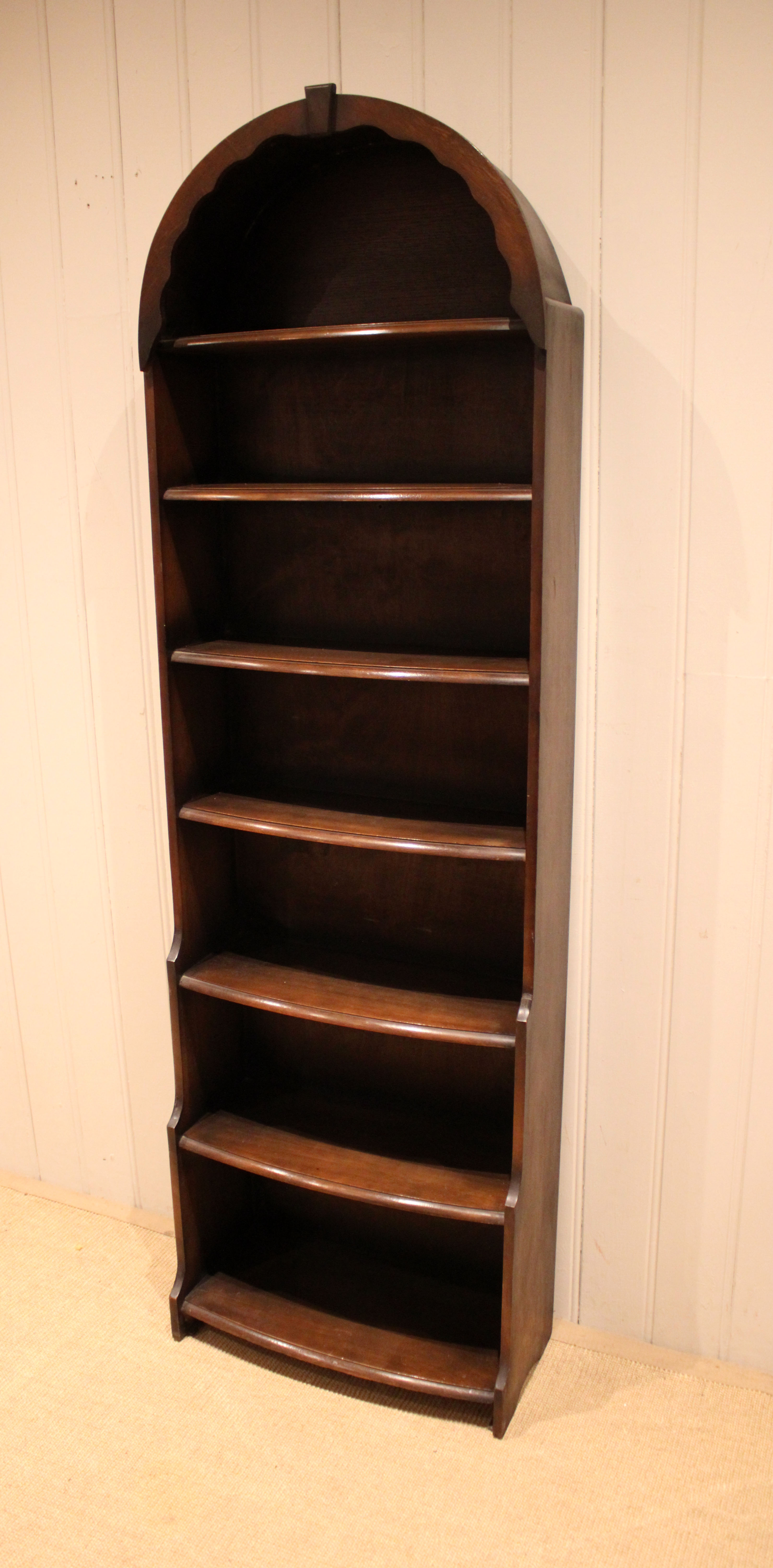 Tall oak arch top open bookcase having seven fixed graduated shelves with a decorative arch top , raised on short supports the shelf dimensions are 49 cm wide and from the bottom upwards 25 cm high x 24.5 cm deep, 22.5 cm high x 21.5 cm deep , 22.5 cm high x 19 cm high , 20 cm high x 16 cm deep , 19 cm high x 16 cm deep , 17 cm high x 16 cm deep and at the top 16 cm deep x 17 cm at the highest point .