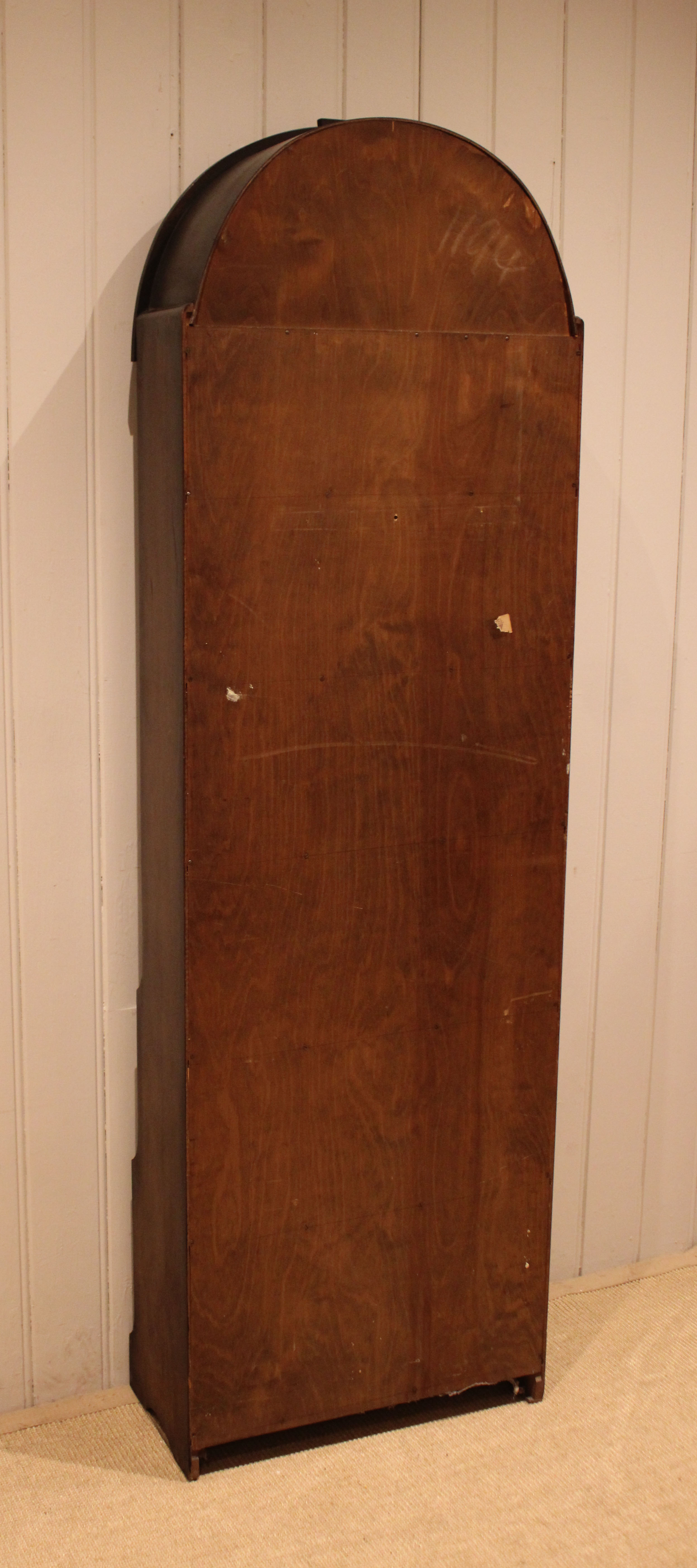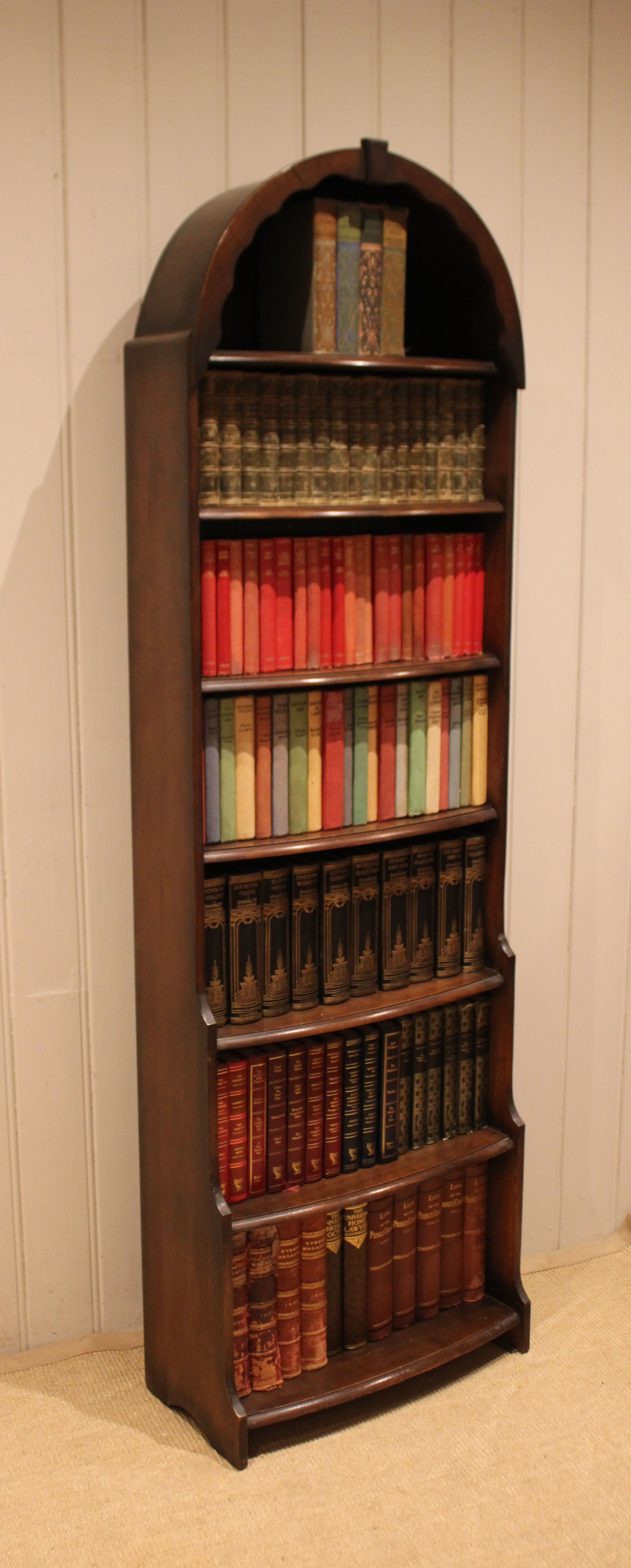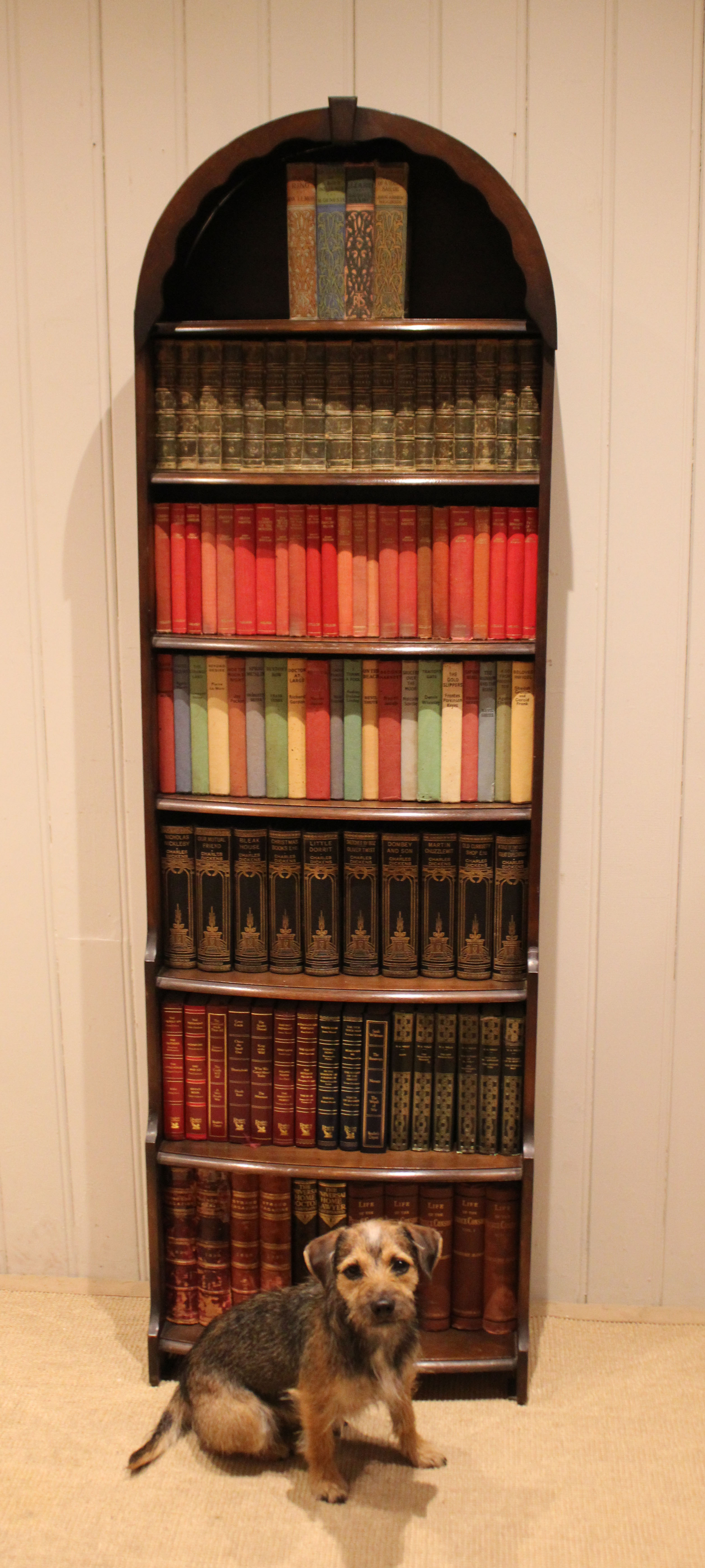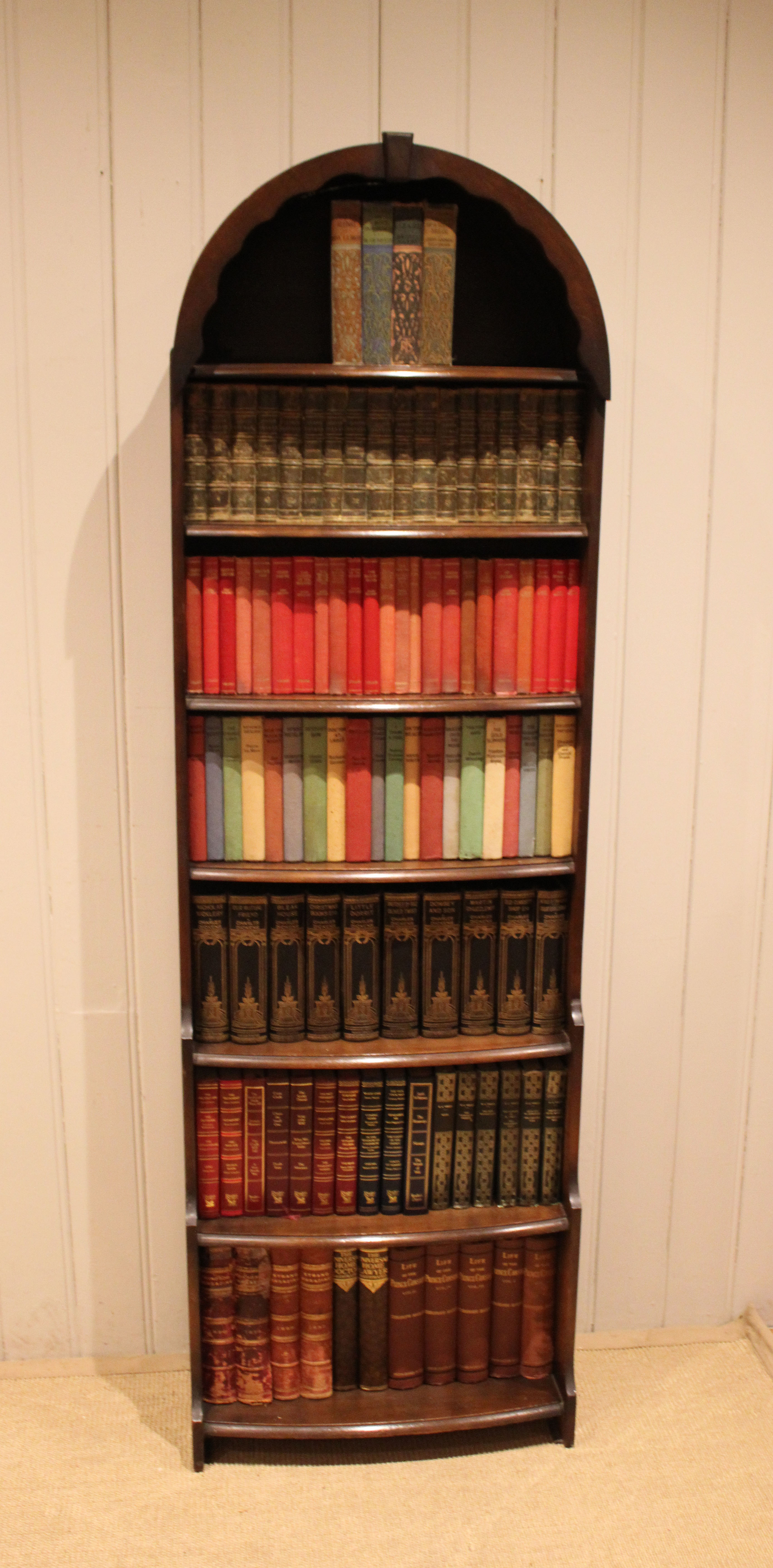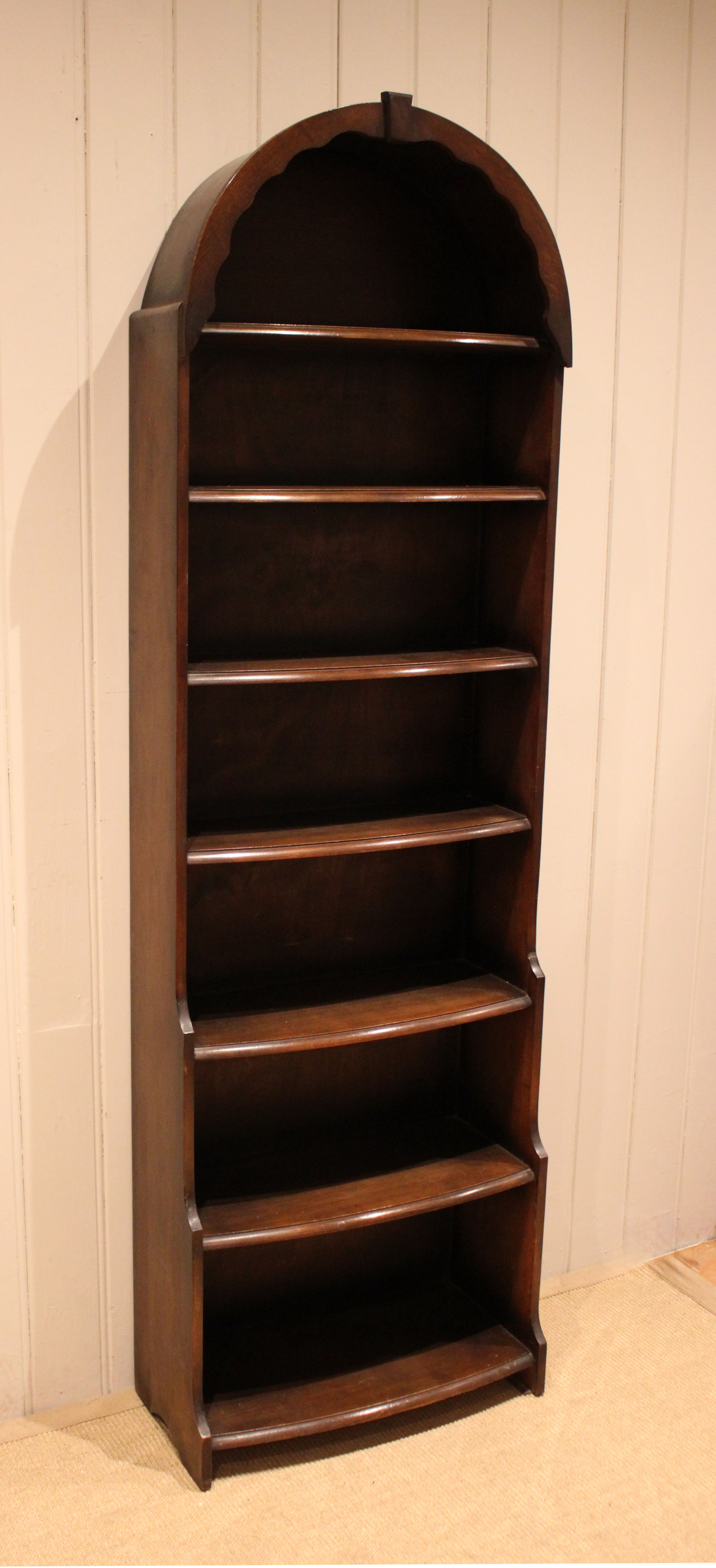 Tall oak arch top open bookcase having seven fixed graduated shelves with a decorative arch top , raised on short supports the shelf dimensions are 49 cm wide and from the bottom upwards 25 cm high x 24.5 cm deep, 22.5 cm high x 21.5 cm deep , 22.5 cm high x 19 cm high , 20 cm high x 16 cm deep , 19 cm high x 16 cm deep , 17 cm high x 16 cm deep and at the top 16 cm deep x 17 cm at the highest point .