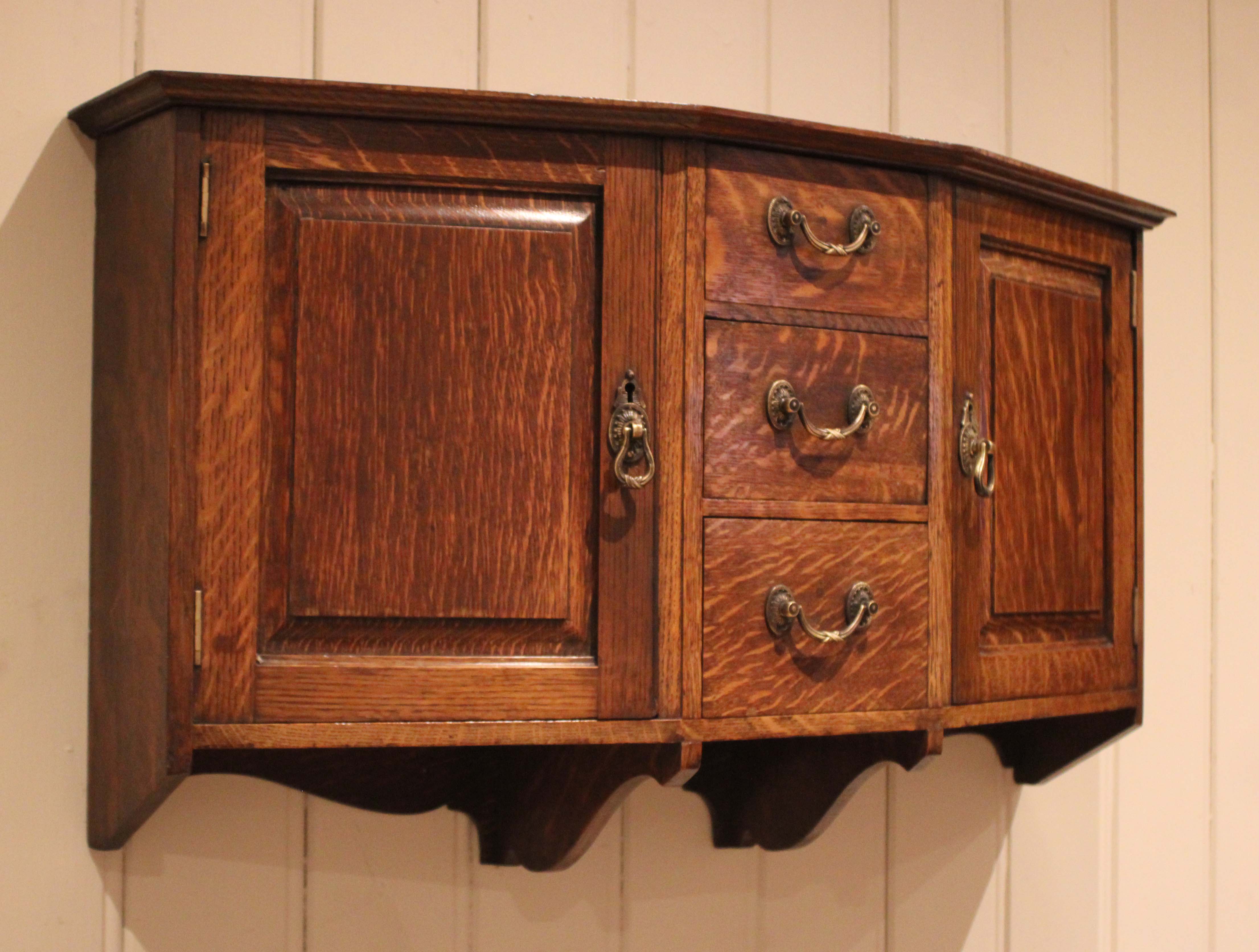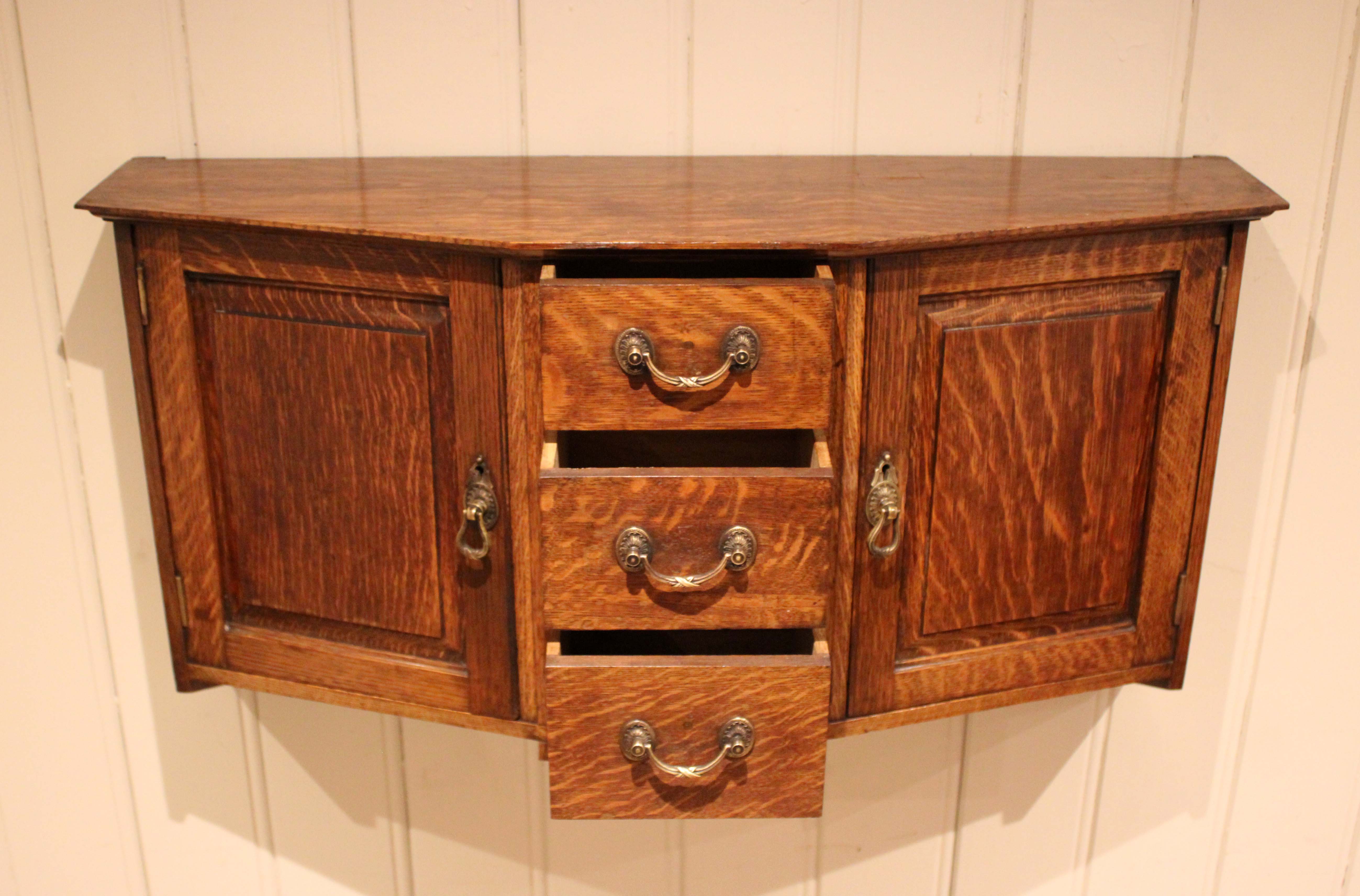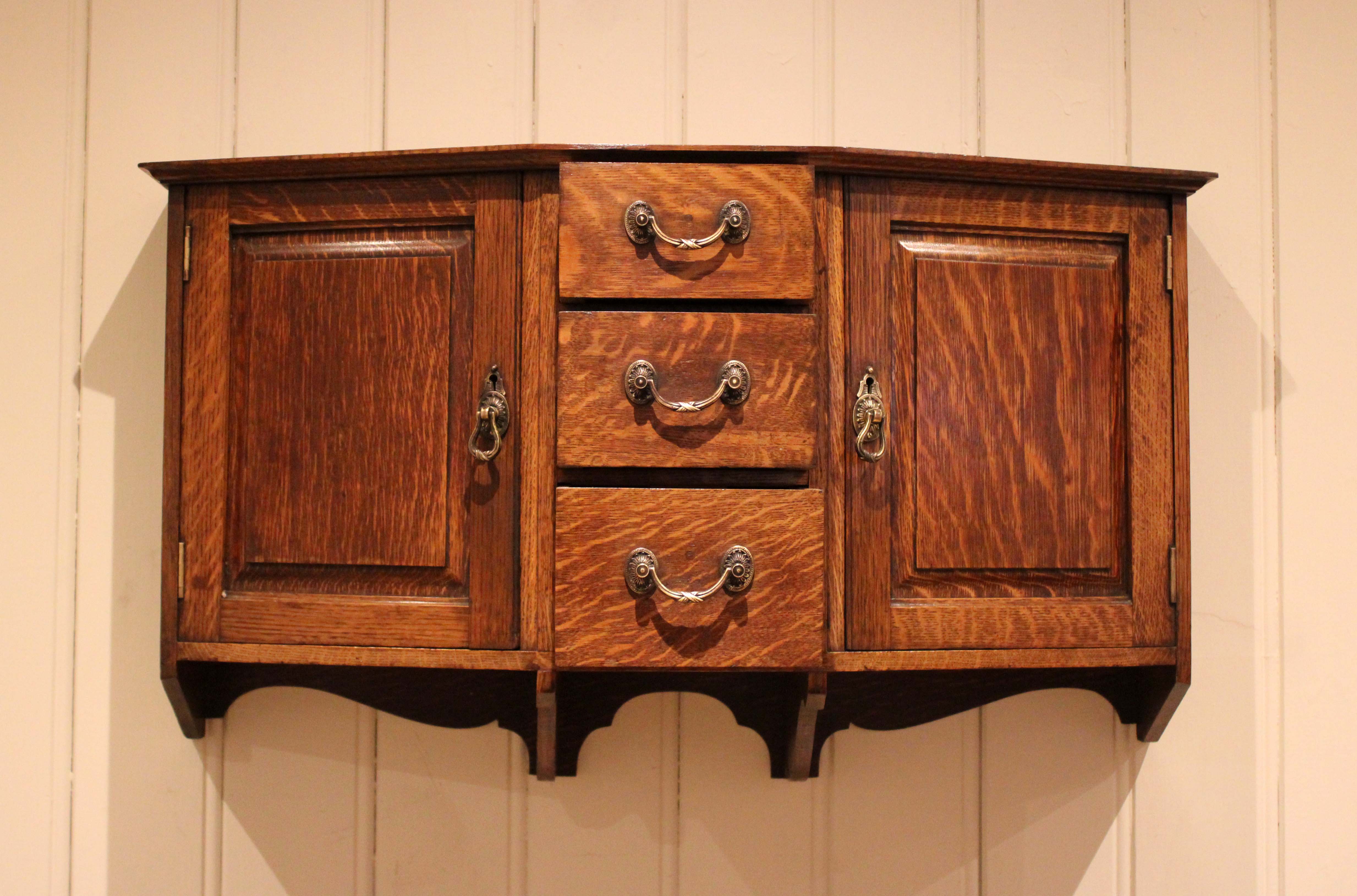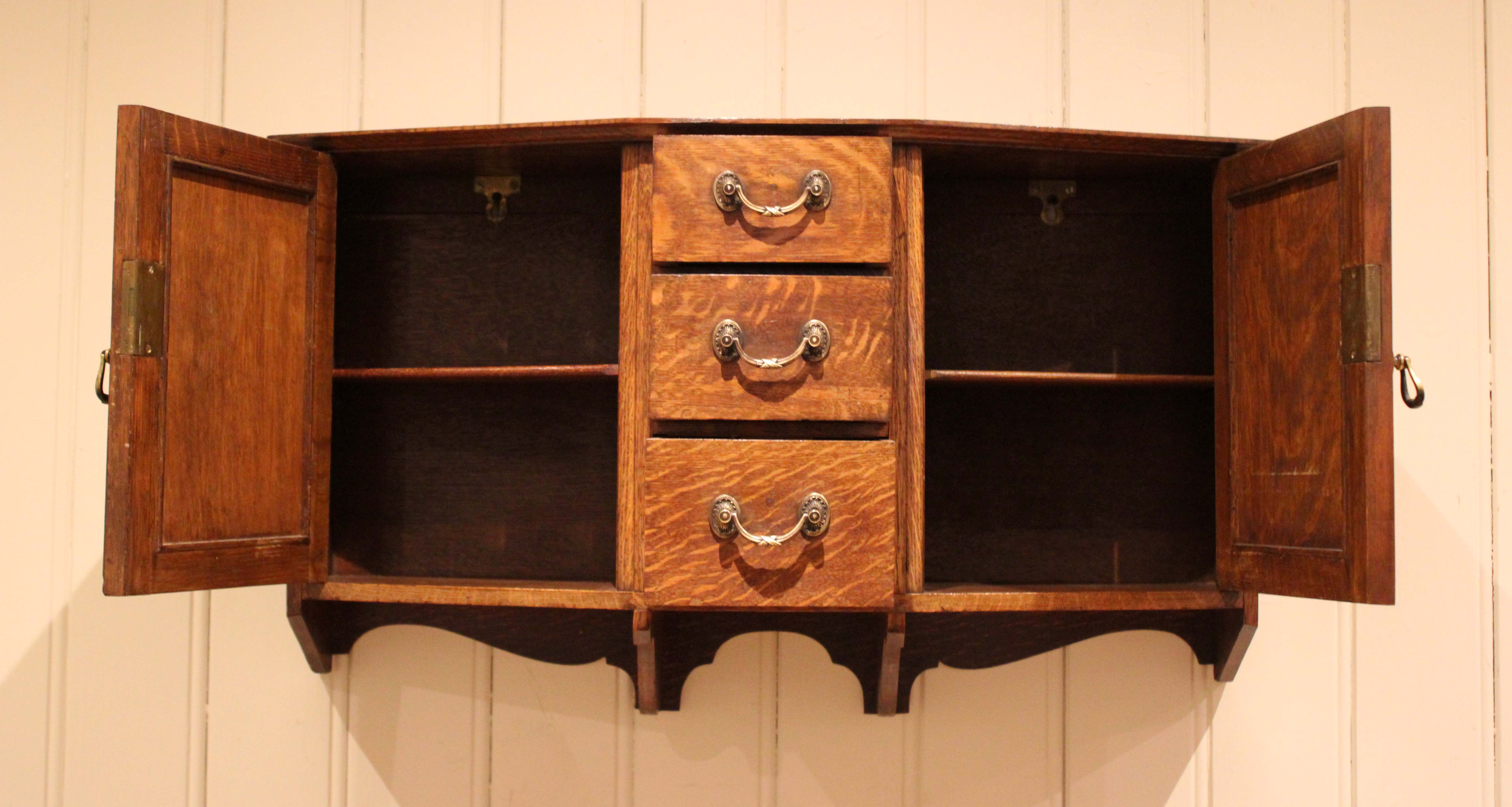 Arts & Crafts oak wall cabinet ( attributed to Shapland & Petter ) having three central drawers flanked by a cupboard to either side , with a shelved interior