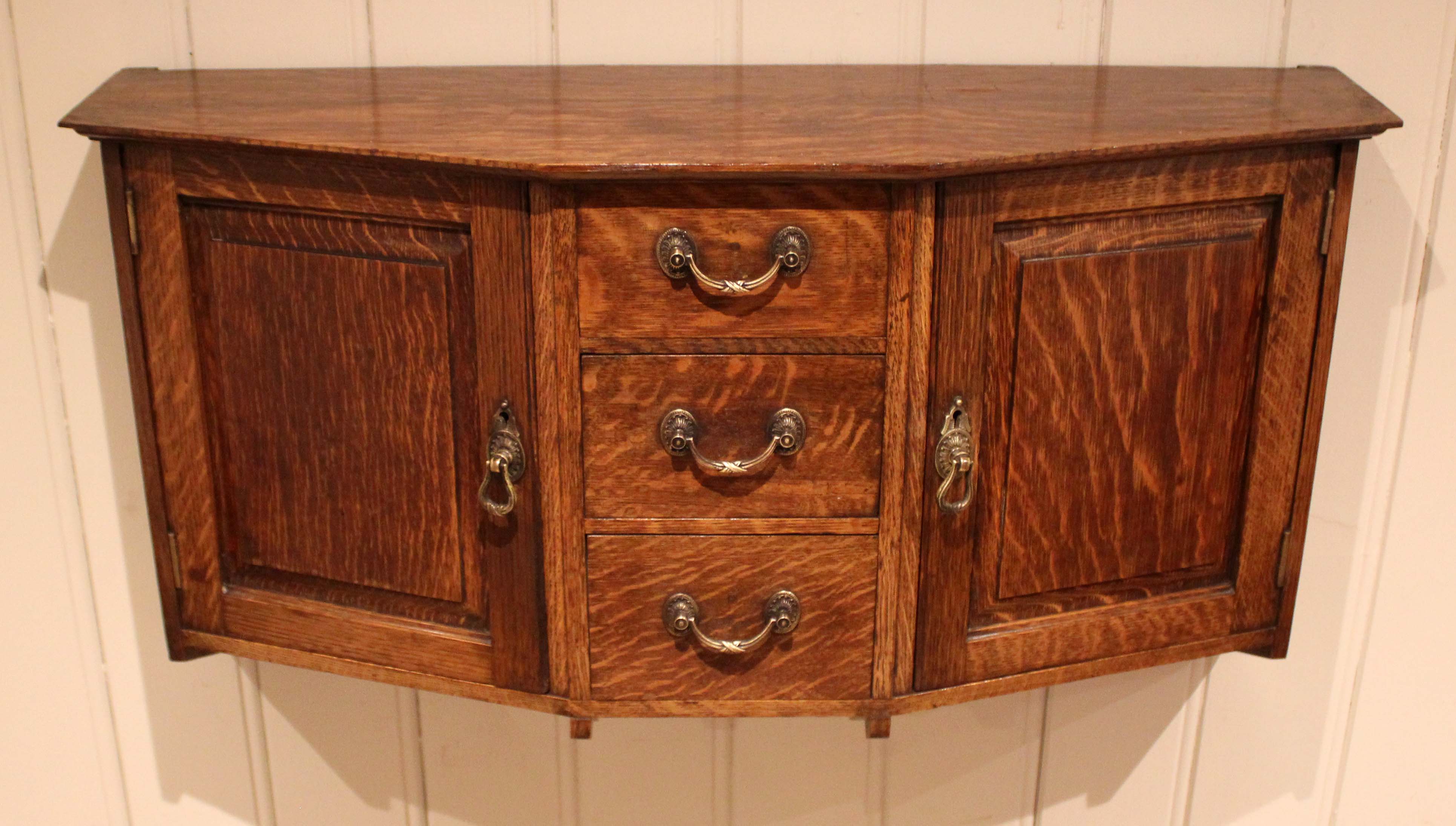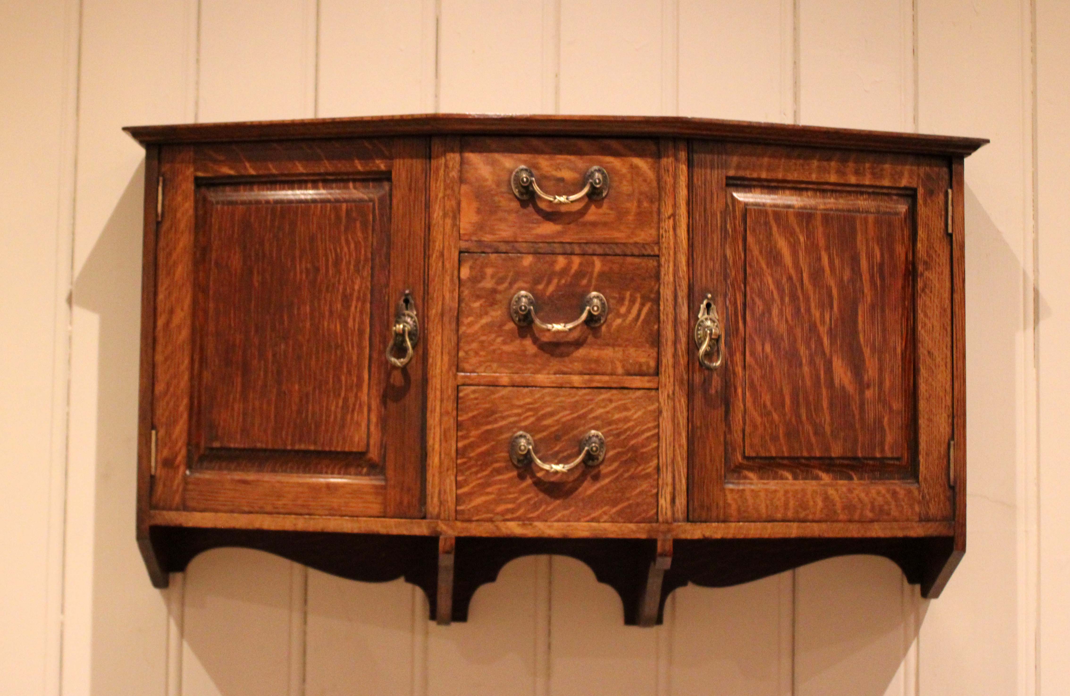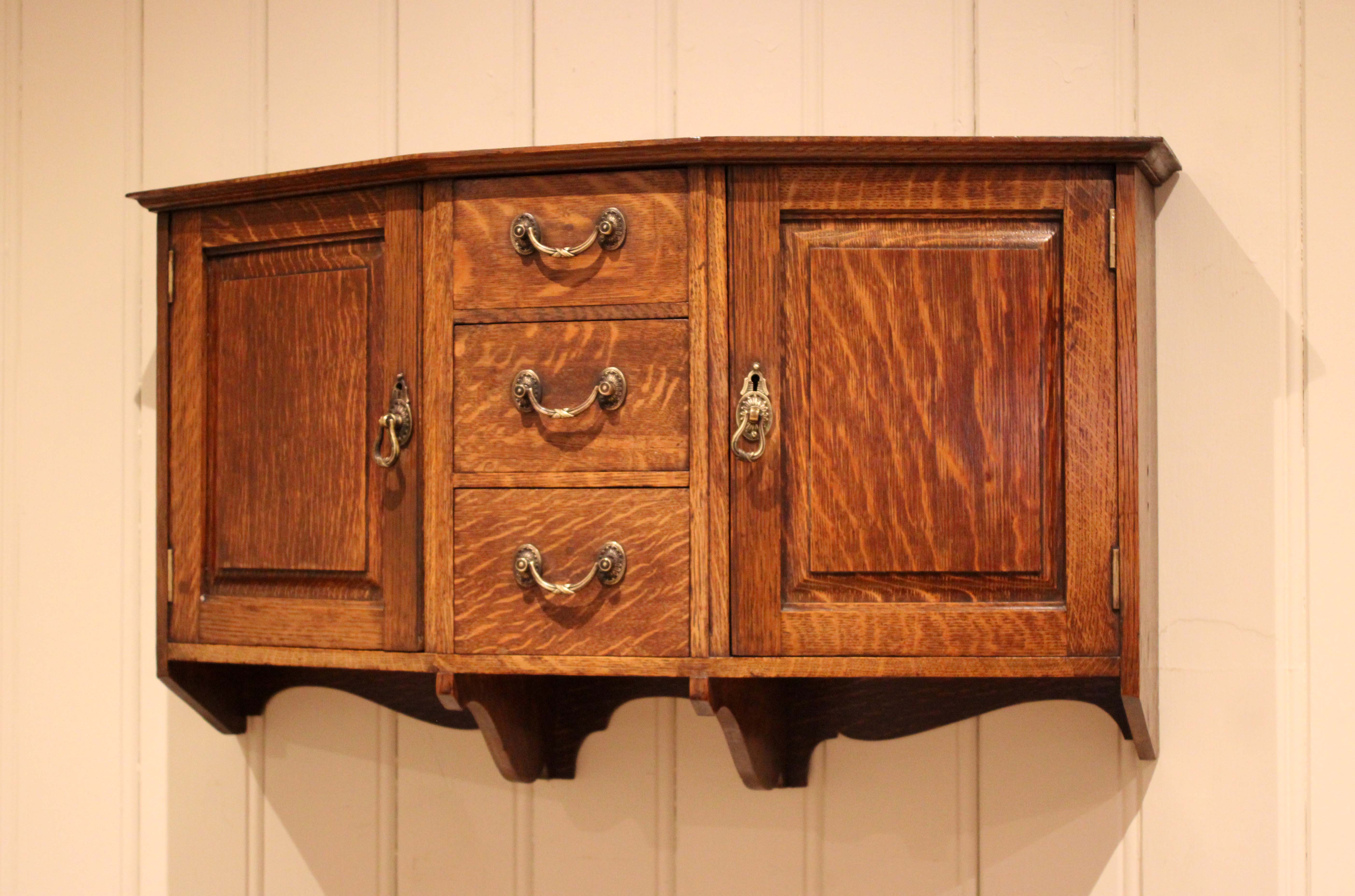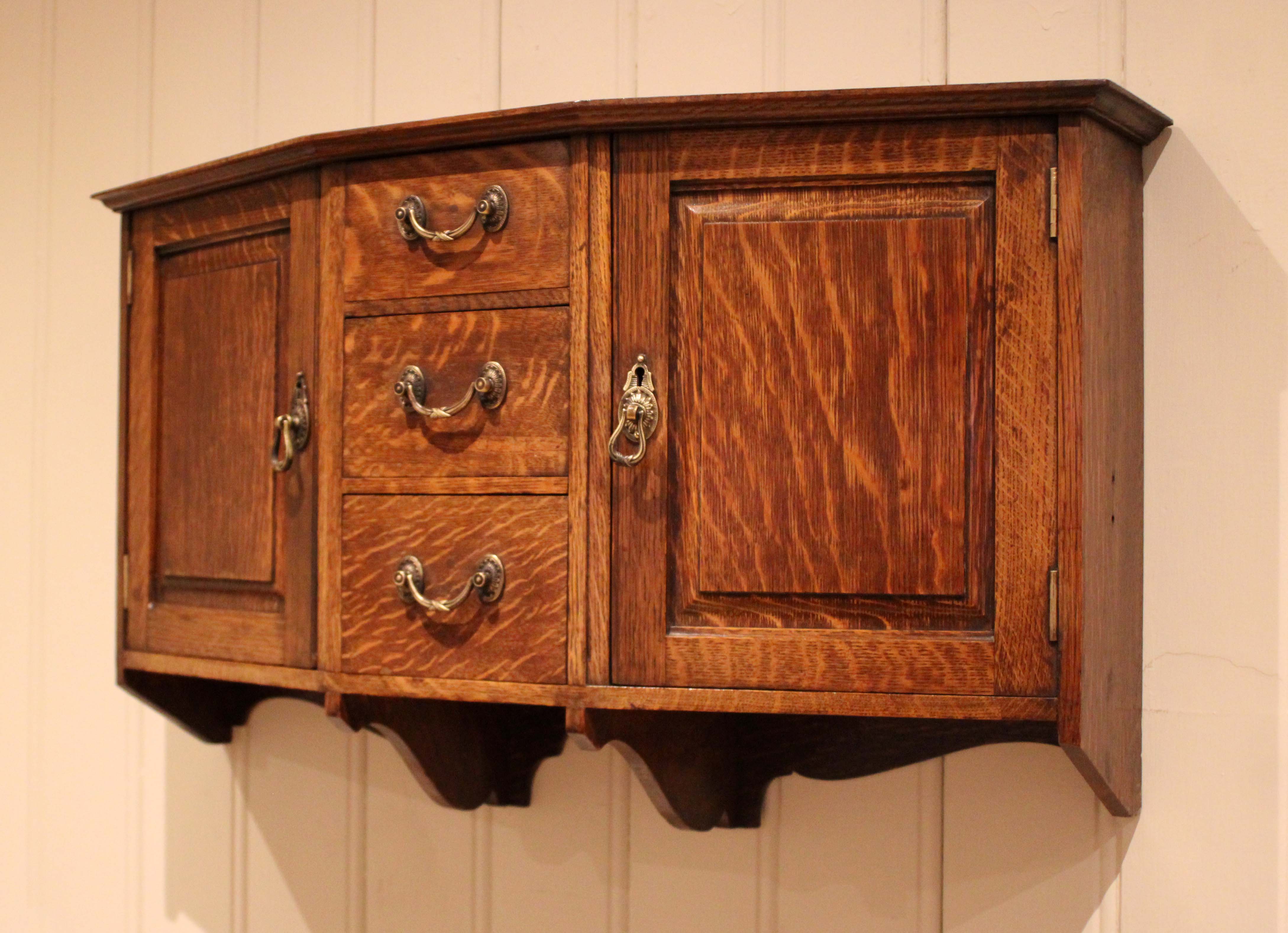 Arts & Crafts oak wall cabinet ( attributed to Shapland & Petter ) having three central drawers flanked by a cupboard to either side , with a shelved interior