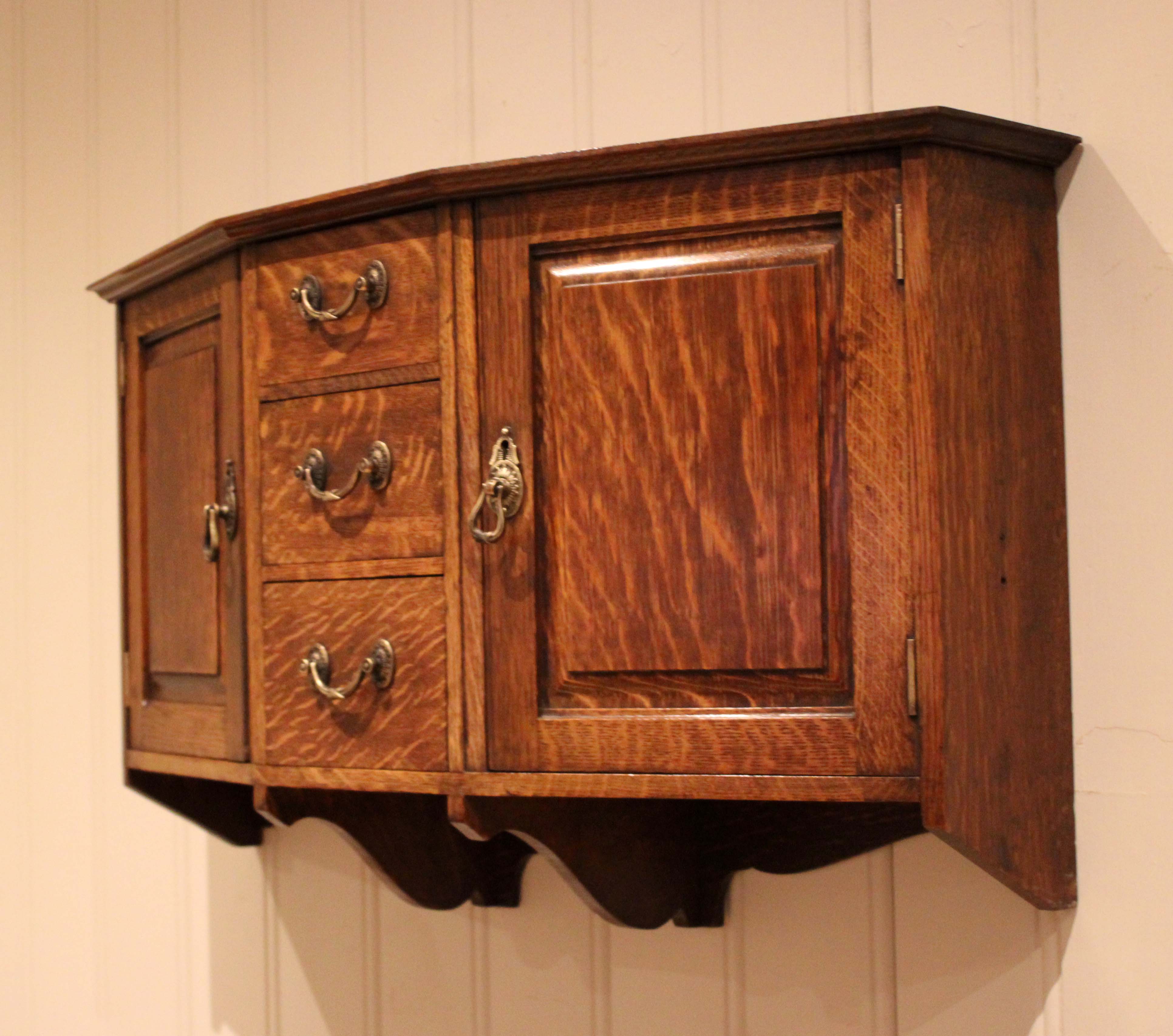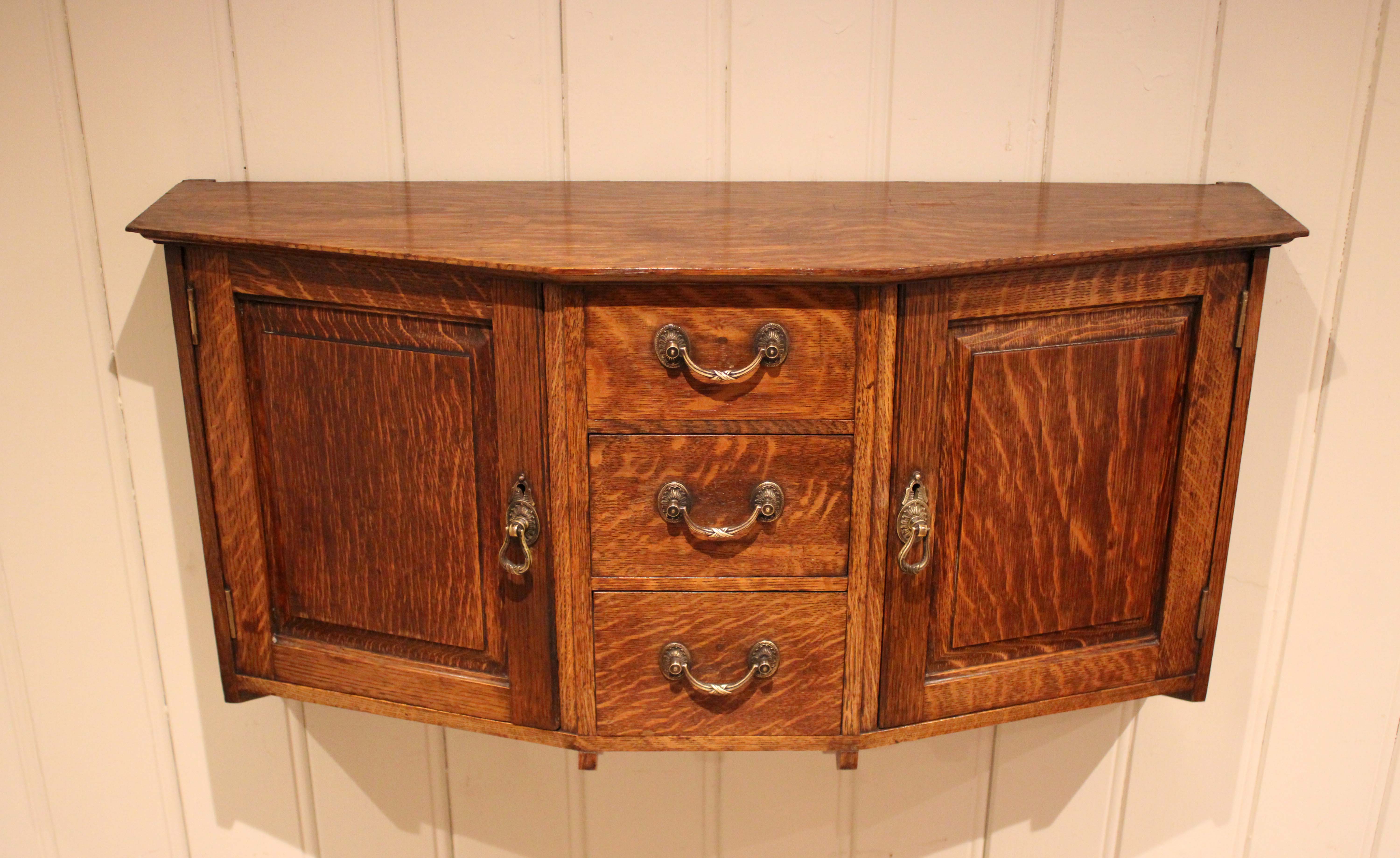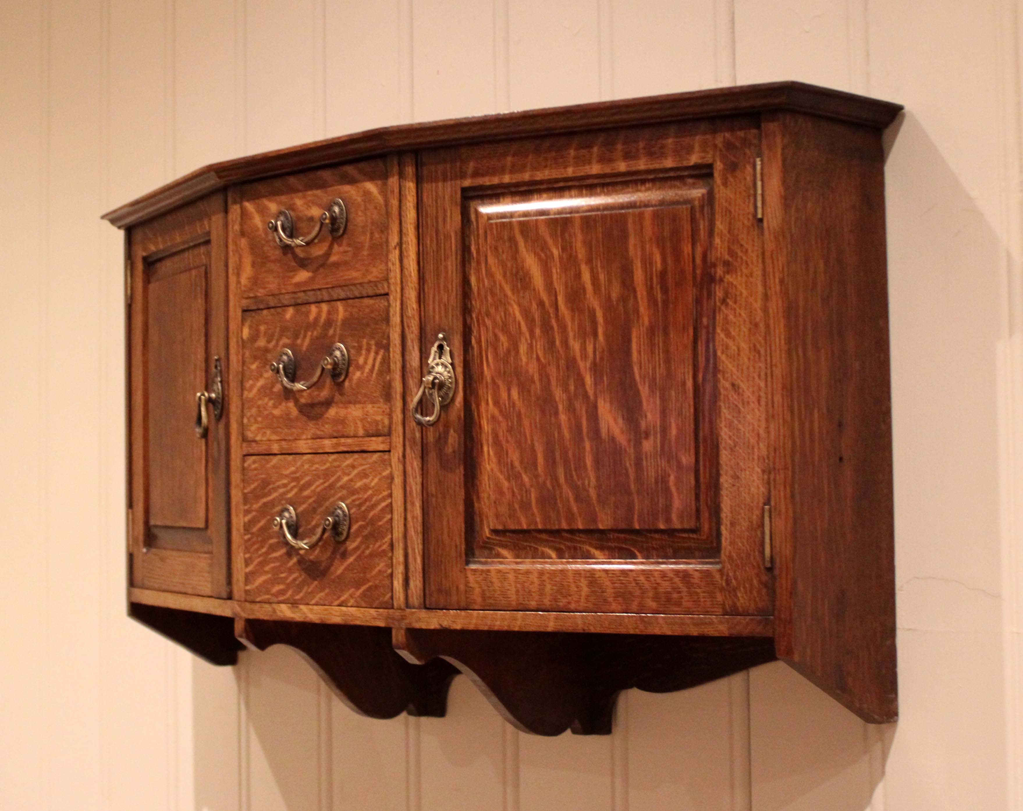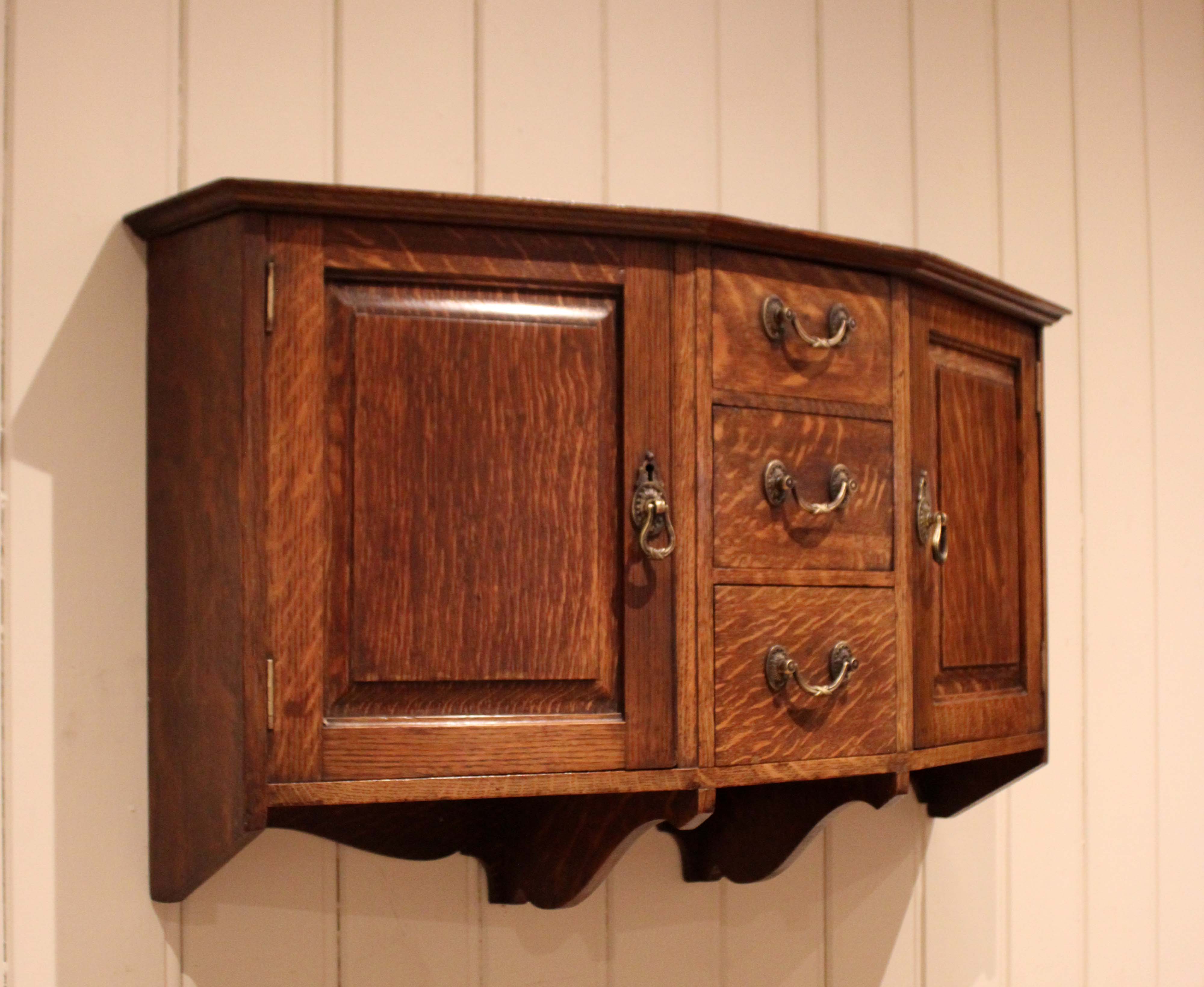 Arts & Crafts oak wall cabinet ( attributed to Shapland & Petter ) having three central drawers flanked by a cupboard to either side , with a shelved interior