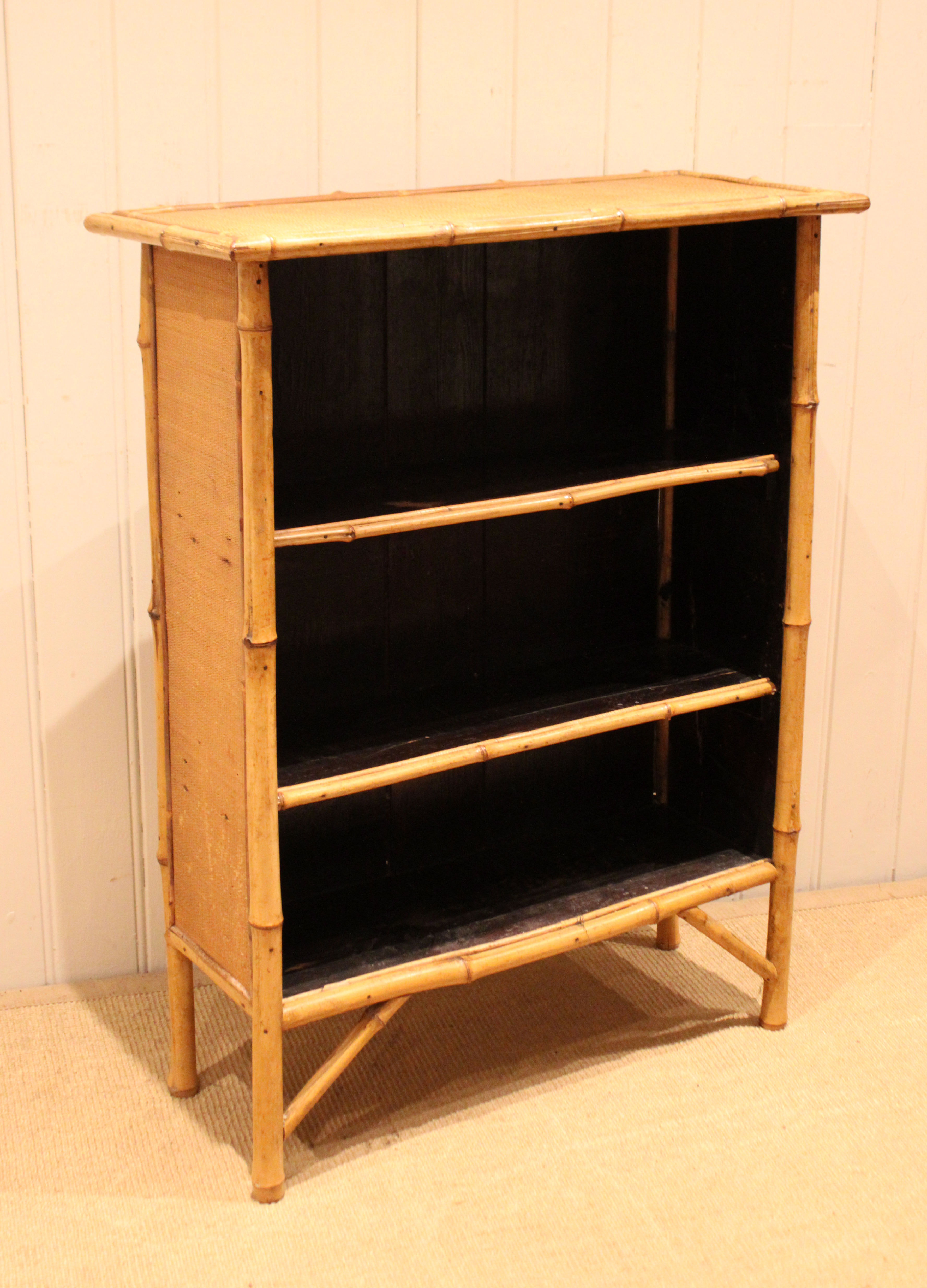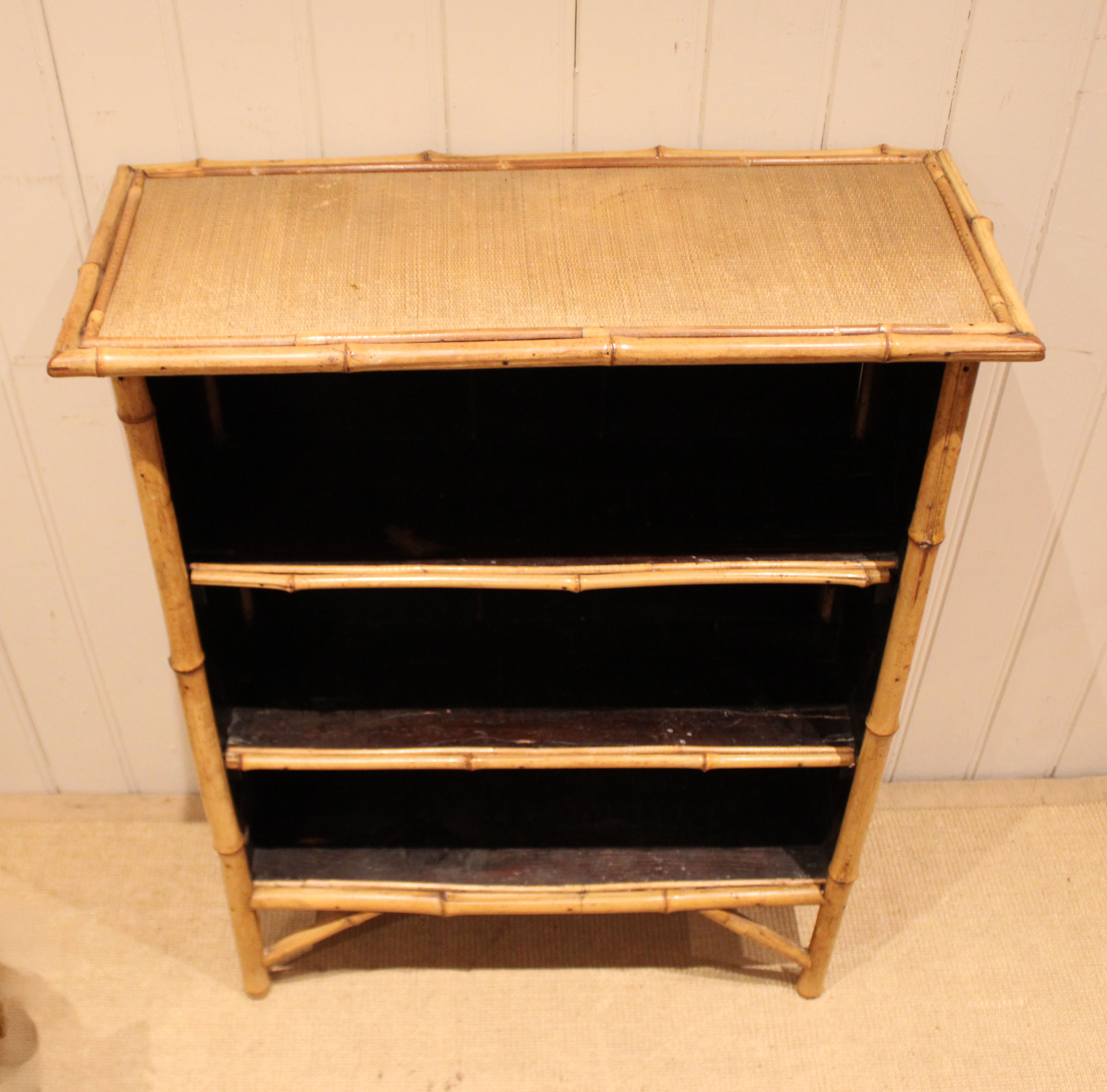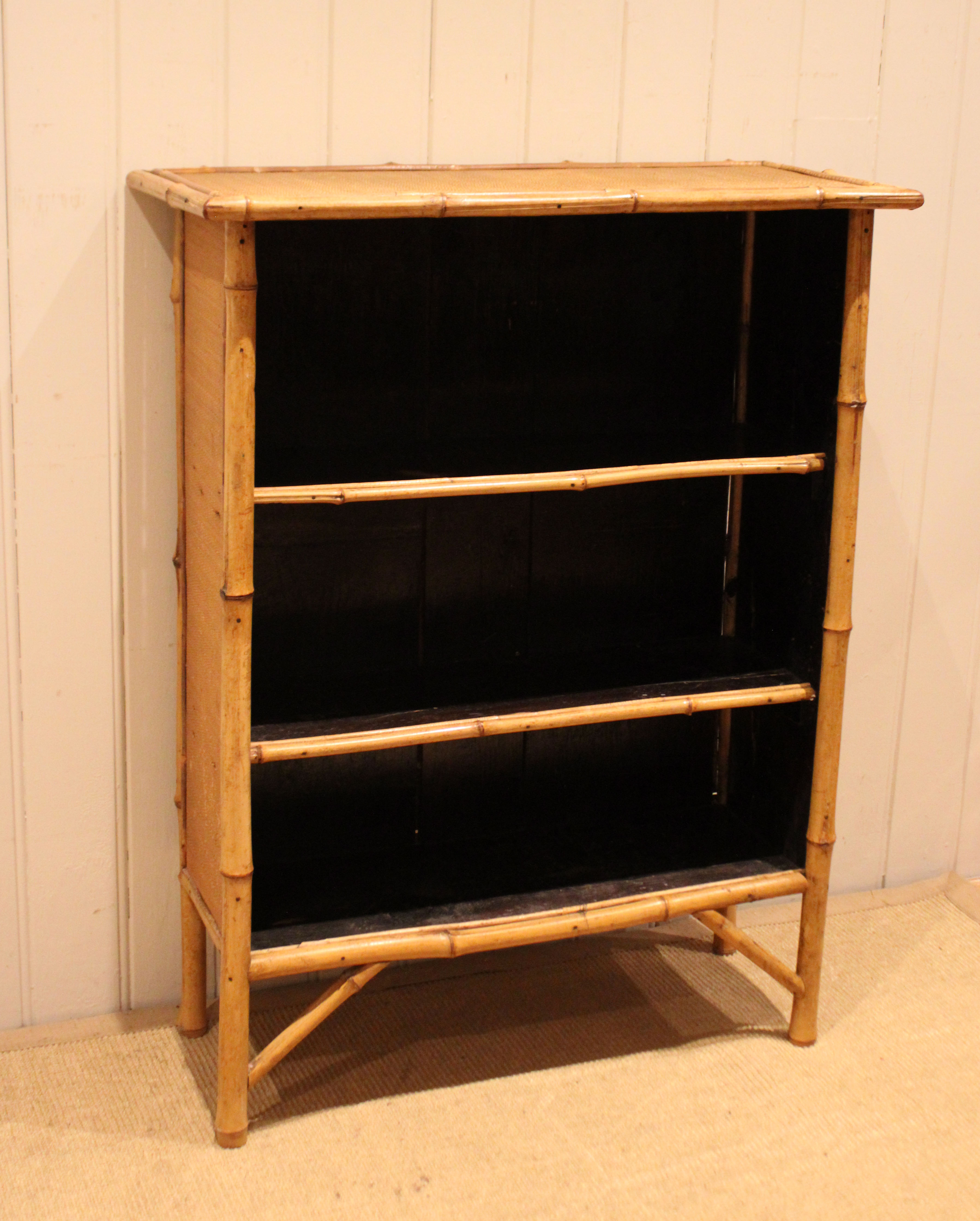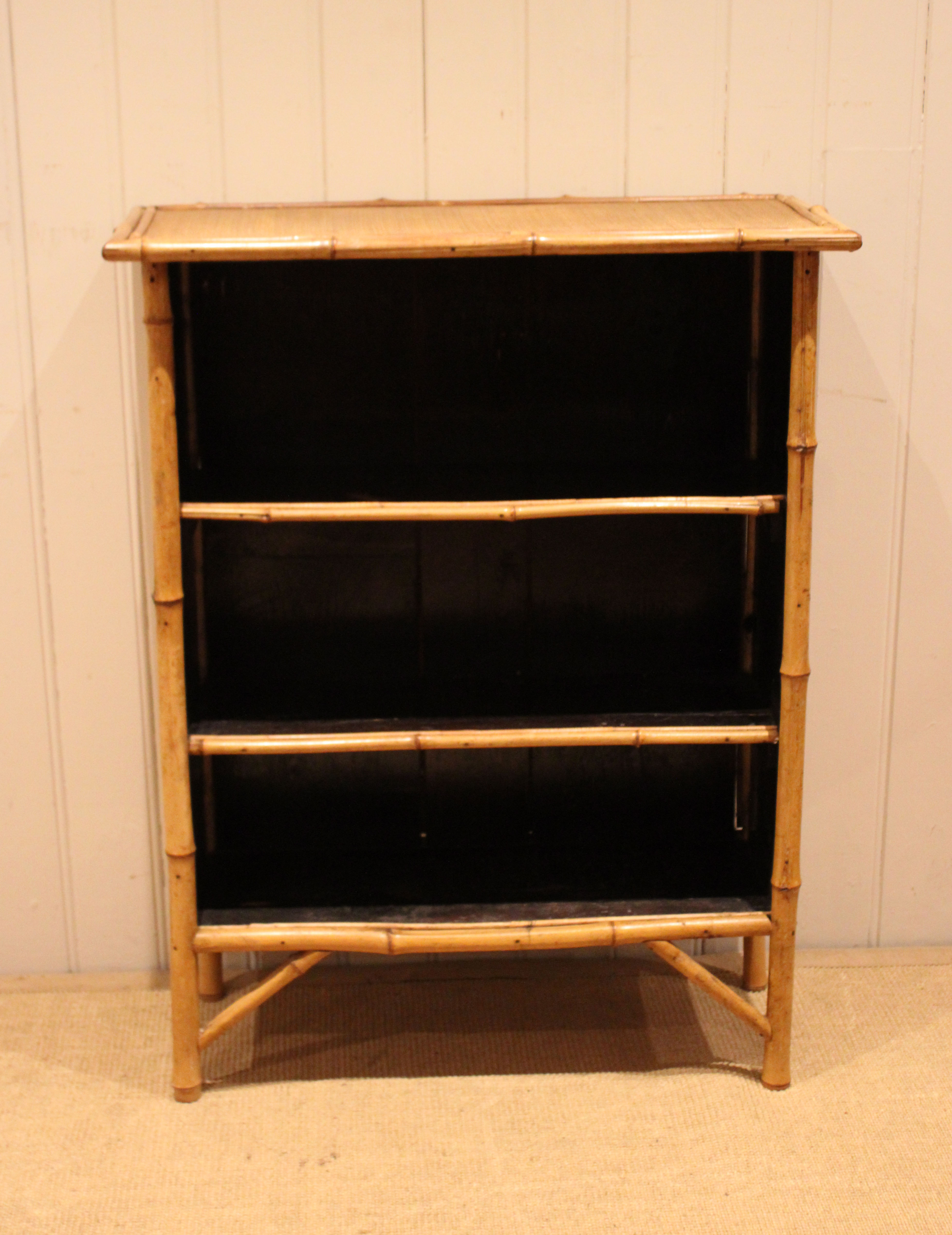 Bamboo open bookcase having three fixed shelves , raised on straight legs with corner supports . The shelf dimensions are 63.5 cm wide x 20.5 cm deep and from the bottom up 20.5 cm high , 25 cm high and at the top 26 cm high .
