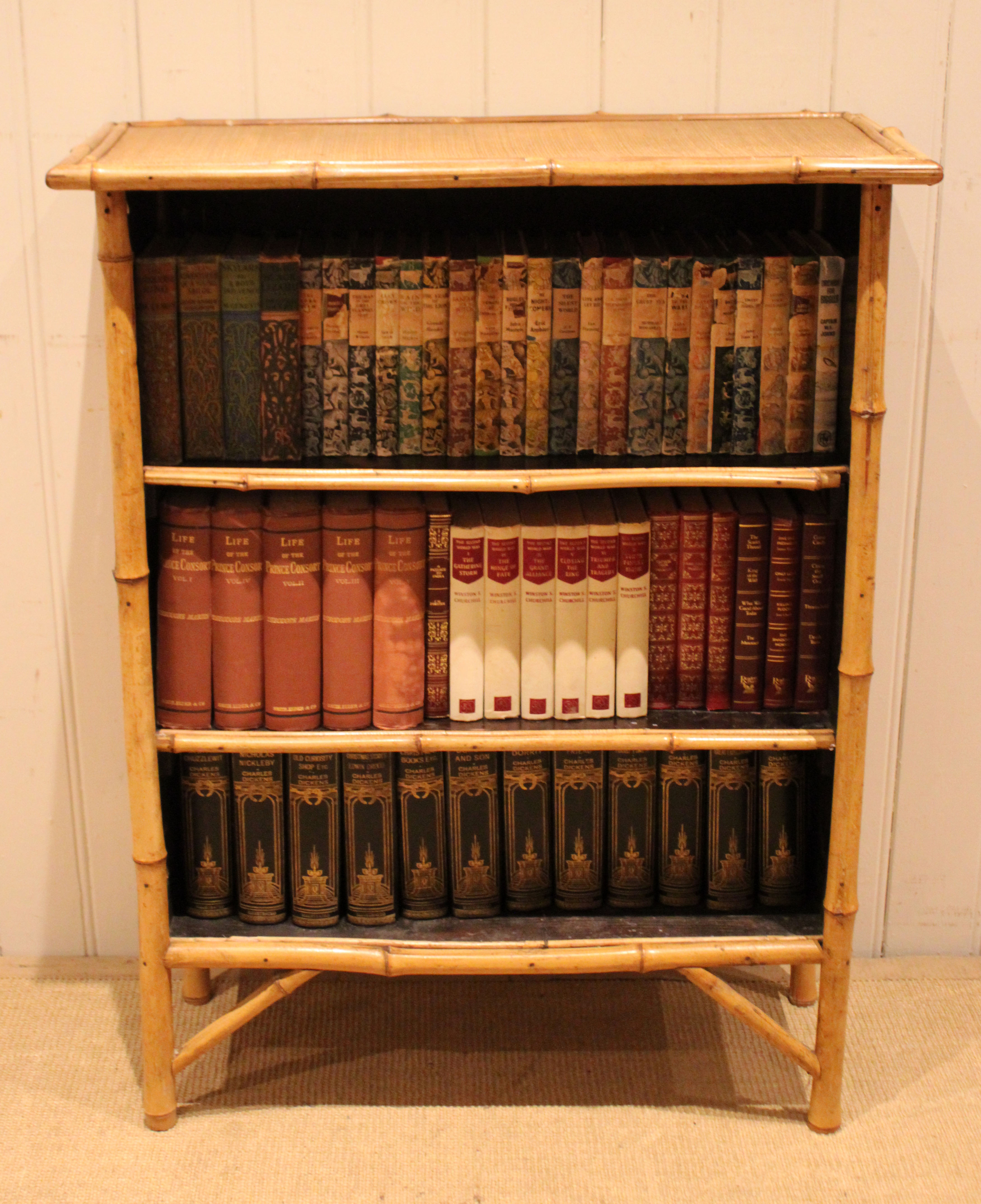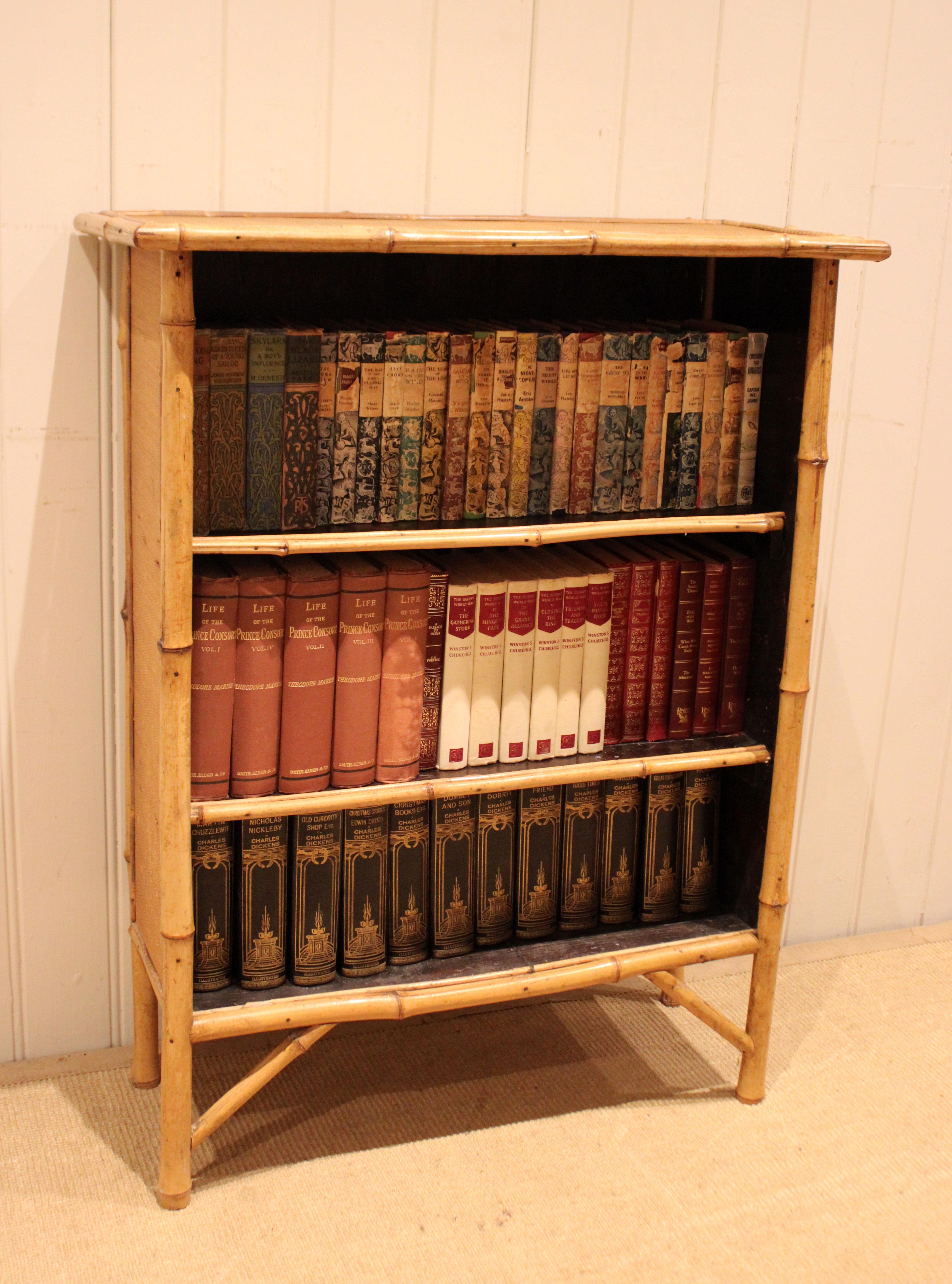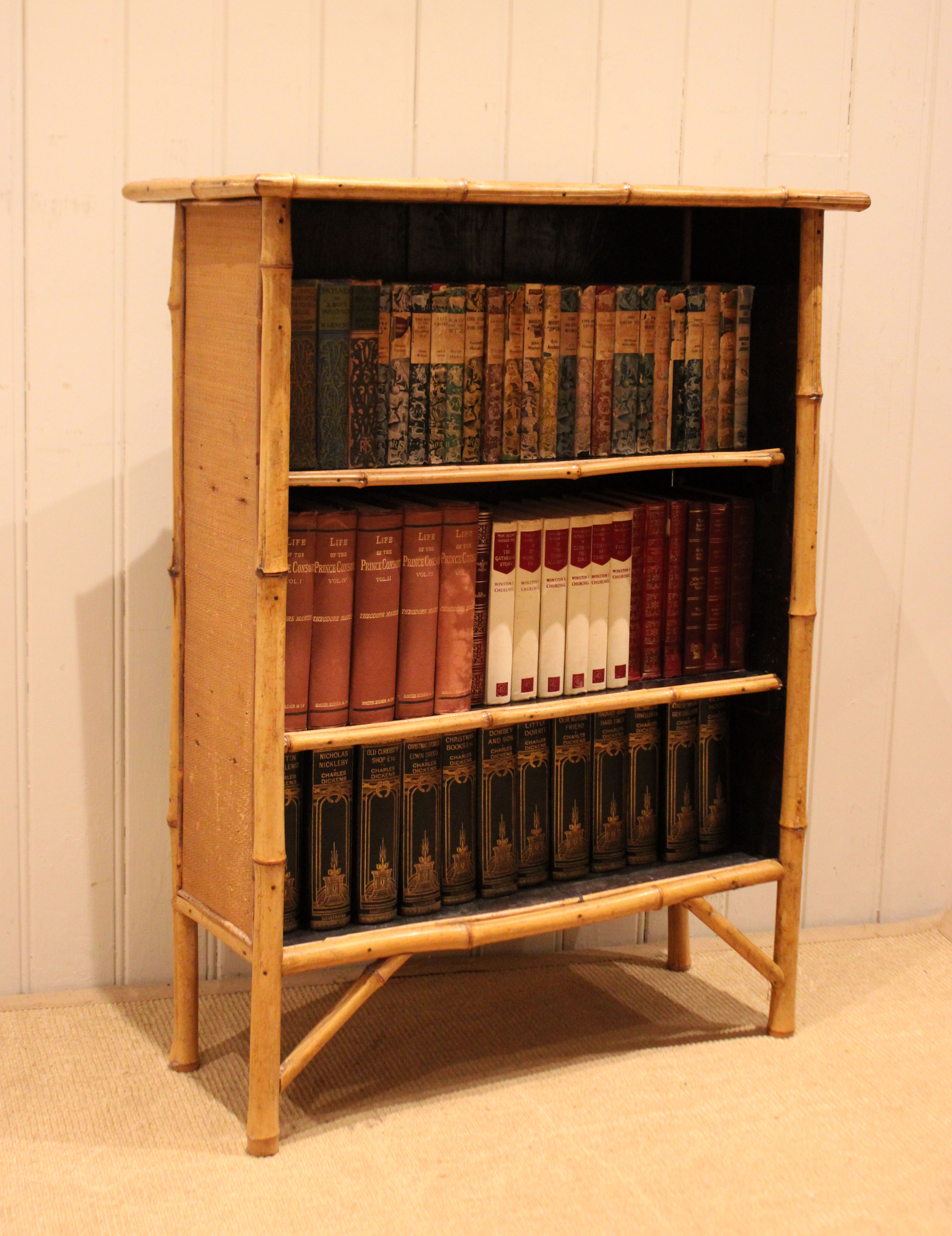 Bamboo open bookcase having three fixed shelves , raised on straight legs with corner supports . The shelf dimensions are 63.5 cm wide x 20.5 cm deep and from the bottom up 20.5 cm high , 25 cm high and at the top 26 cm high .
