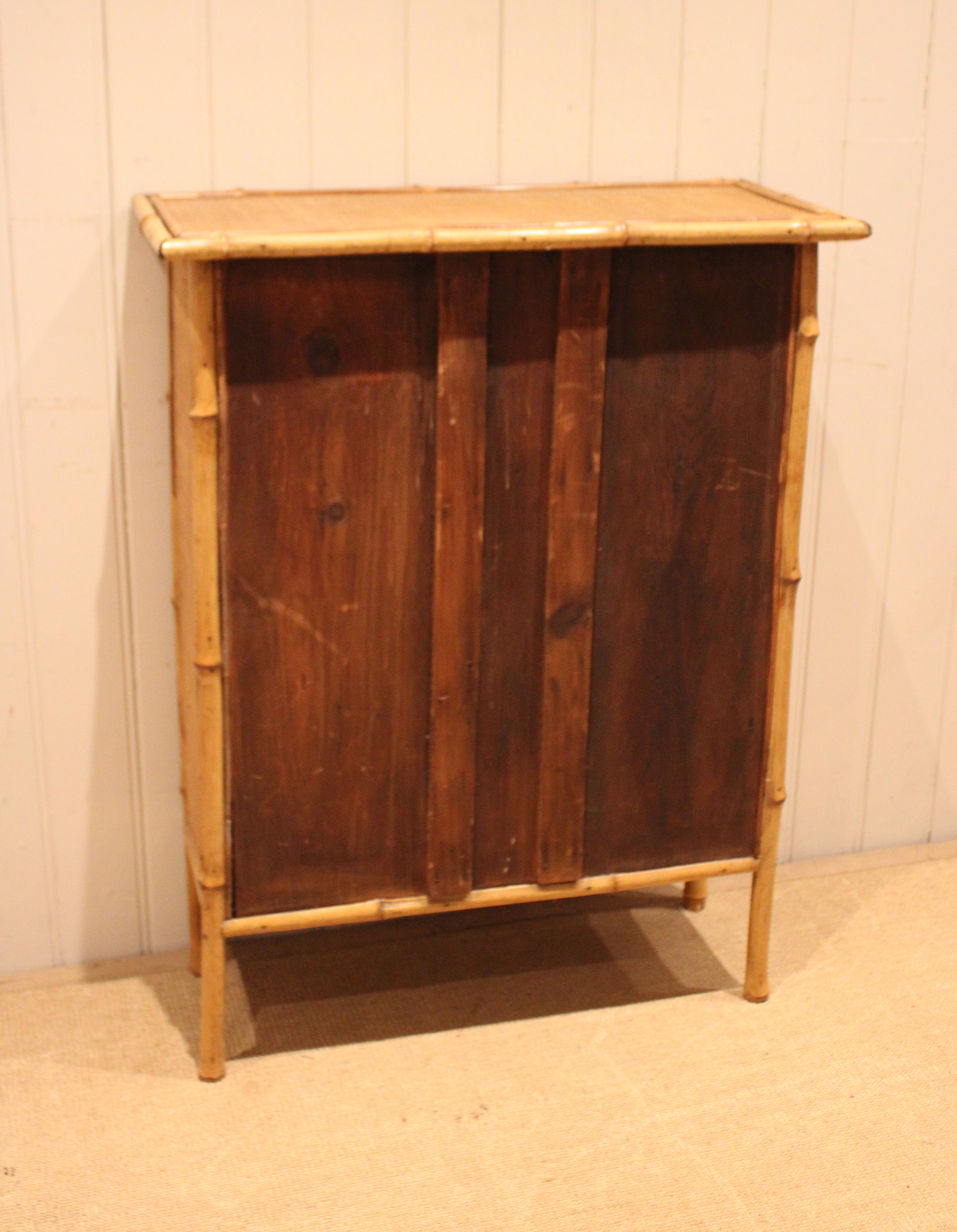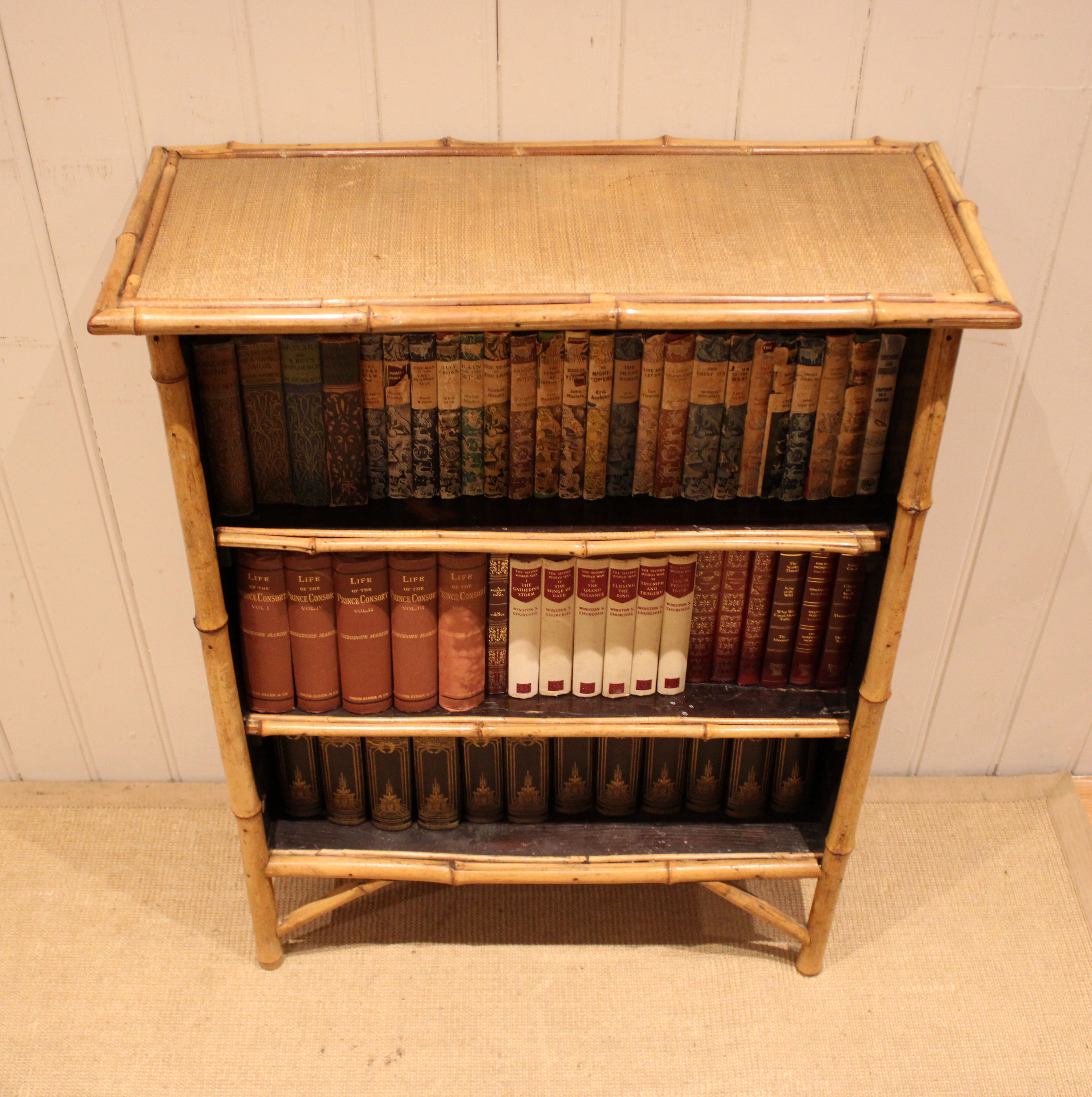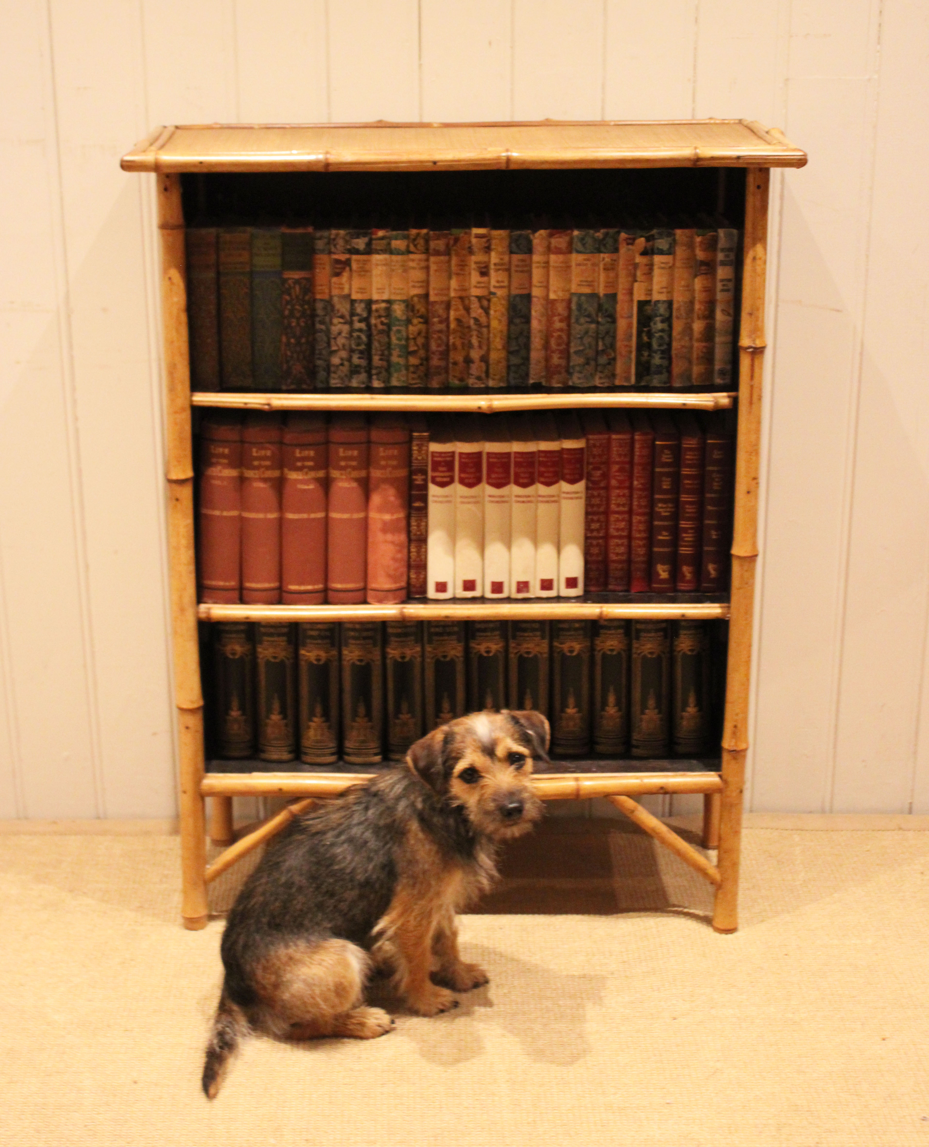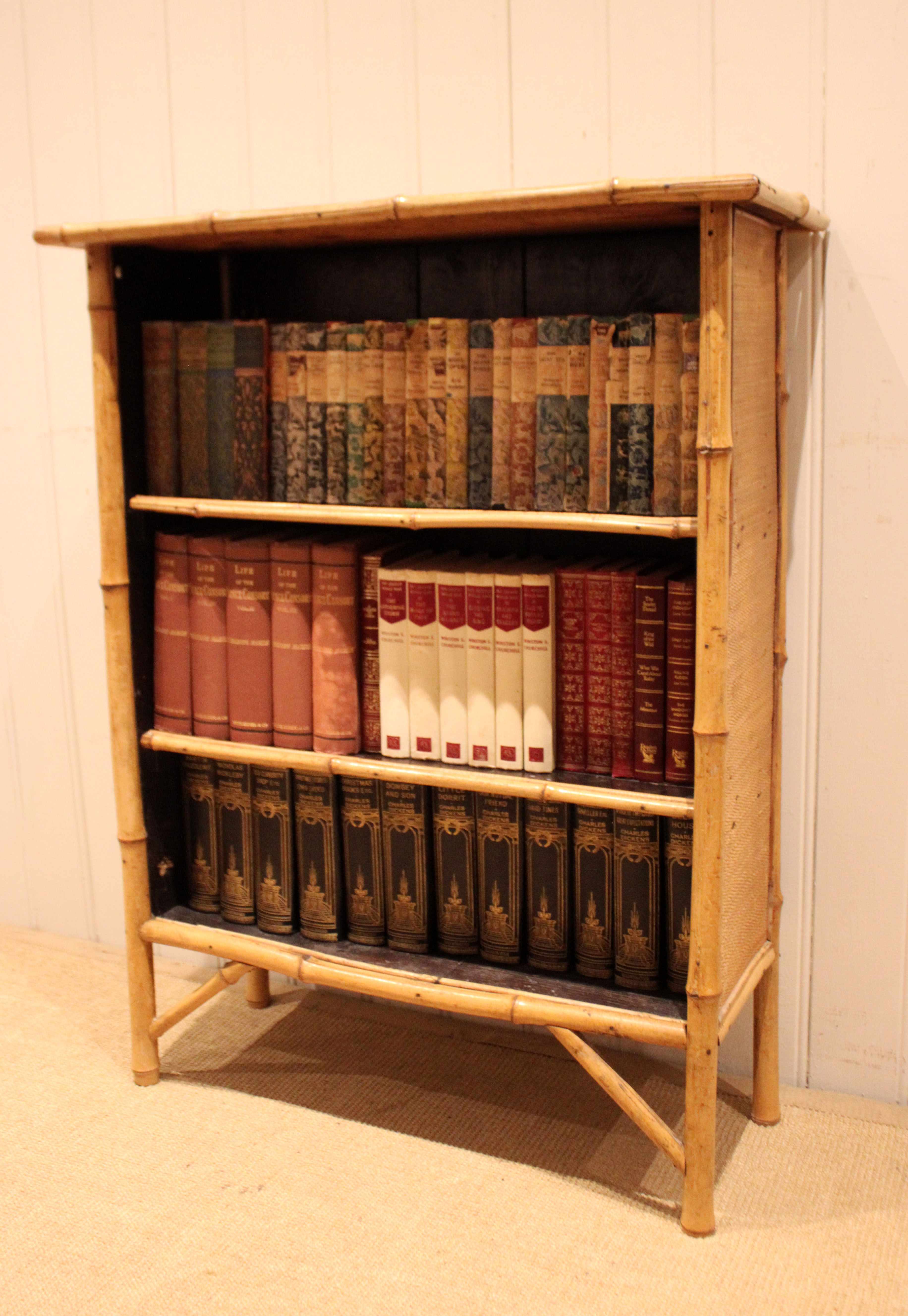 Bamboo open bookcase having three fixed shelves , raised on straight legs with corner supports . The shelf dimensions are 63.5 cm wide x 20.5 cm deep and from the bottom up 20.5 cm high , 25 cm high and at the top 26 cm high .