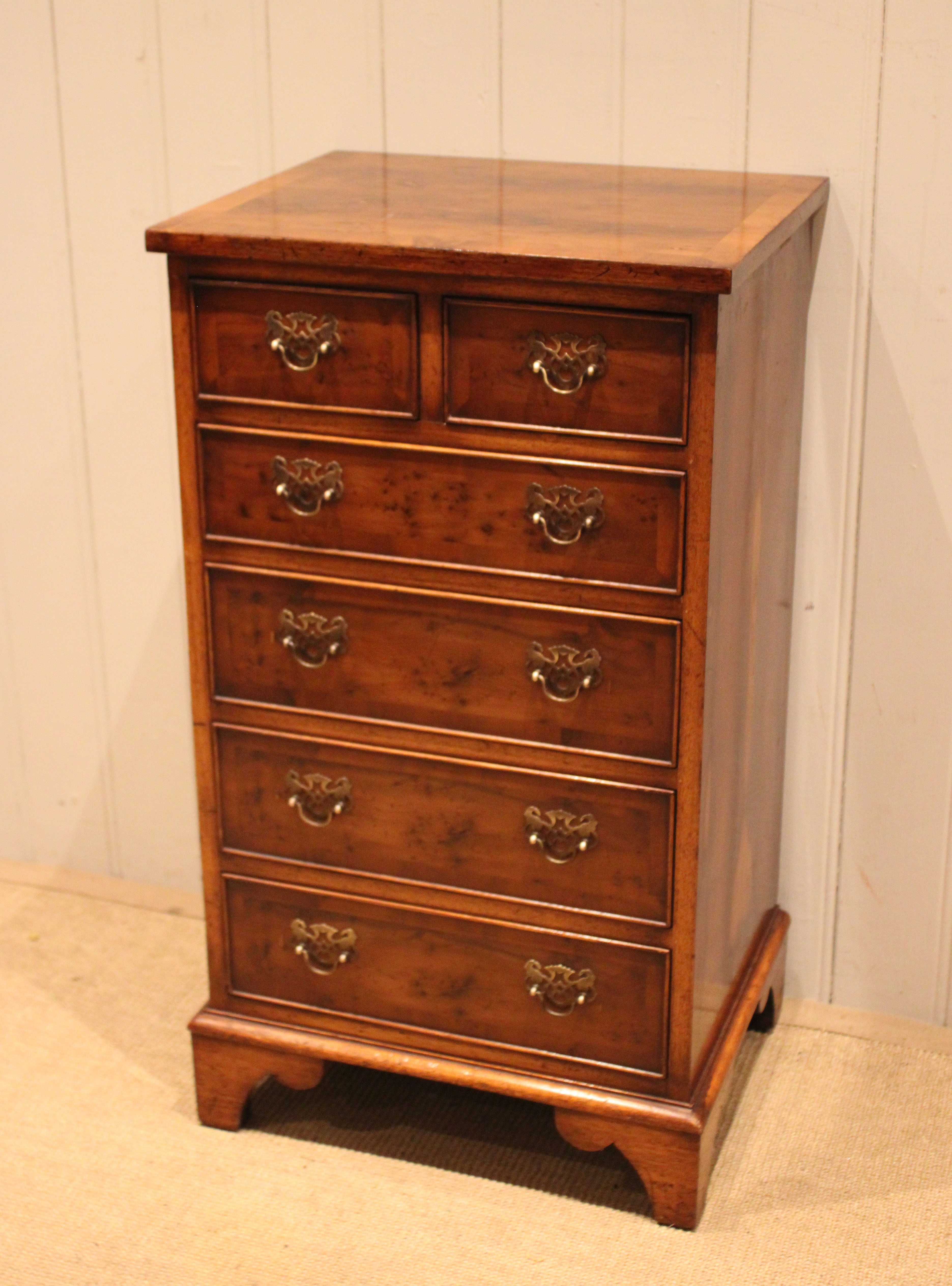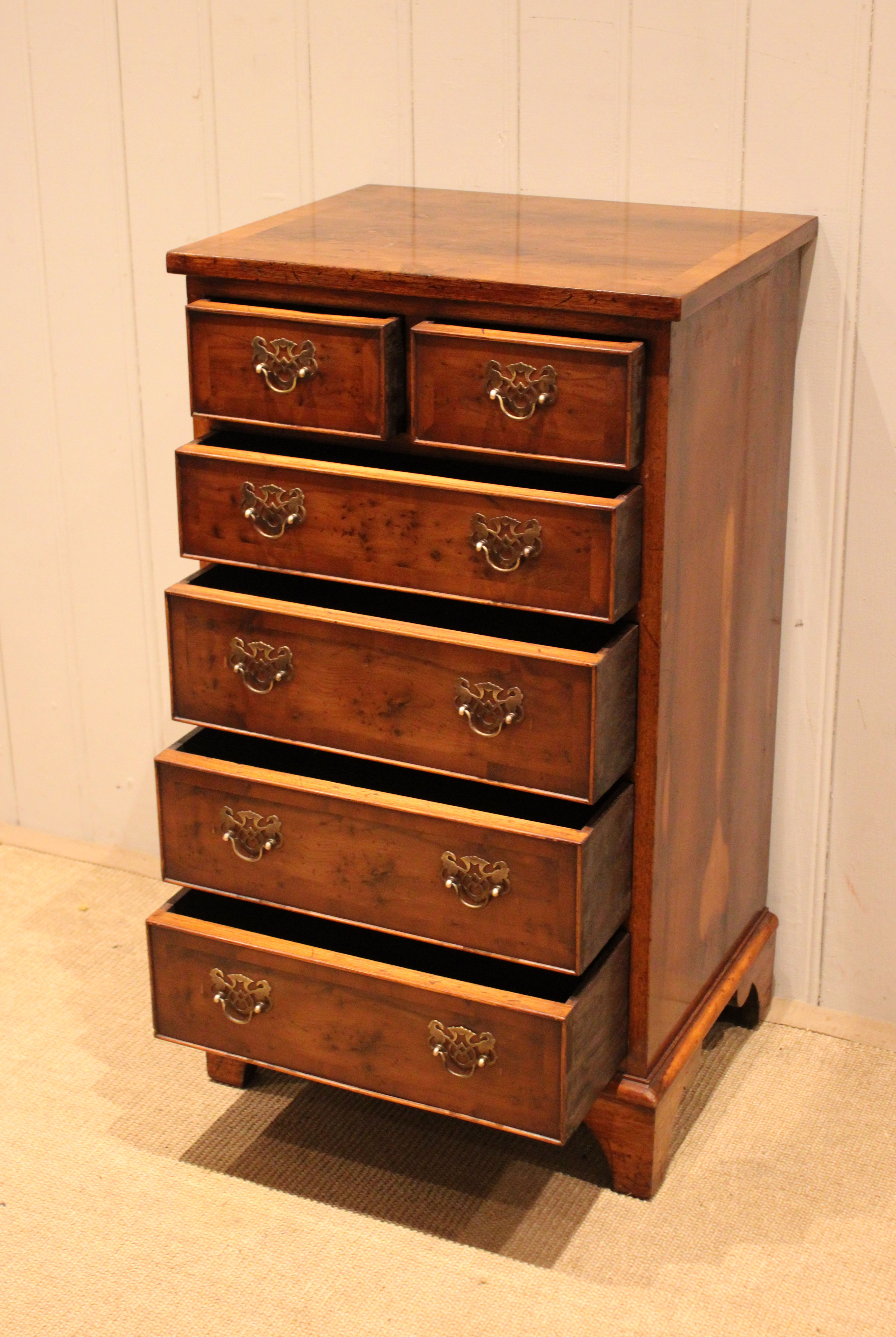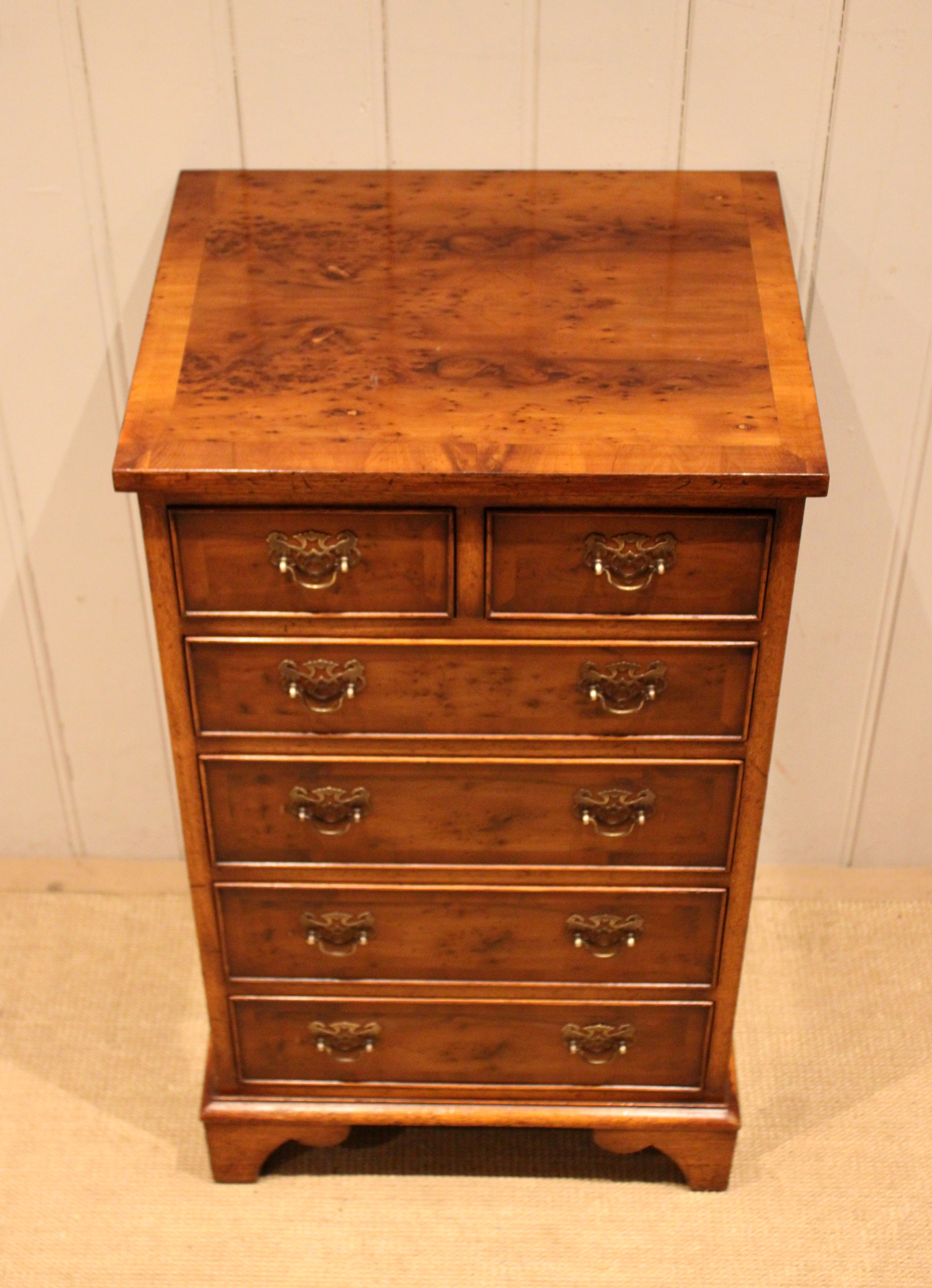 Small slim burr yew chest of four long and two short drawers , raised on bracket feet . The drawer depths are from the bottom up 11 cm , 11 cm ,11 cm , 8 cm and the top two ars also 8 cm deep .