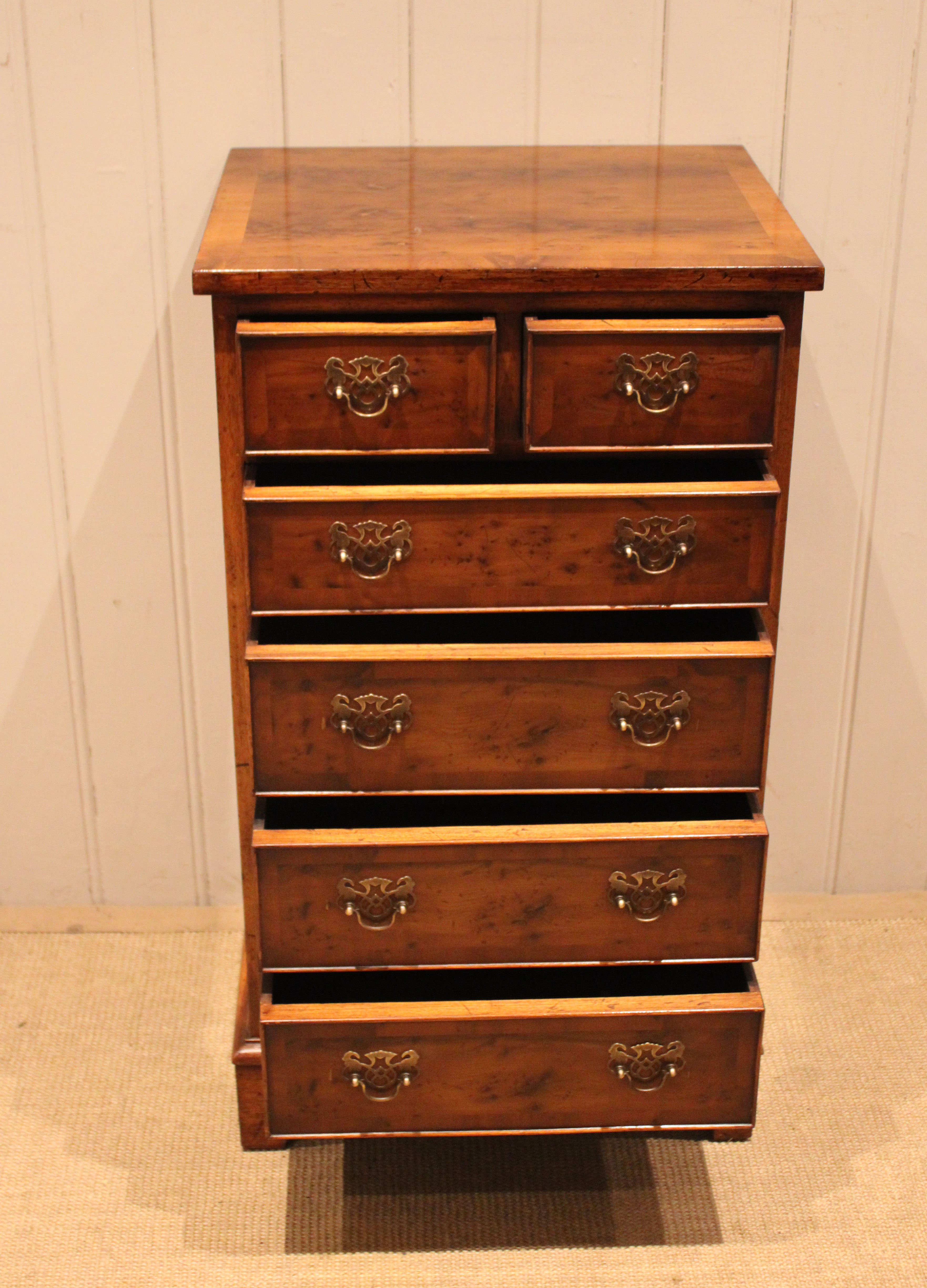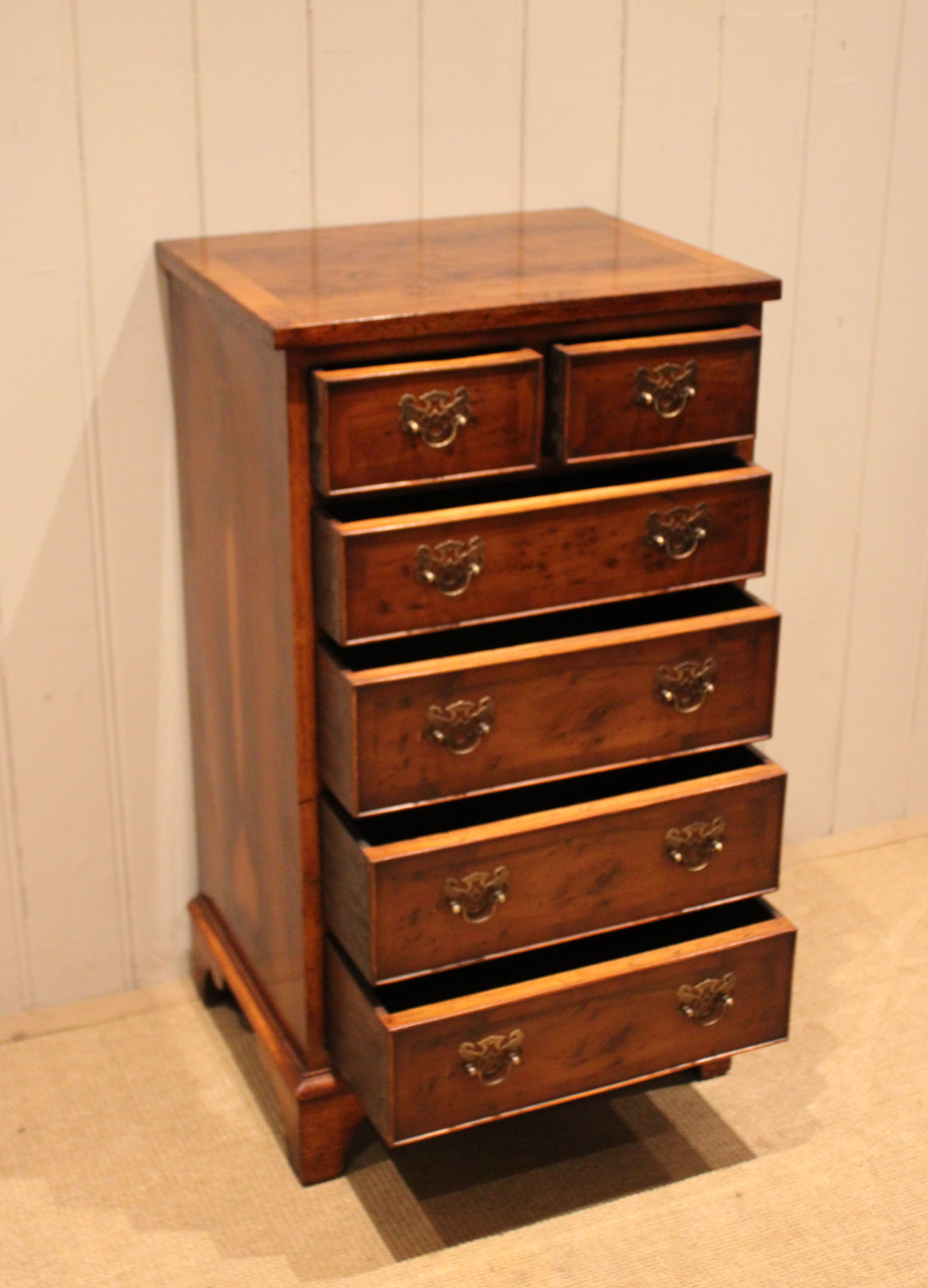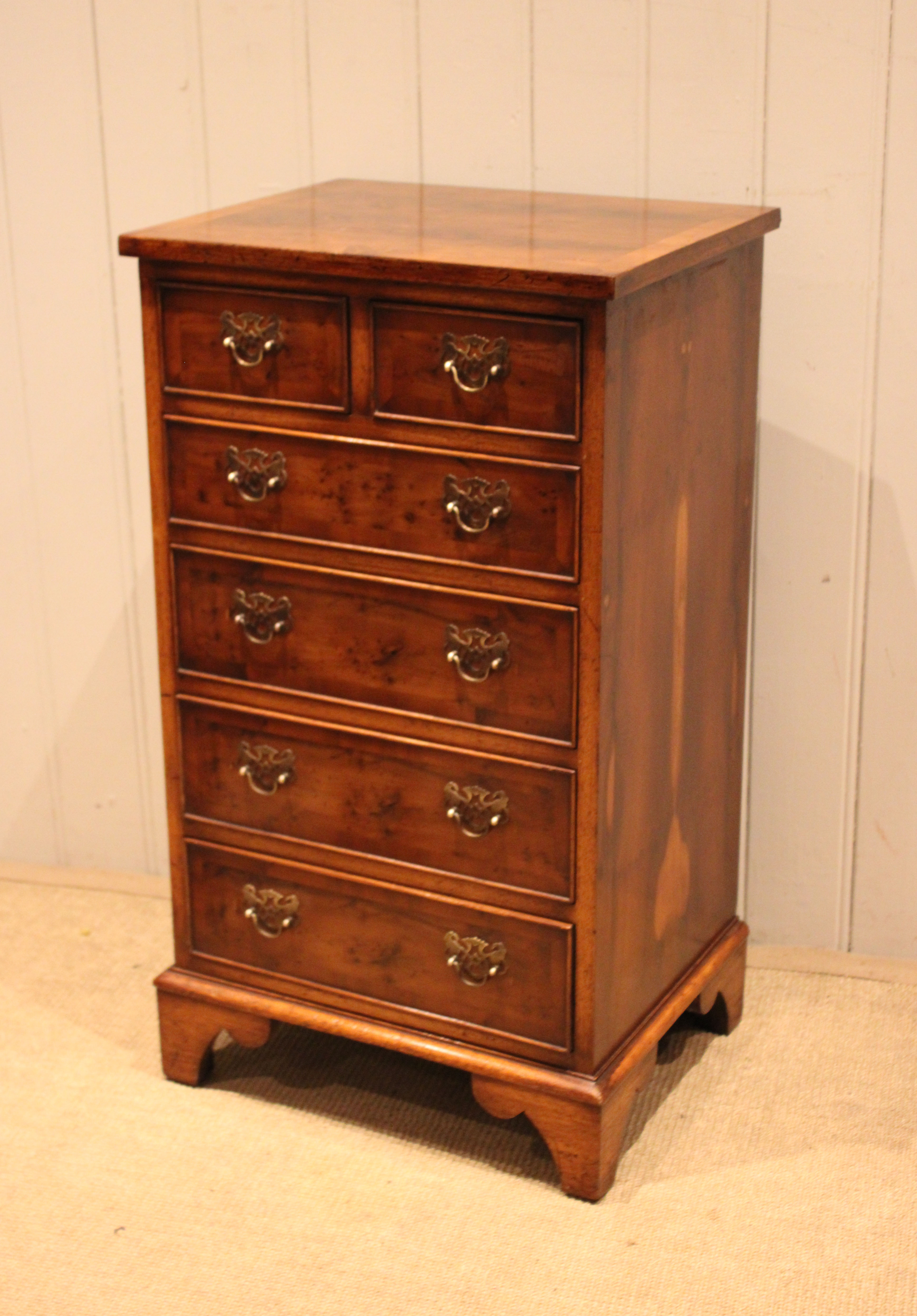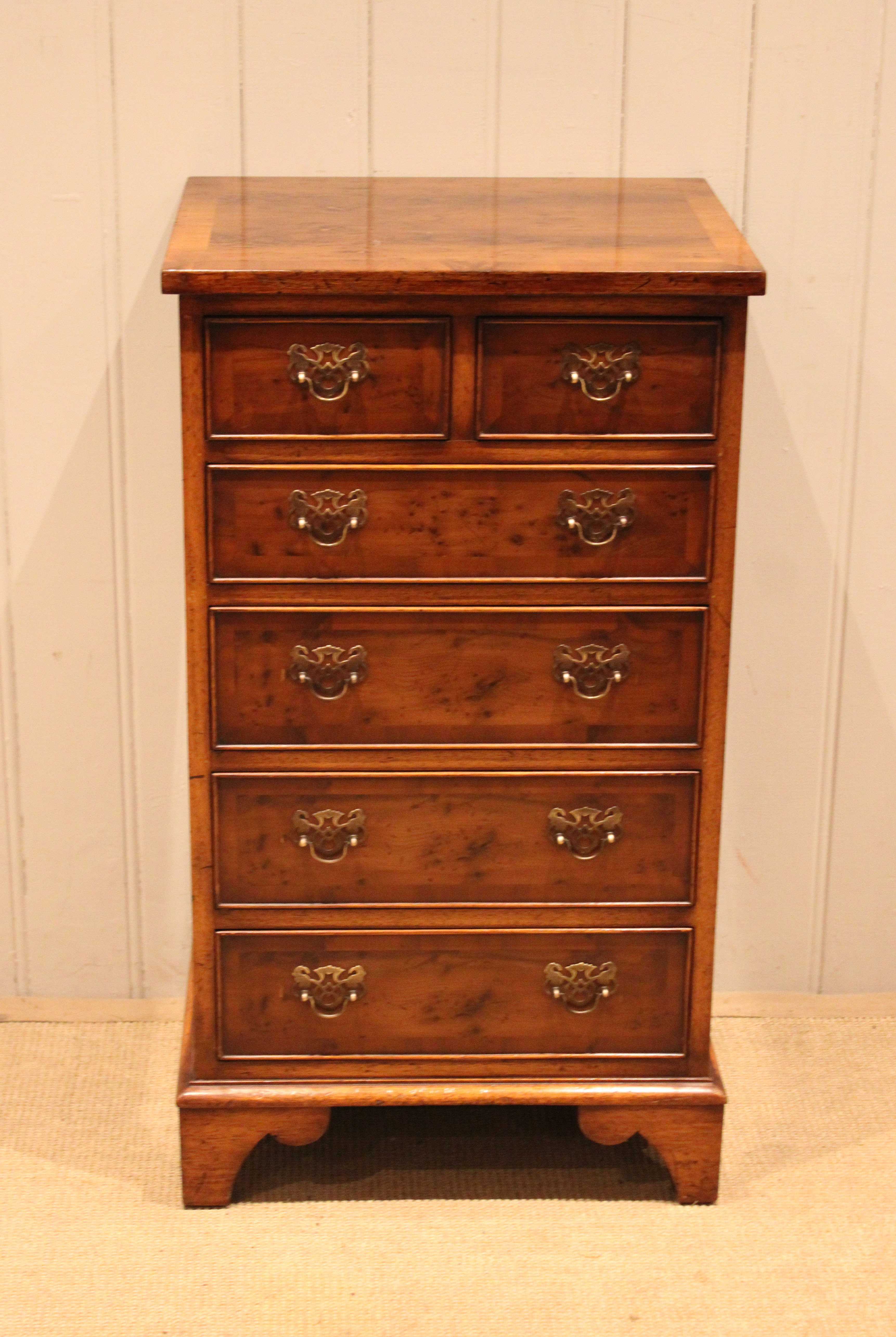 Small slim burr yew chest of four long and two short drawers , raised on bracket feet . The drawer depths are from the bottom up 11 cm , 11 cm ,11 cm , 8 cm and the top two ars also 8 cm deep .