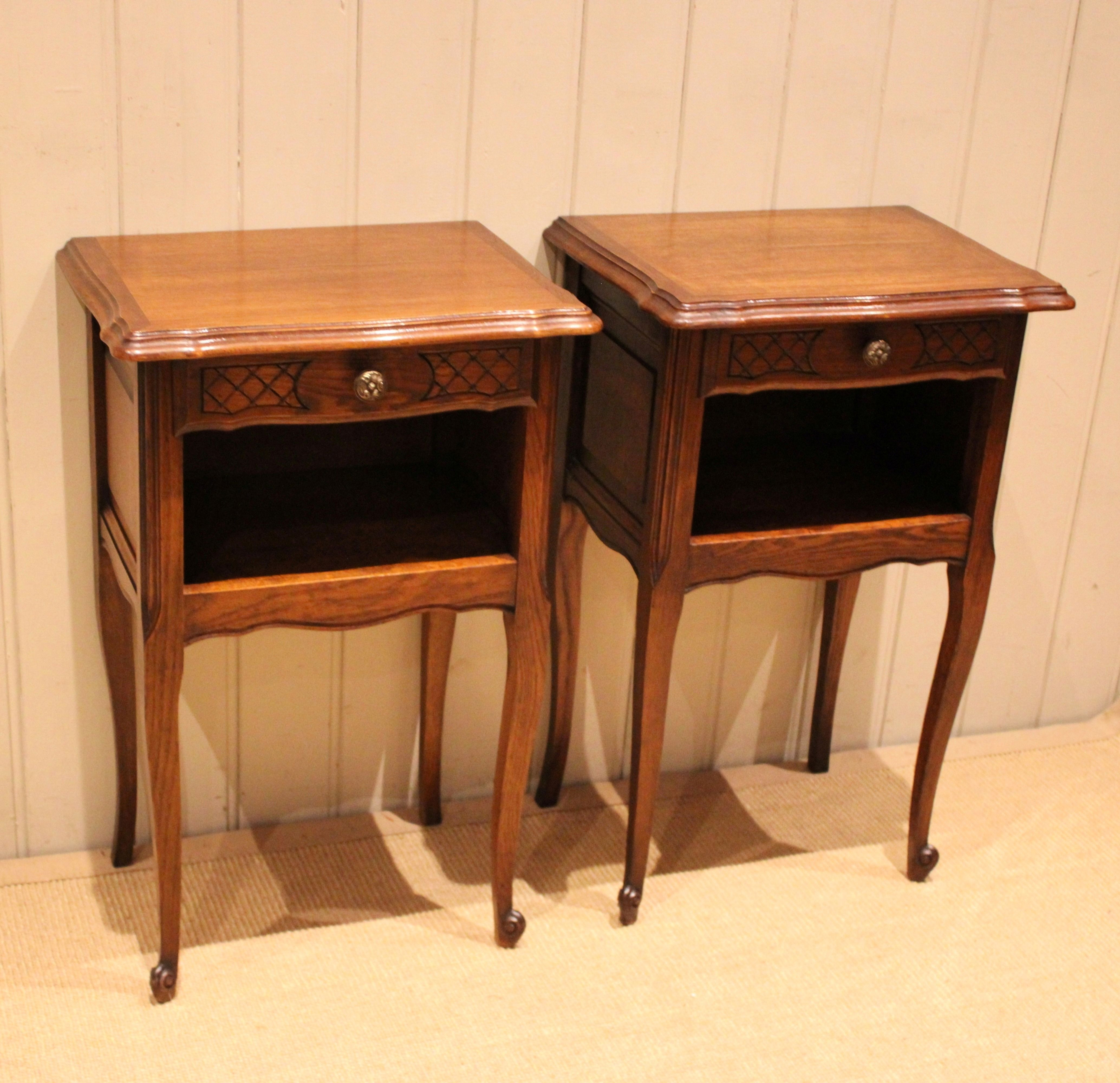 Pair of painted bedside cabinets having a single drawer above an open cupboard base and raised on cabriole legs