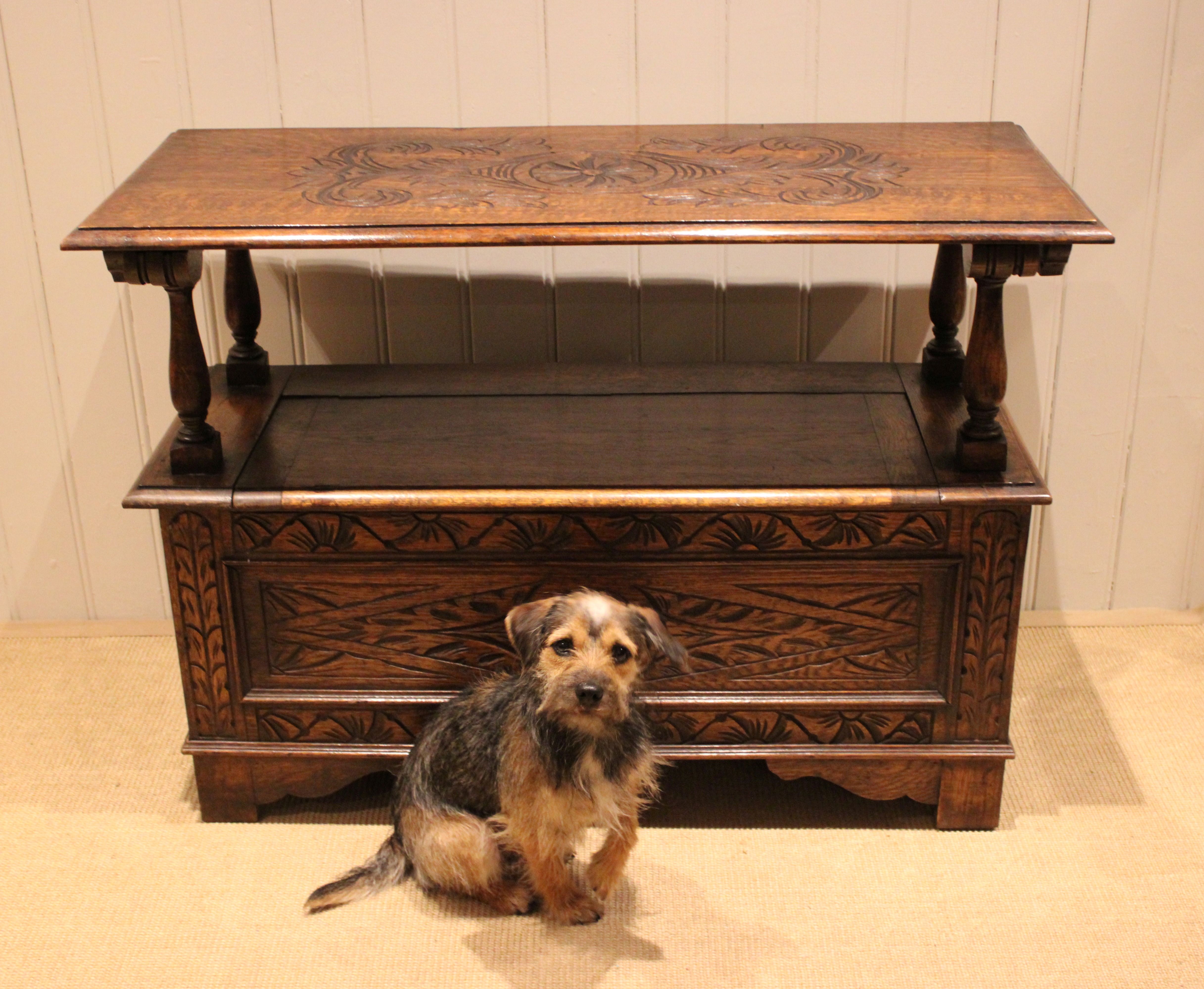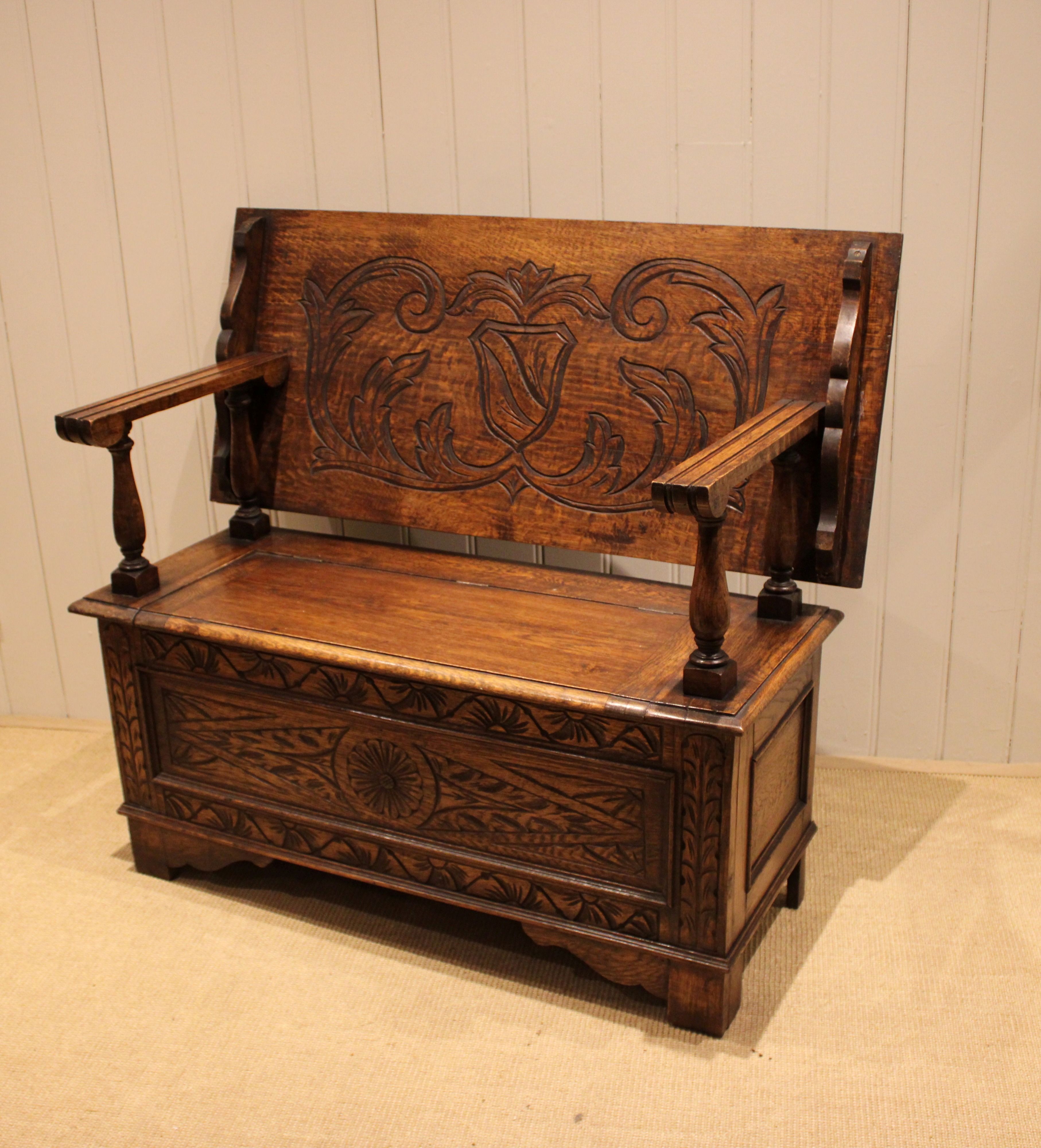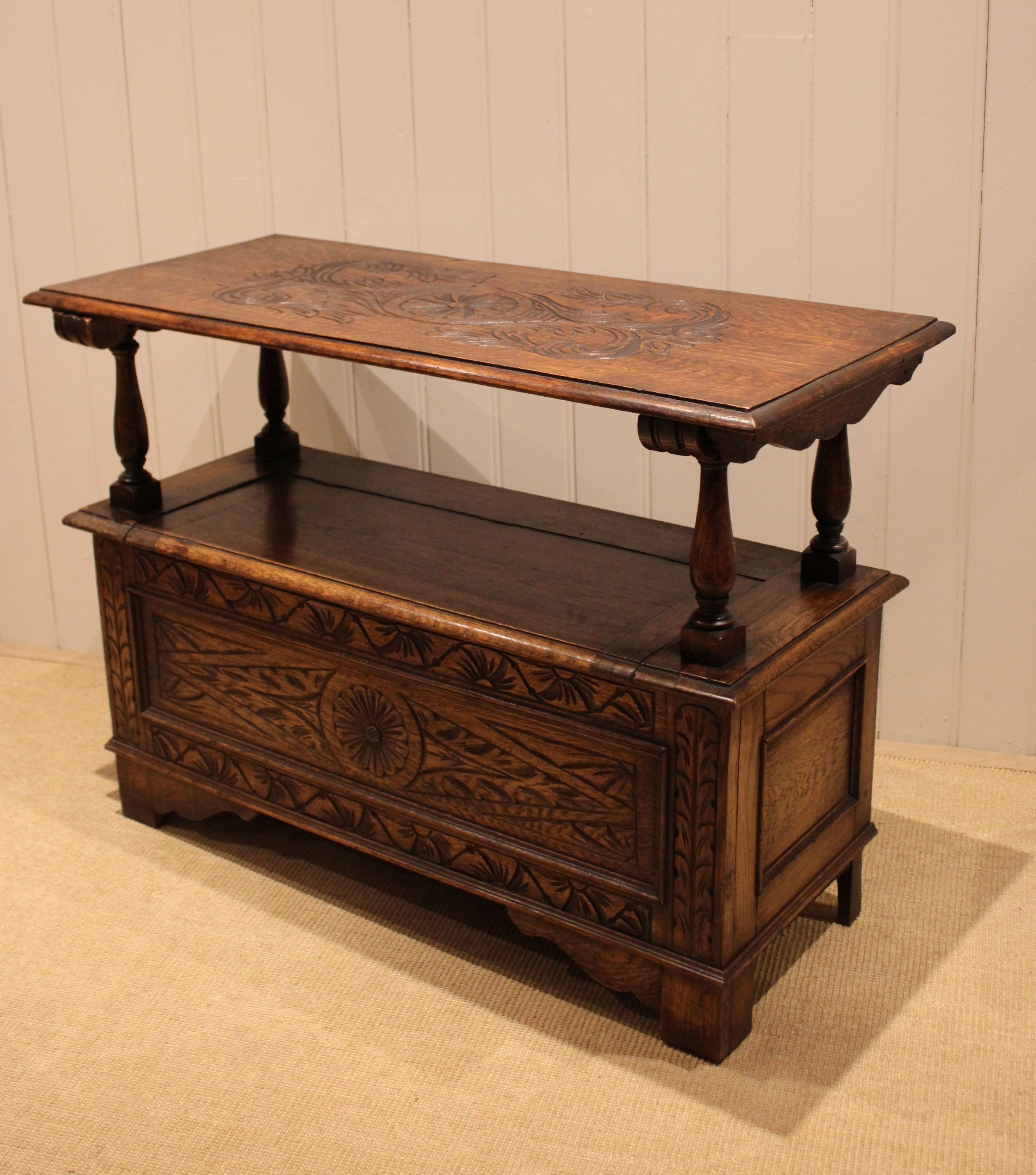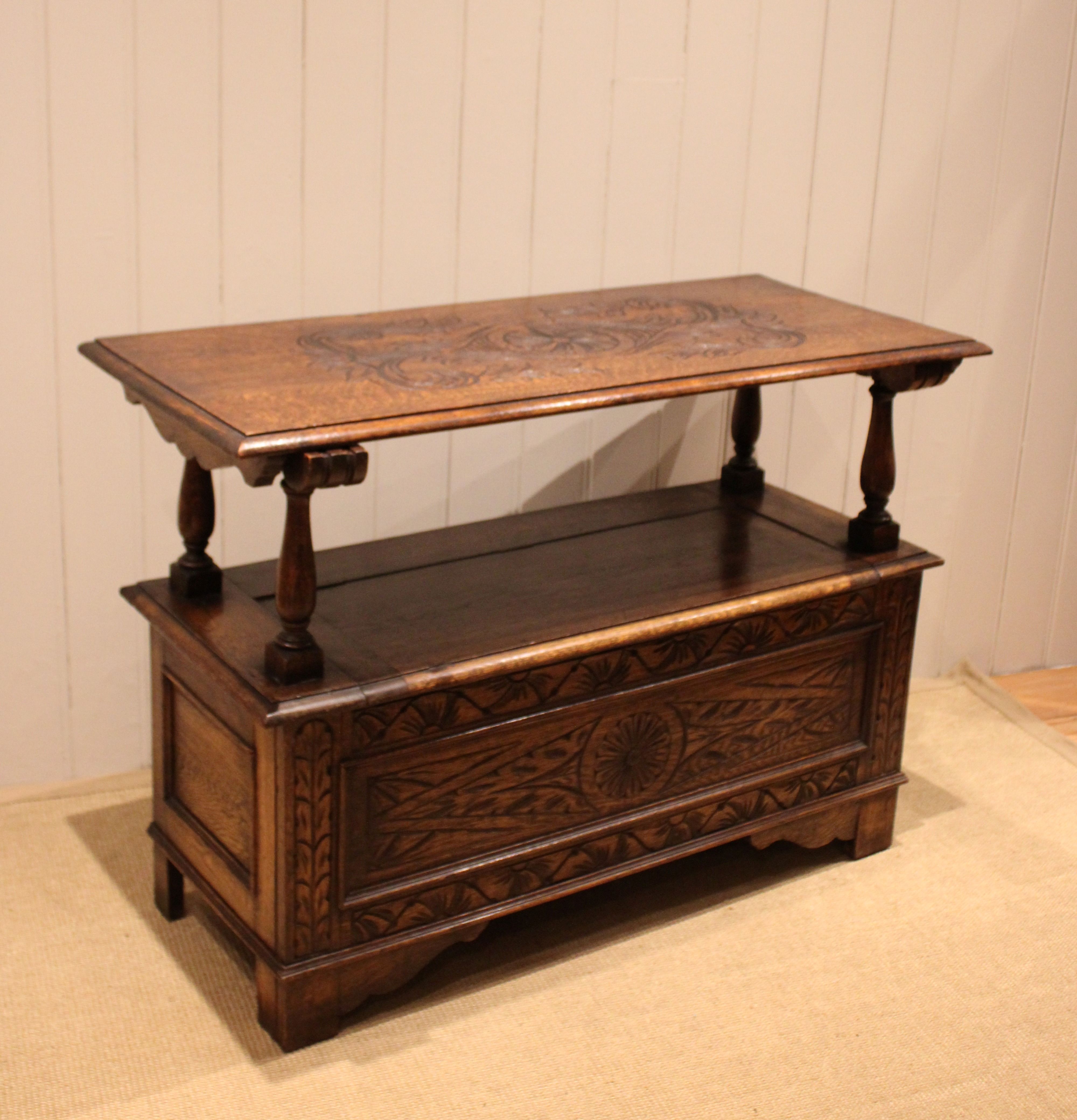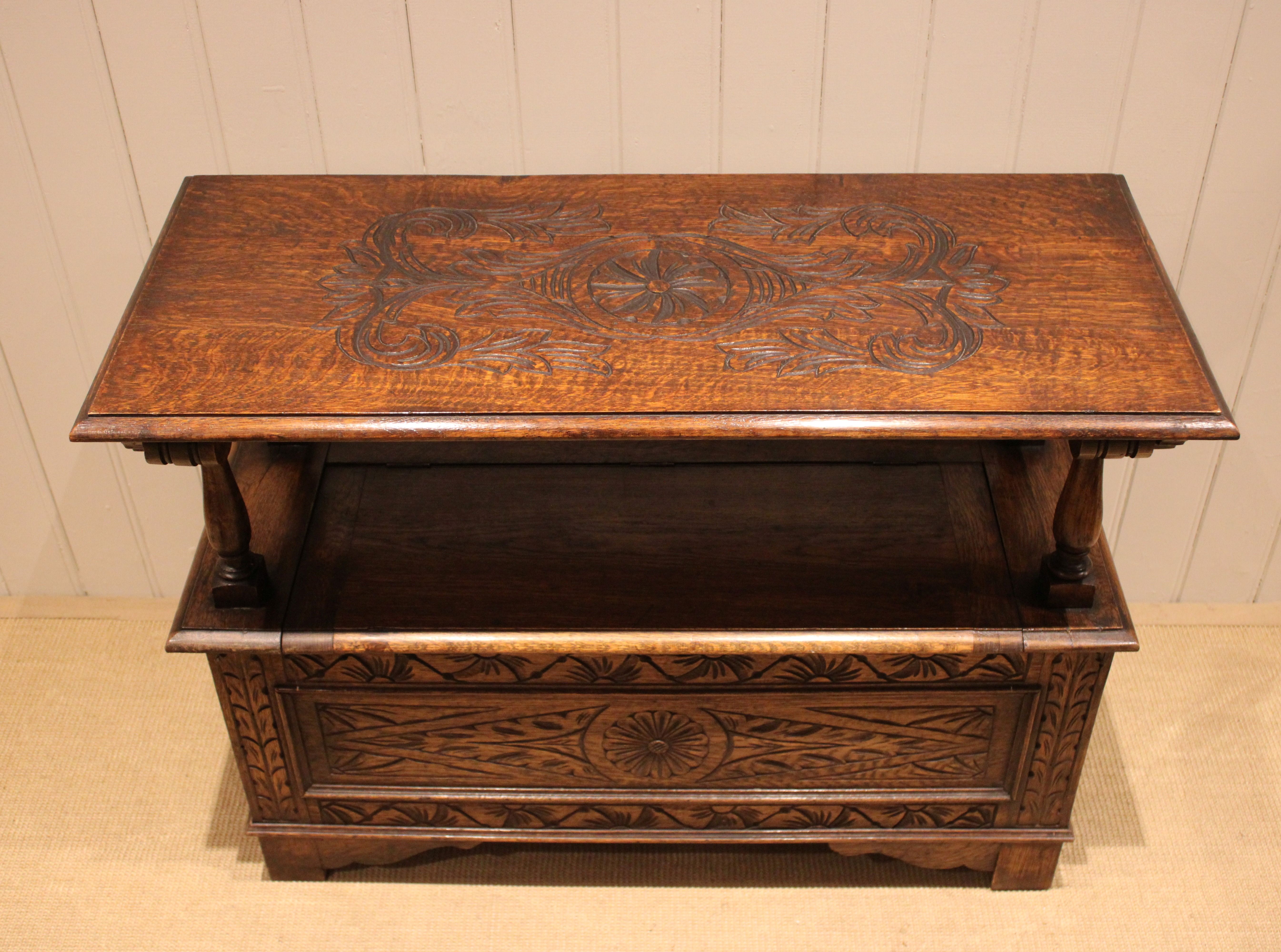 Solid oak monks bench having a carved panelled front, back and top with a lift up seat folding into a table with turned supports .The height when closed is 75 cm