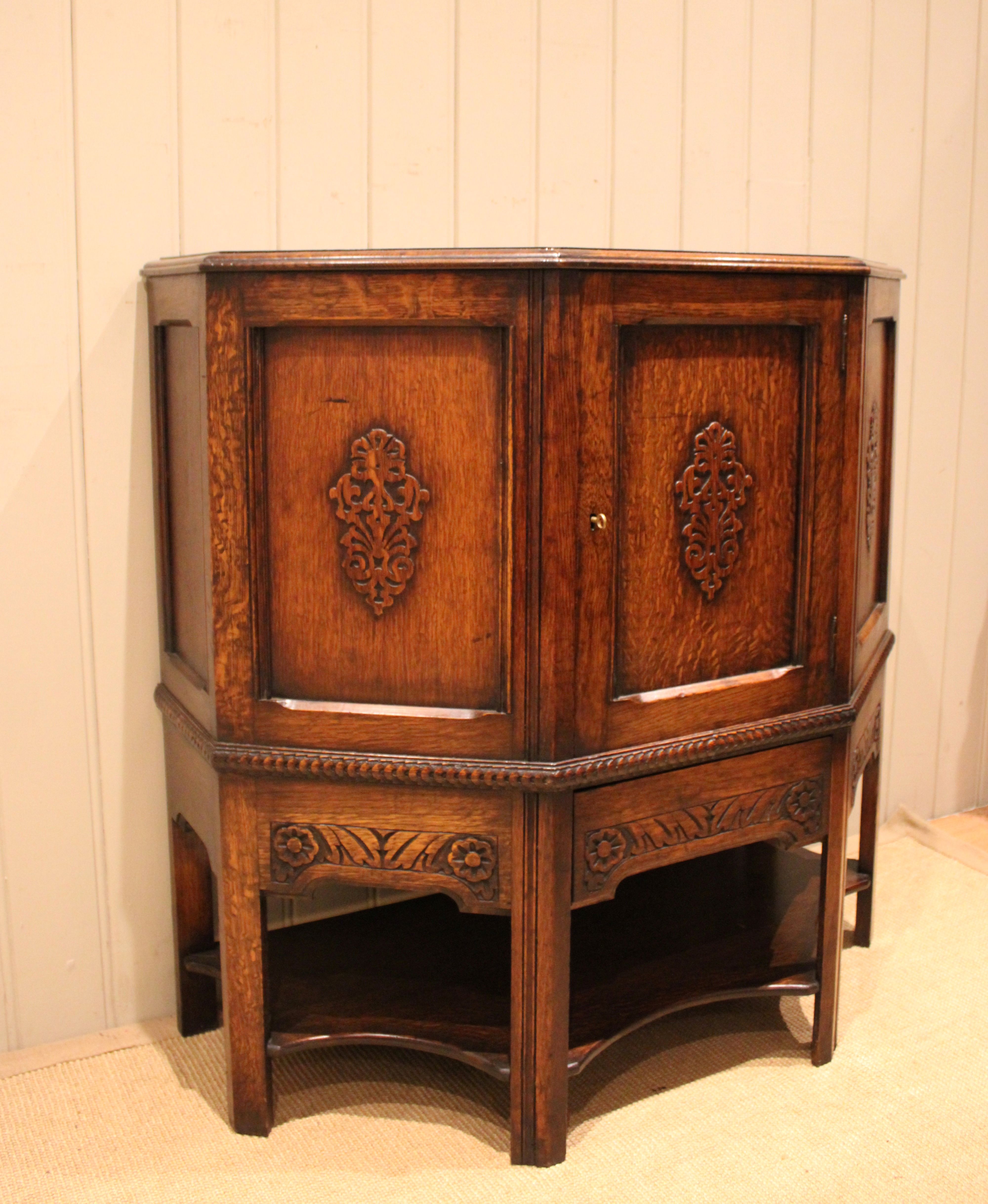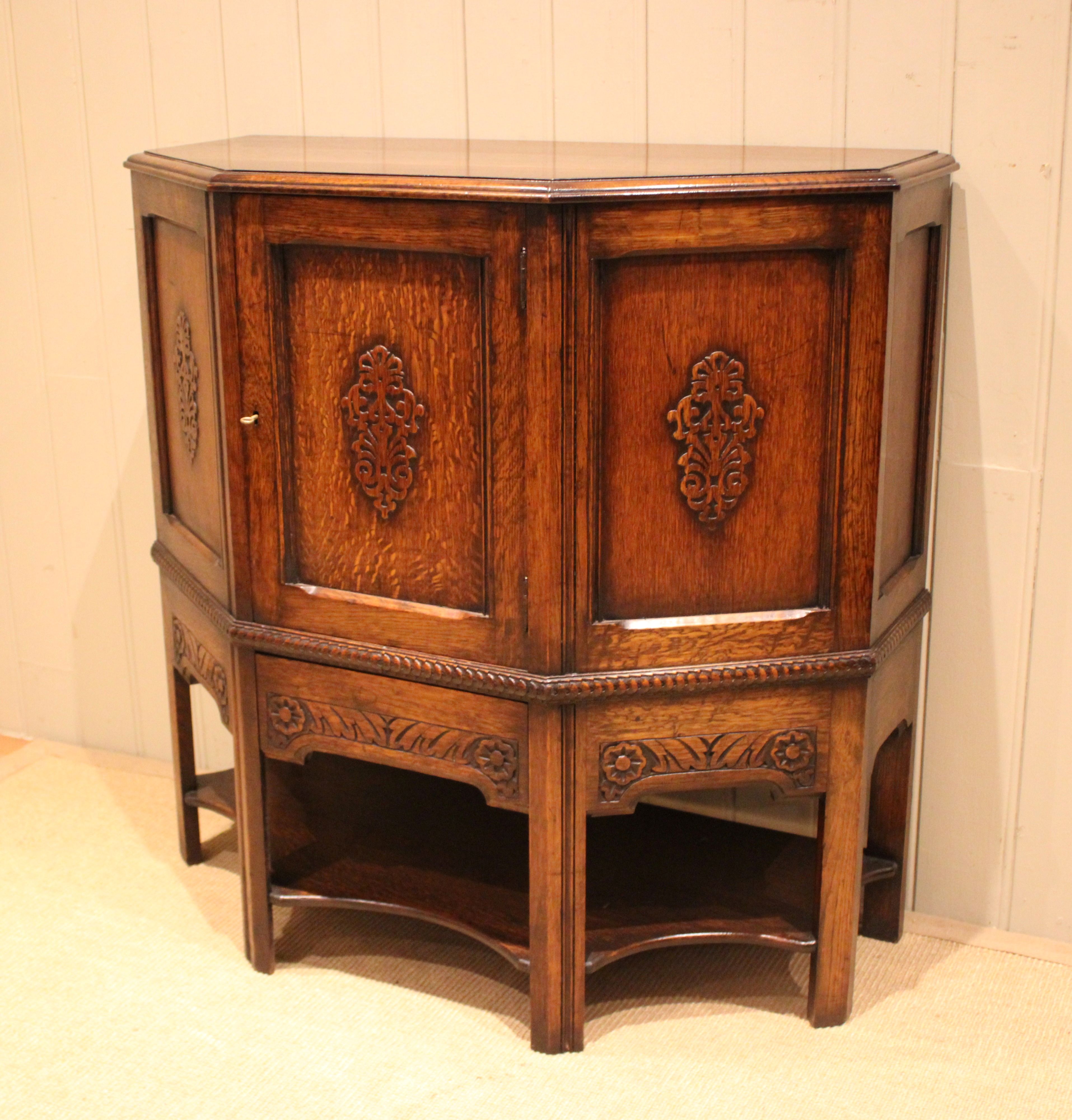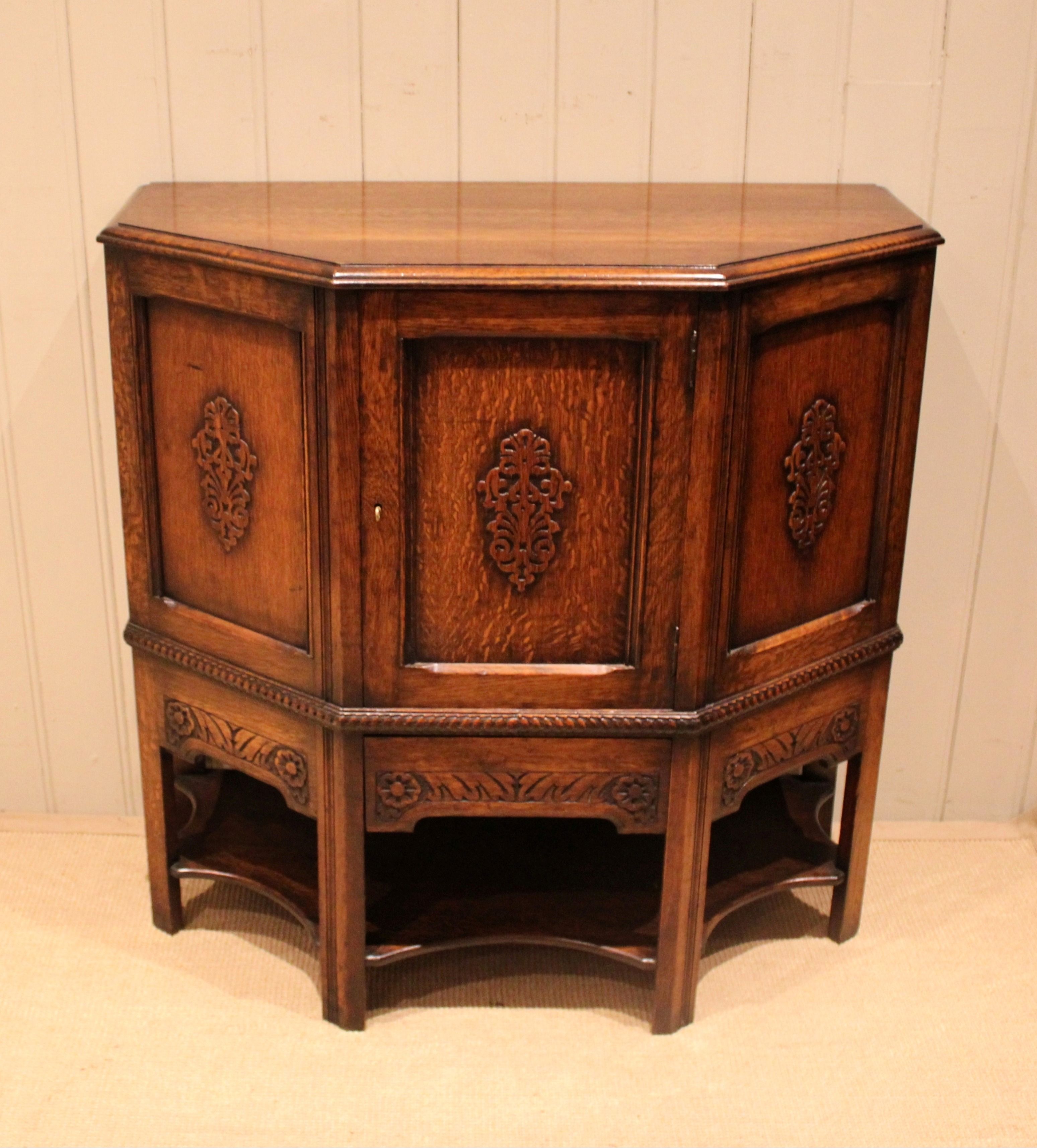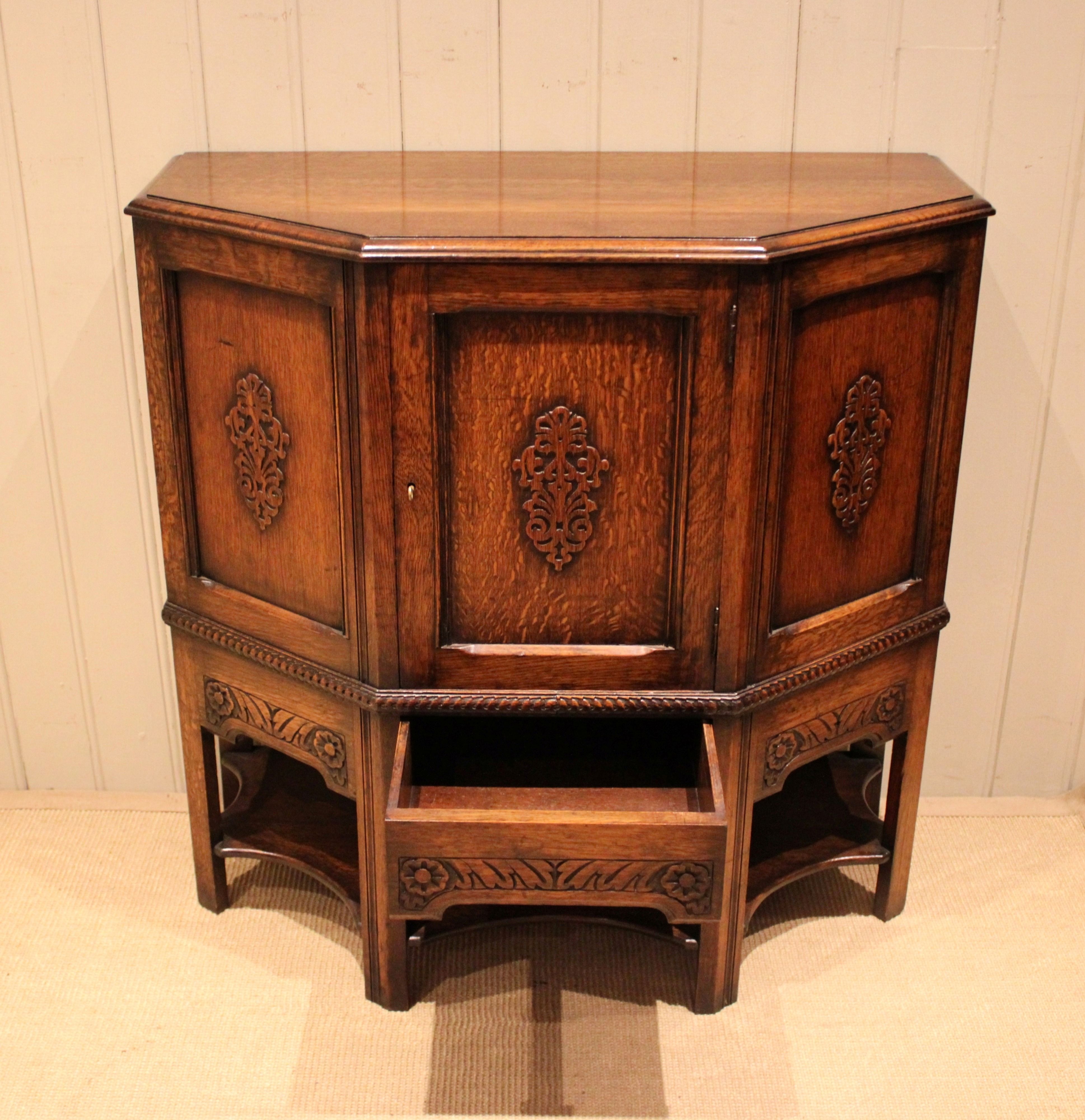 Solid oak cabinet having canted corners with three carved panels to the front , having a carved apron to the base , one of which is a drawer , fitted internally with a curved shelf , raised on straight supports .