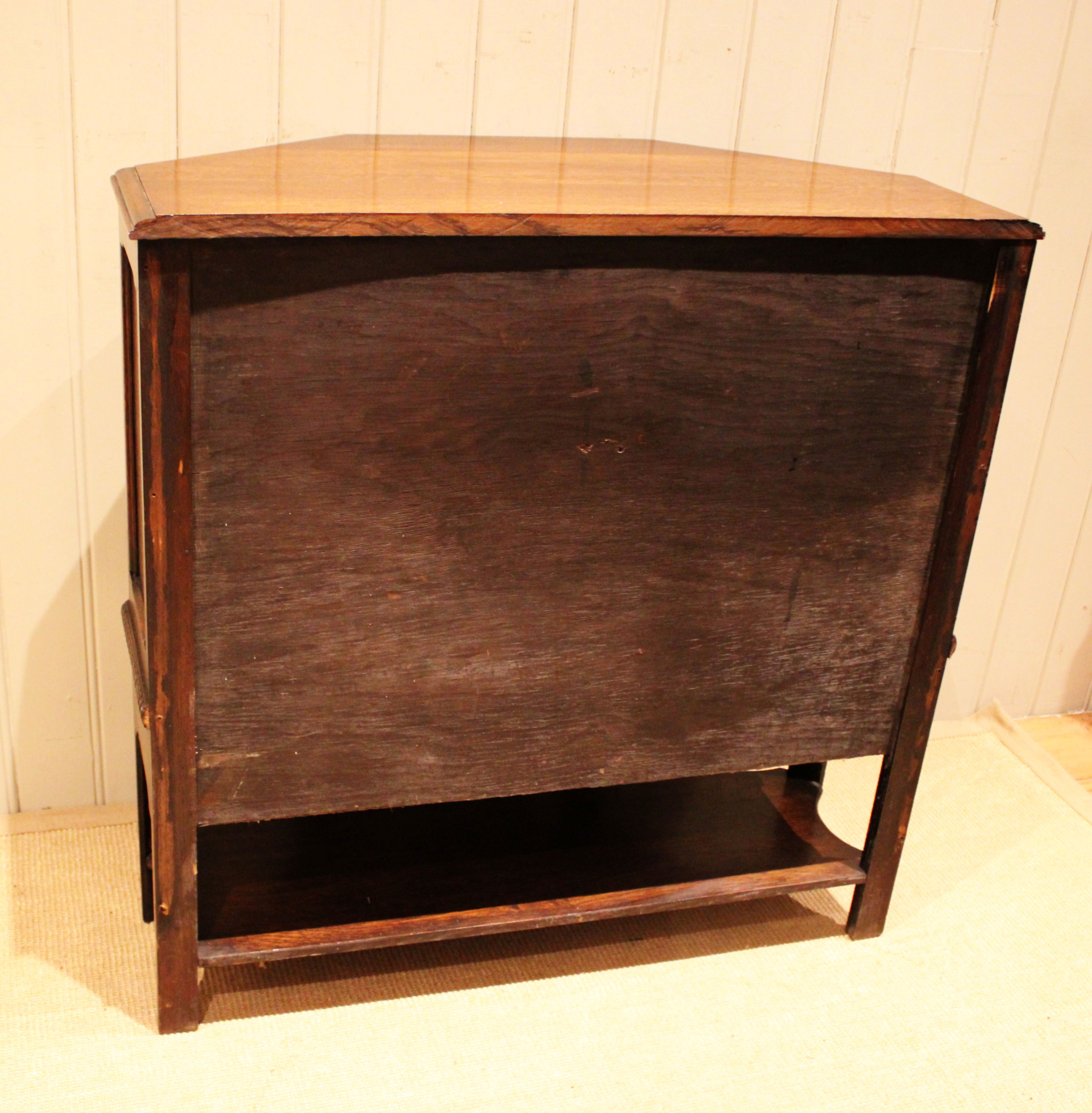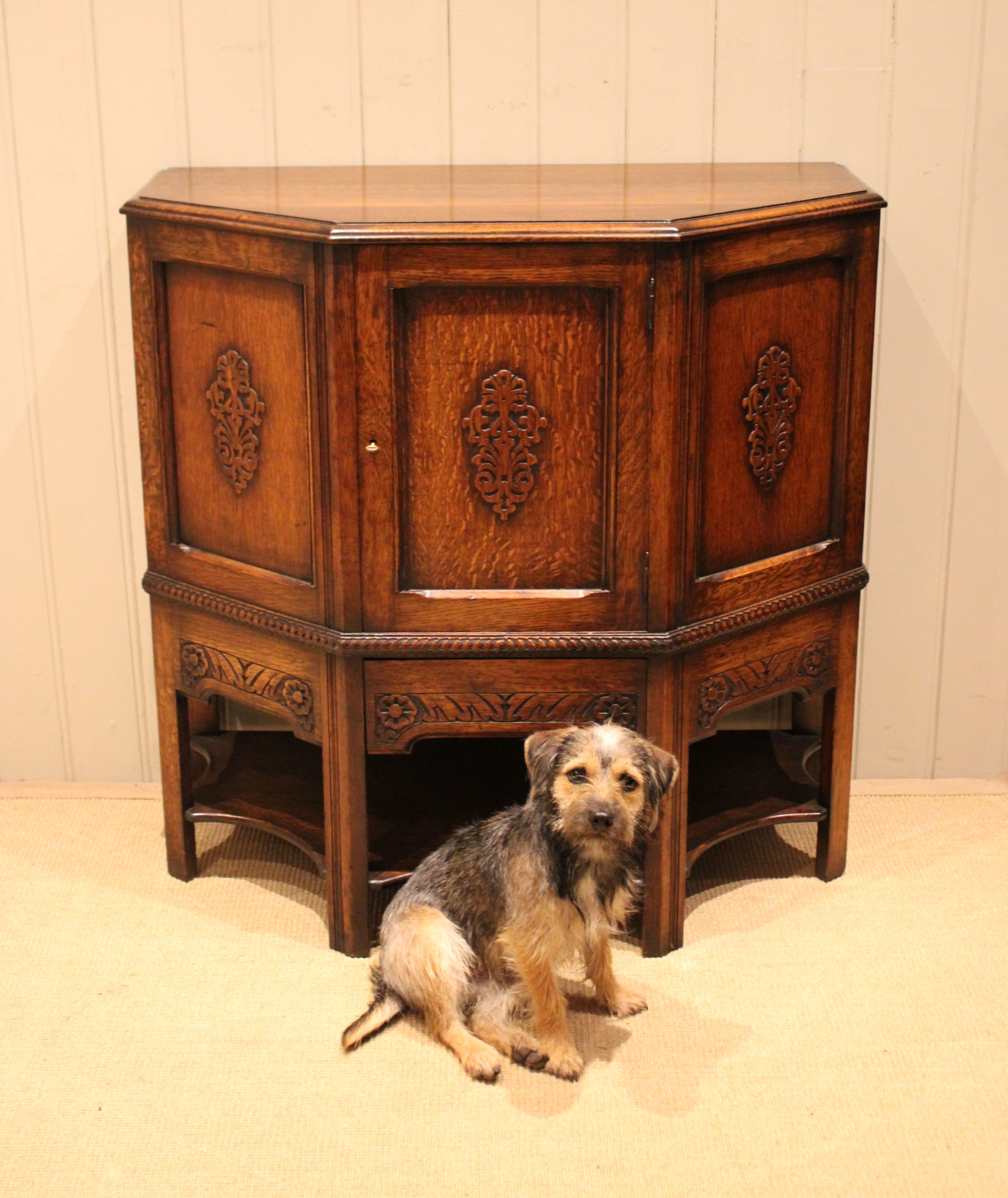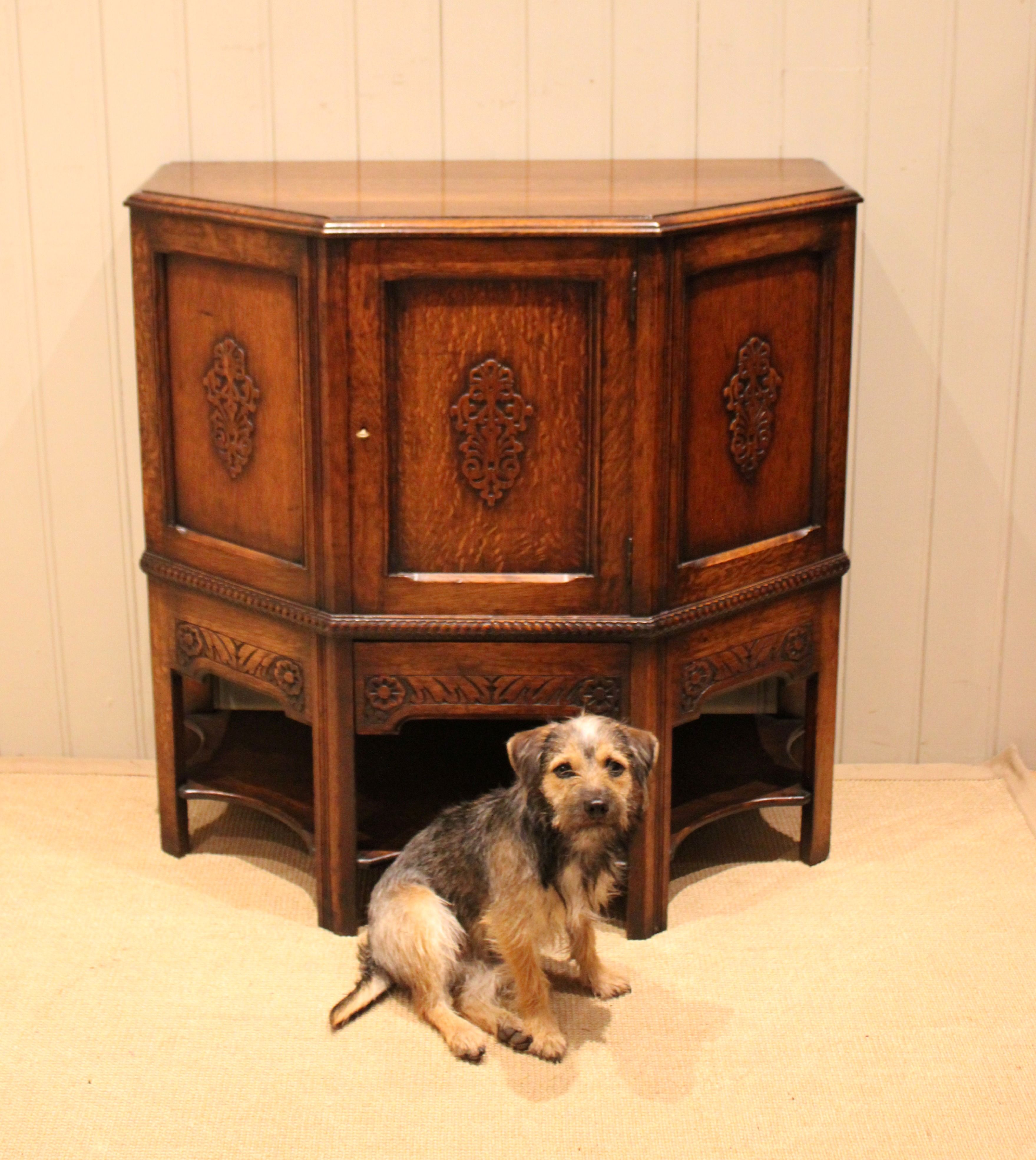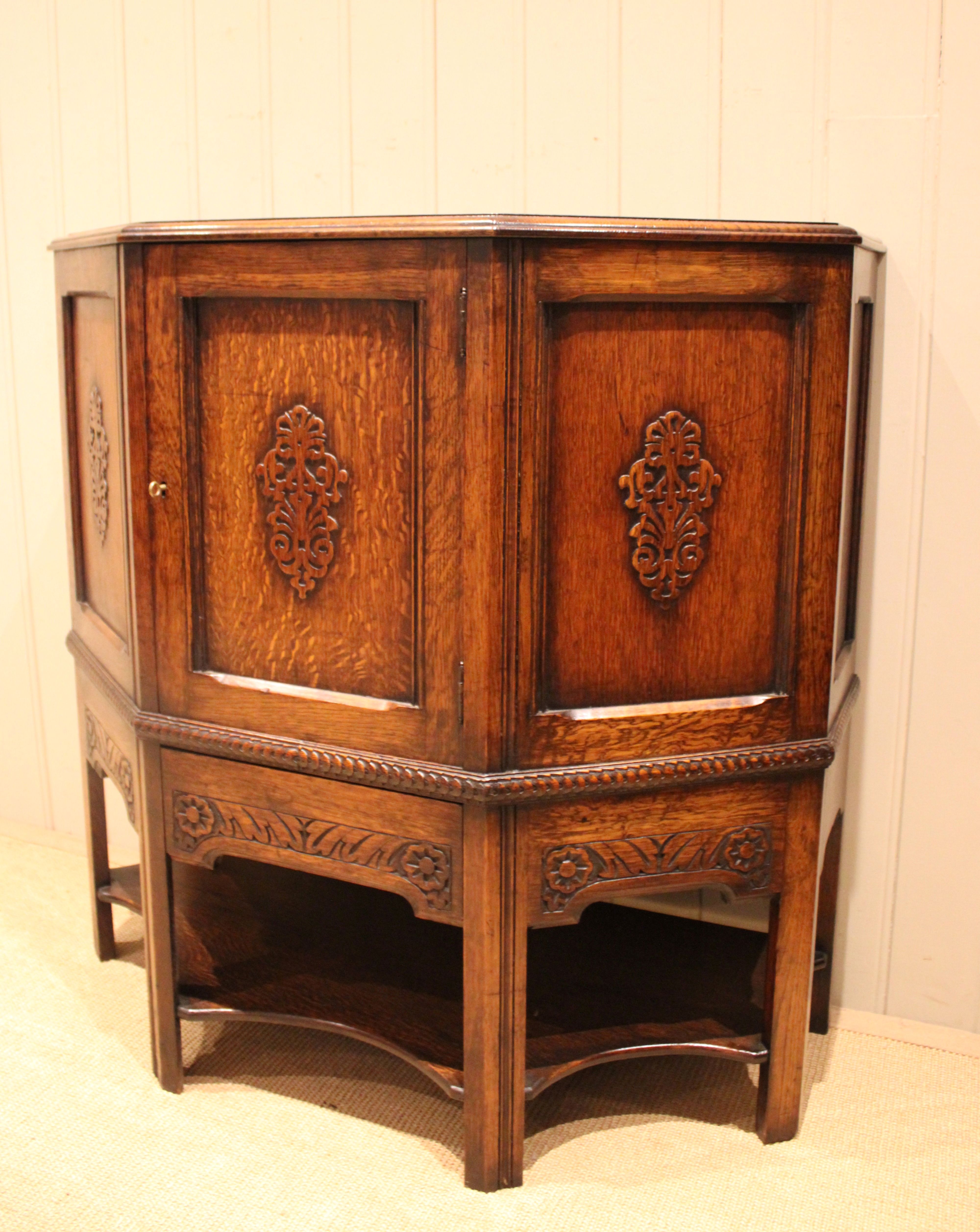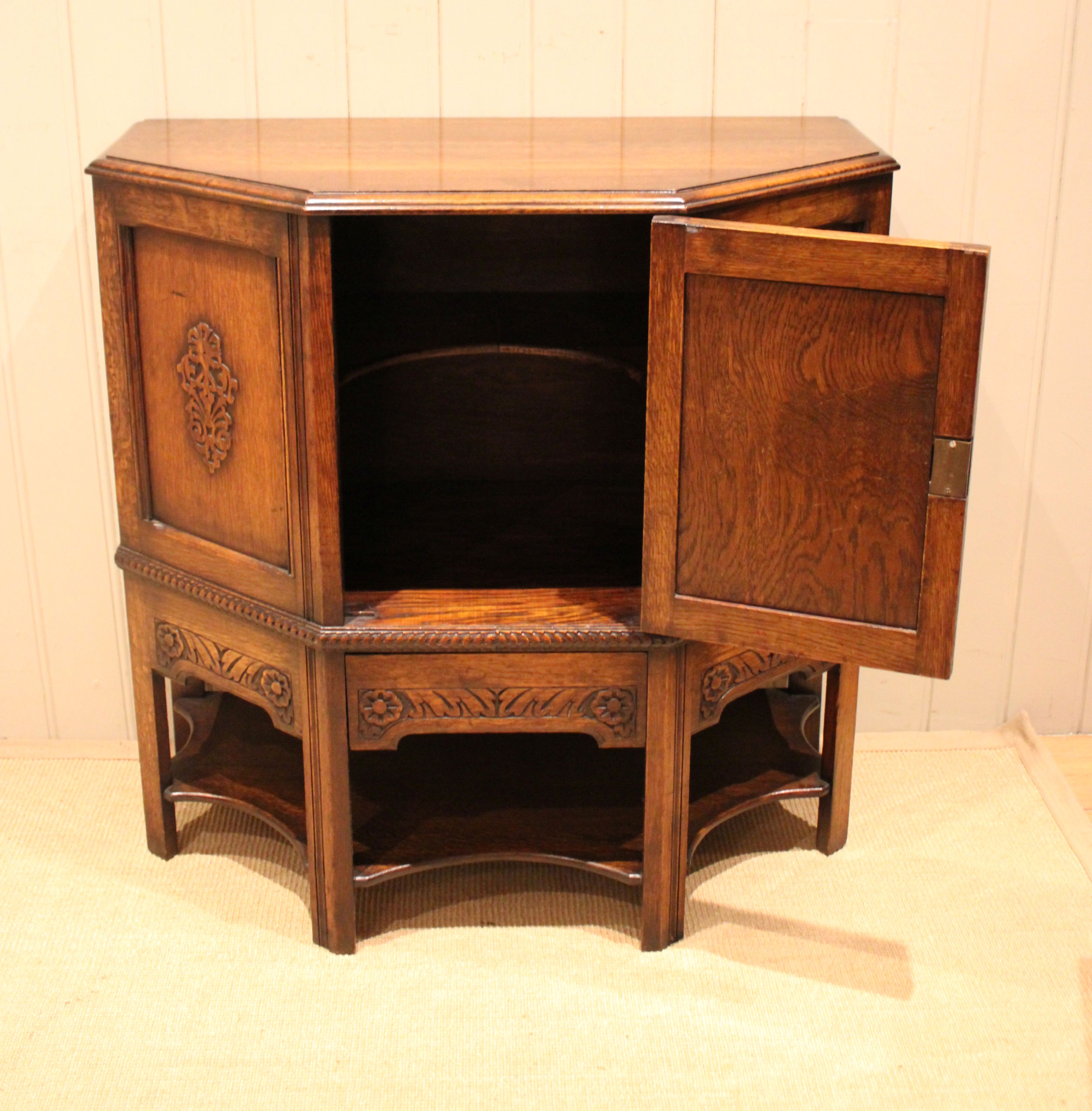 Solid oak cabinet having canted corners with three carved panels to the front , having a carved apron to the base , one of which is a drawer , fitted internally with a curved shelf , raised on straight supports .