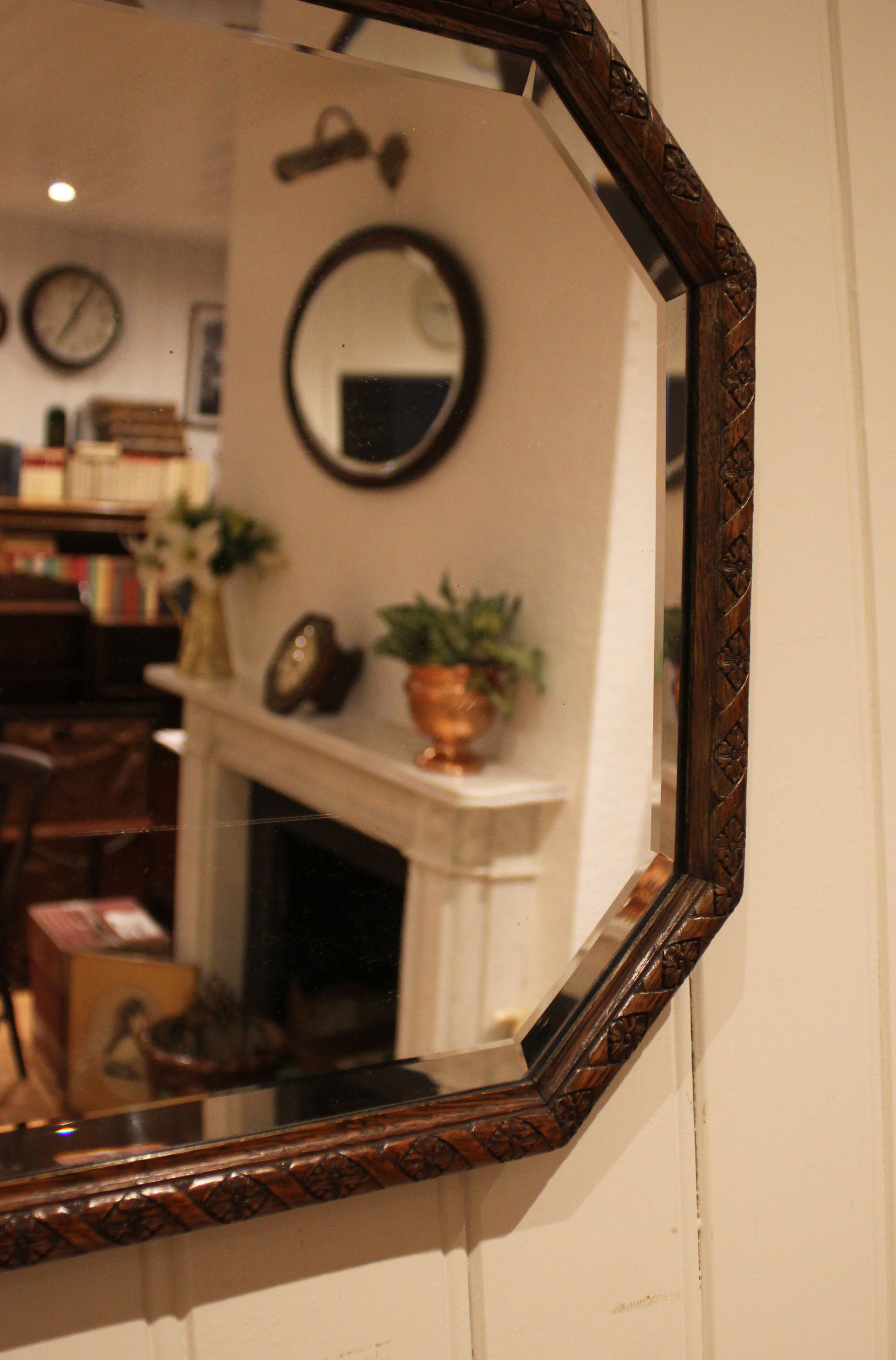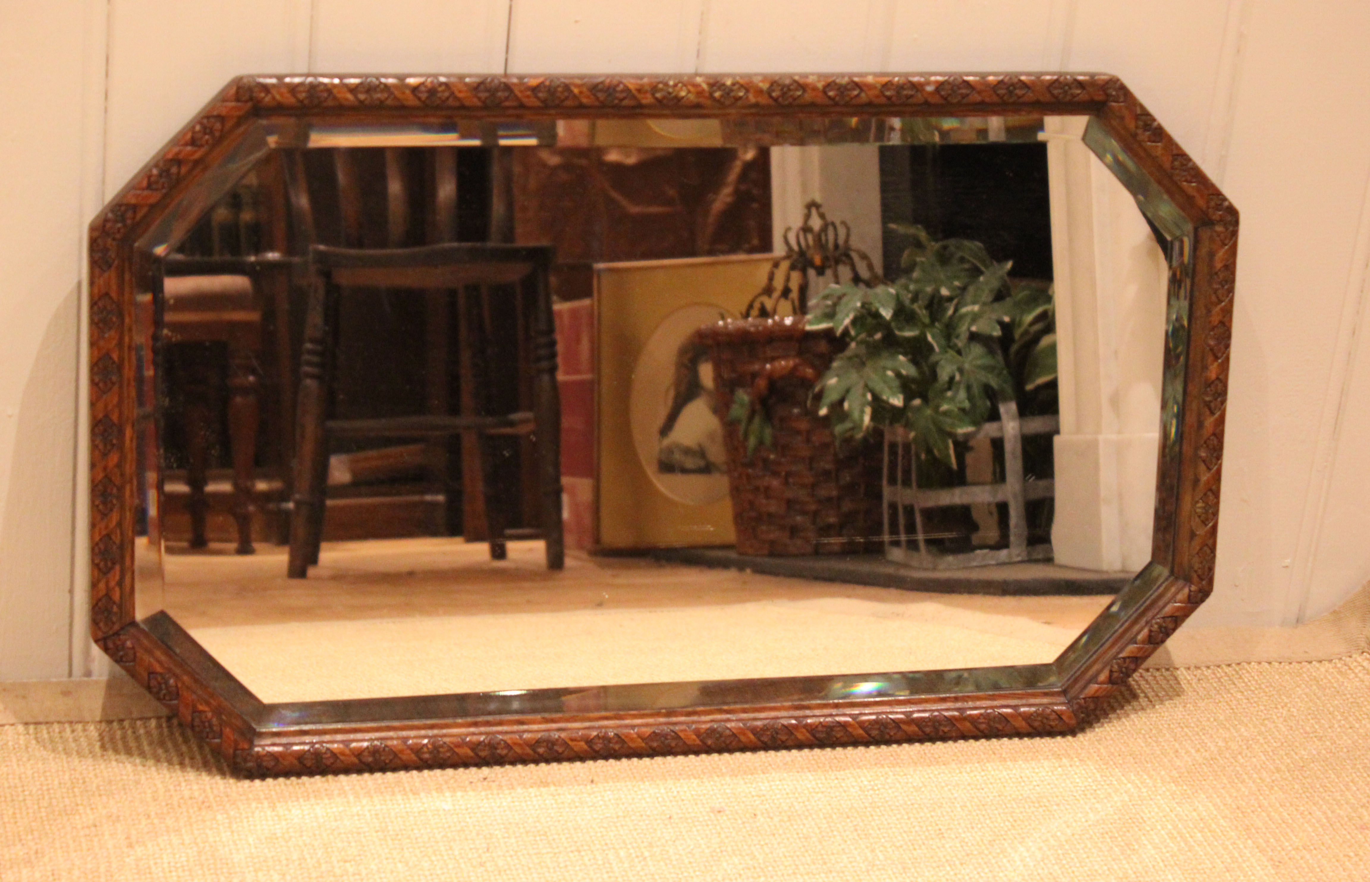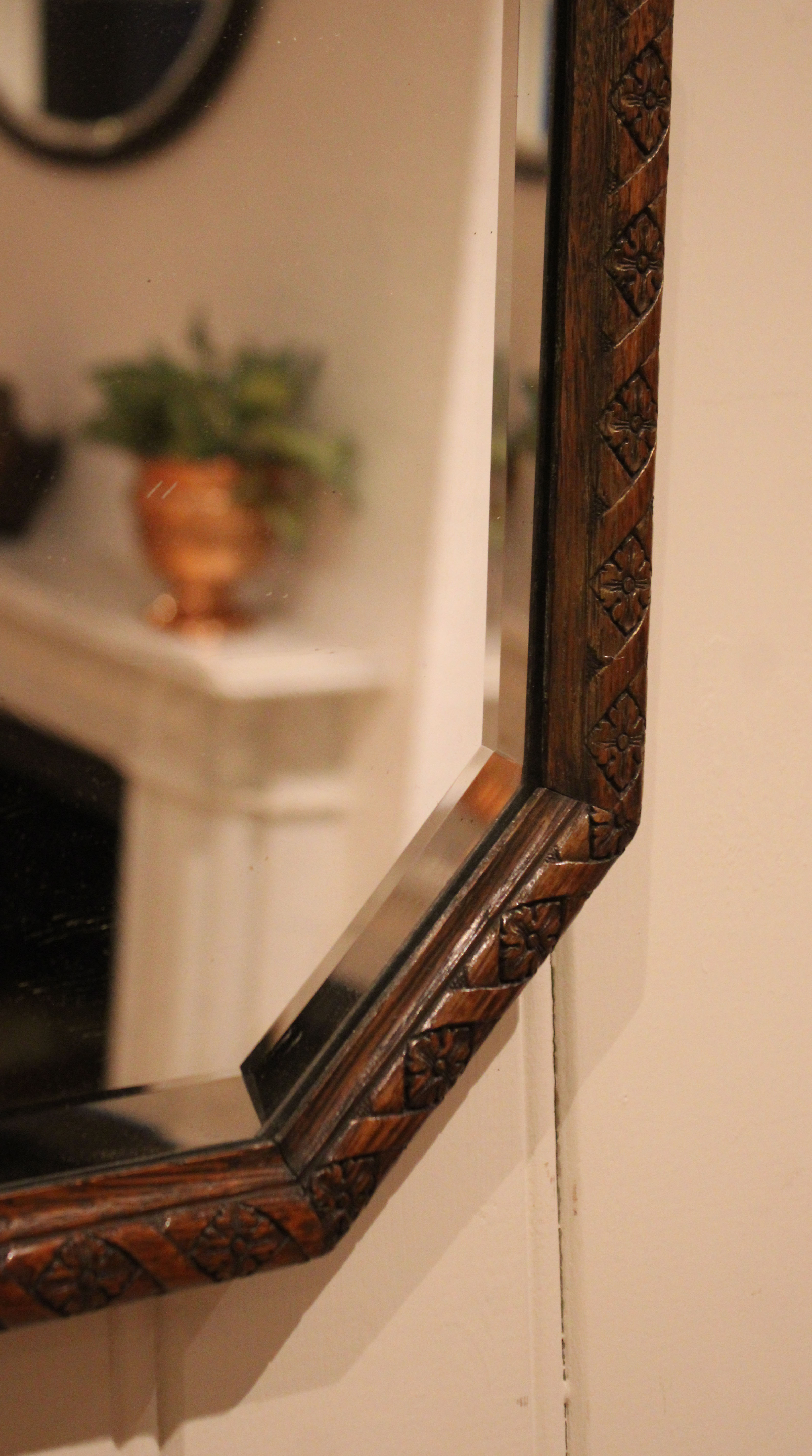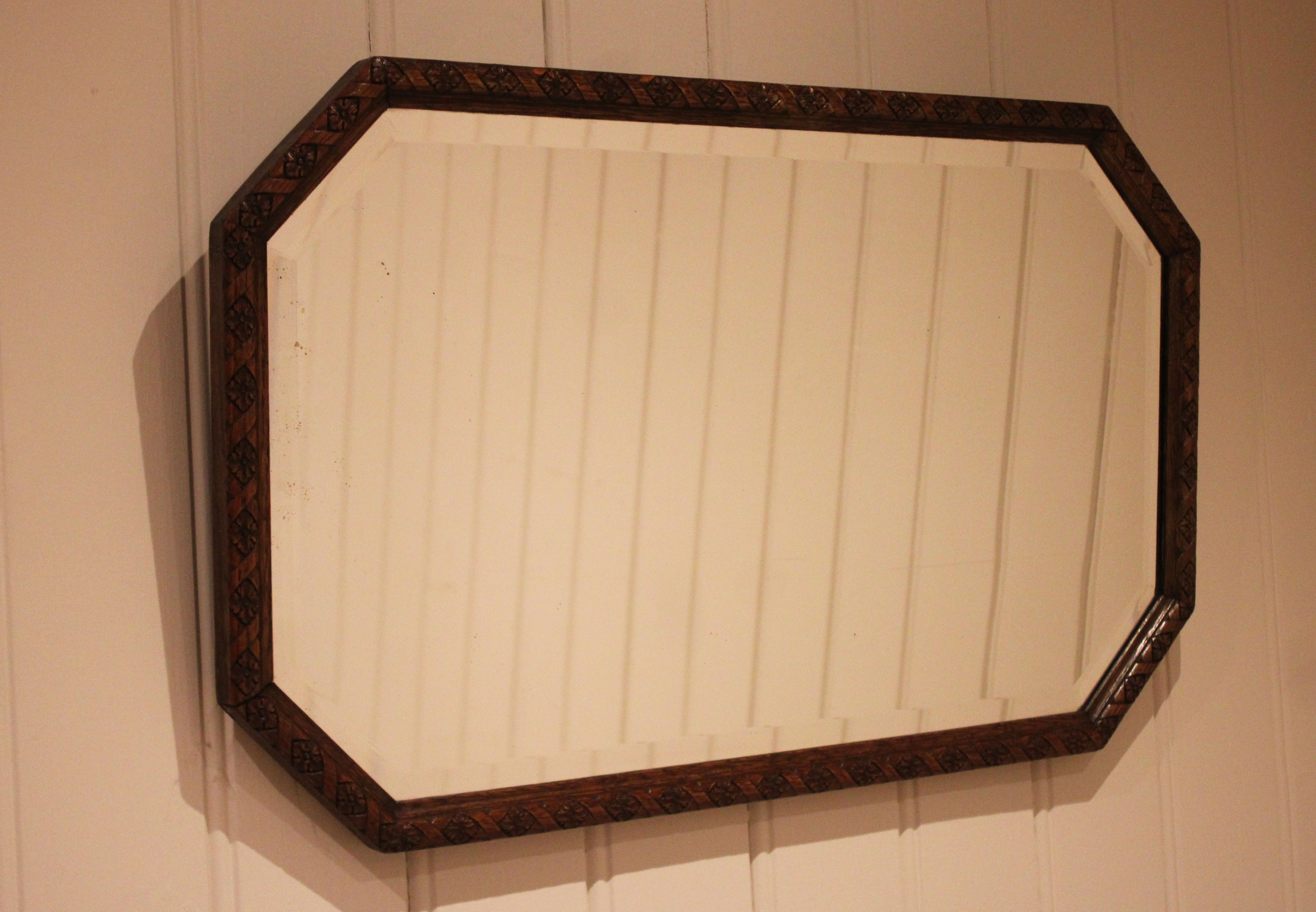 Oak framed wall mirror having floral carved decoration with canted corners and an inset bevel edge mirror .