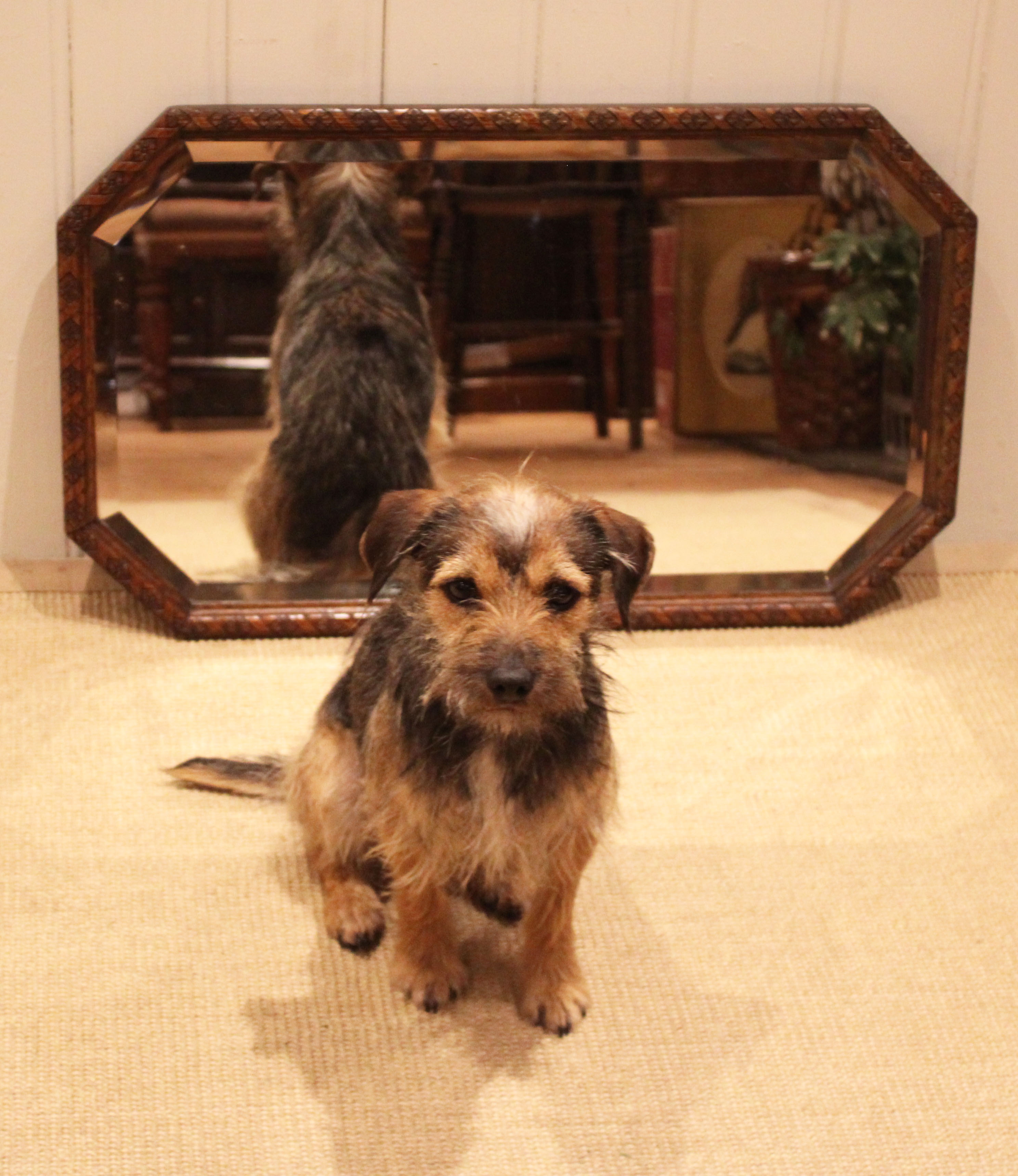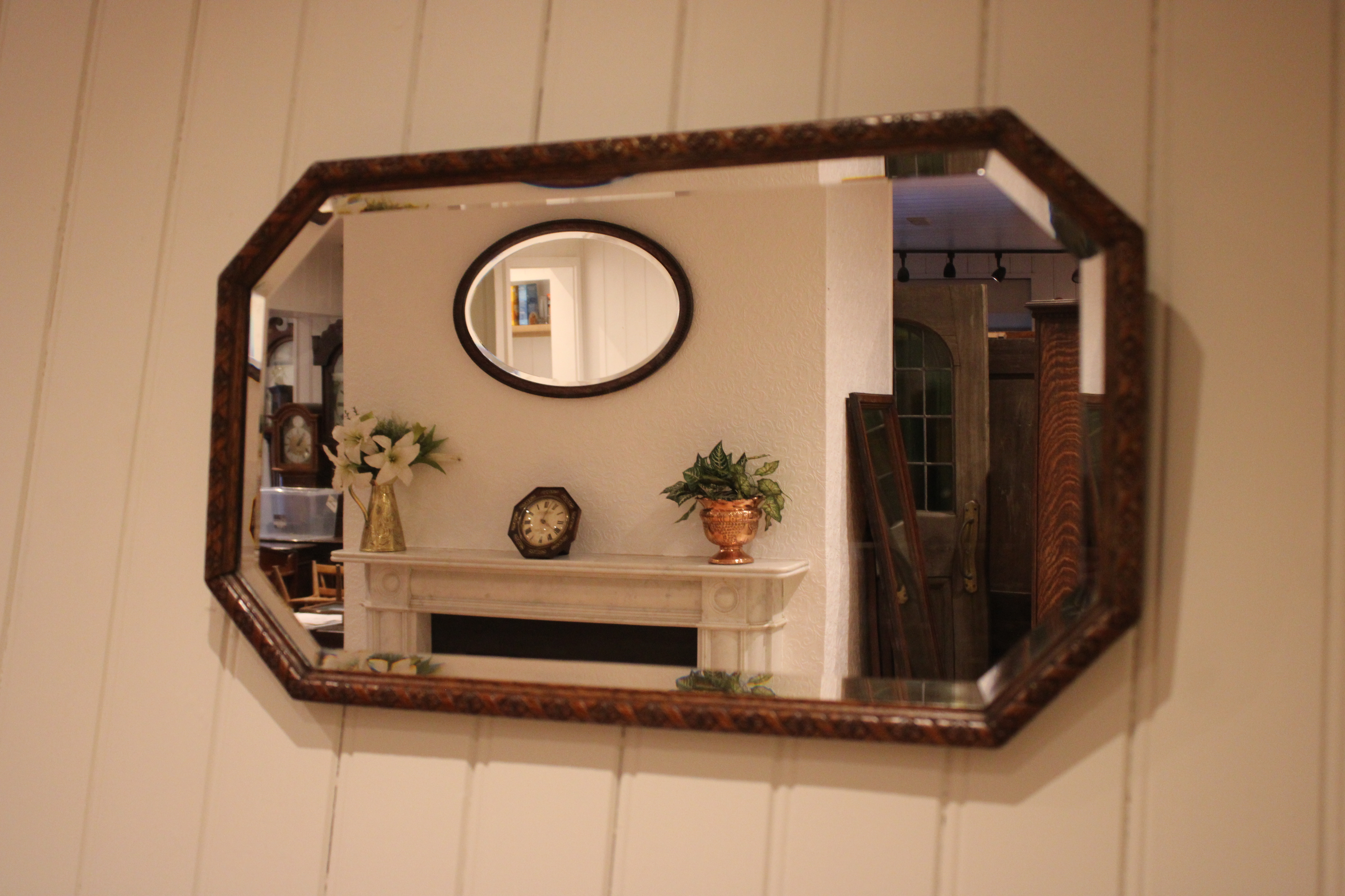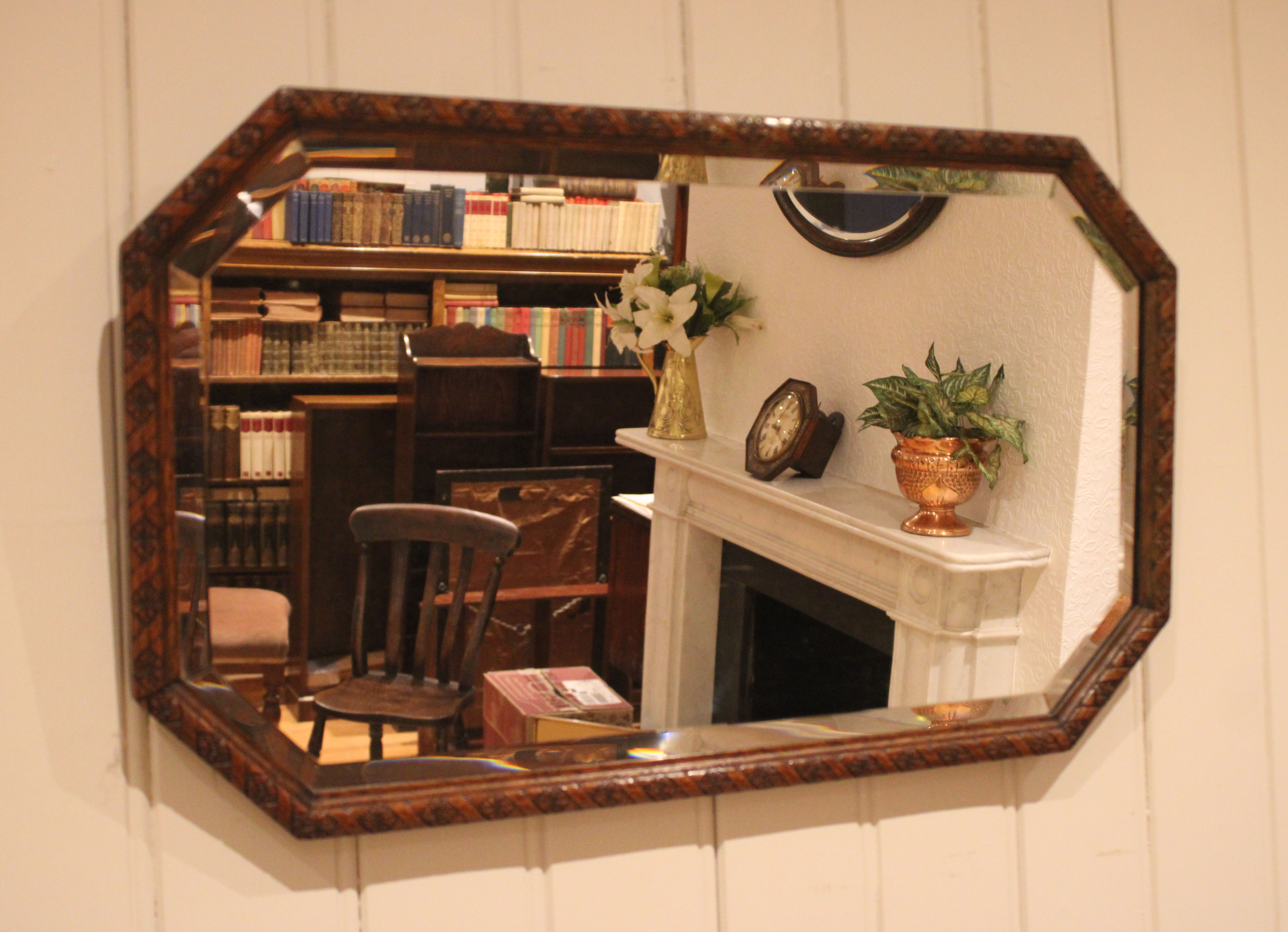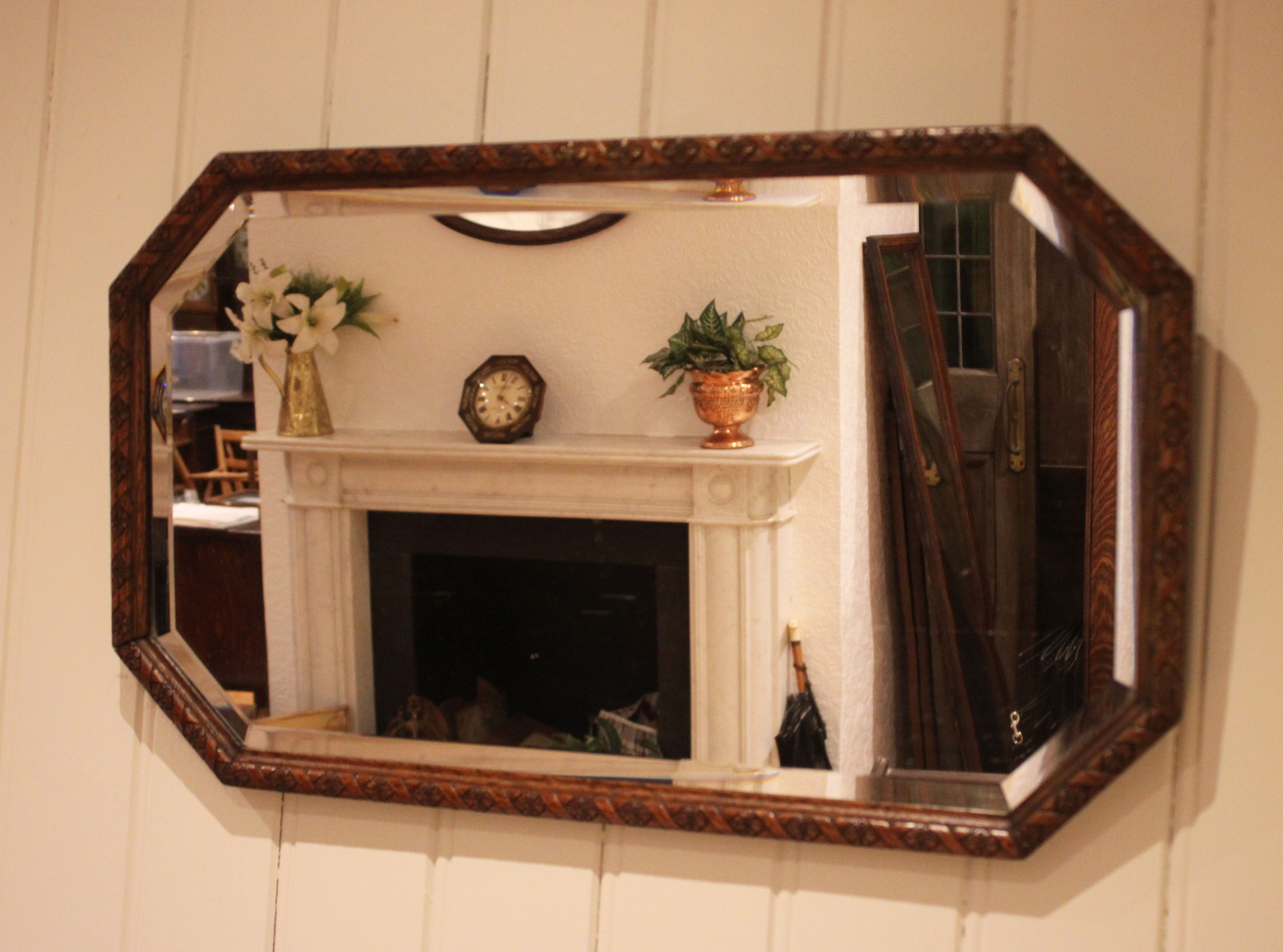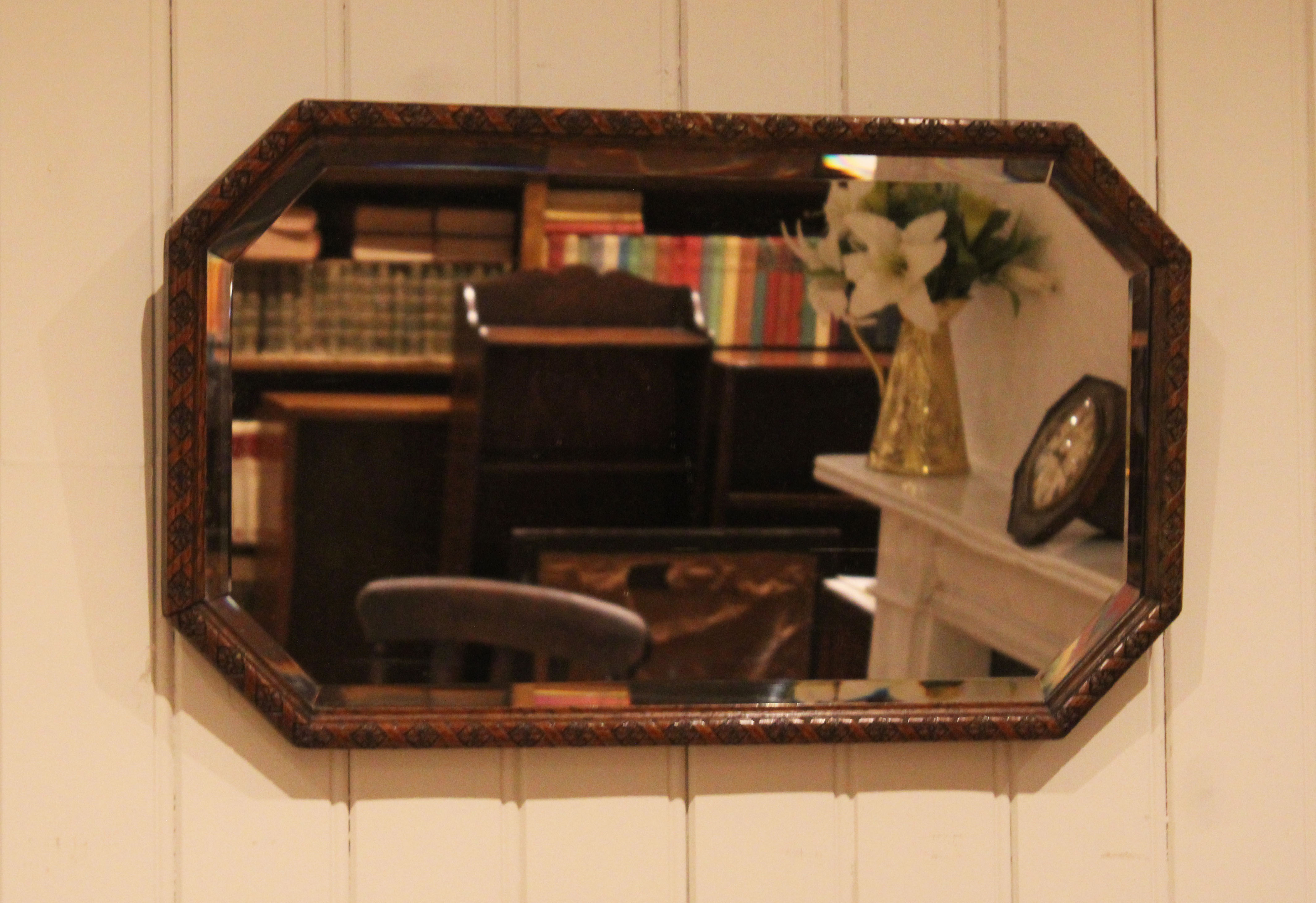 Oak framed wall mirror having floral carved decoration with canted corners and an inset bevel edge mirror .