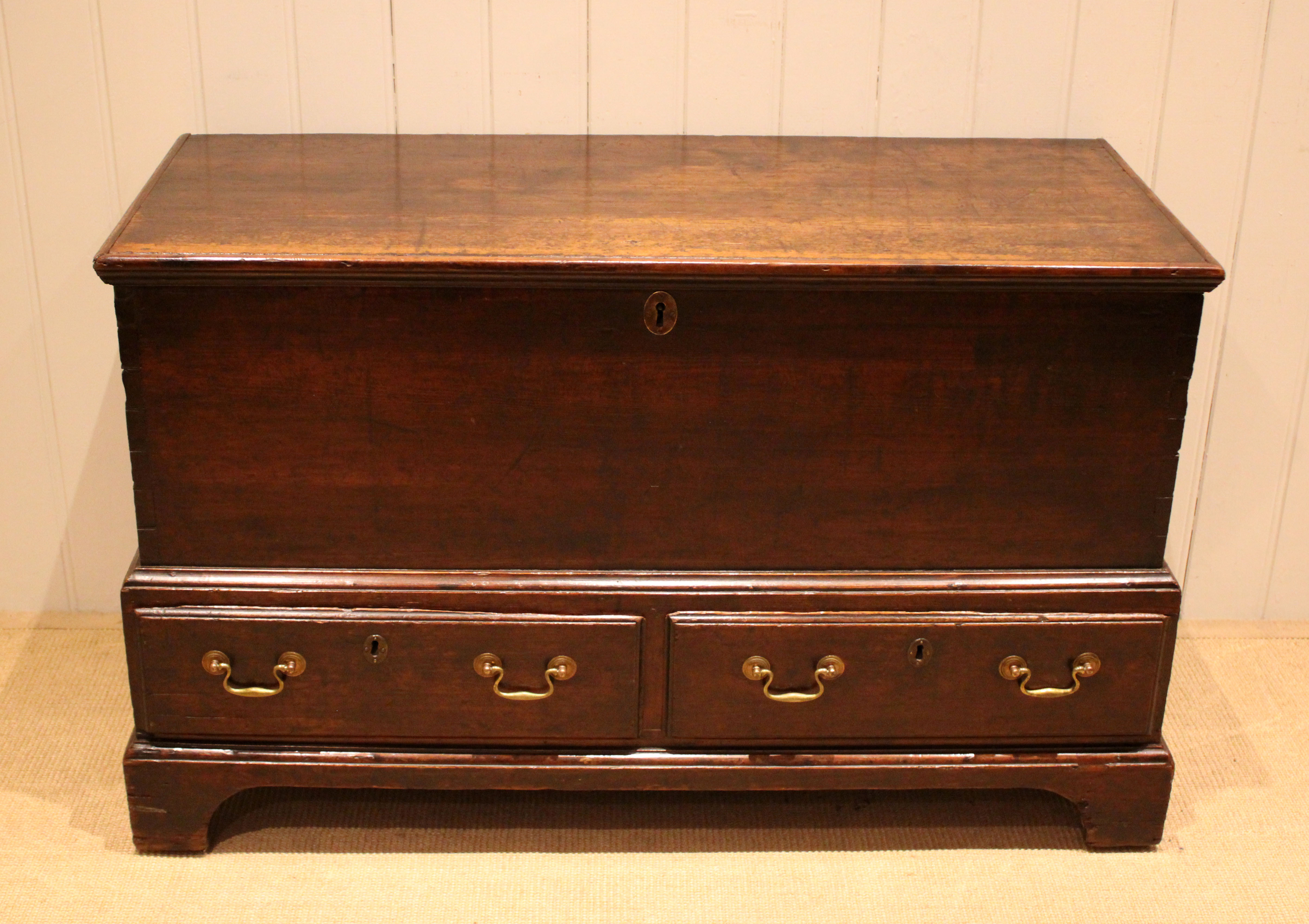 French oak serpentine chest of three long drawers raised on cabriole legs