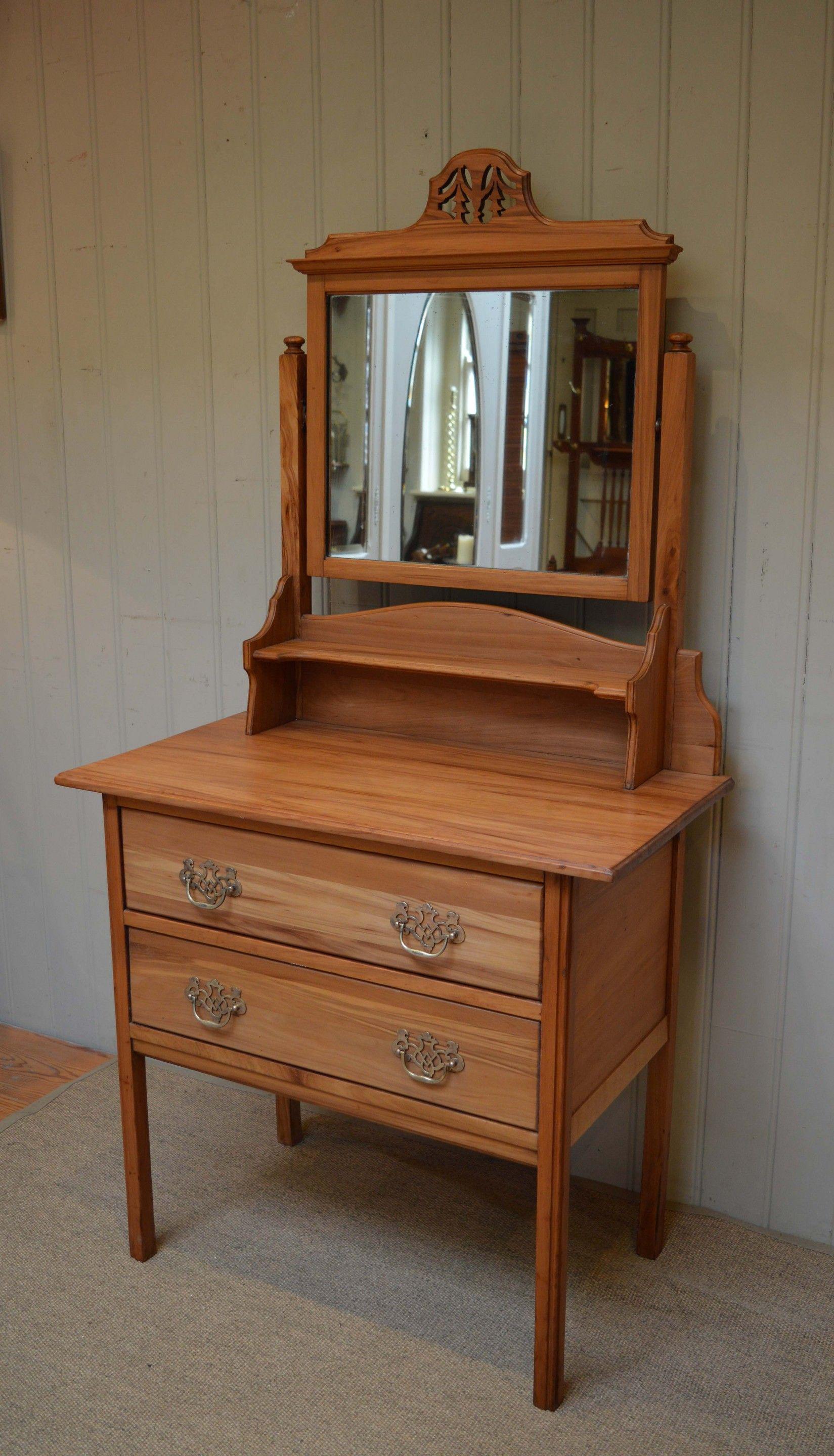 Satin walnut dressing table having two drawers with brass handles and a shelved mirrored back raised on straight legs
