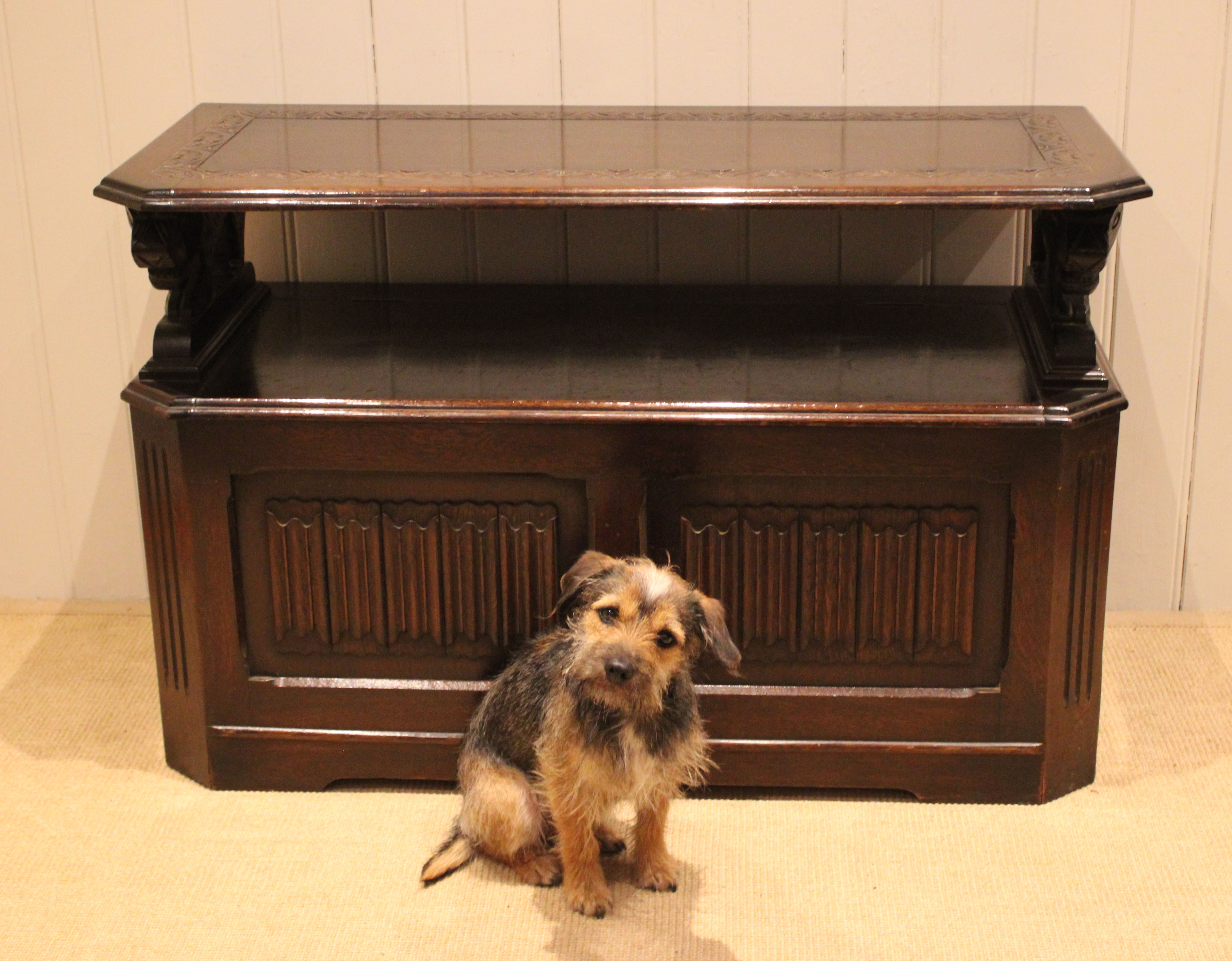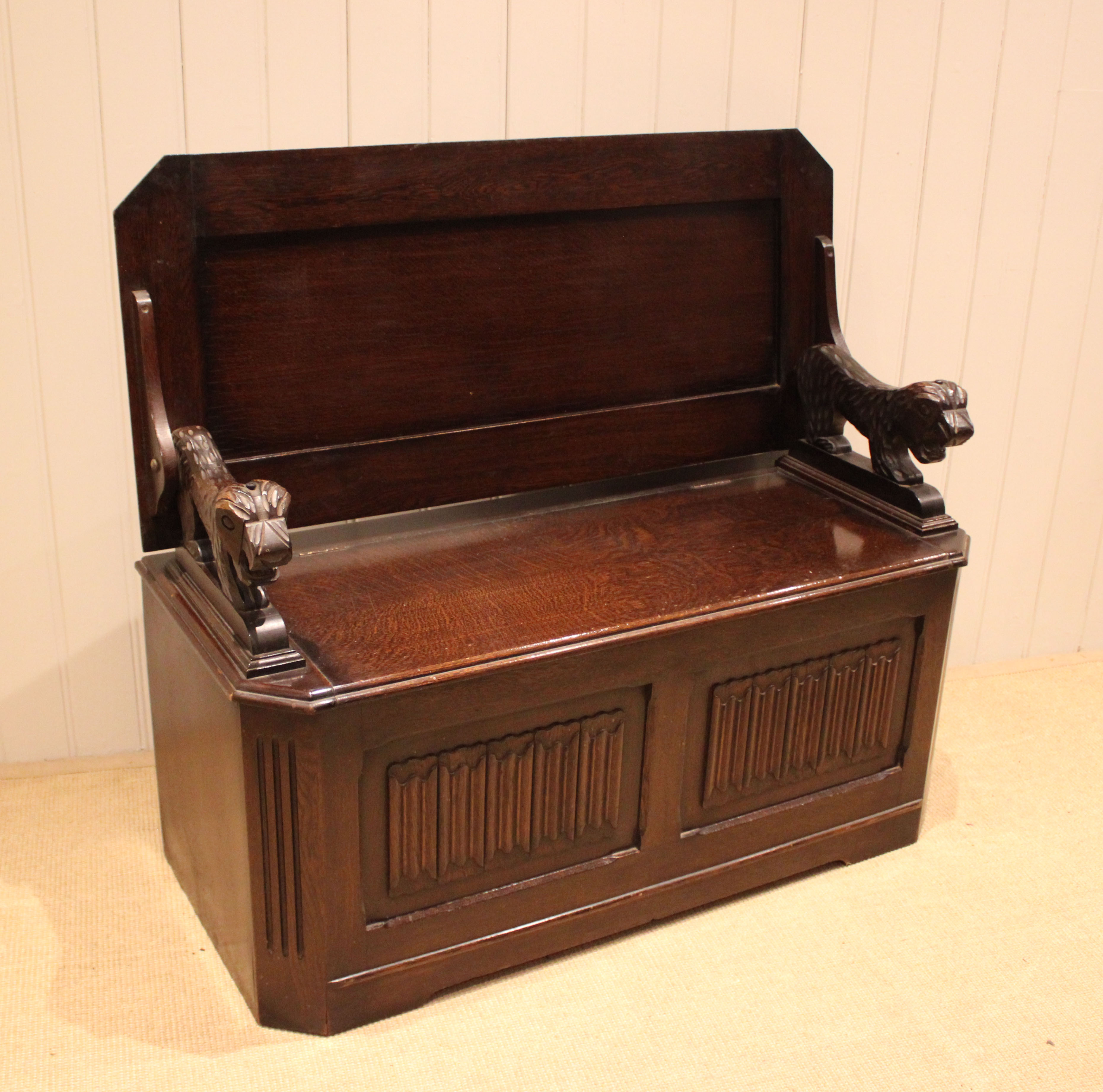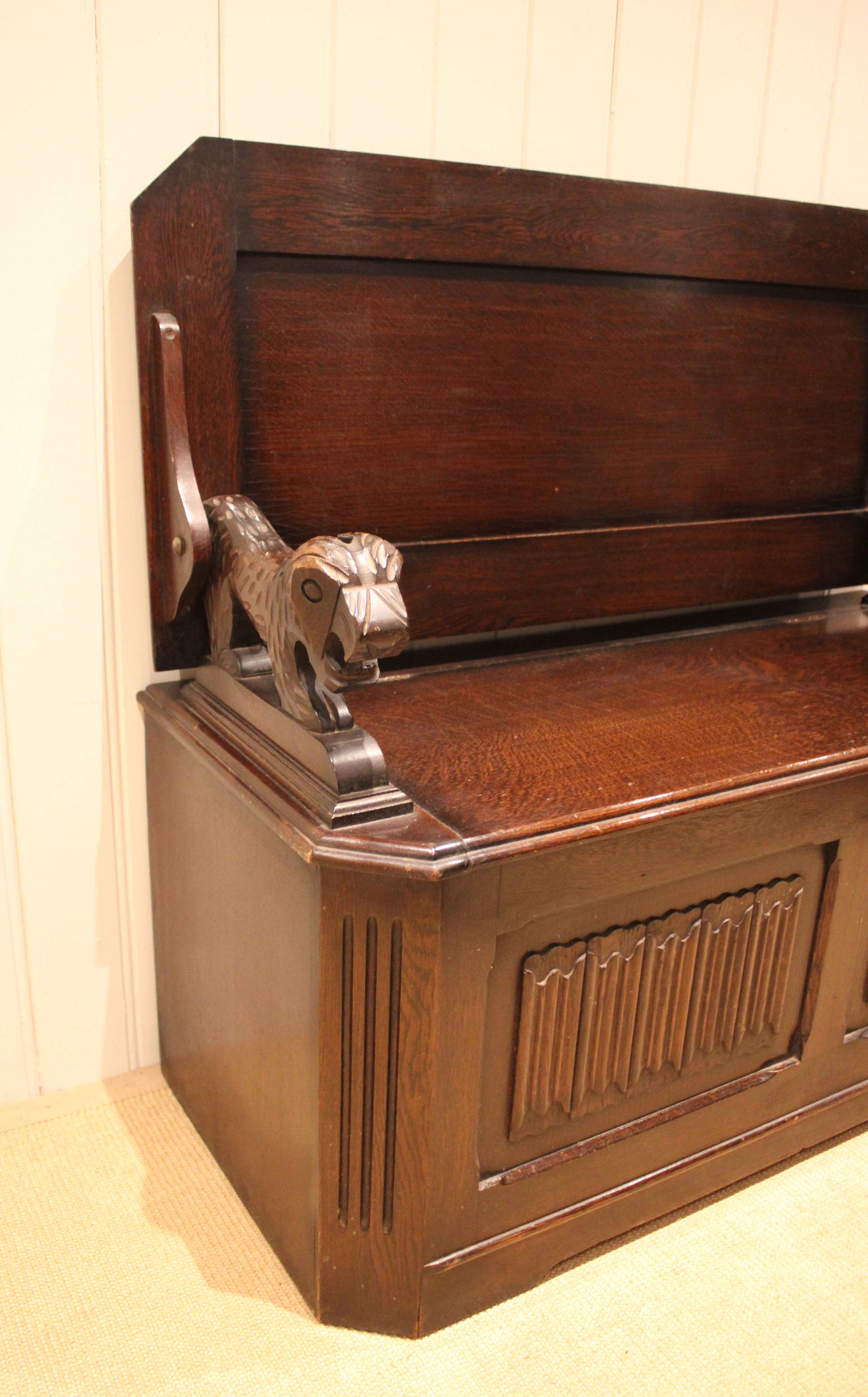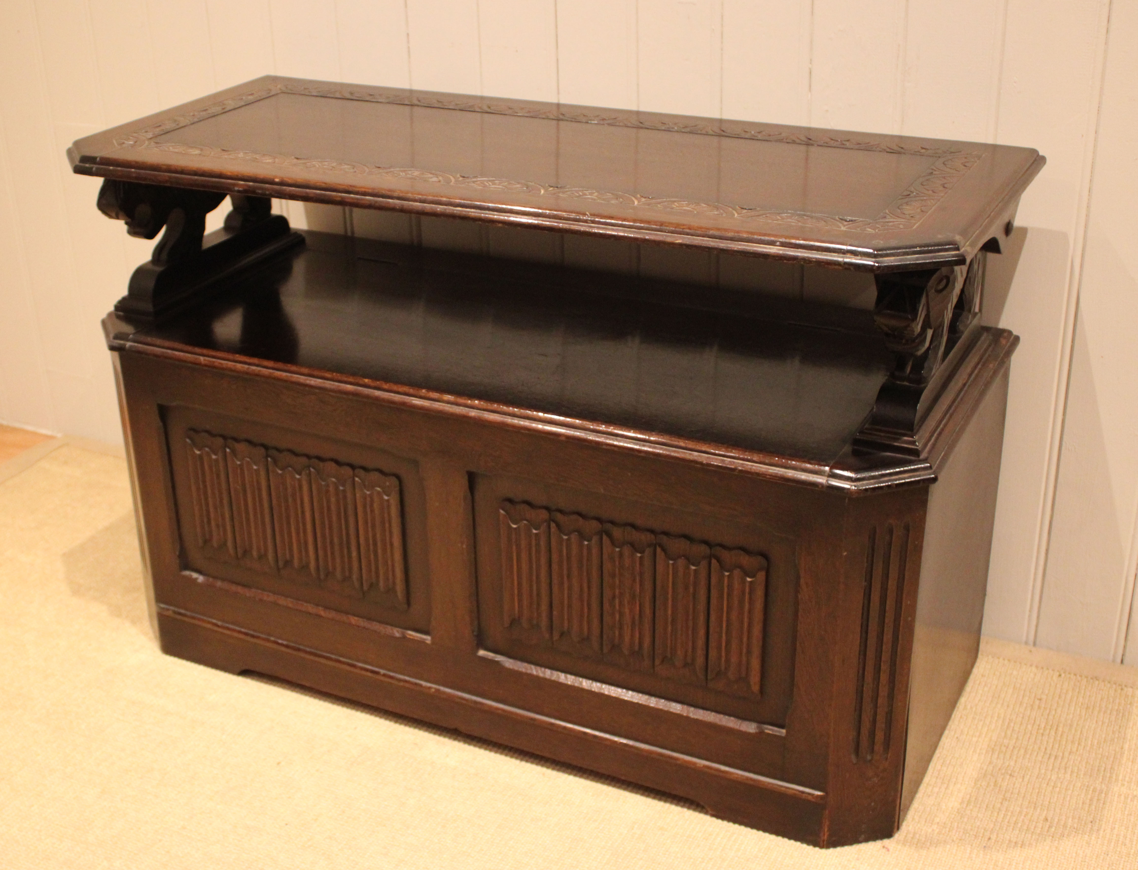 Dark oak monks bench having a linenfold carved front with a lift up seat for storage and a top that folds onto lion supports to become a table , having a carved decorated top with canted corners . The height when folded is 69.5 cm .