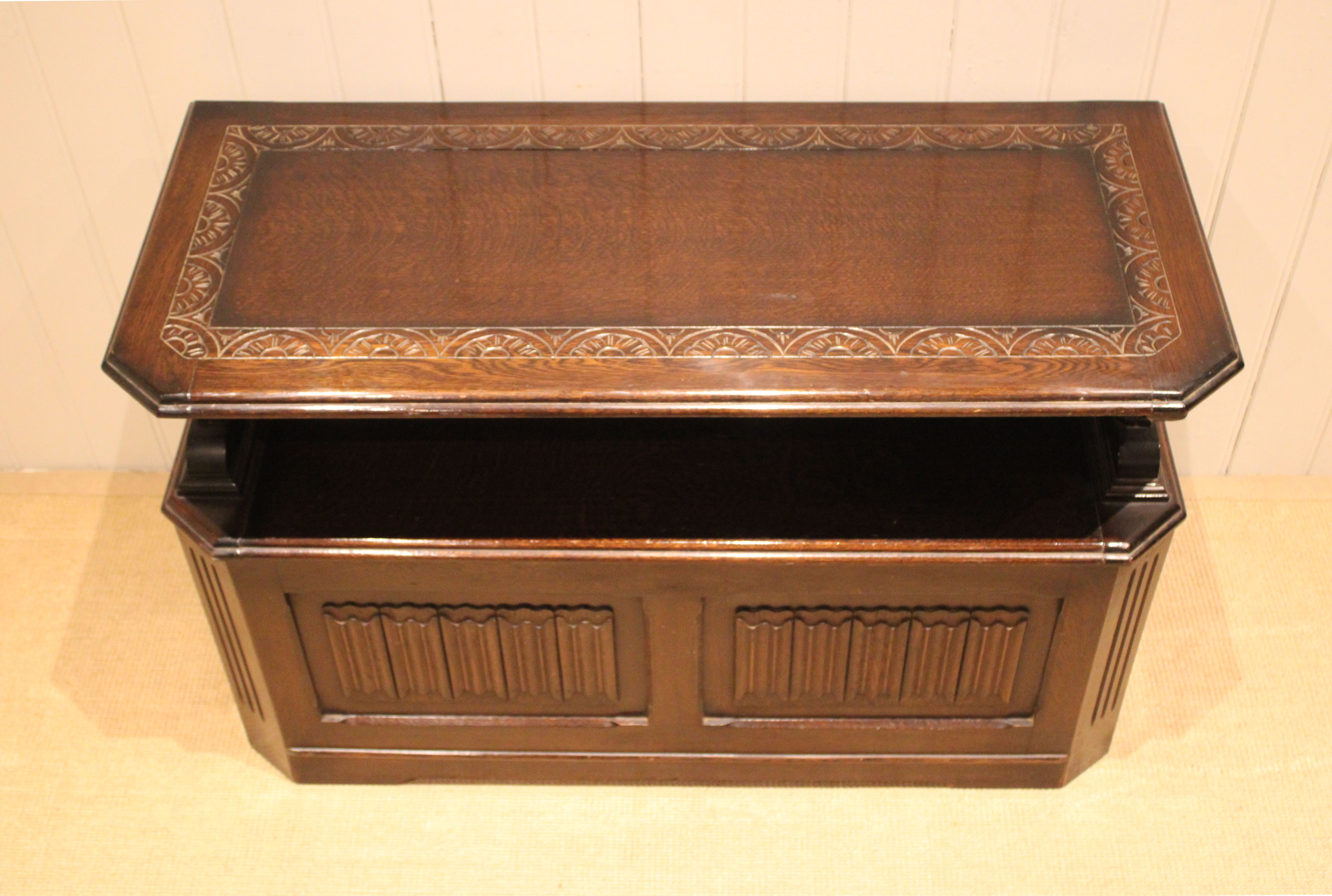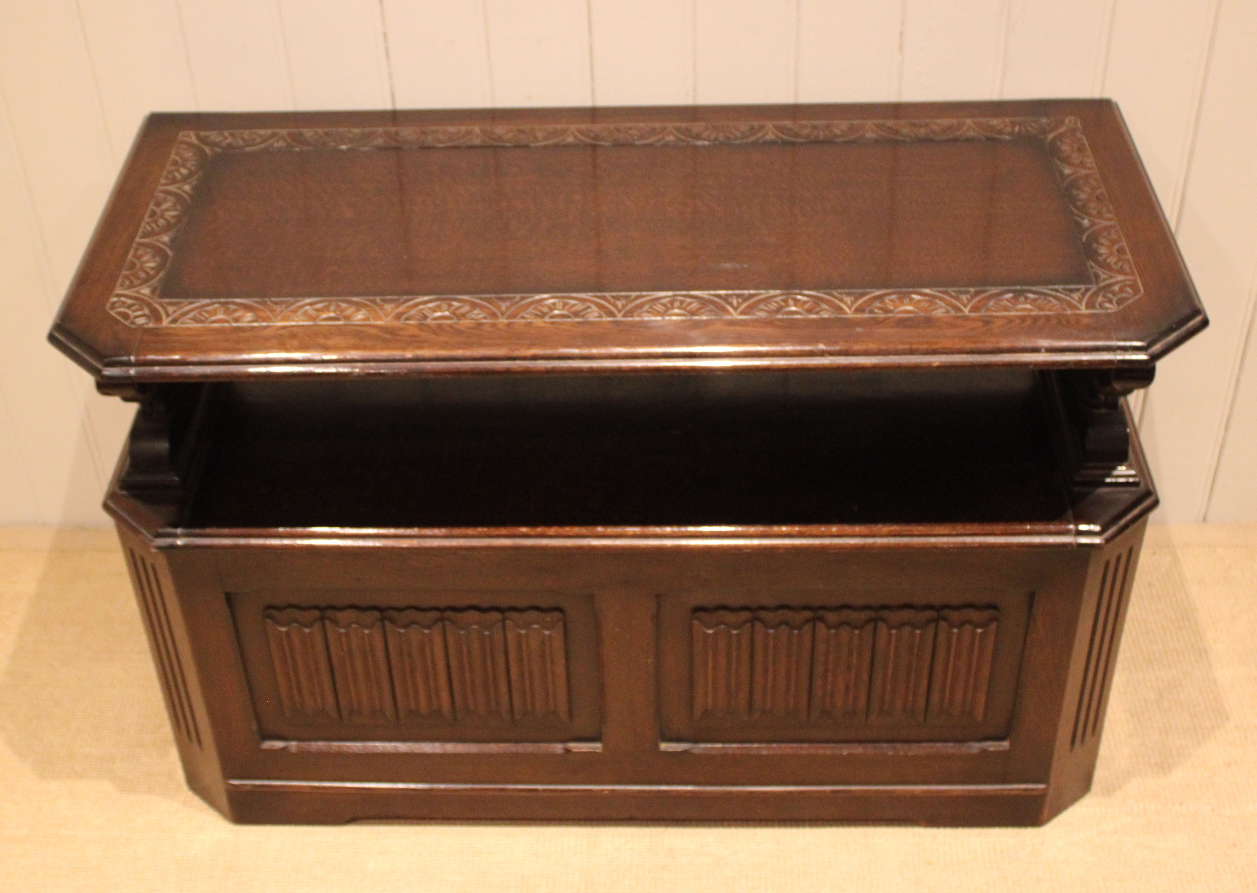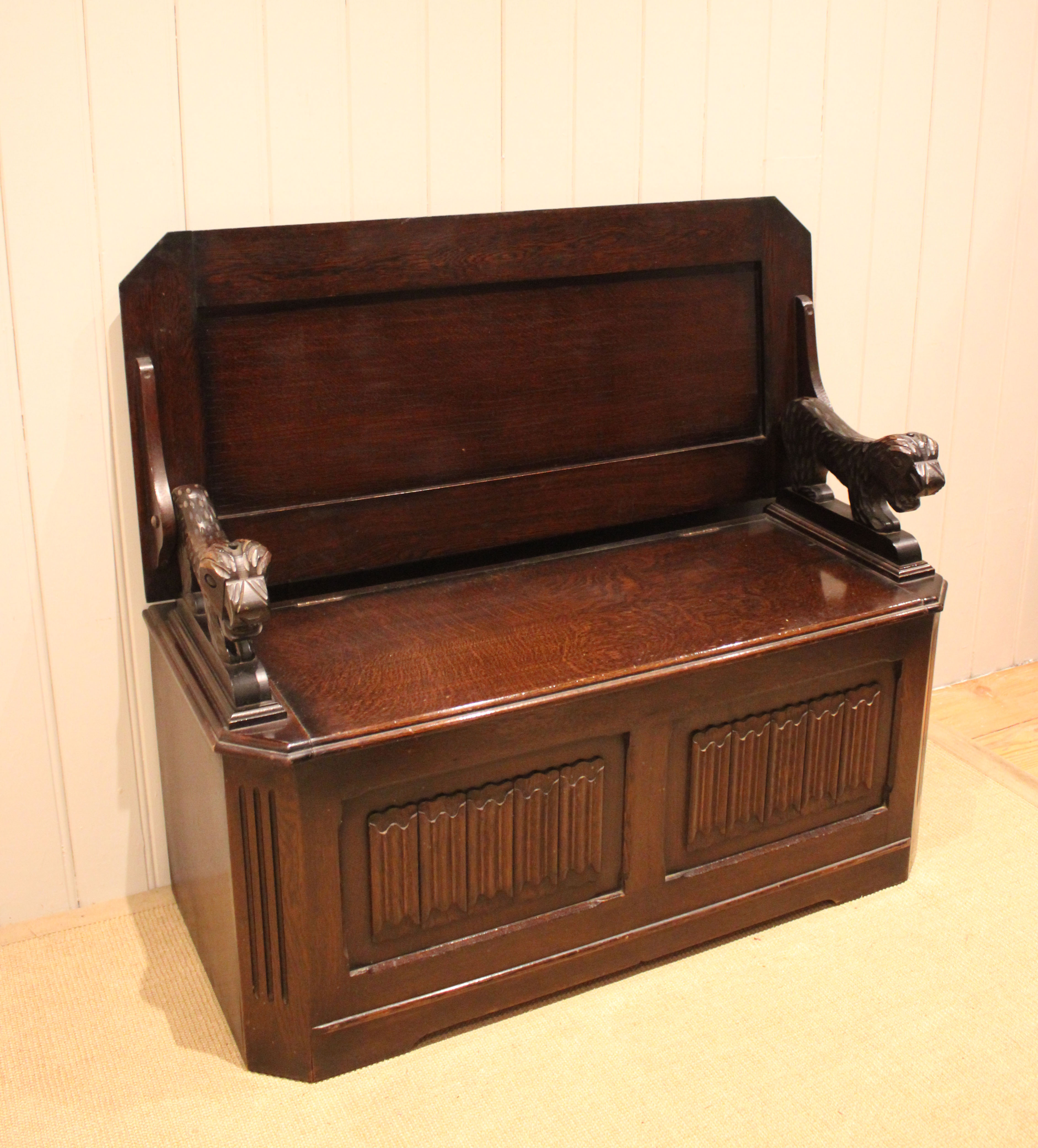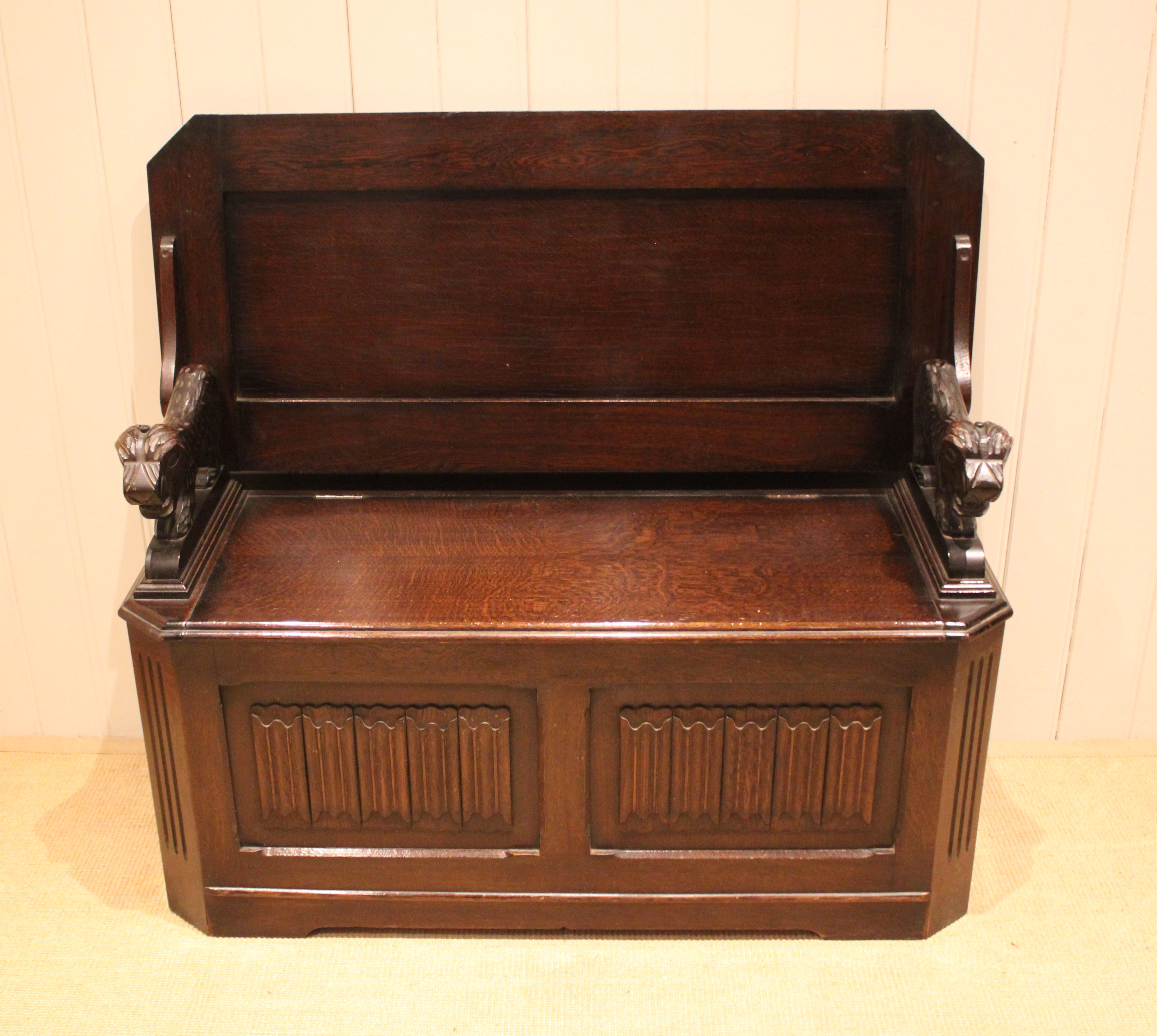 Dark oak monks bench having a linenfold carved front with a lift up seat for storage and a top that folds onto lion supports to become a table , having a carved decorated top with canted corners . The height when folded is 69.5 cm .