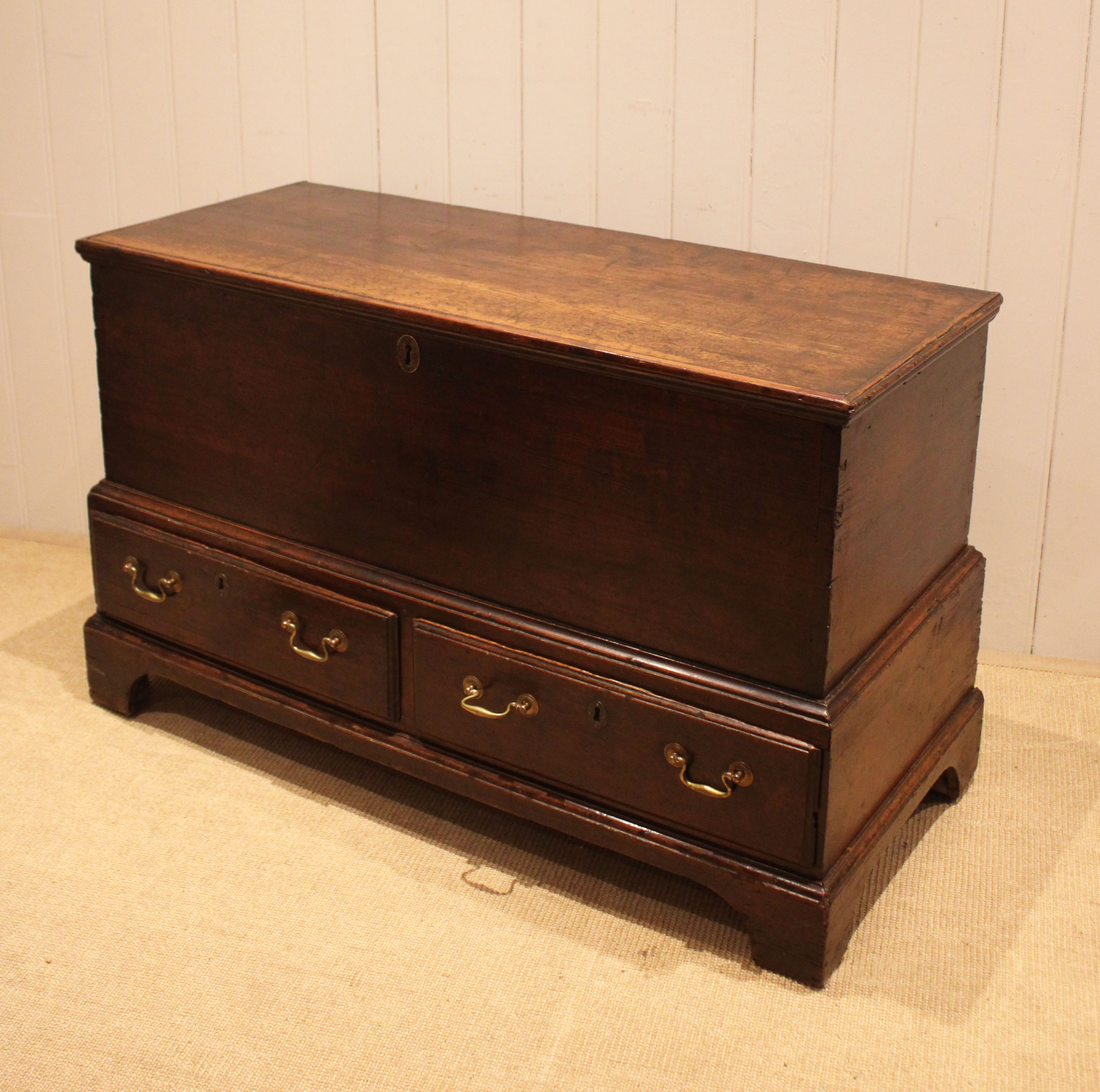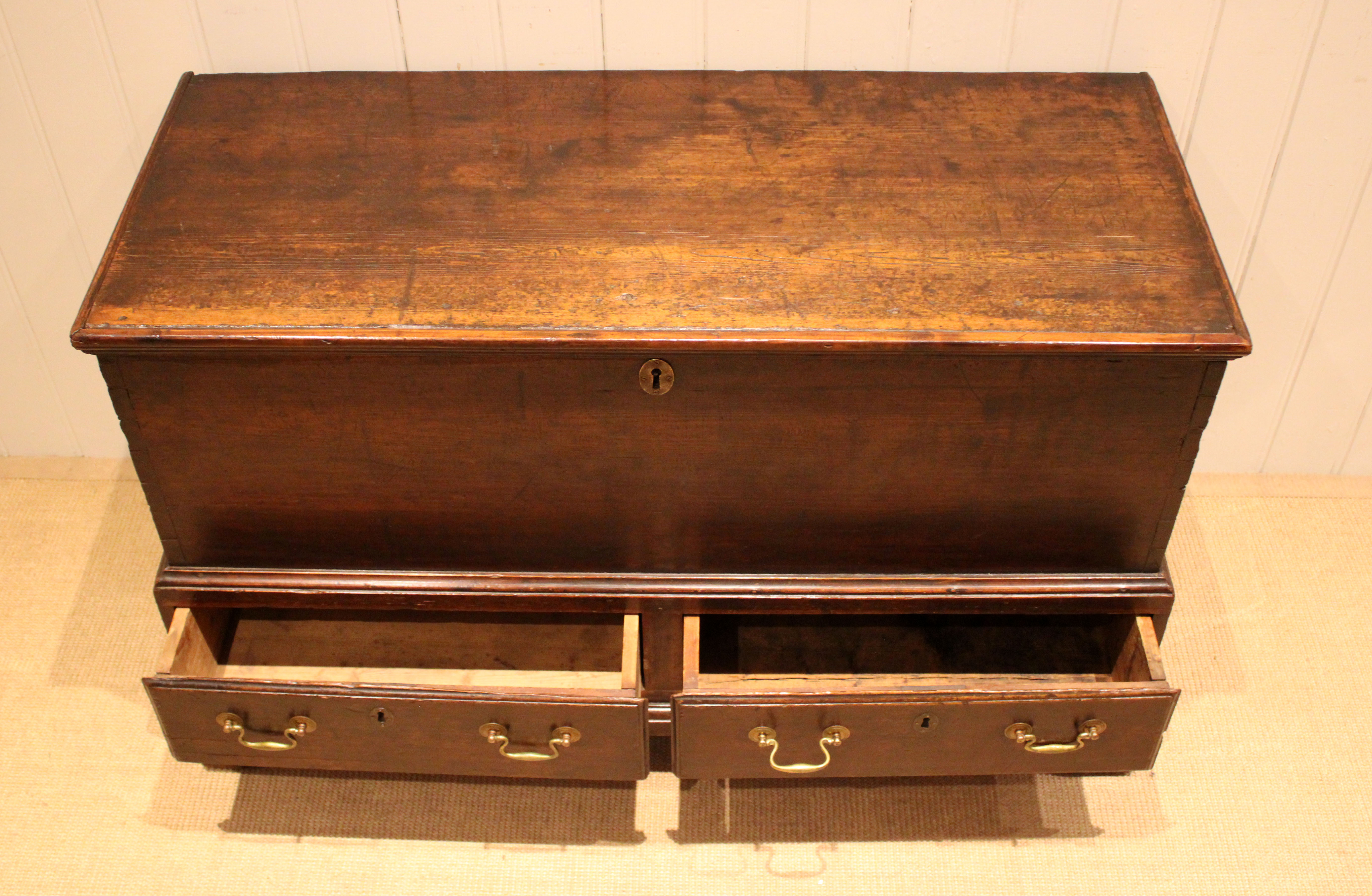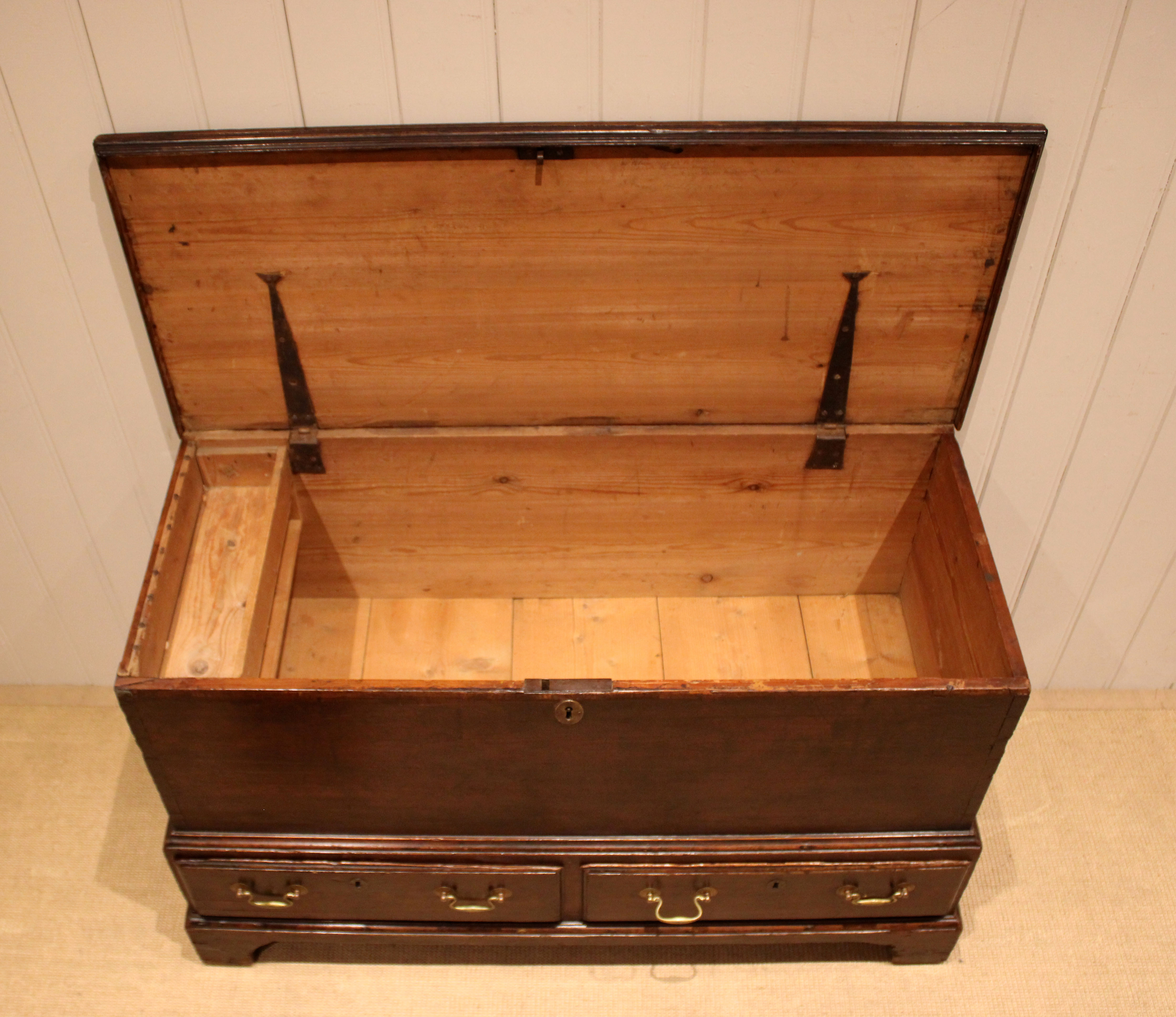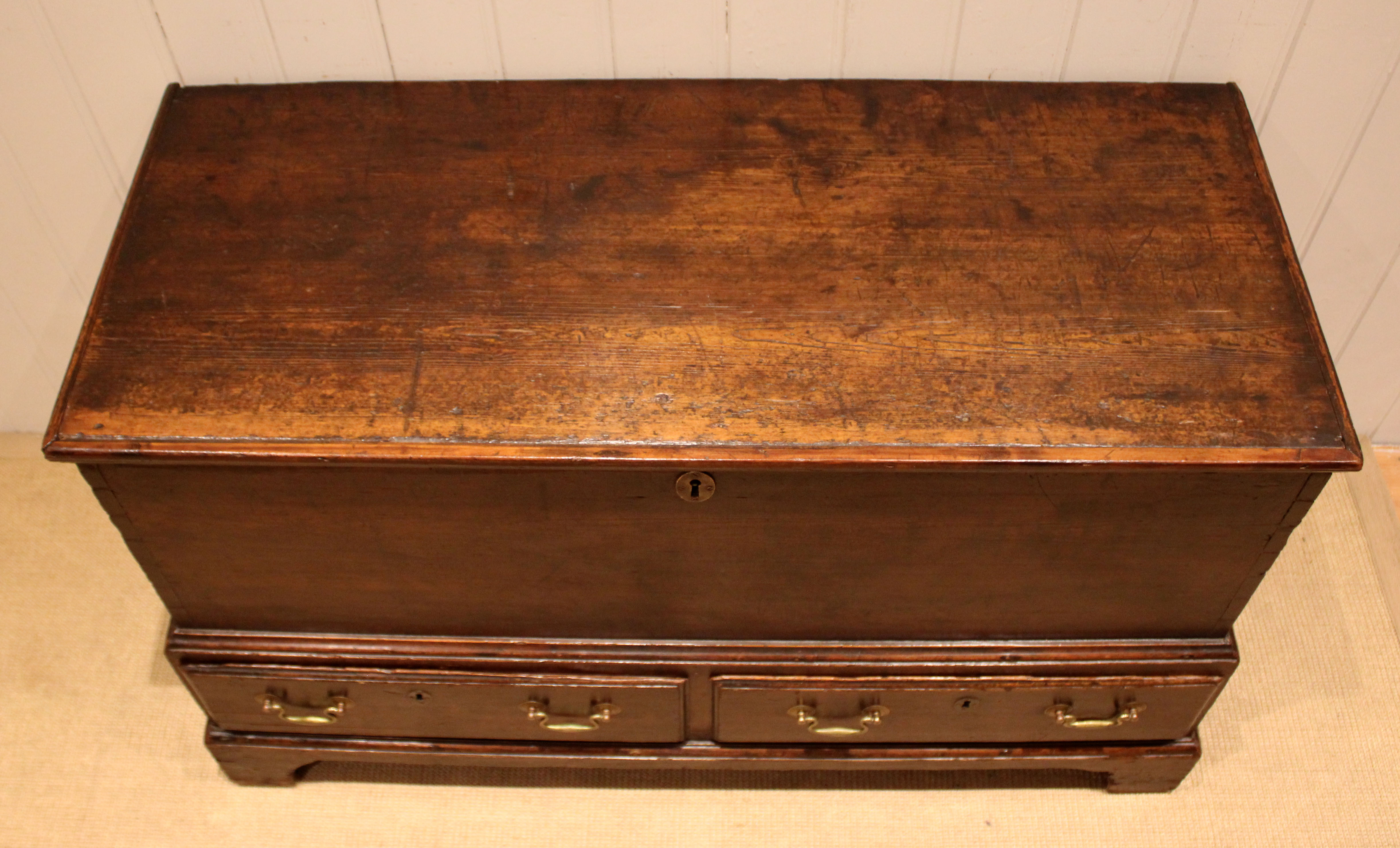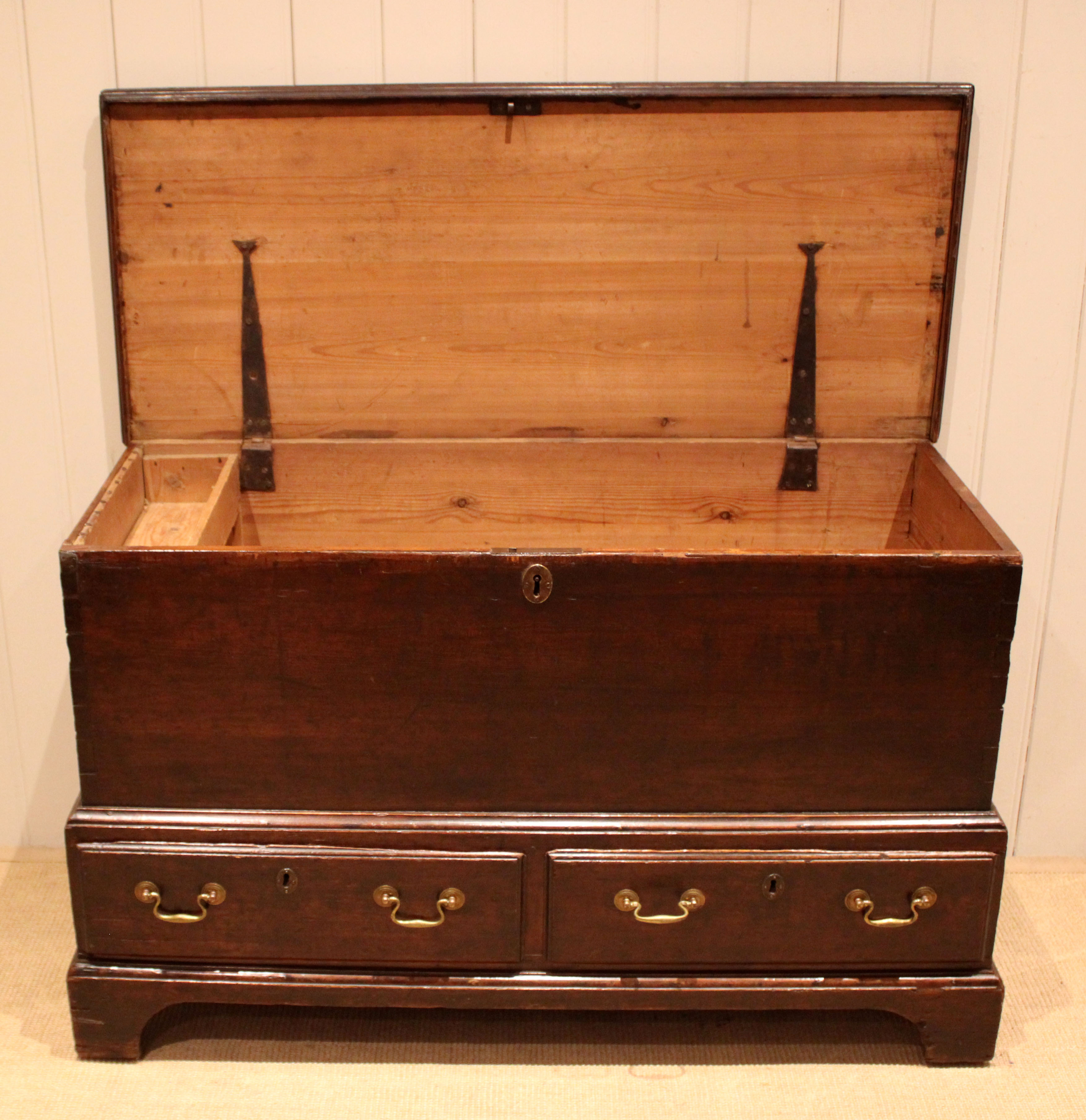Deal wood mule chest having a lift up top with the original hinges with two drawers to the base , raised on bracket feet. The internal depth is 33.5 cm and the drawers are 12 cm deep .