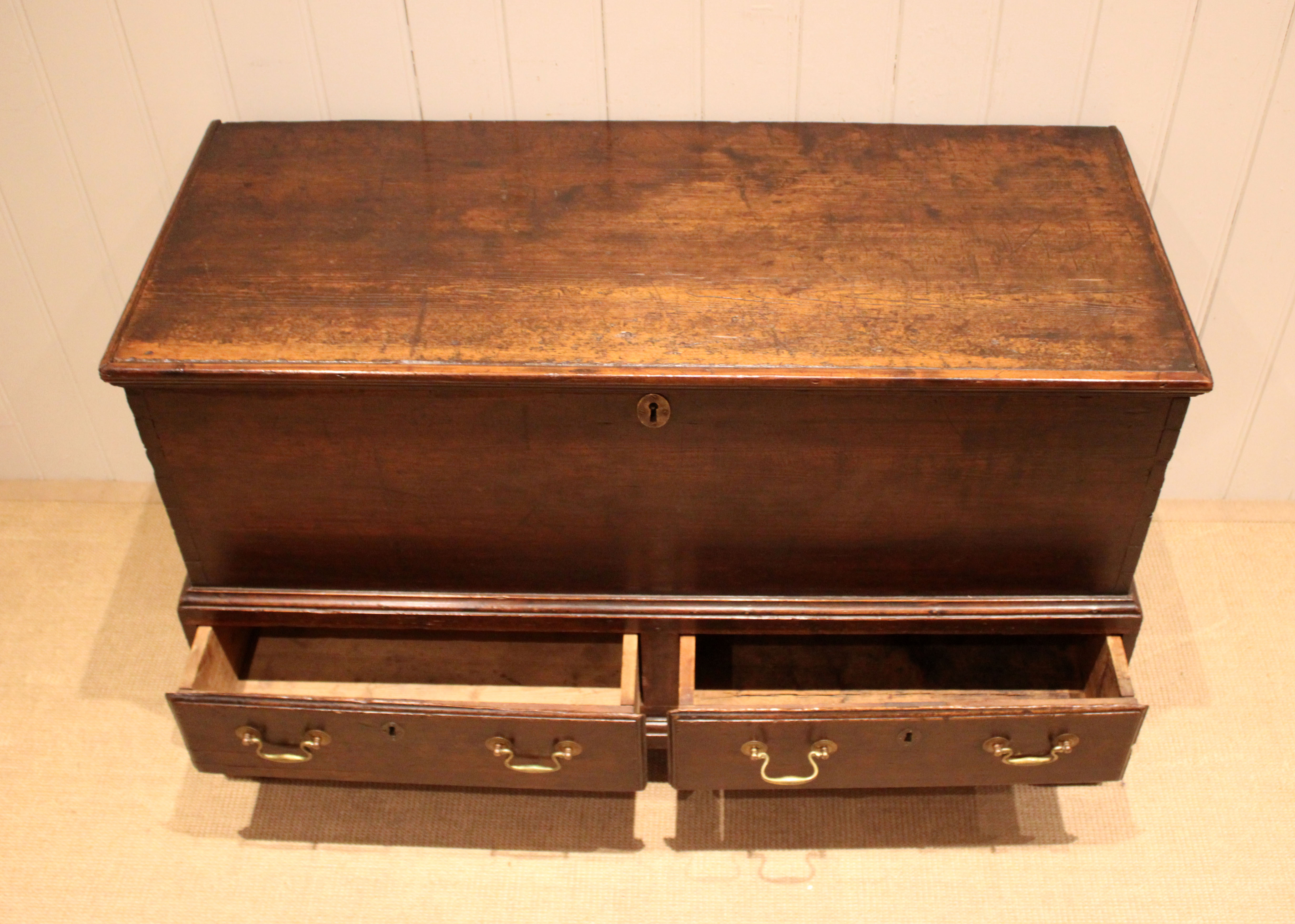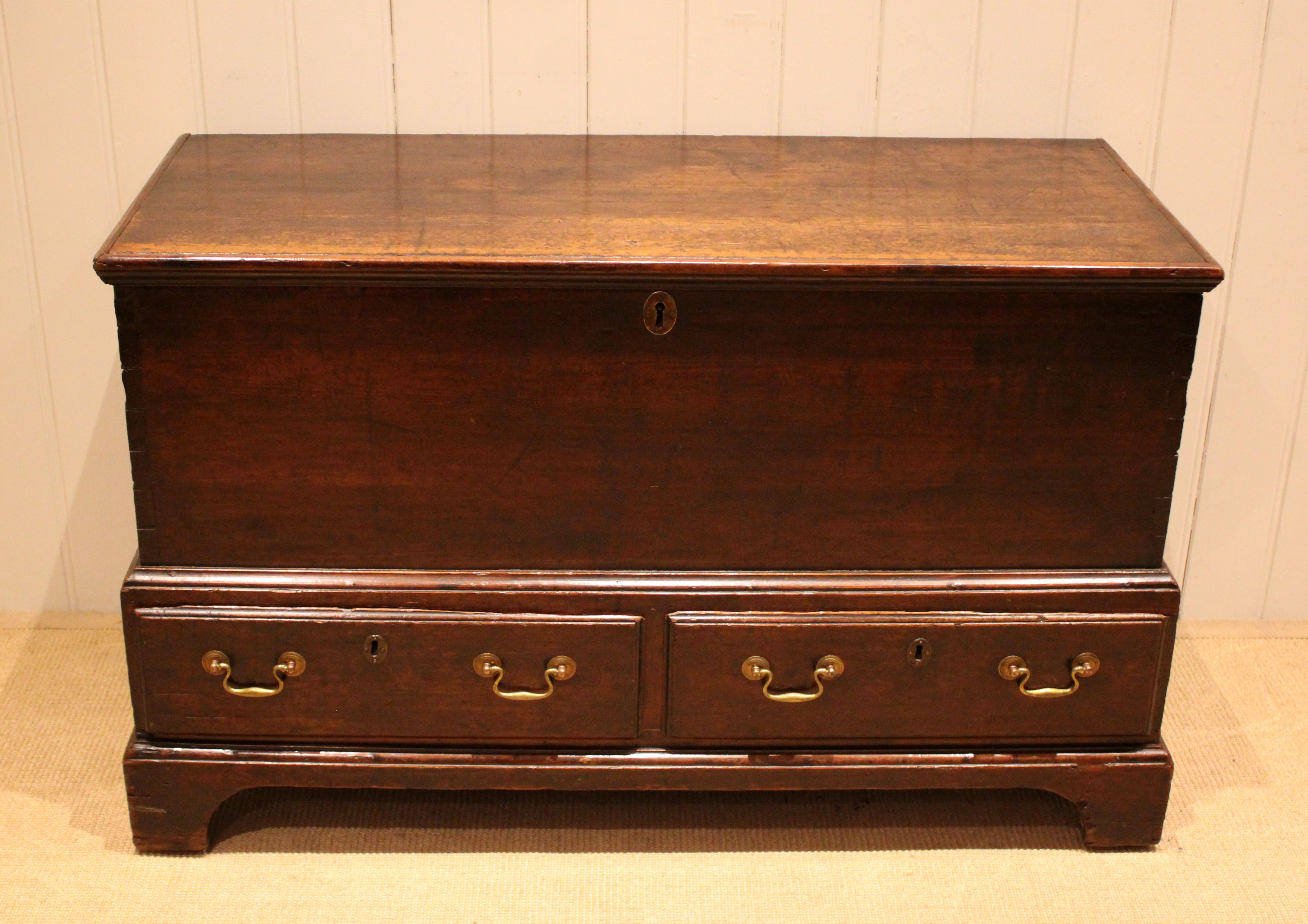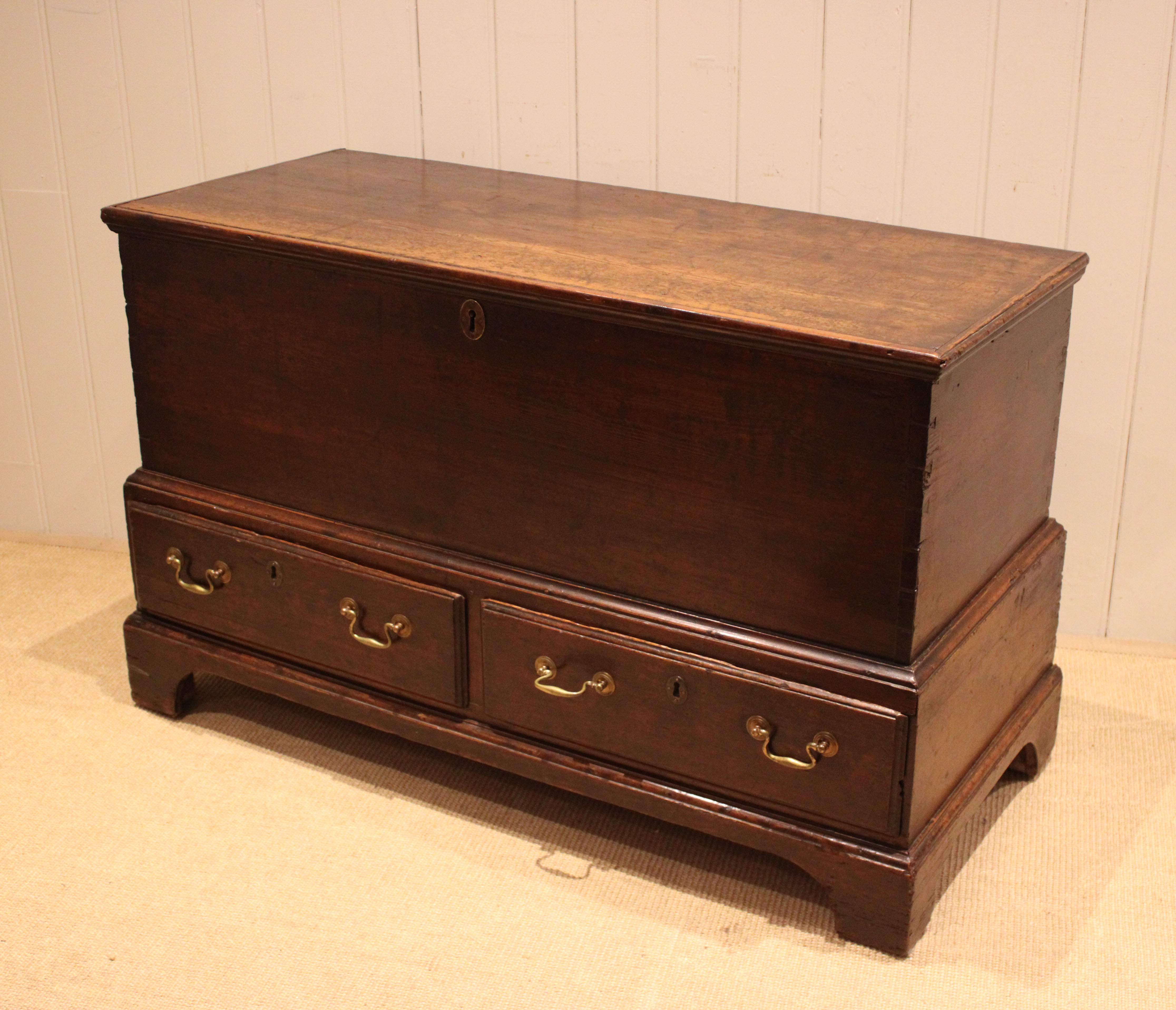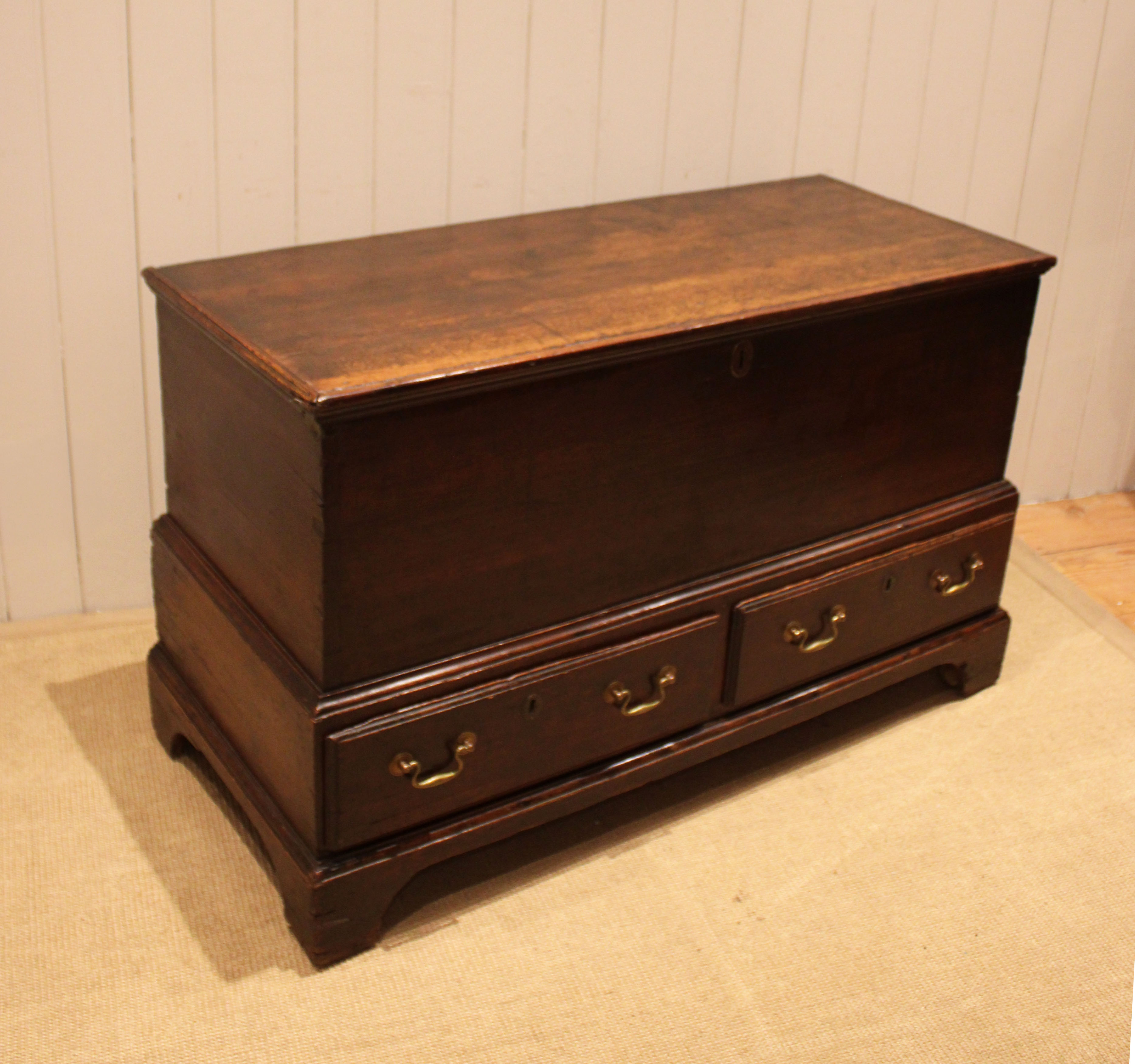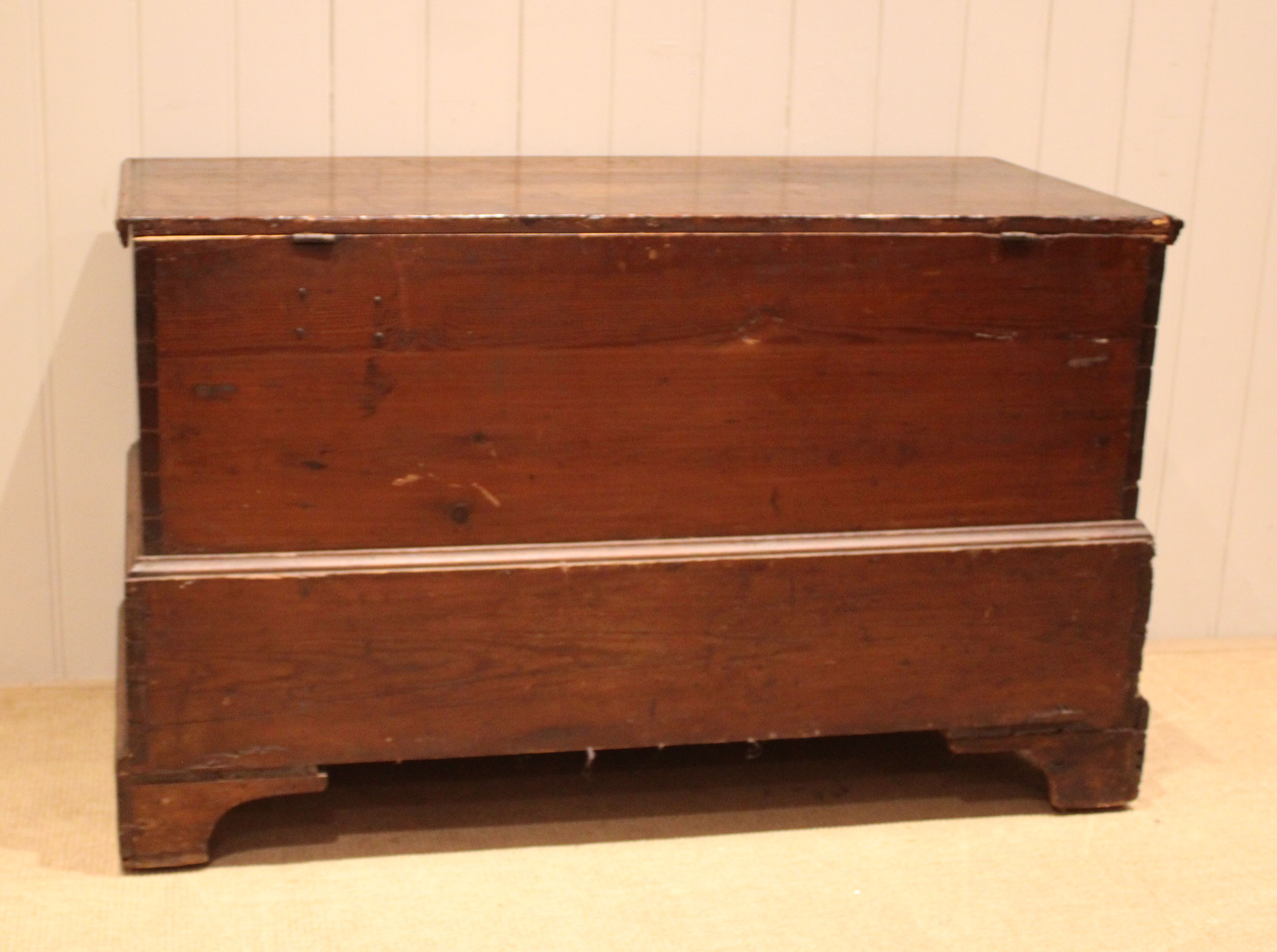 Deal wood mule chest having a lift up top with the original hinges with two drawers to the base , raised on bracket feet. The internal depth is 33.5 cm and the drawers are 12 cm deep .