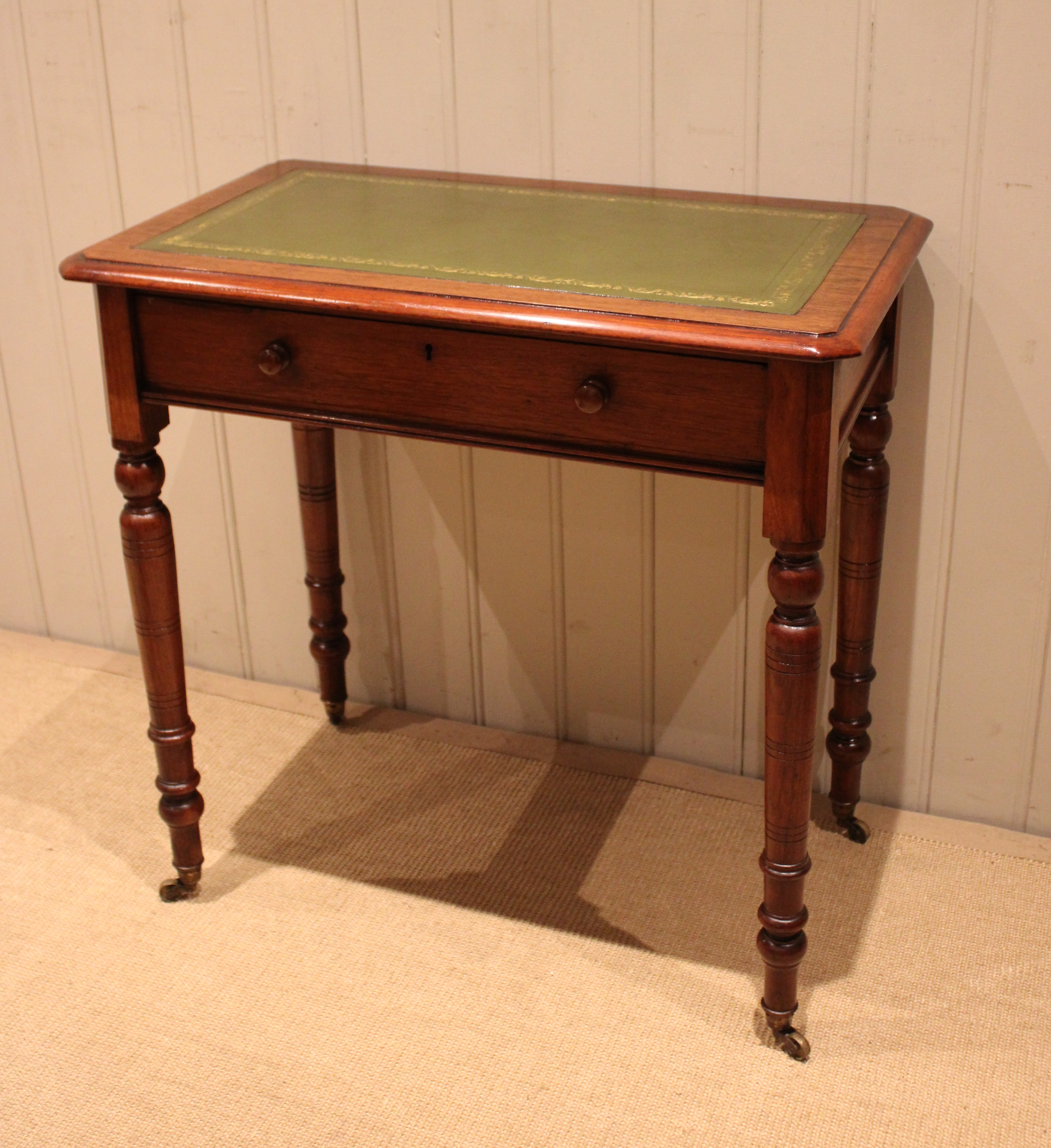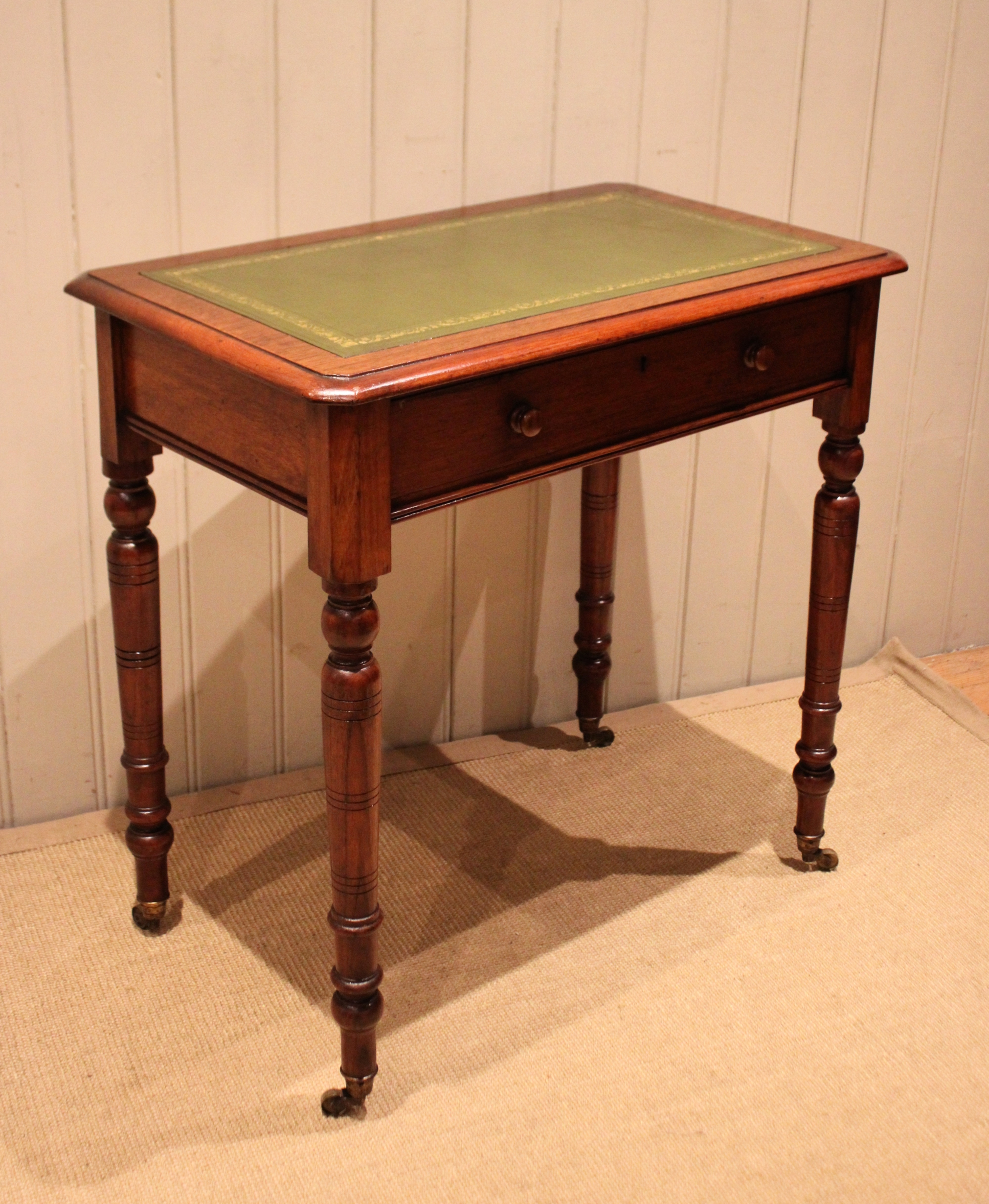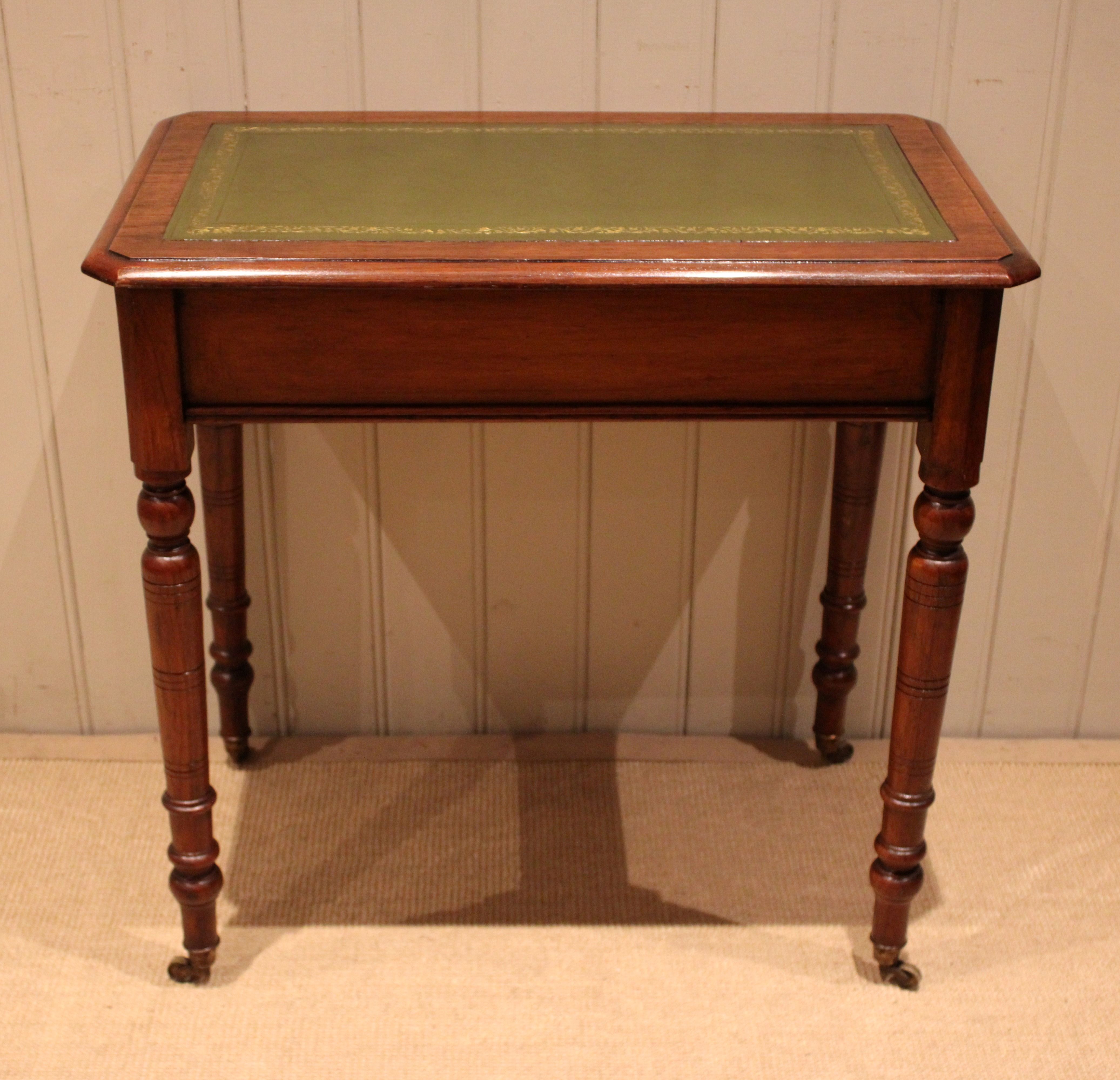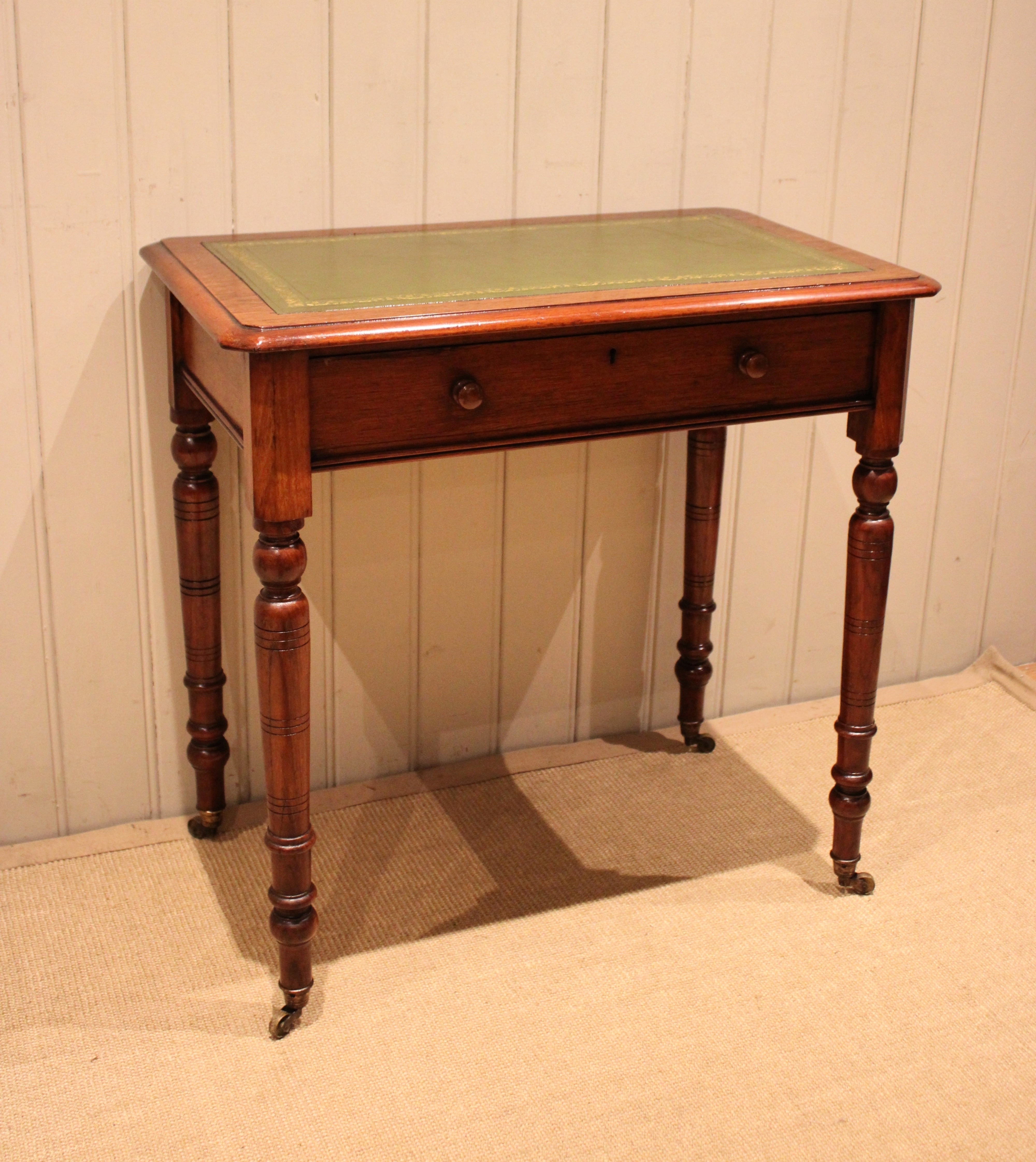 Late 19th century walnut writing desk having a green tooled leather top above a single drawer with turned wooden handles , raised on turned legs , terminating in the original brass castors. The height to the undertier is 60 cm
