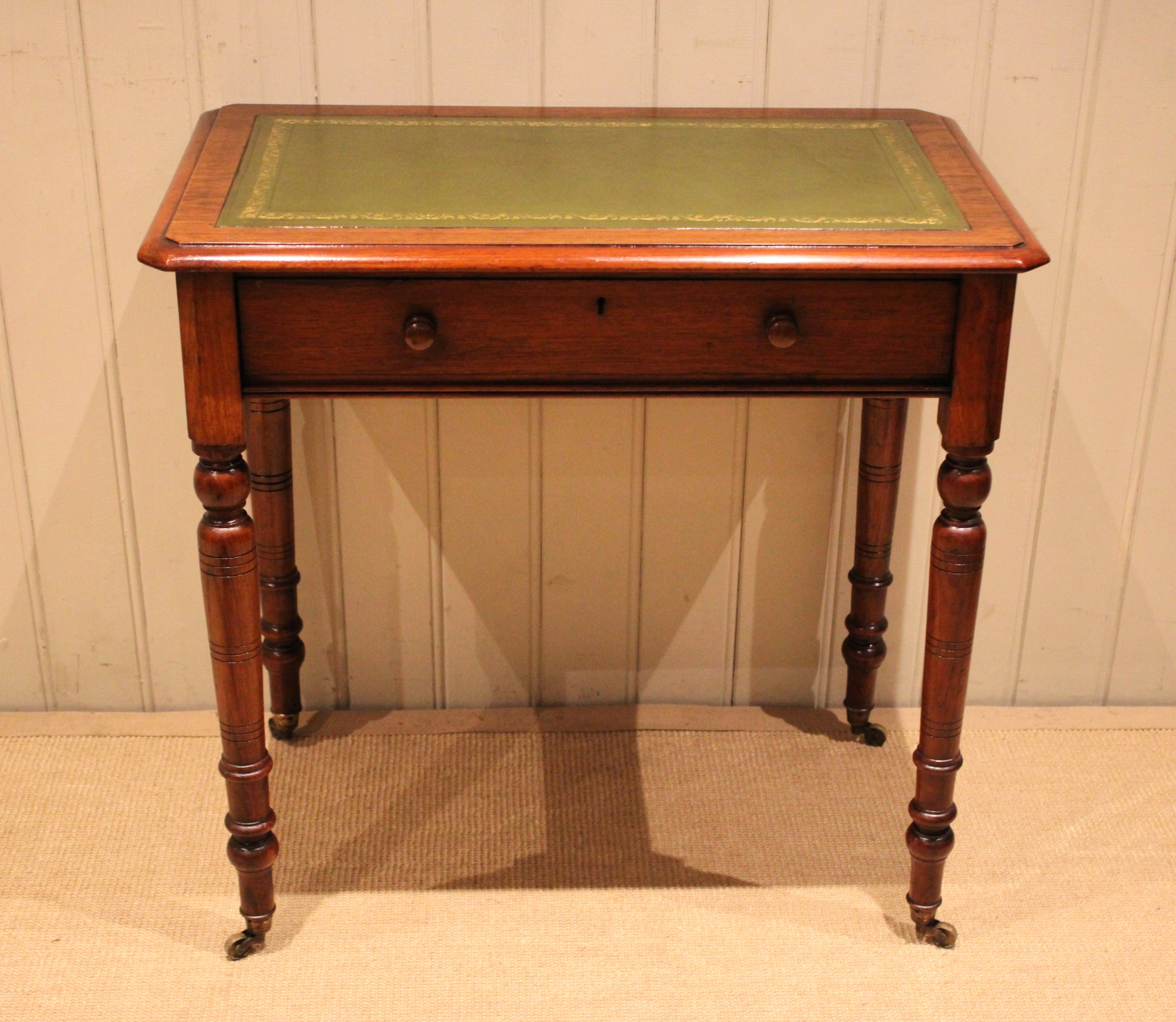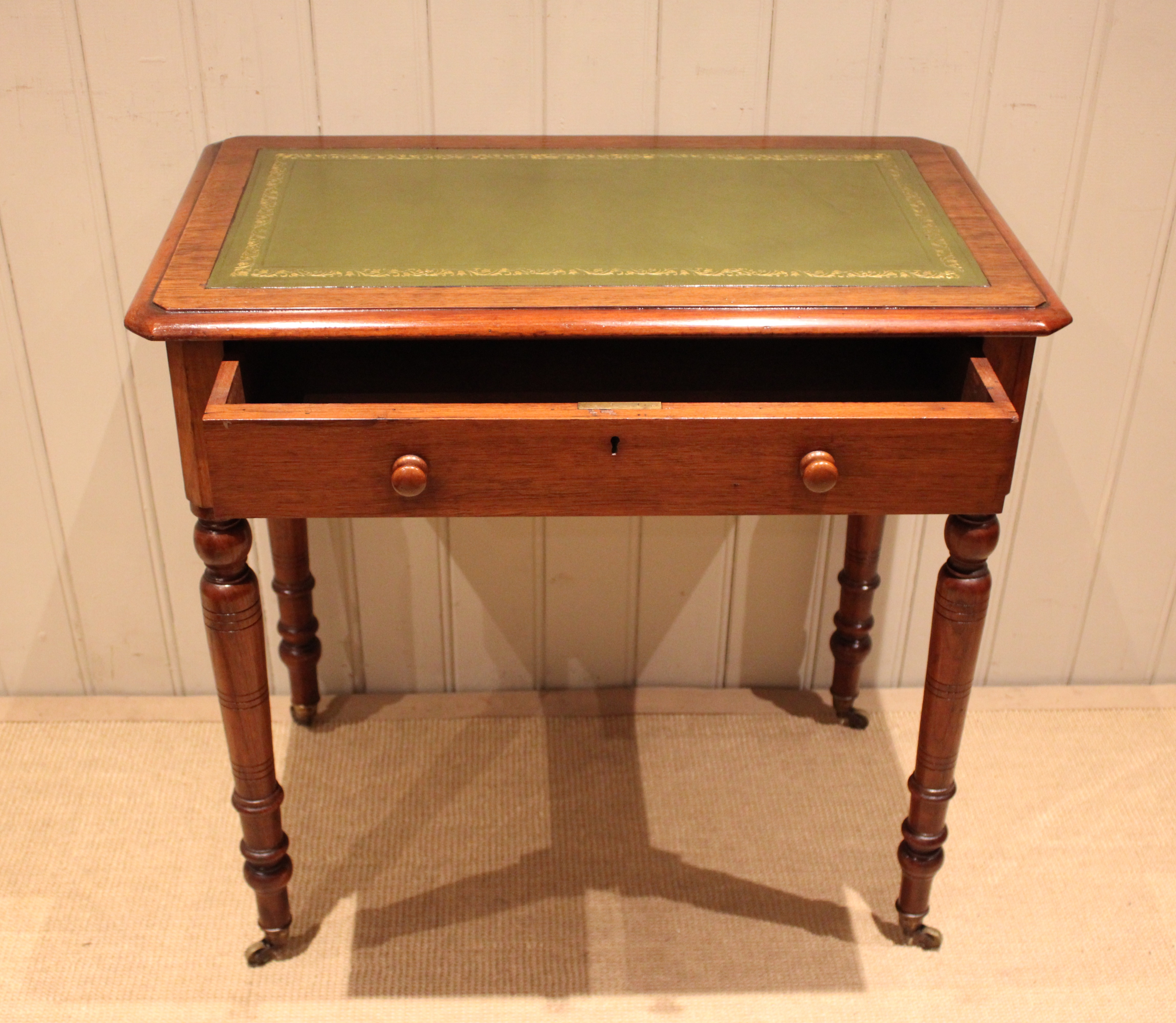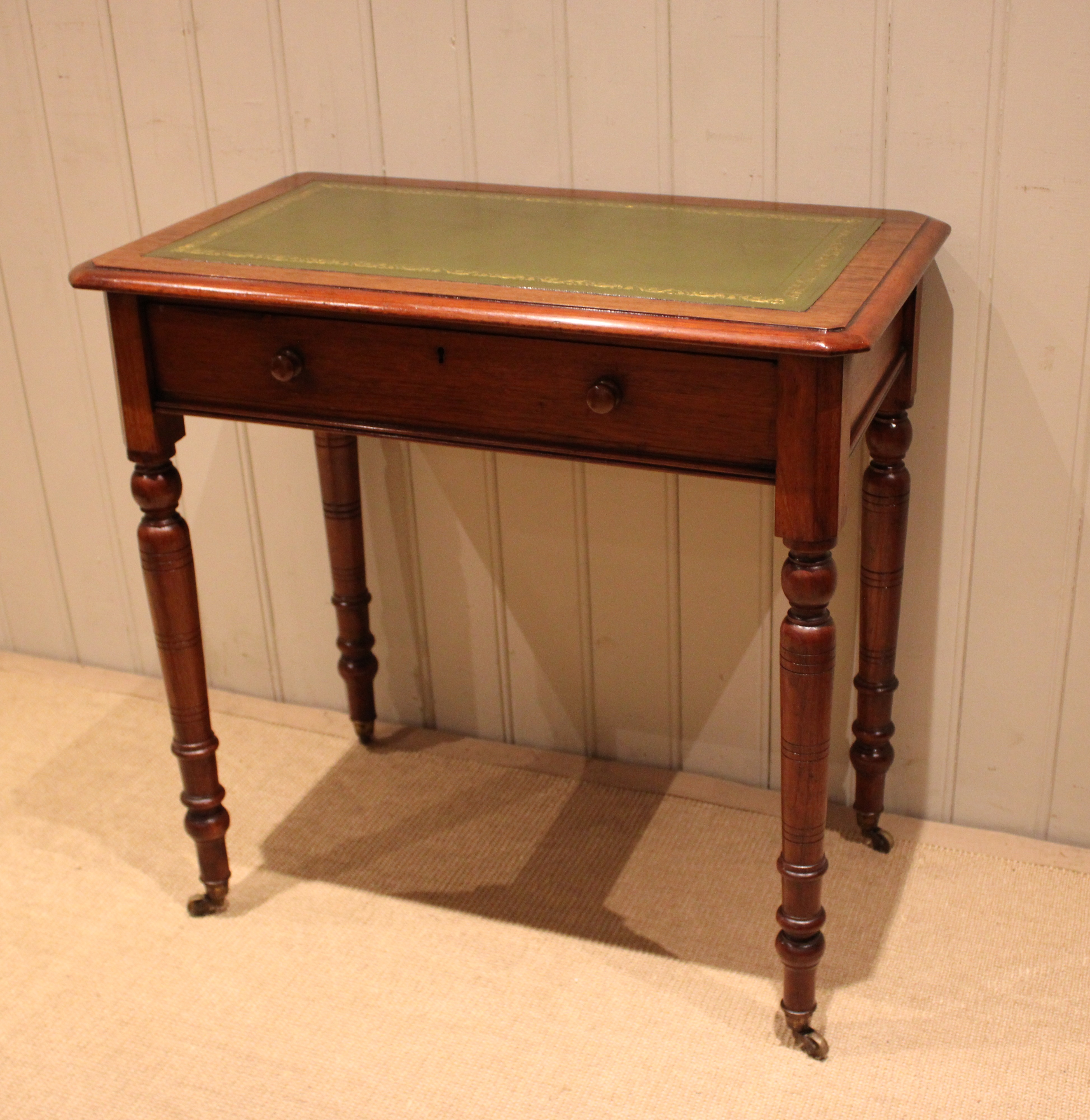 Late 19th century walnut writing desk having a green tooled leather top above a single drawer with turned wooden handles , raised on turned legs , terminating in the original brass castors. The height to the undertier is 60 cm