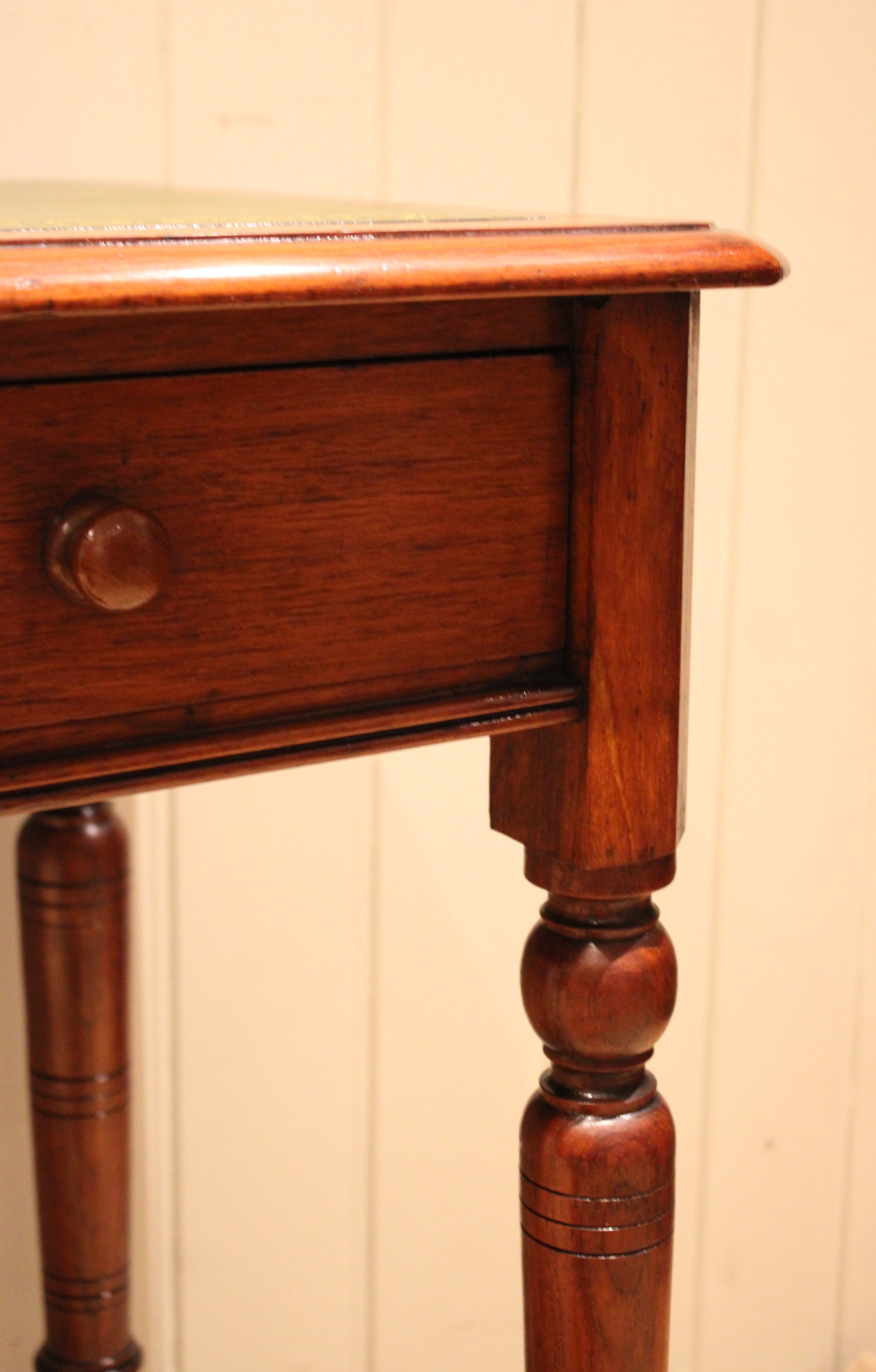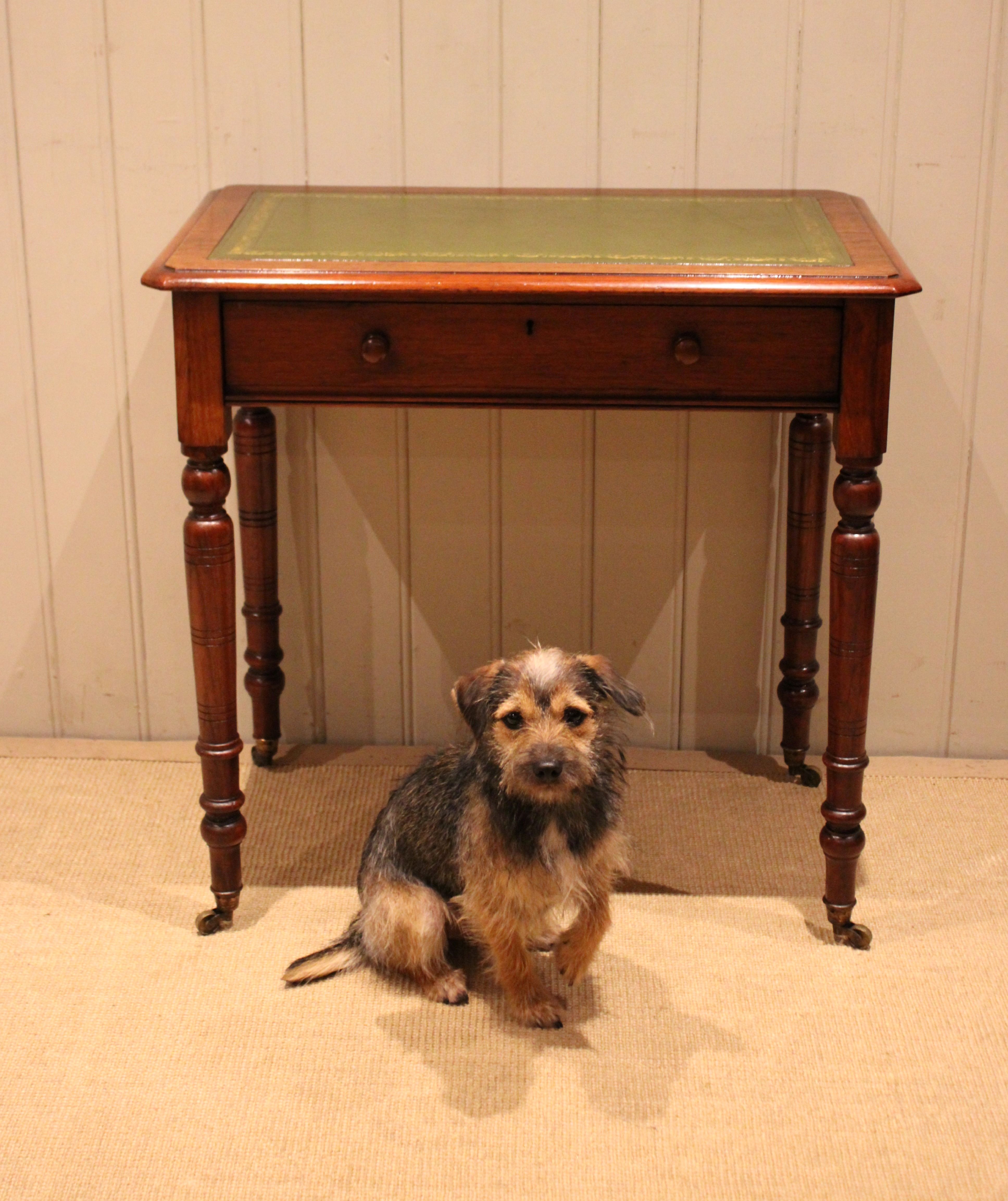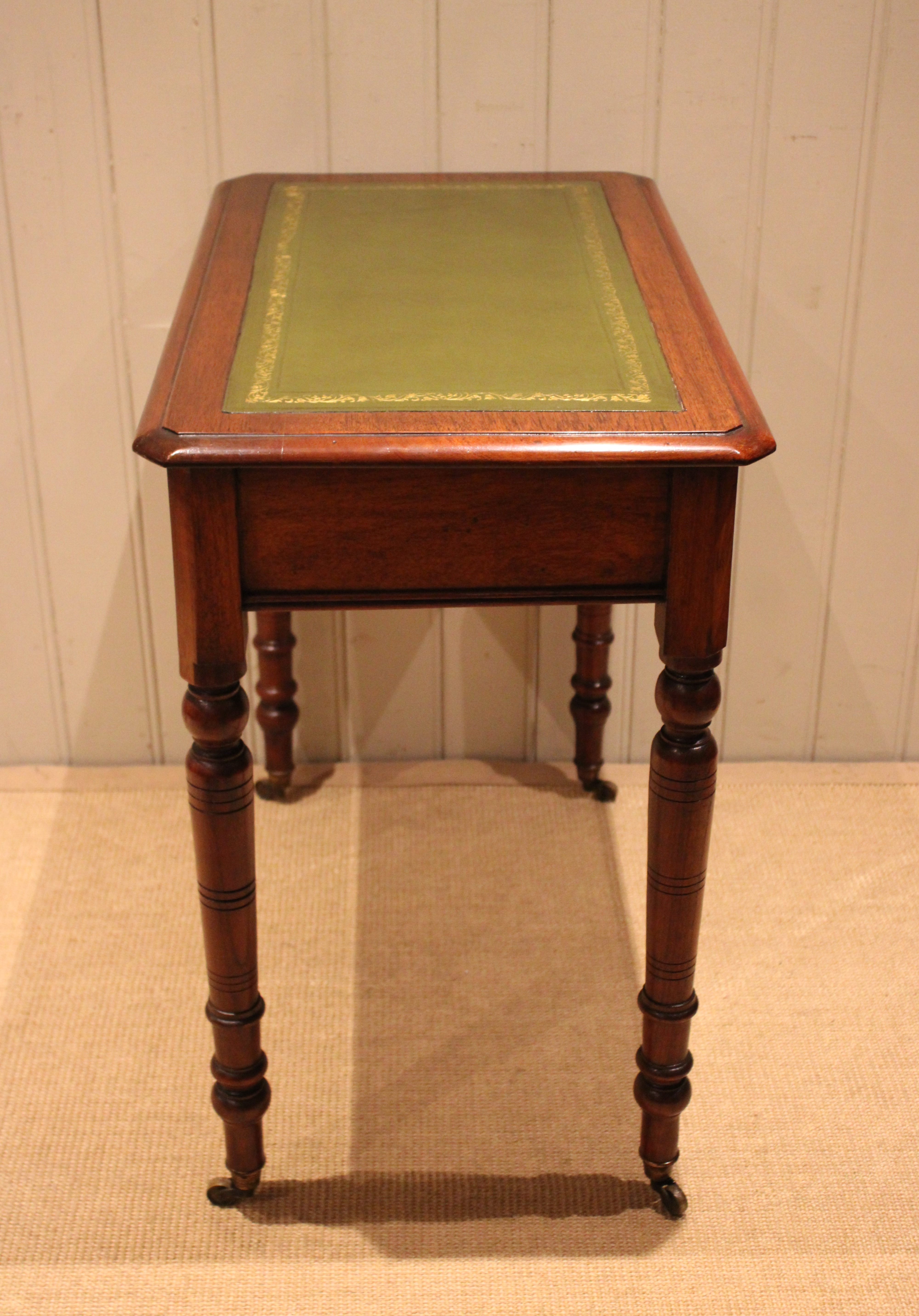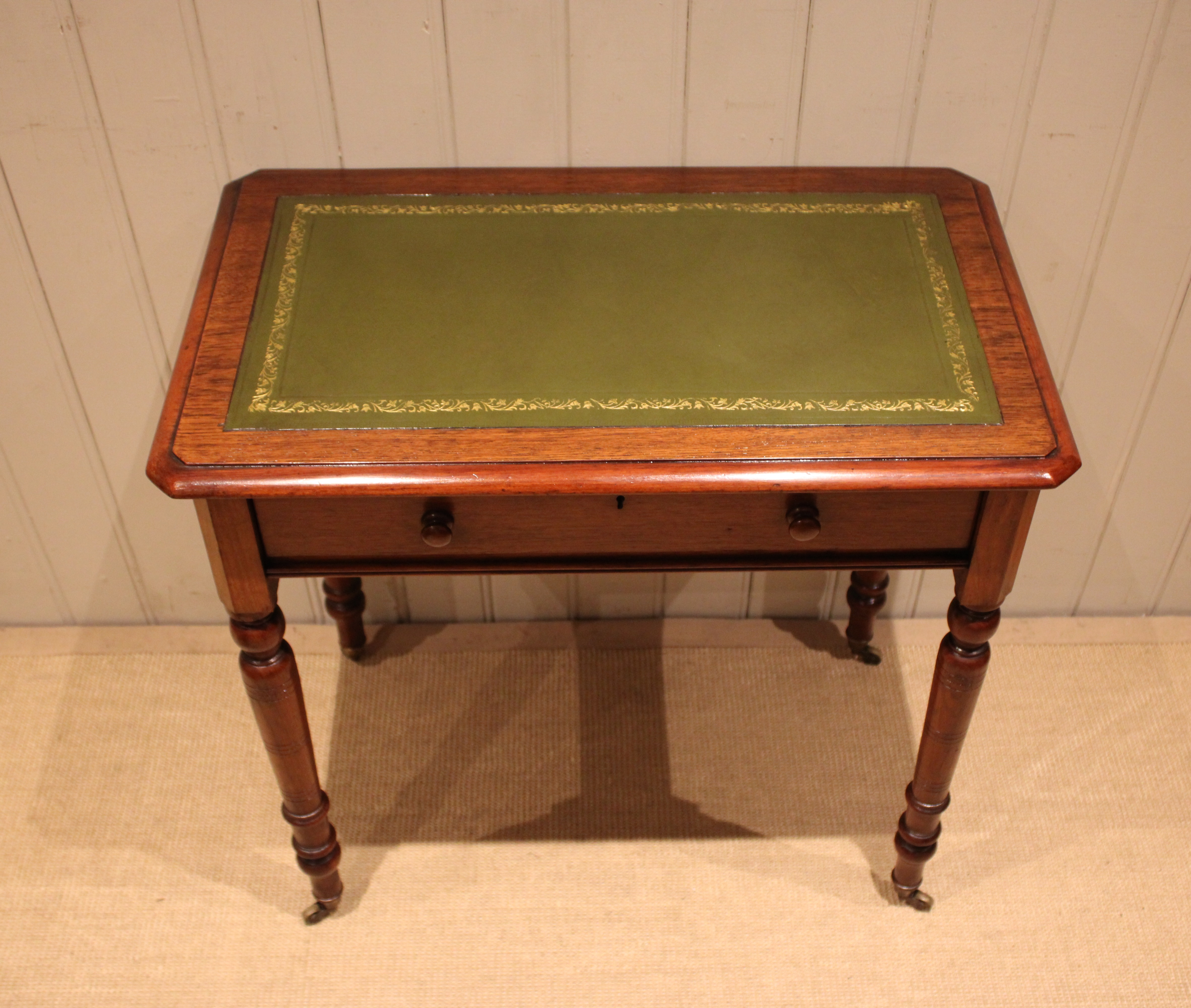 Late 19th century walnut writing desk having a green tooled leather top above a single drawer with turned wooden handles , raised on turned legs , terminating in the original brass castors. The height to the undertier is 60 cm