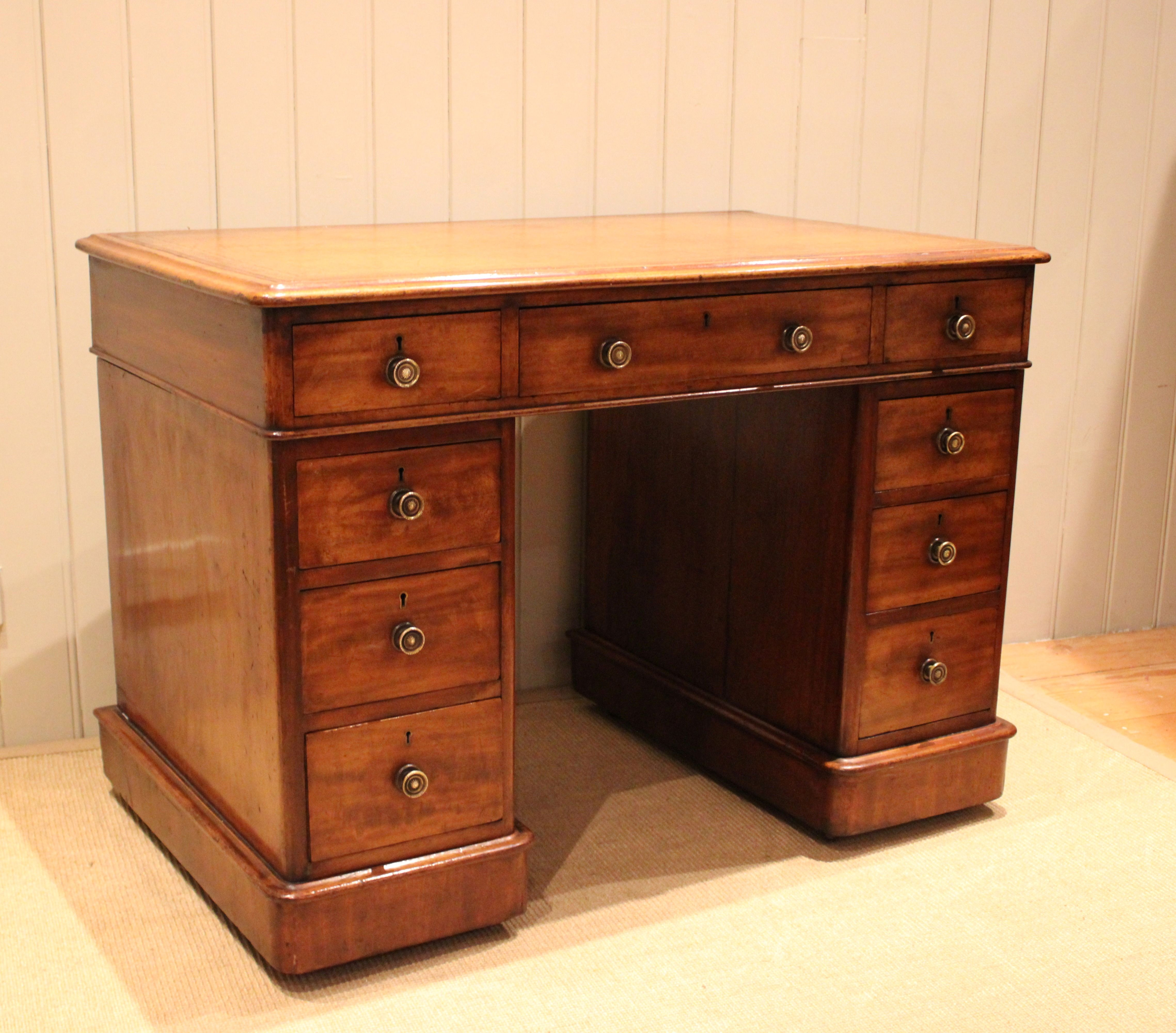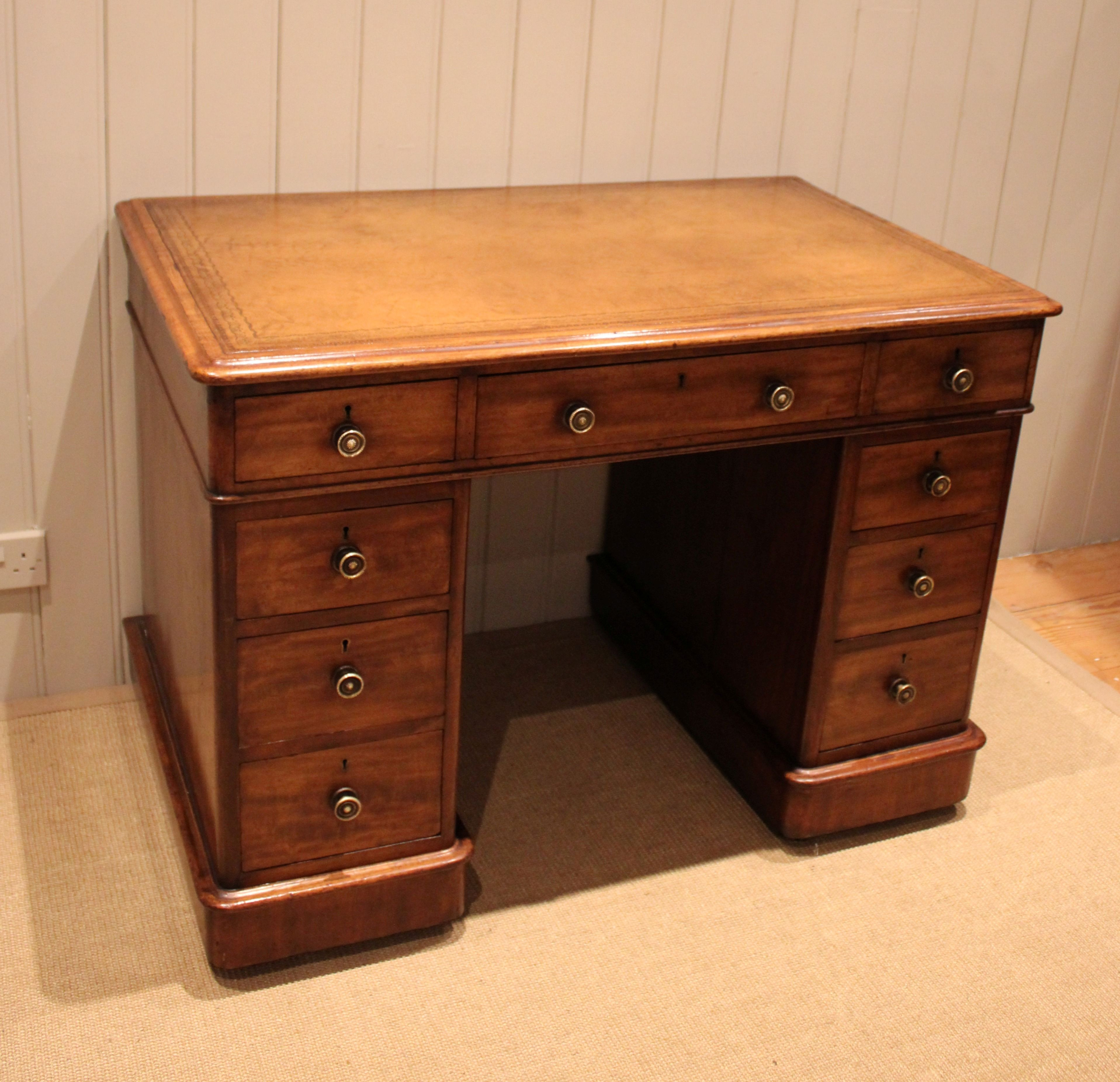 Substantial oak pedestal desk having an arrangement of six drawers with pull out slides and an embossed brown scriber.