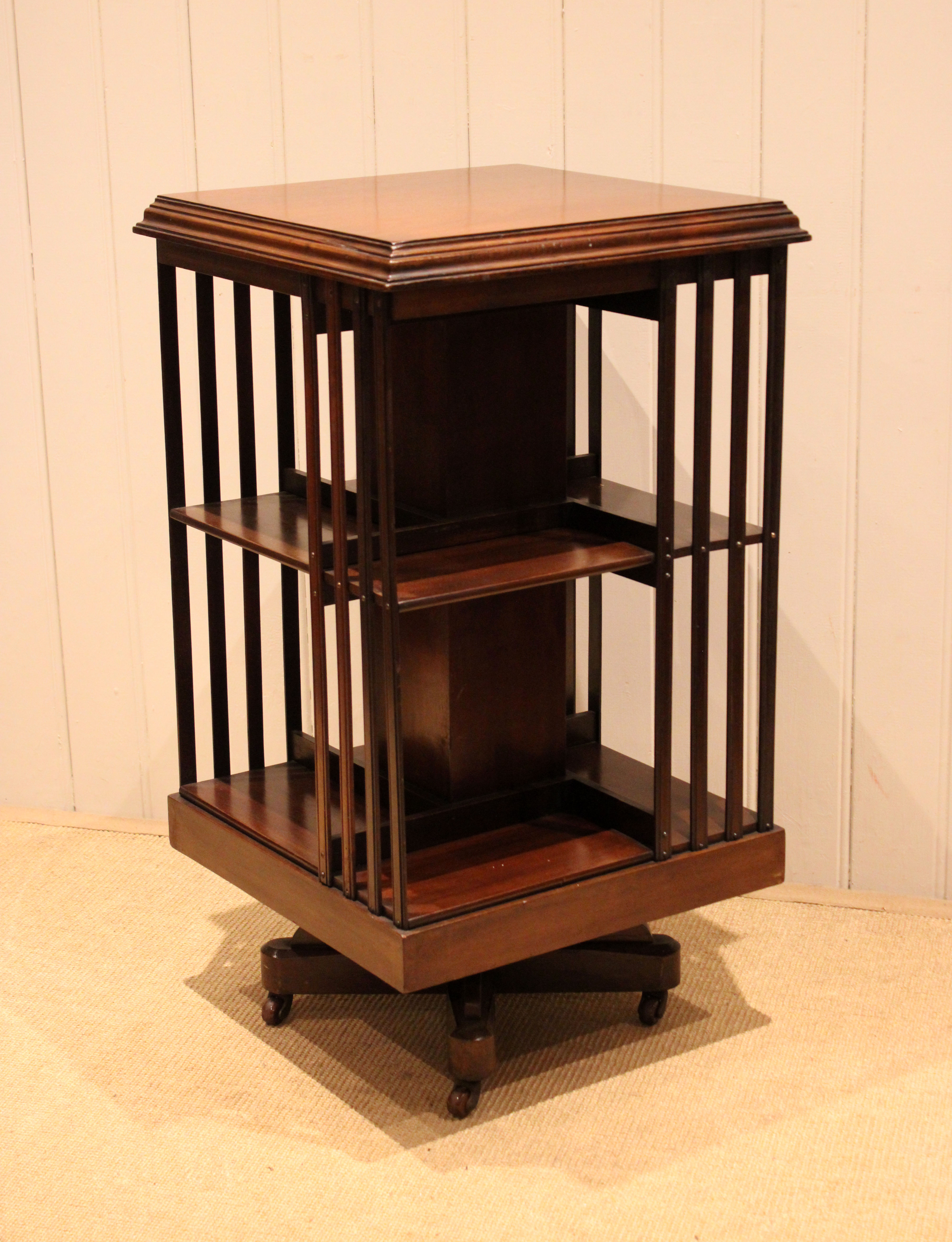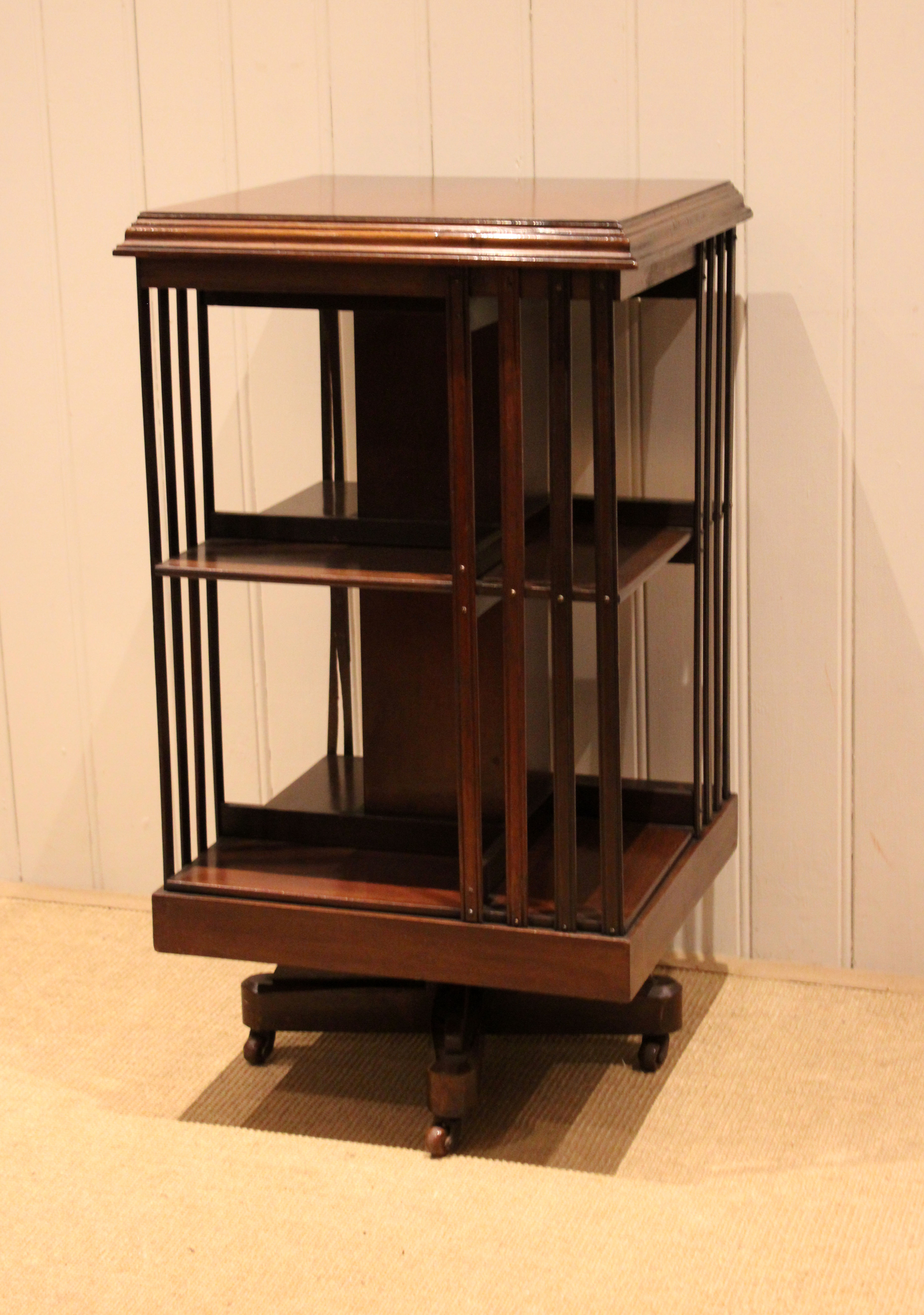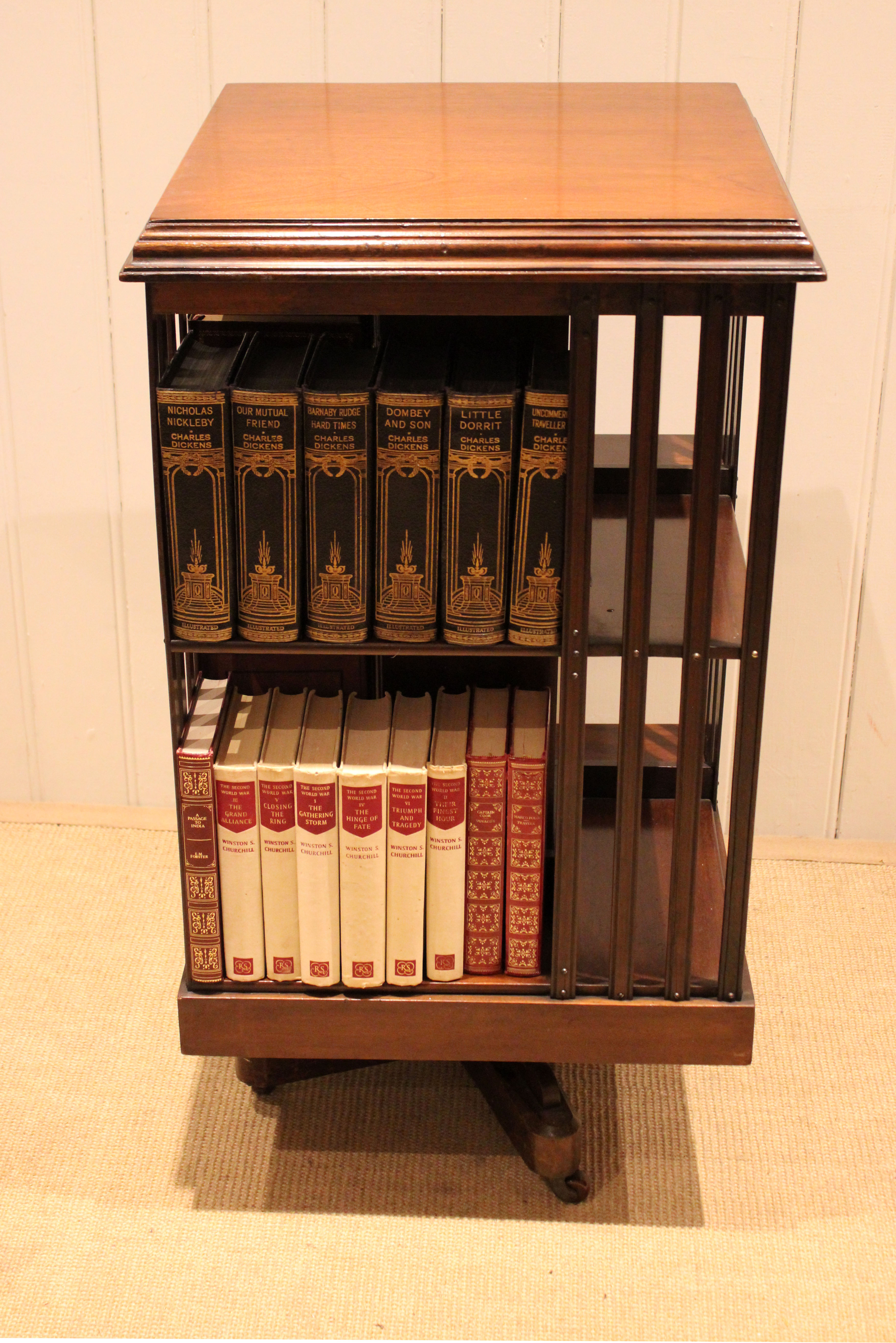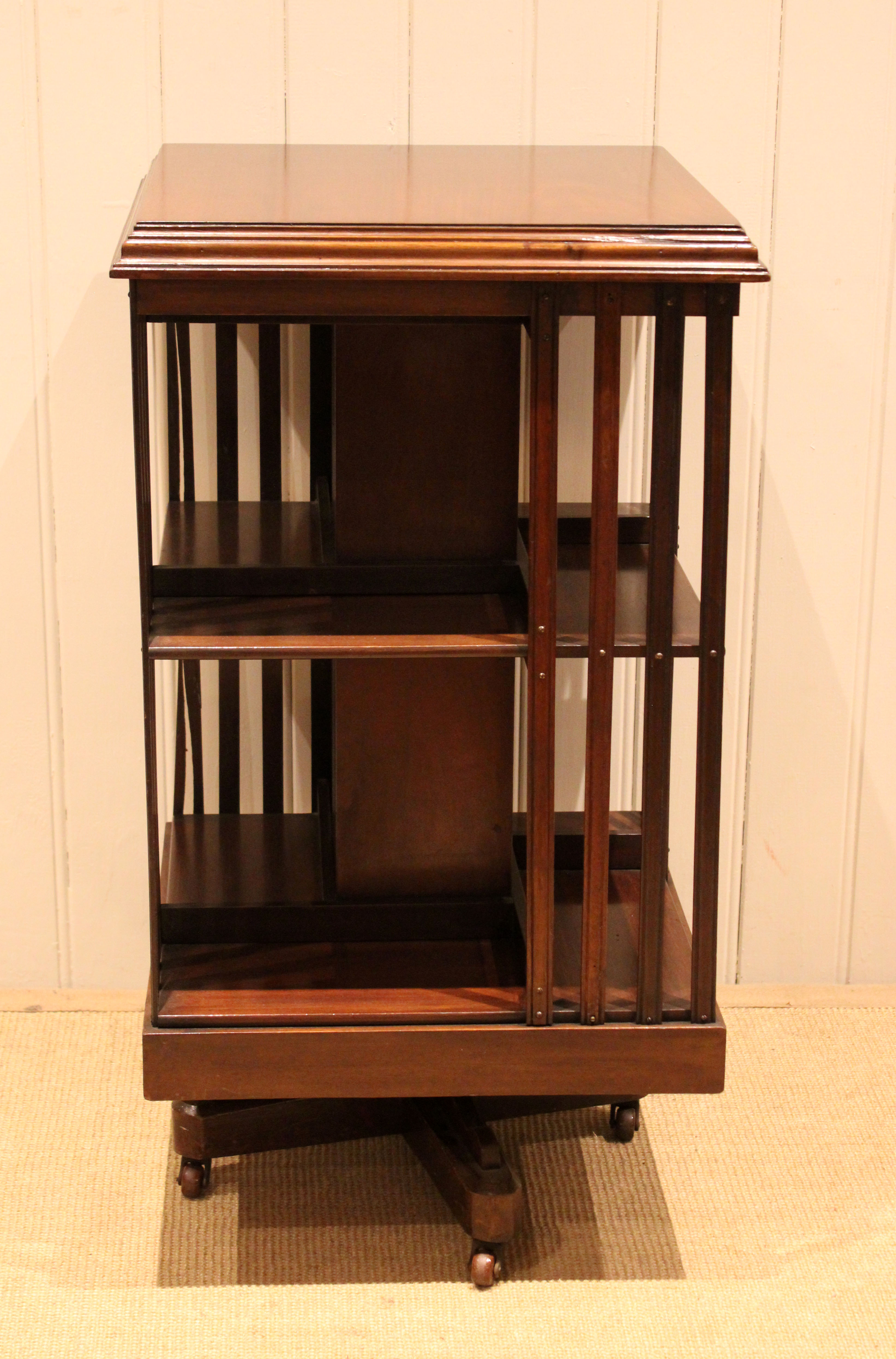 Edwardian solid mahogany revolving bookcase having two tiers and eight sections raised on cross supports with original ceramic castors . Each section measures 29 cm wide , 14 cm deep and 26 cm high .