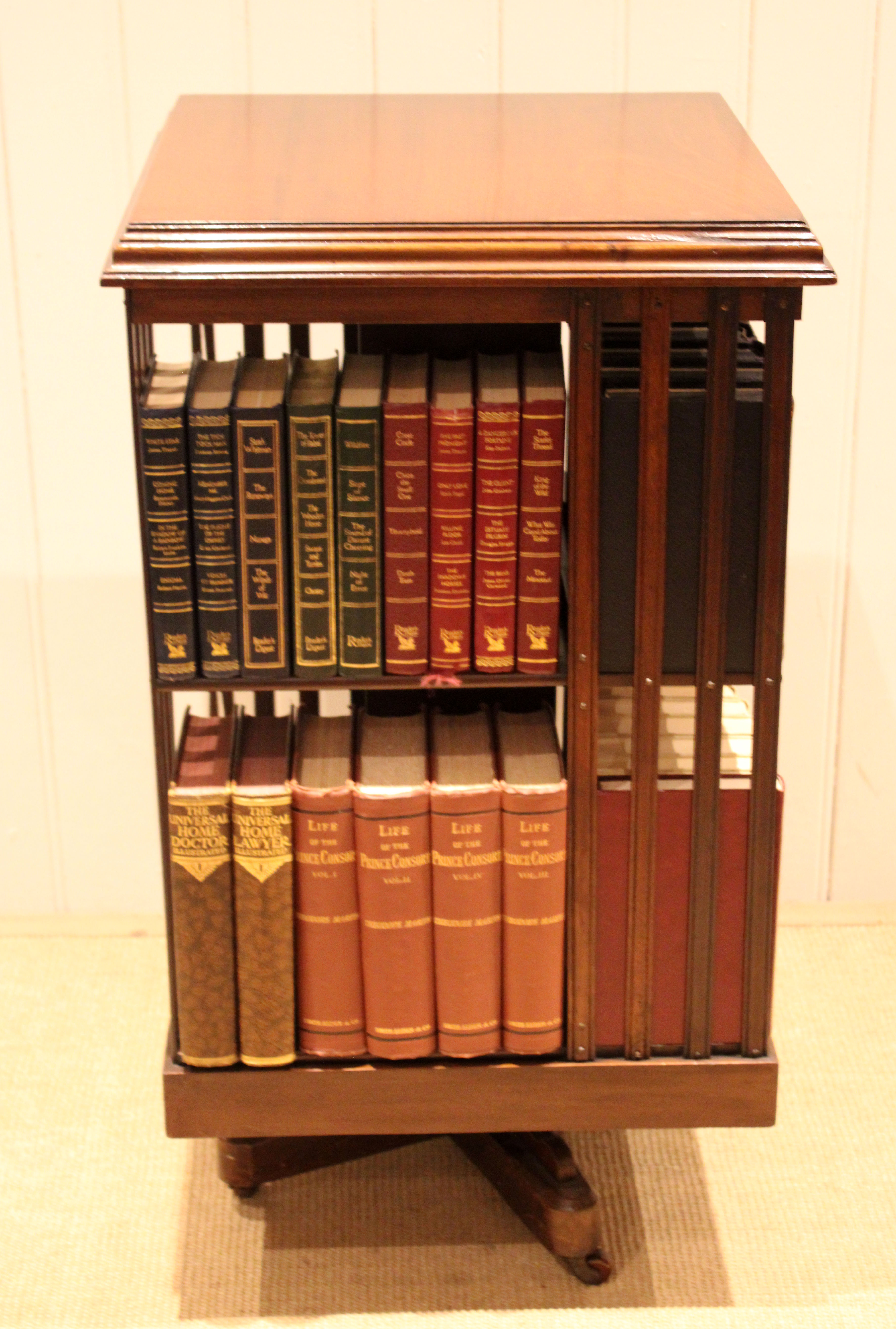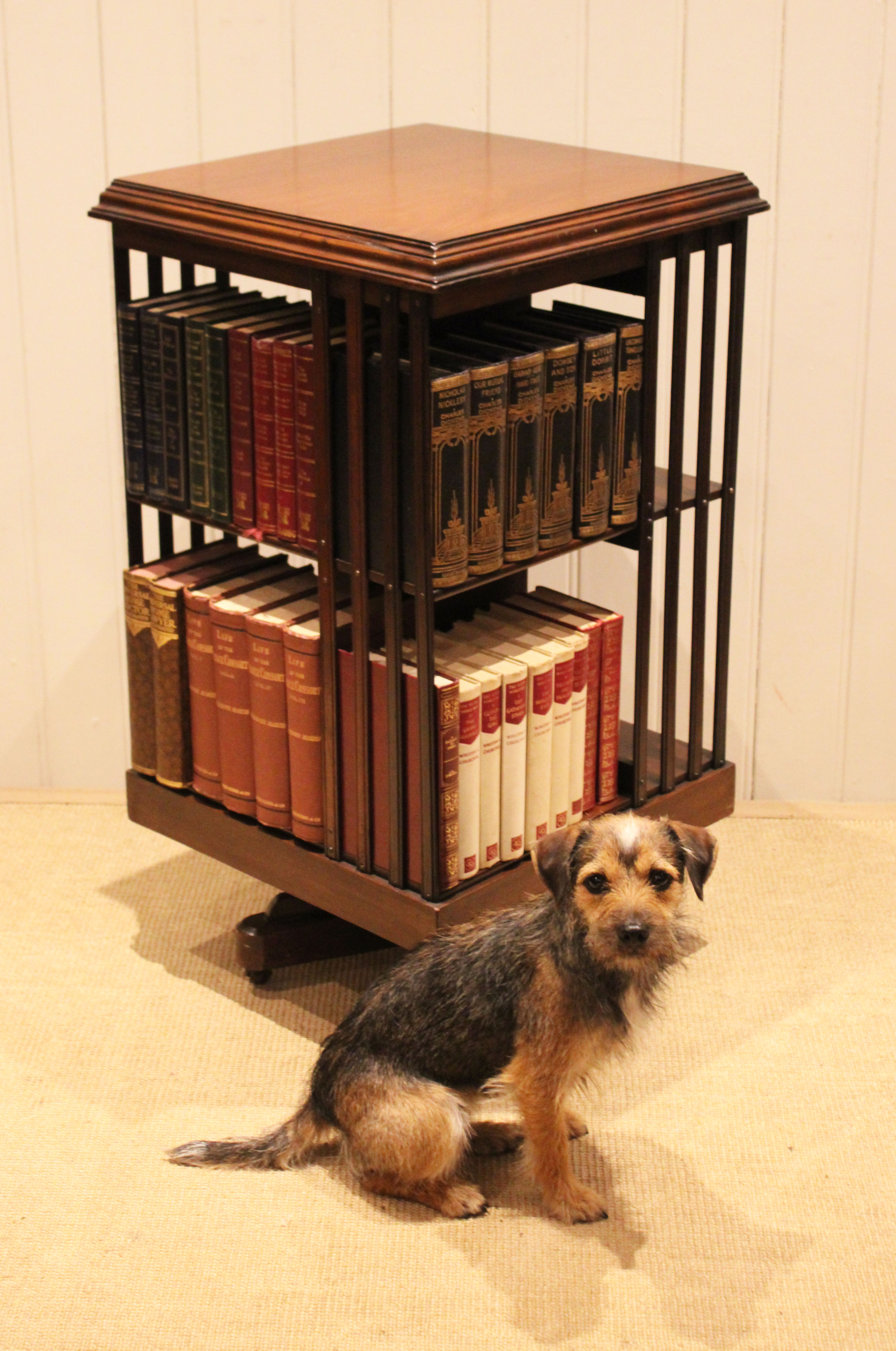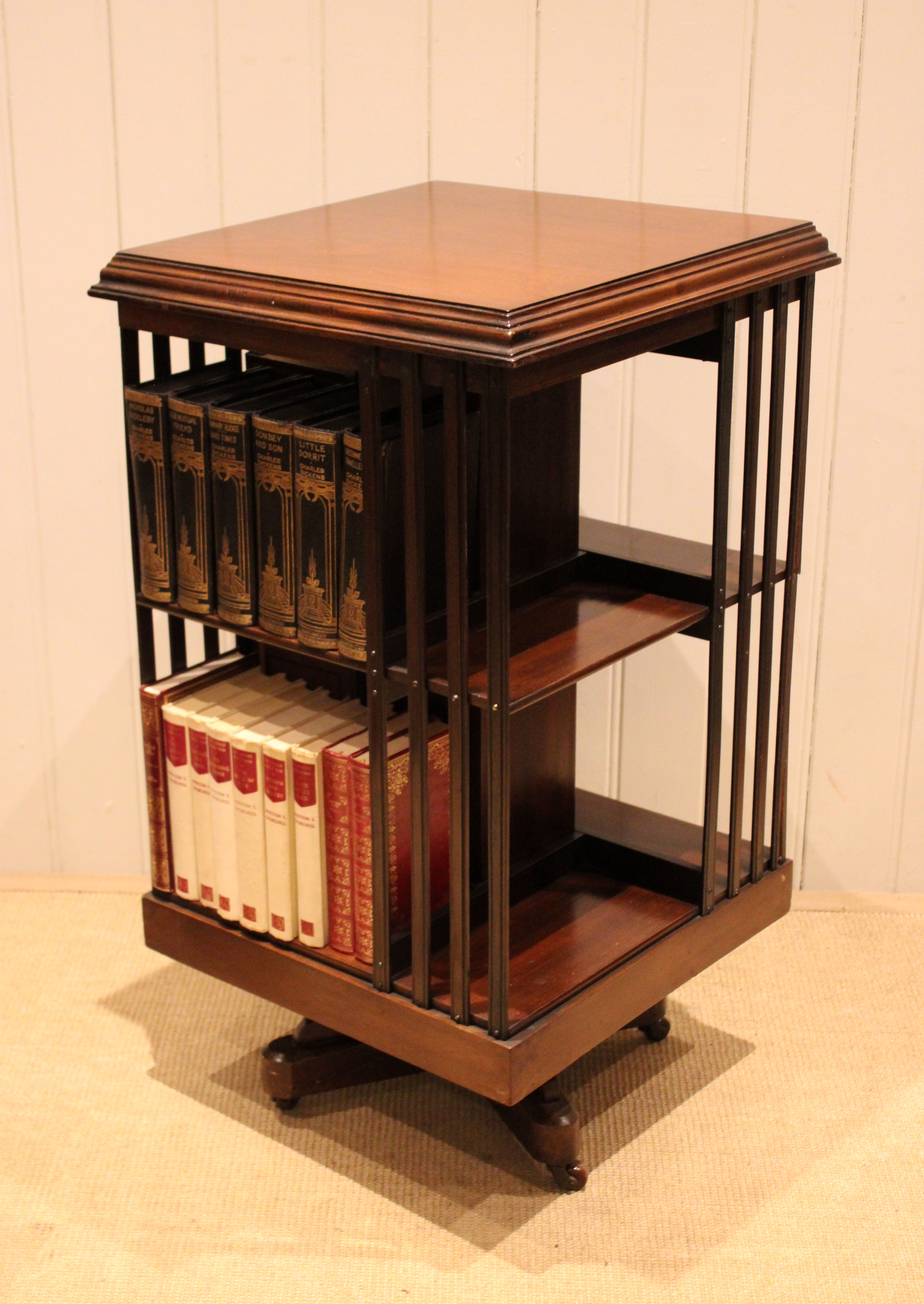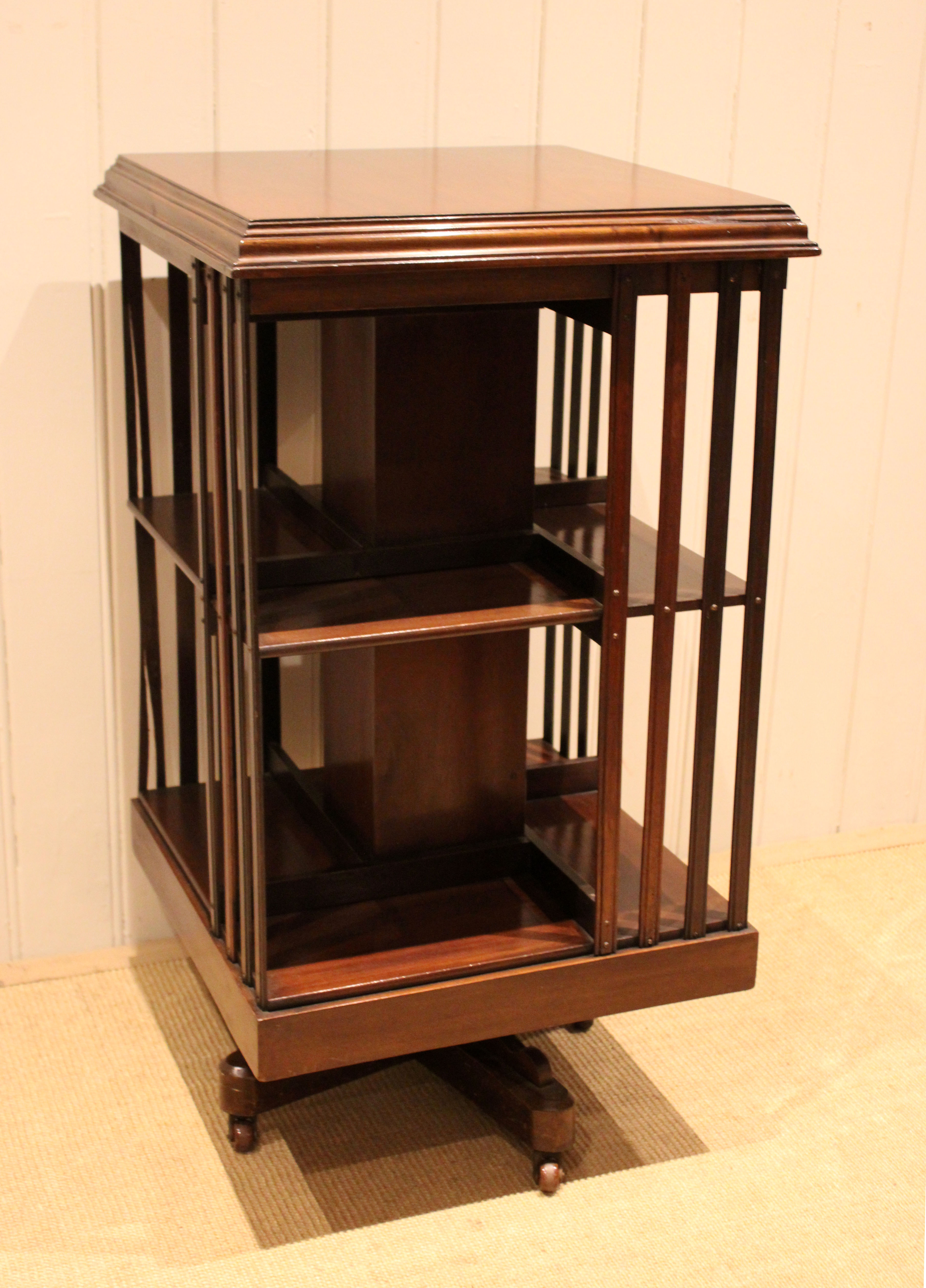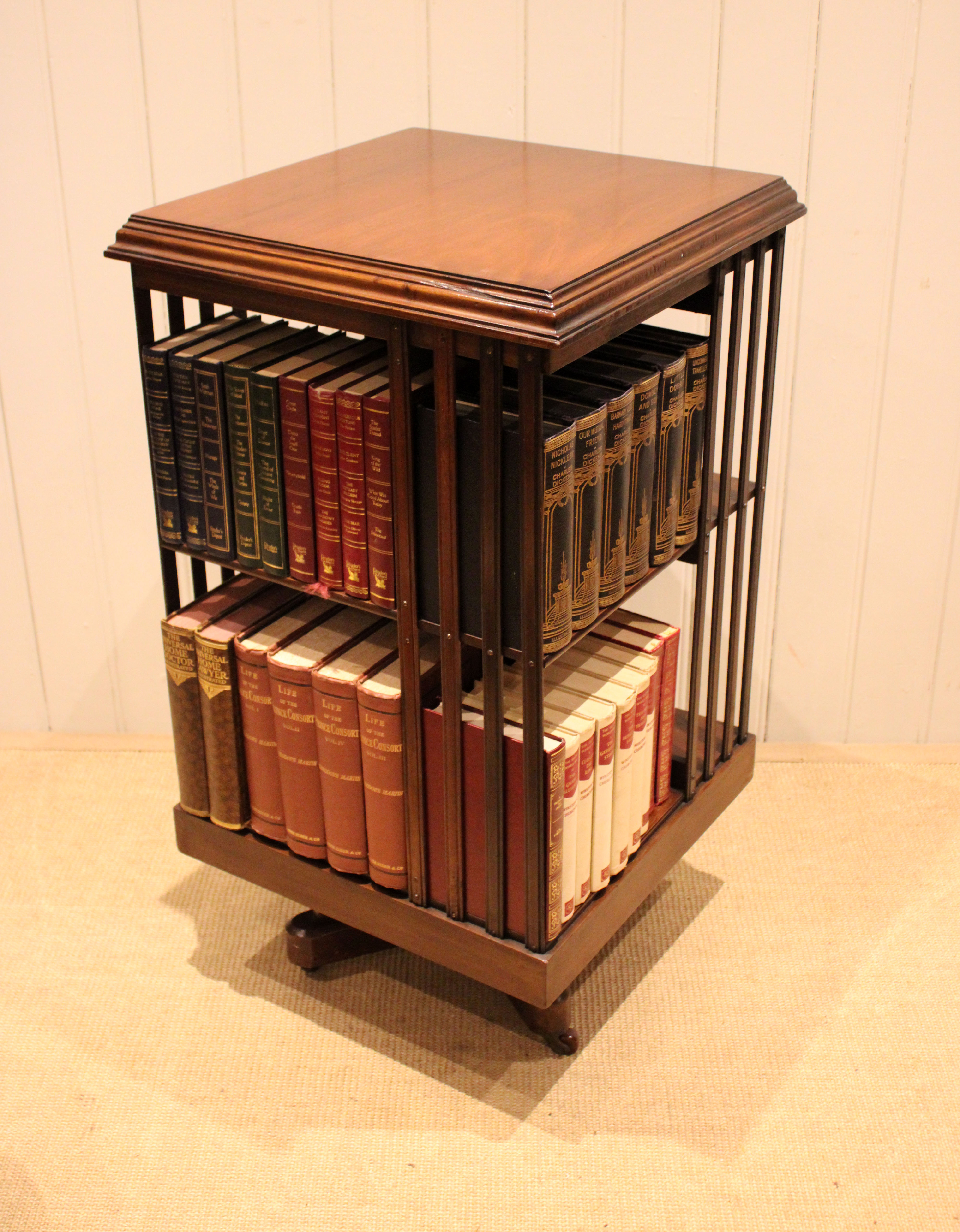 Edwardian solid mahogany revolving bookcase having two tiers and eight sections raised on cross supports with original ceramic castors . Each section measures 29 cm wide , 14 cm deep and 26 cm high .