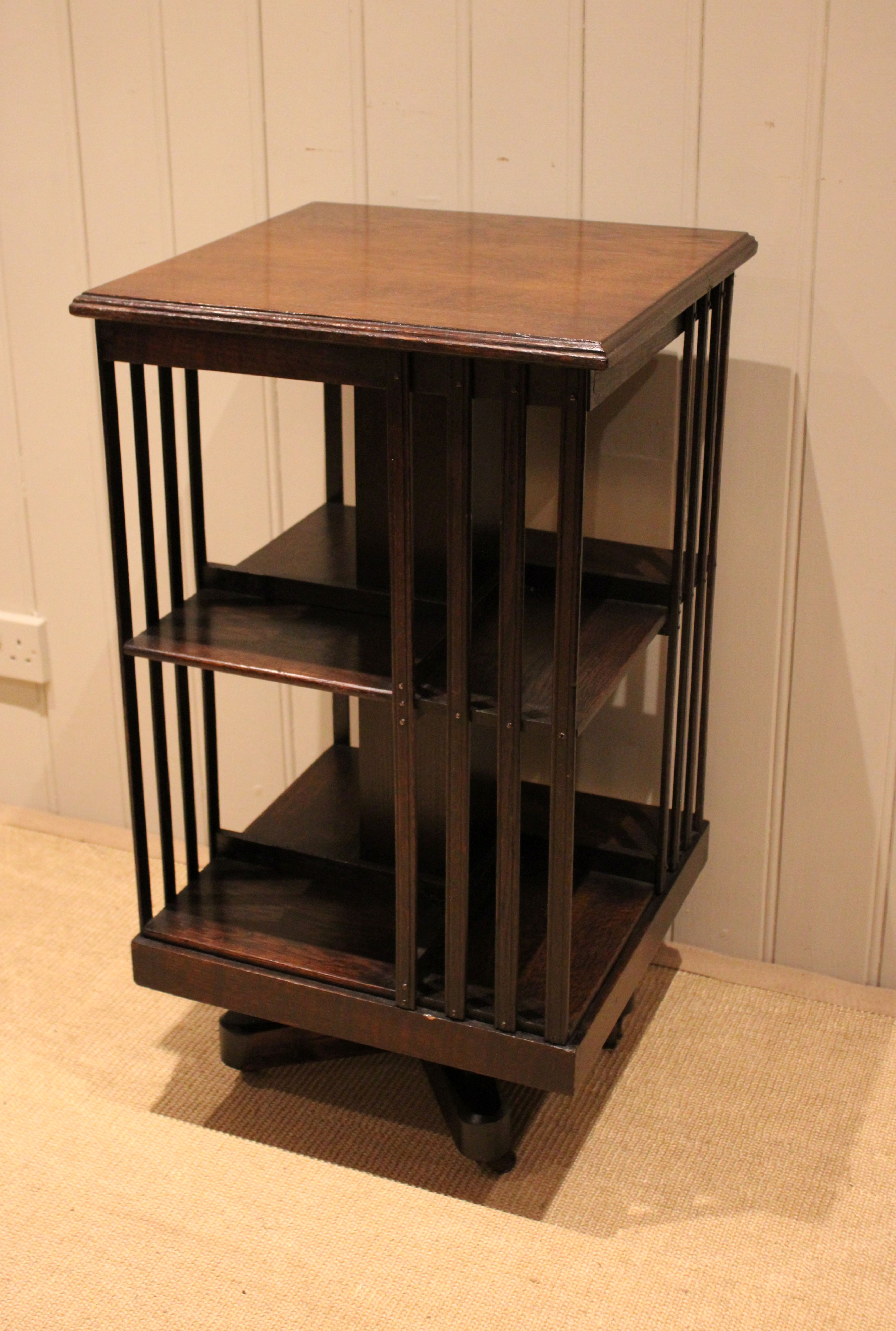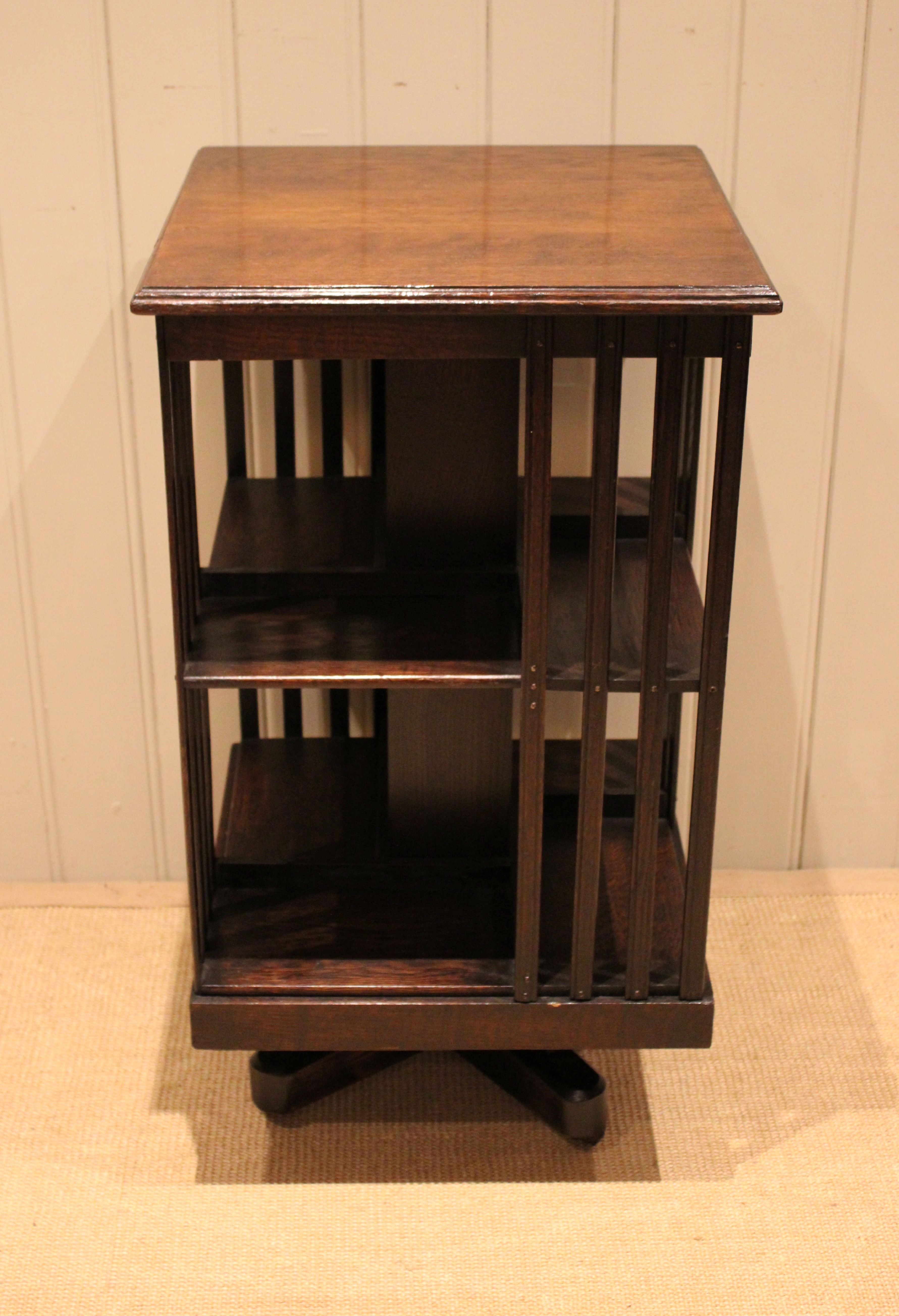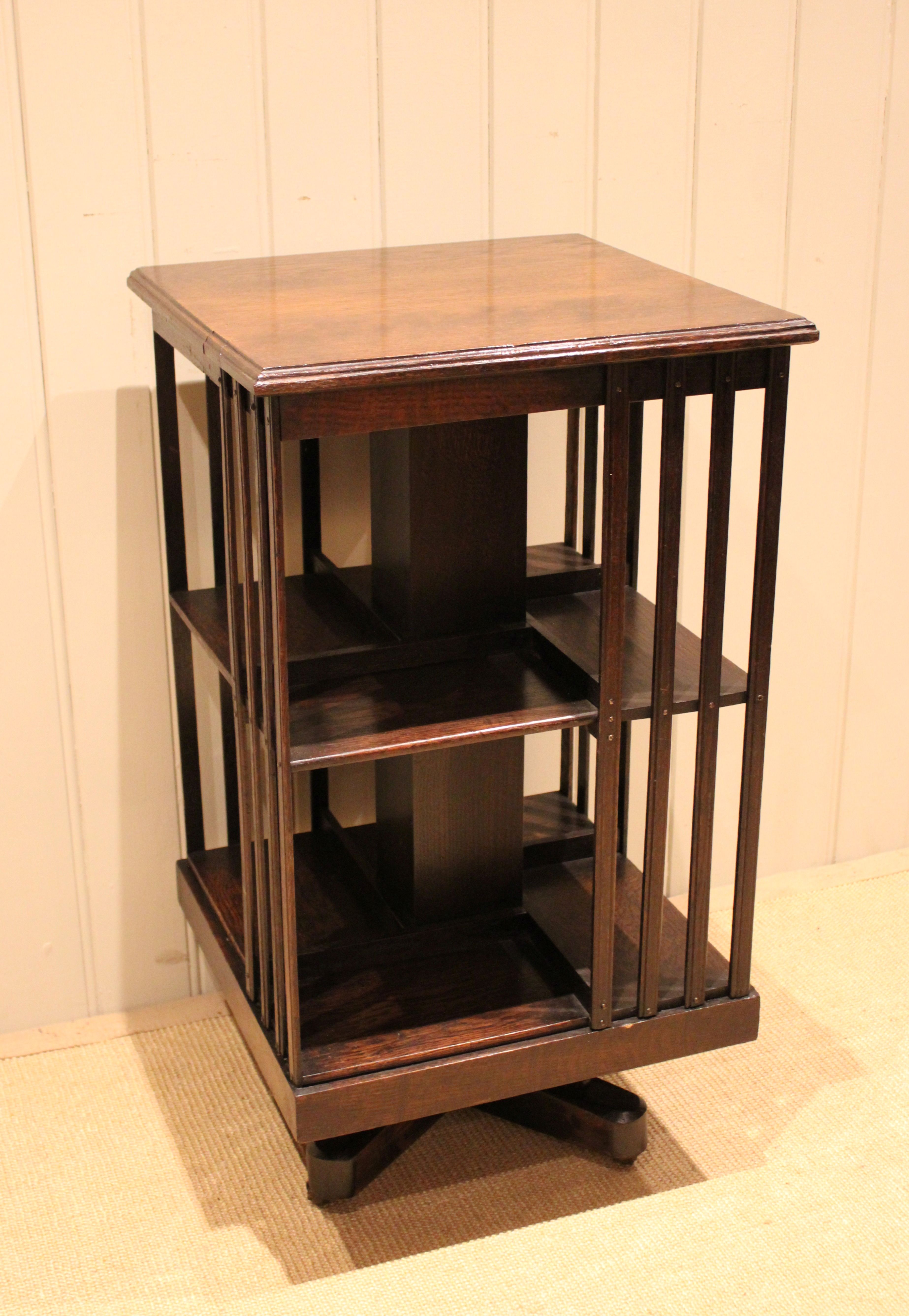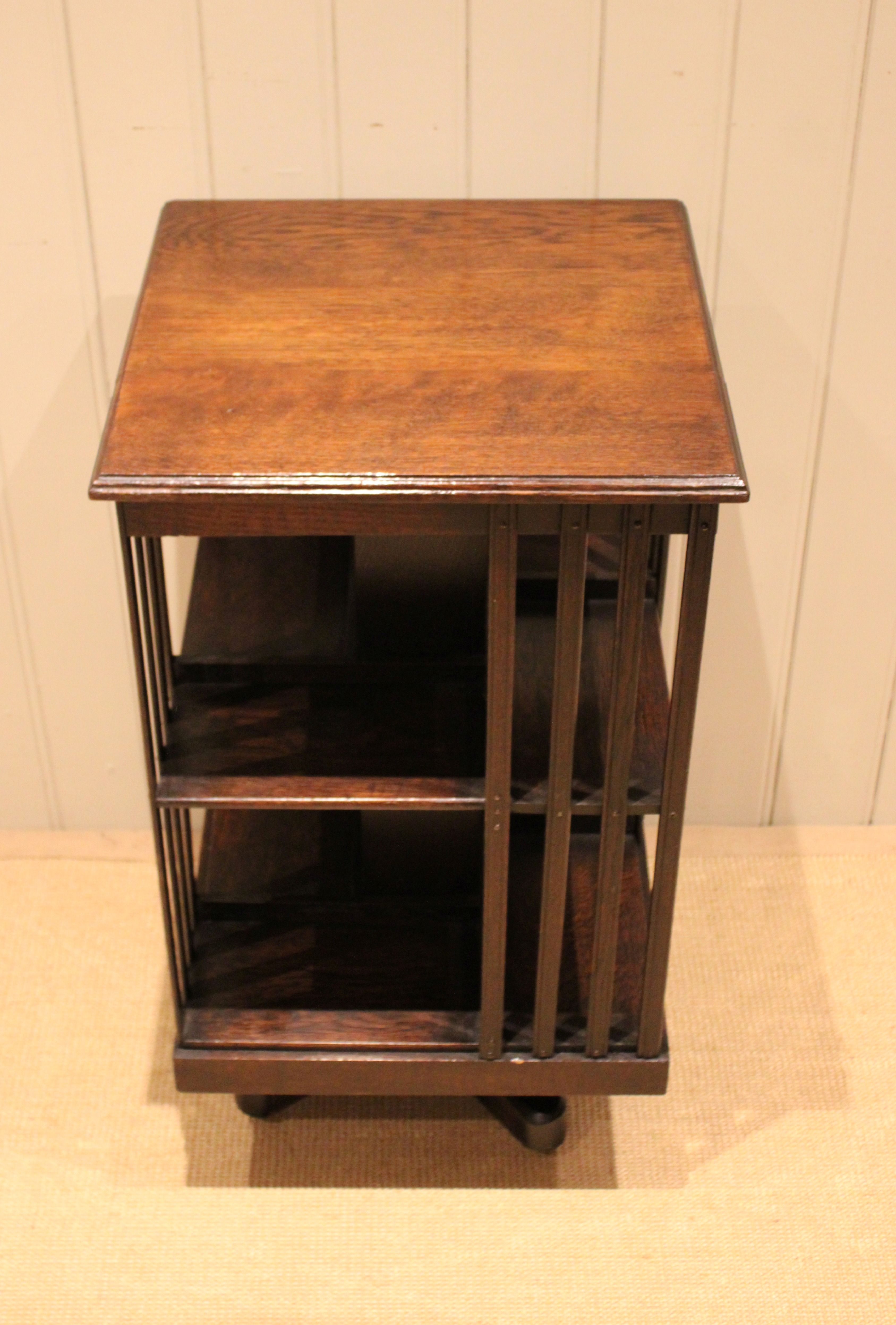 Oak revolving bookcase with a two tier structure with four vertical slats to each side on its original revolving base. The shelf dimensions are 14 cm deep x 25.5 cm wide x 27.5 cm high at the bottom and 25.5 cm high at the top .