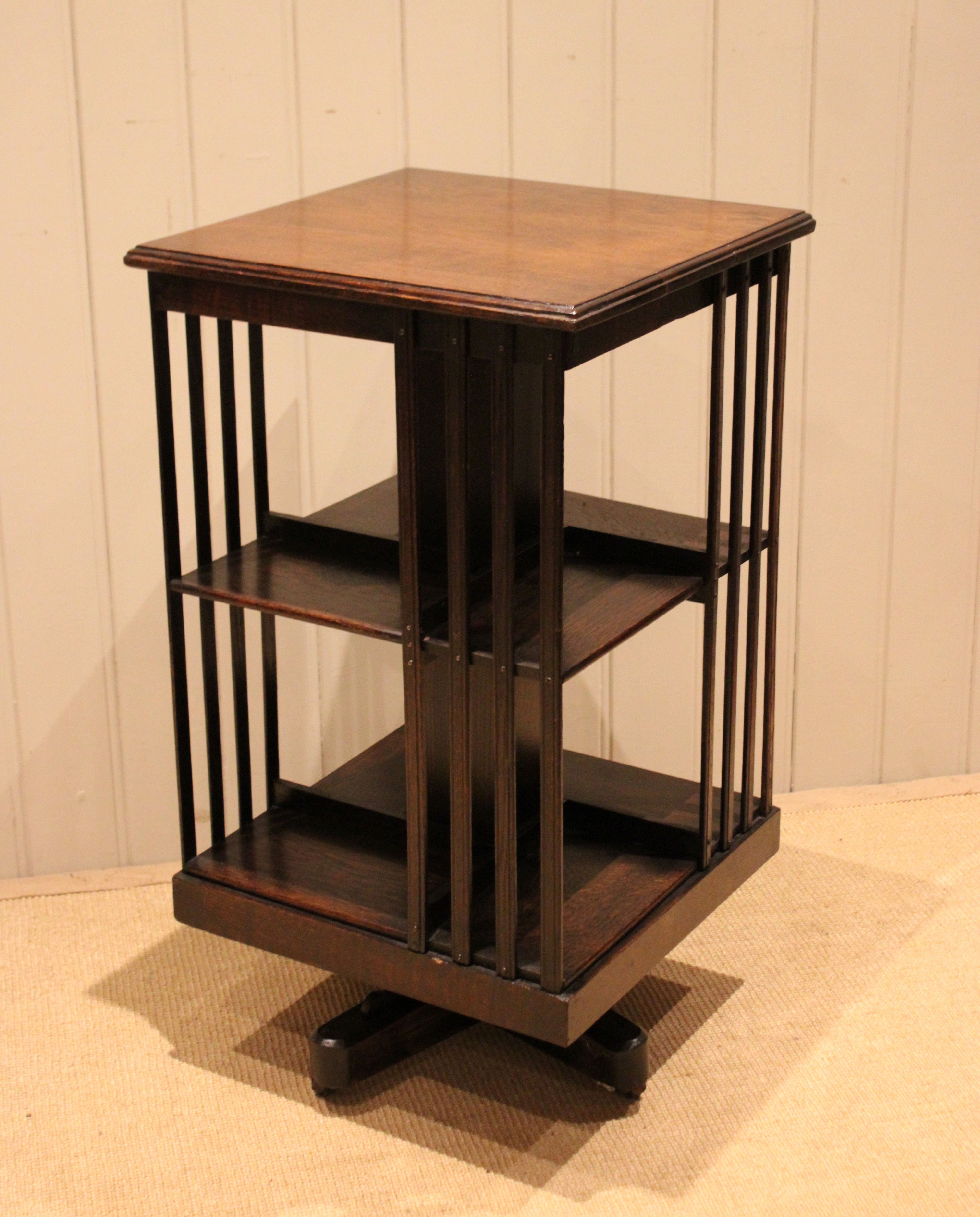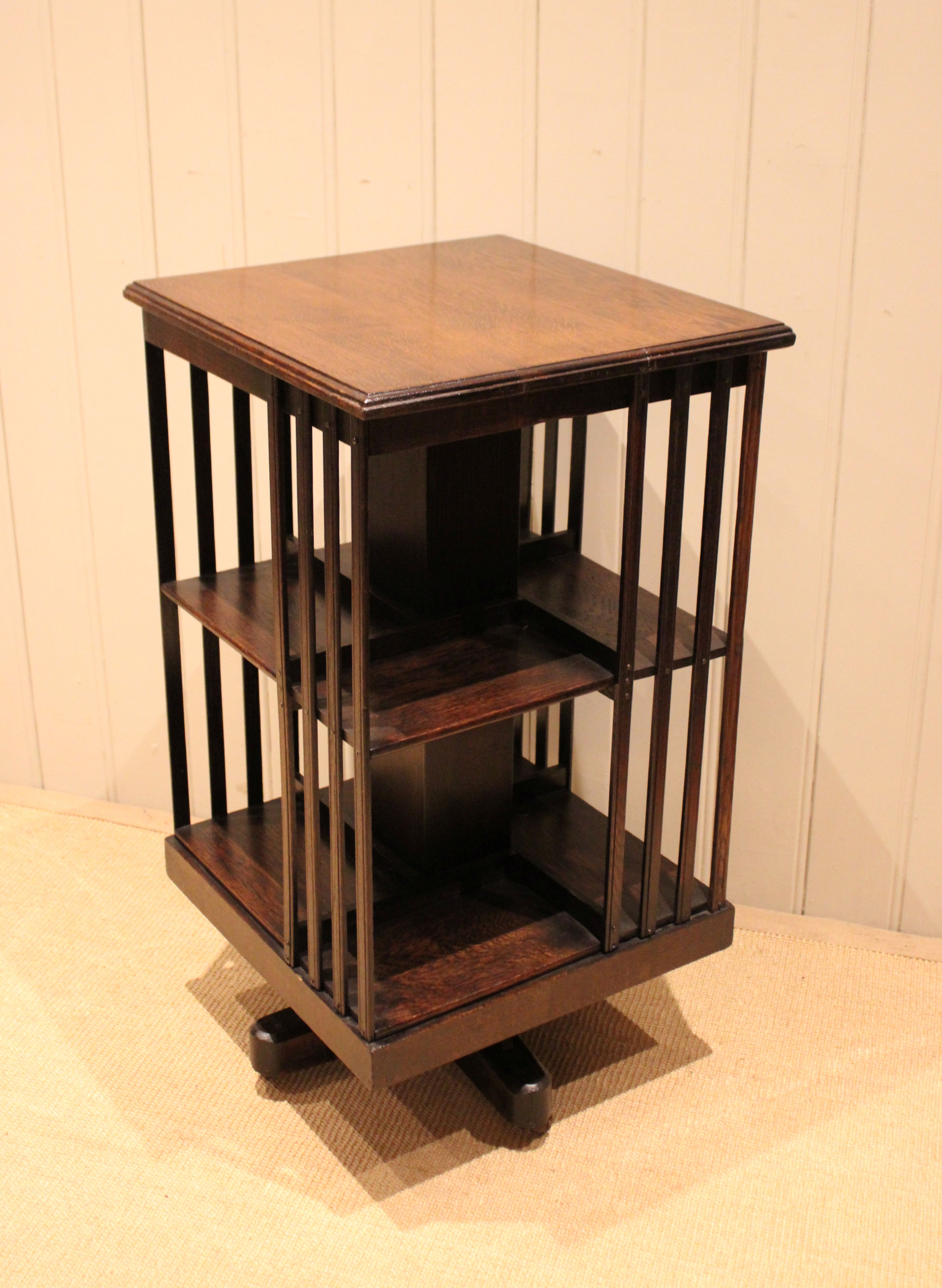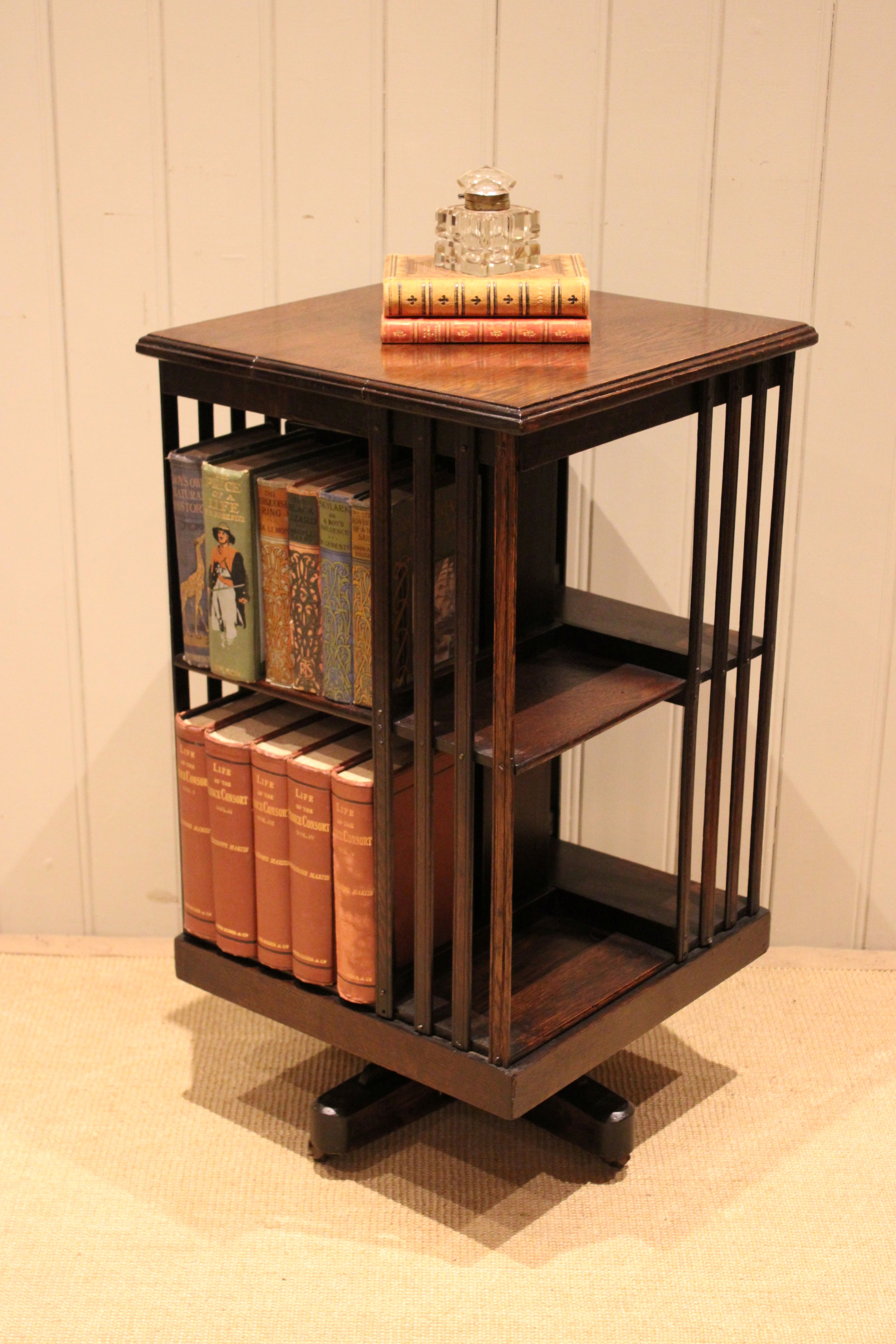 Oak revolving bookcase with a two tier structure with four vertical slats to each side on its original revolving base. The shelf dimensions are 14 cm deep x 25.5 cm wide x 27.5 cm high at the bottom and 25.5 cm high at the top .