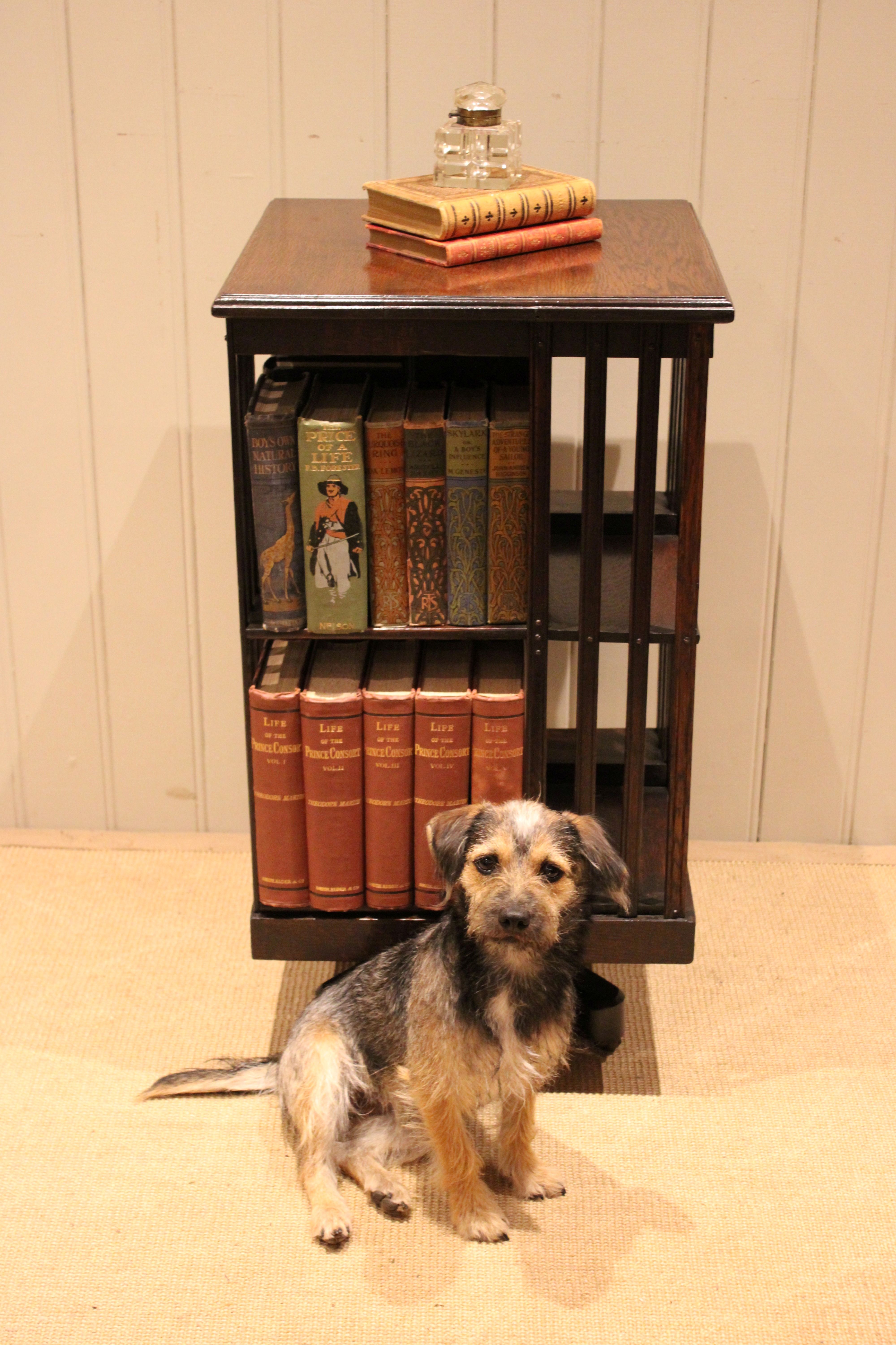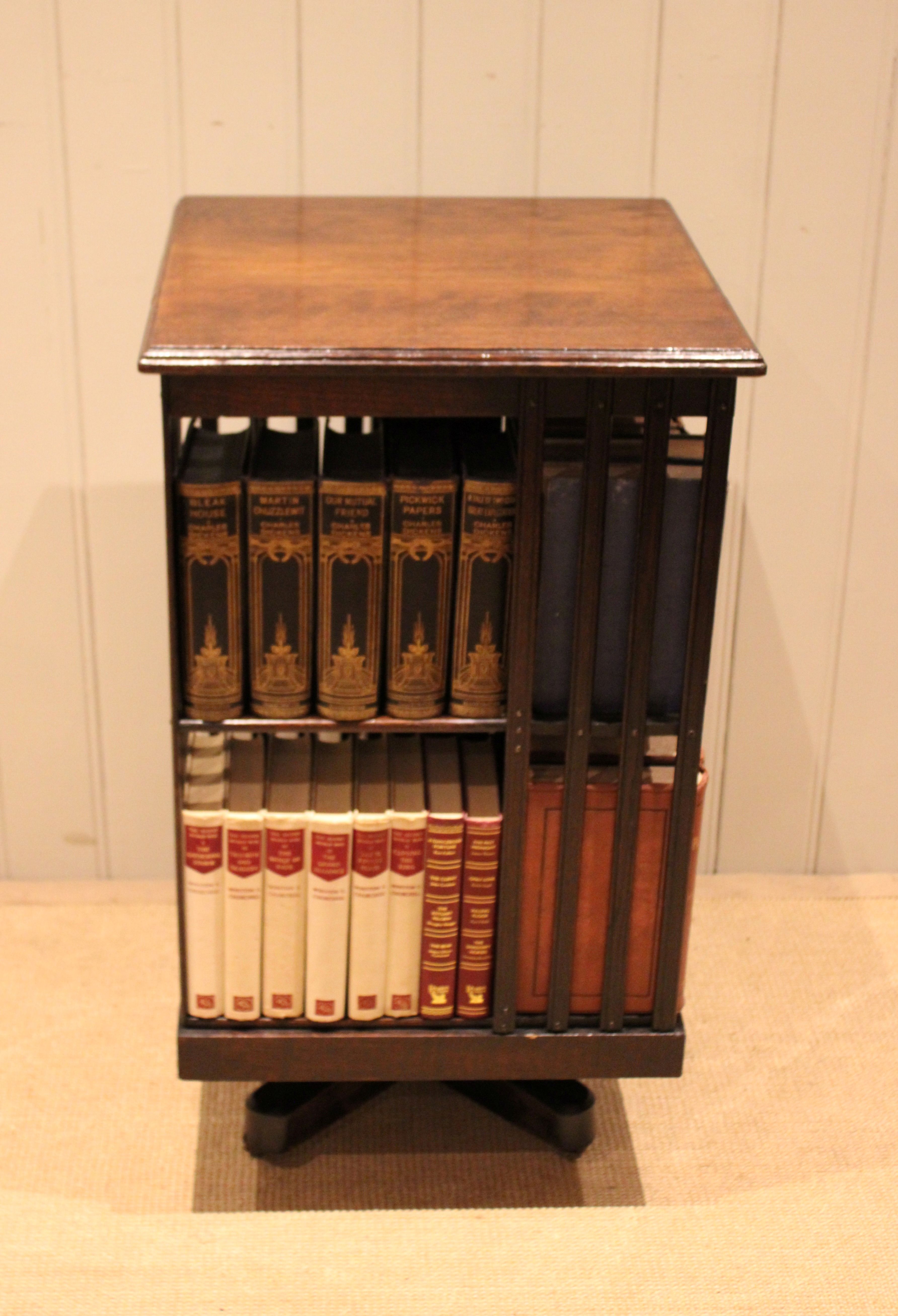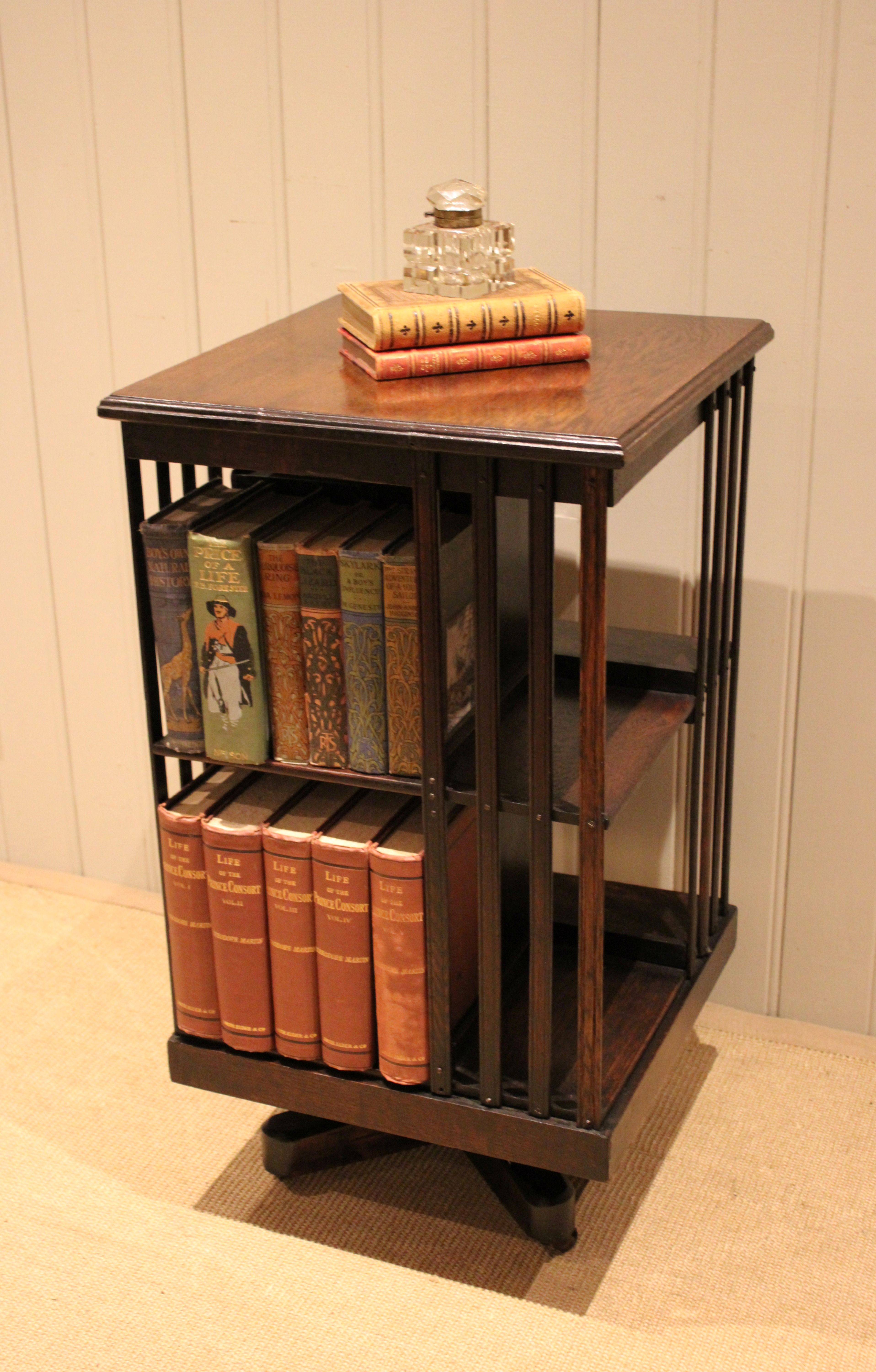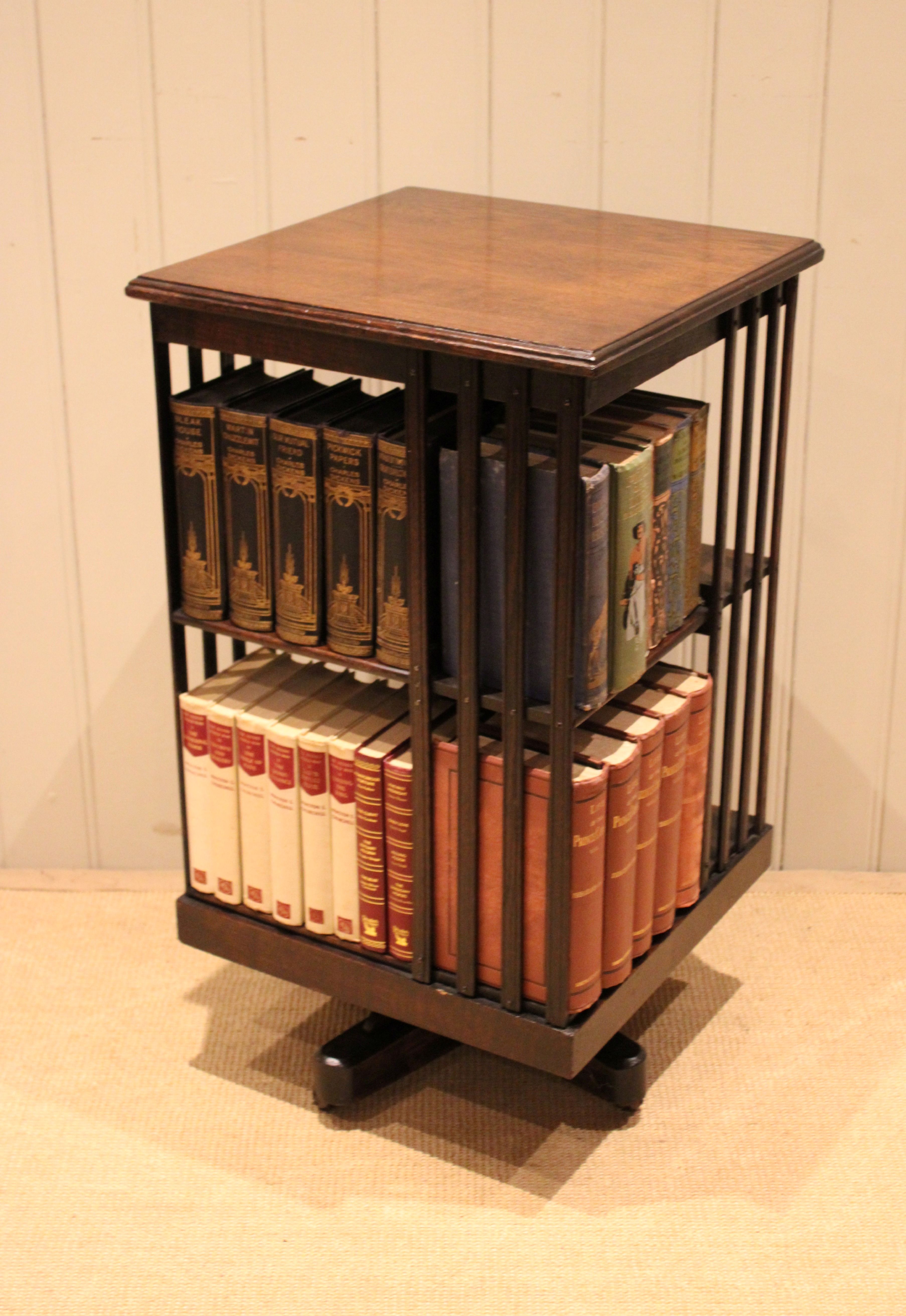Oak revolving bookcase with a two tier structure with four vertical slats to each side on its original revolving base. The shelf dimensions are 14 cm deep x 25.5 cm wide x 27.5 cm high at the bottom and 25.5 cm high at the top .