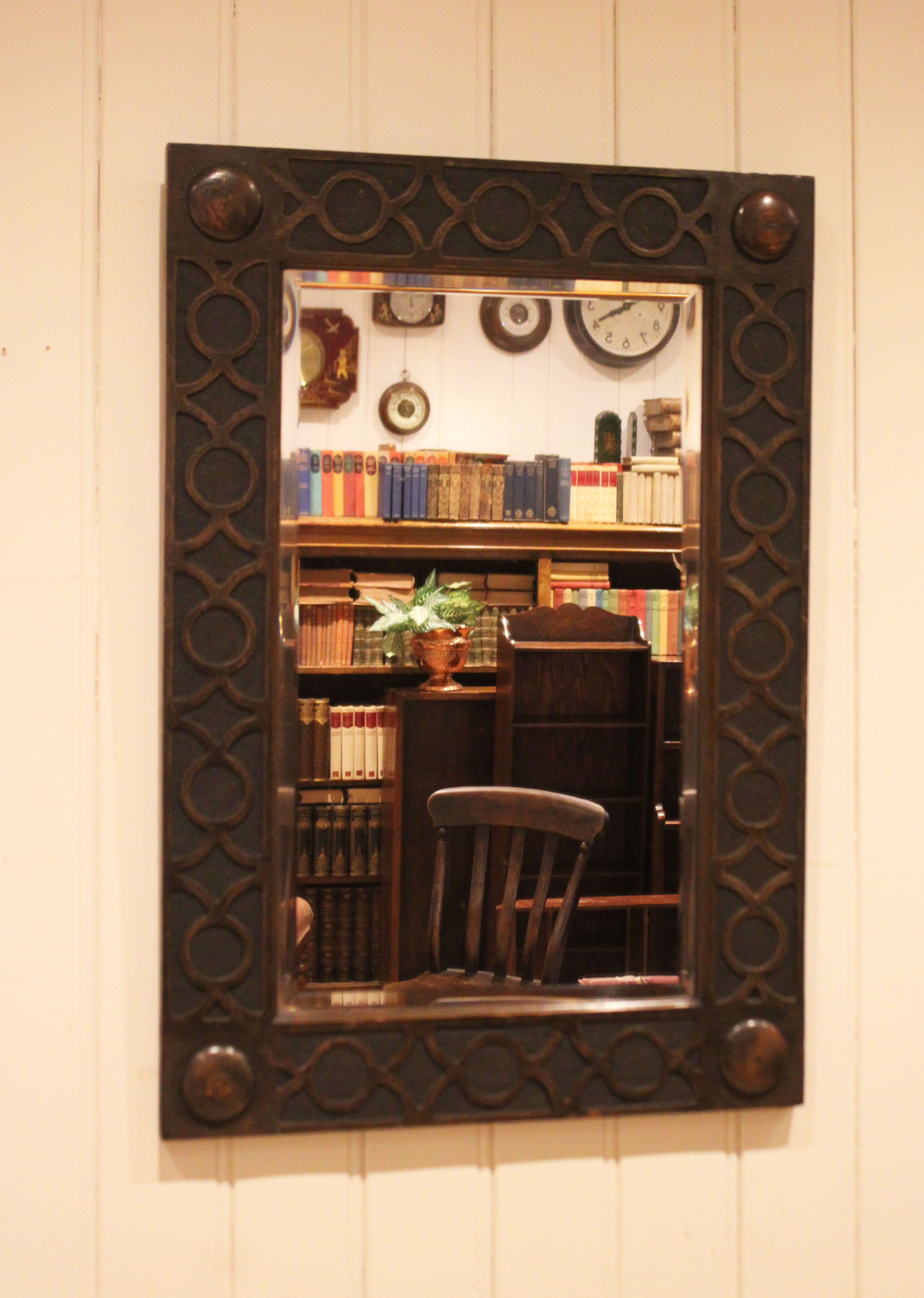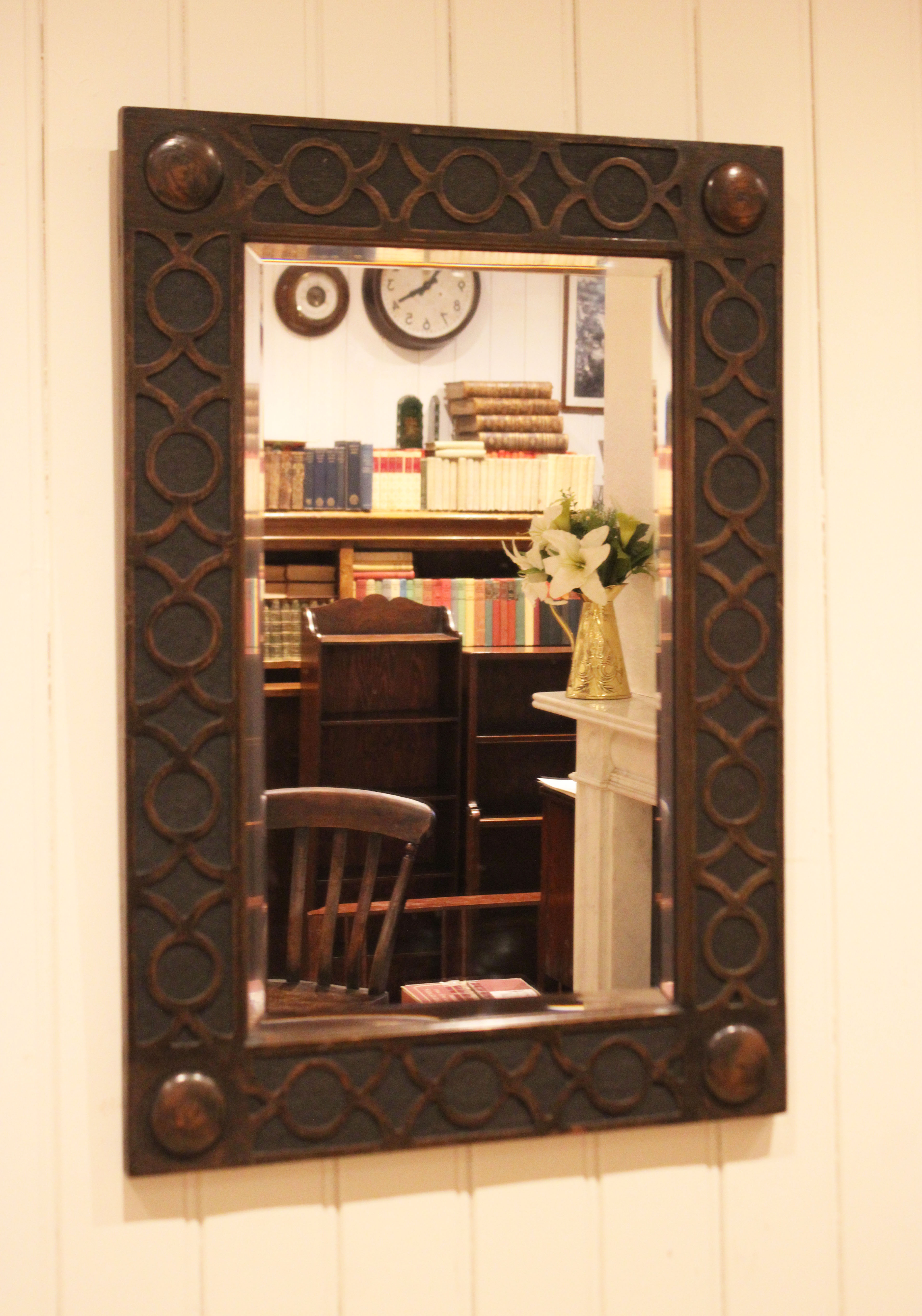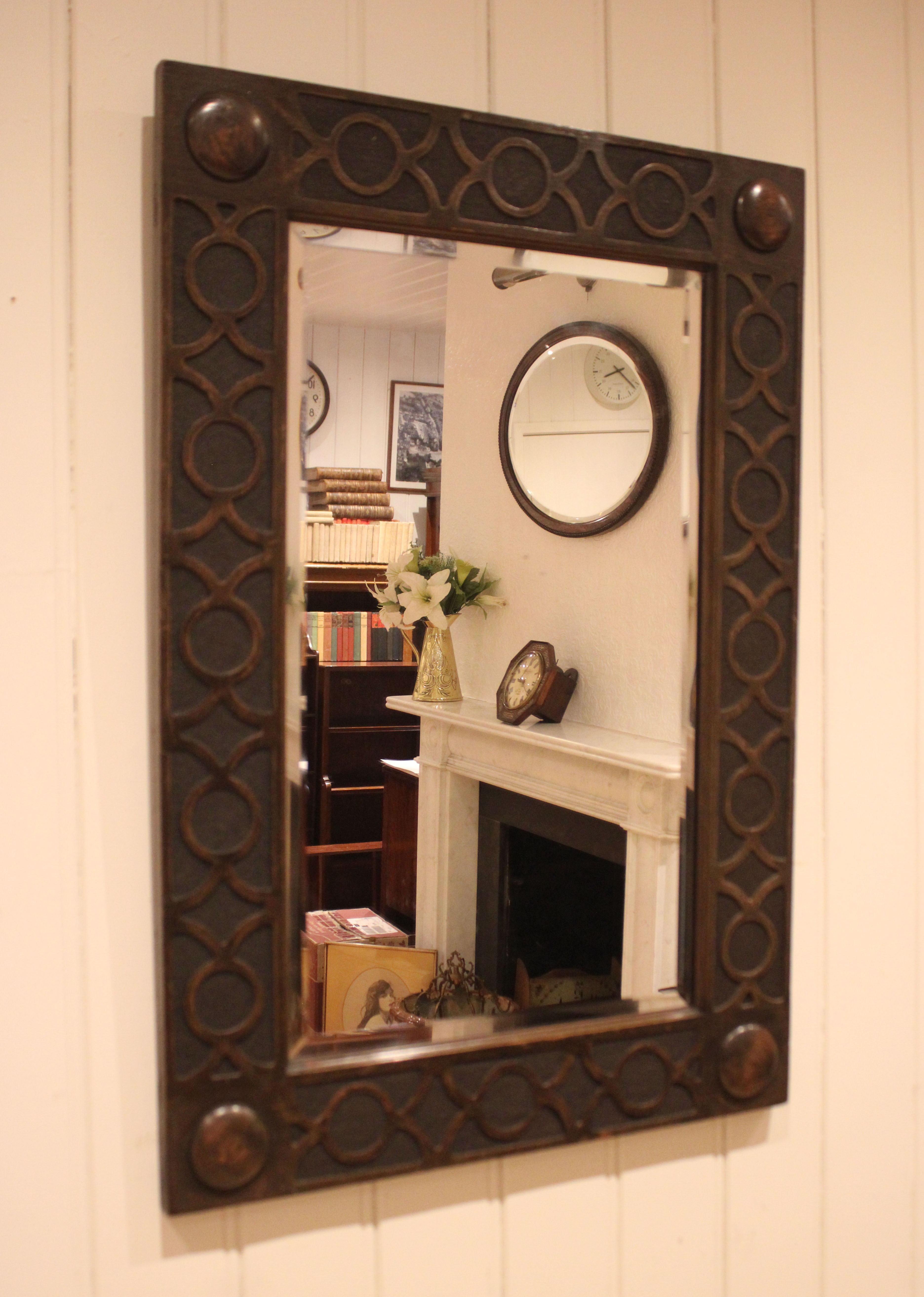 Edwardian solid oak wall mirror having a decorative carved decoration , with an inset bevel edge mirror.