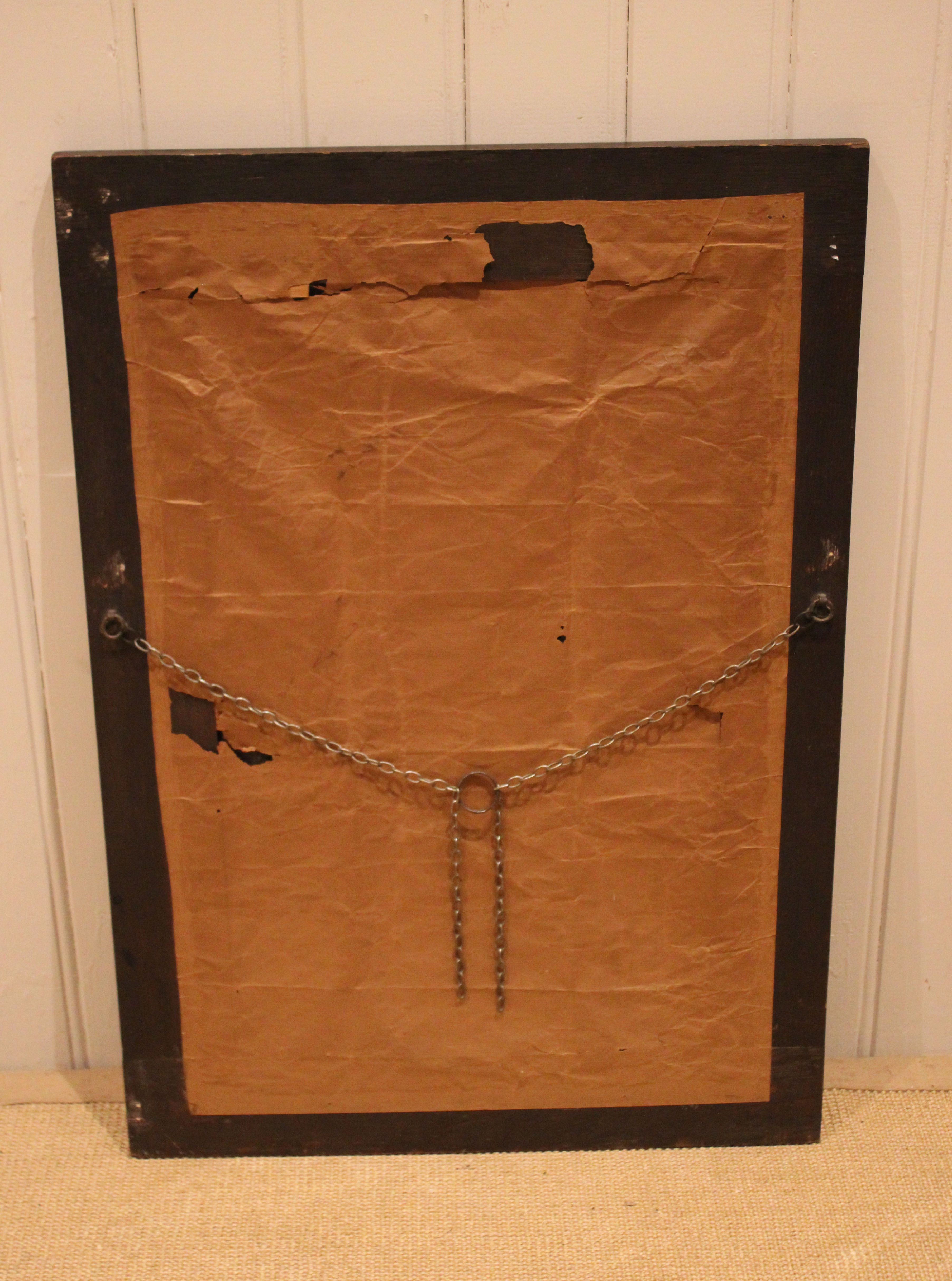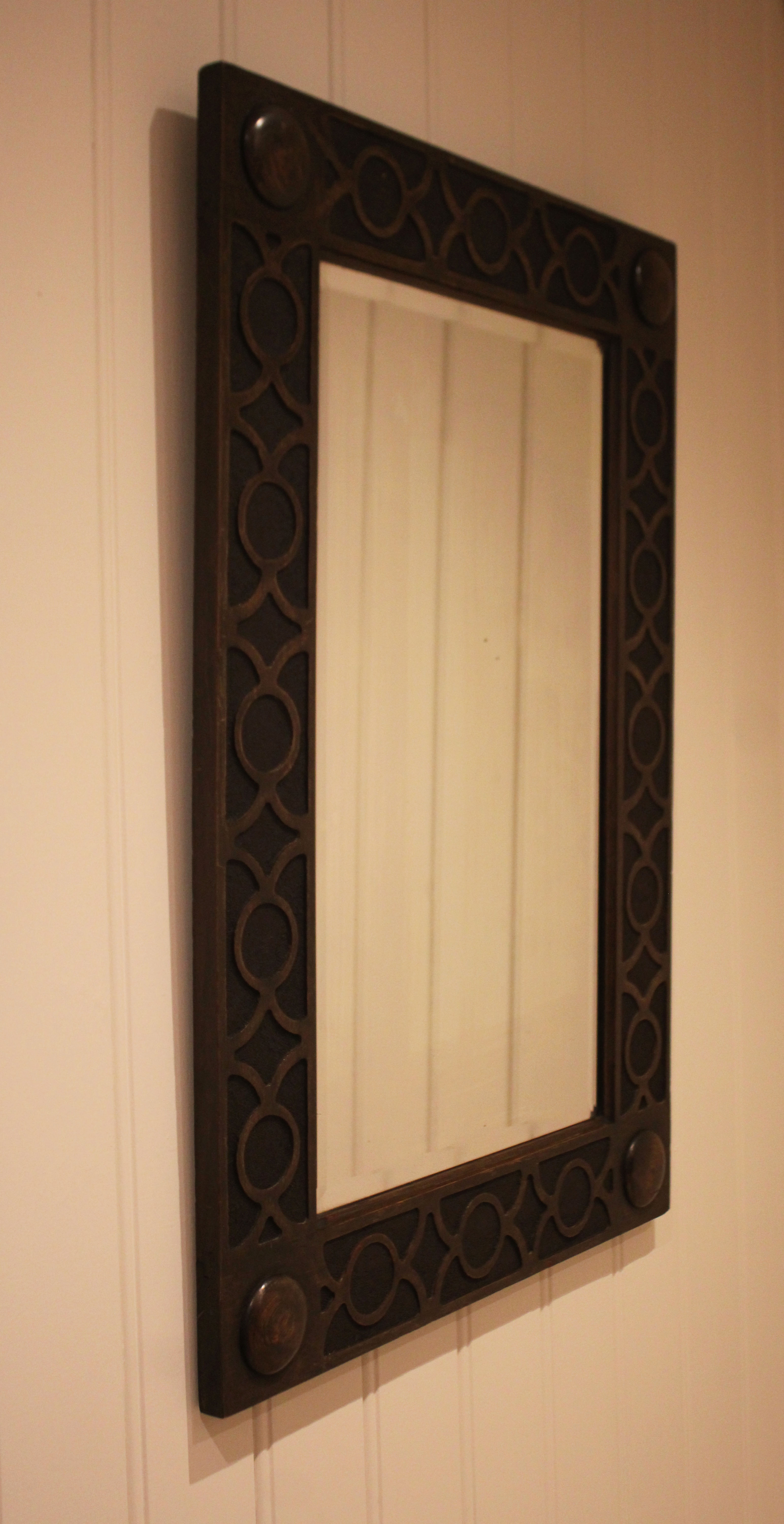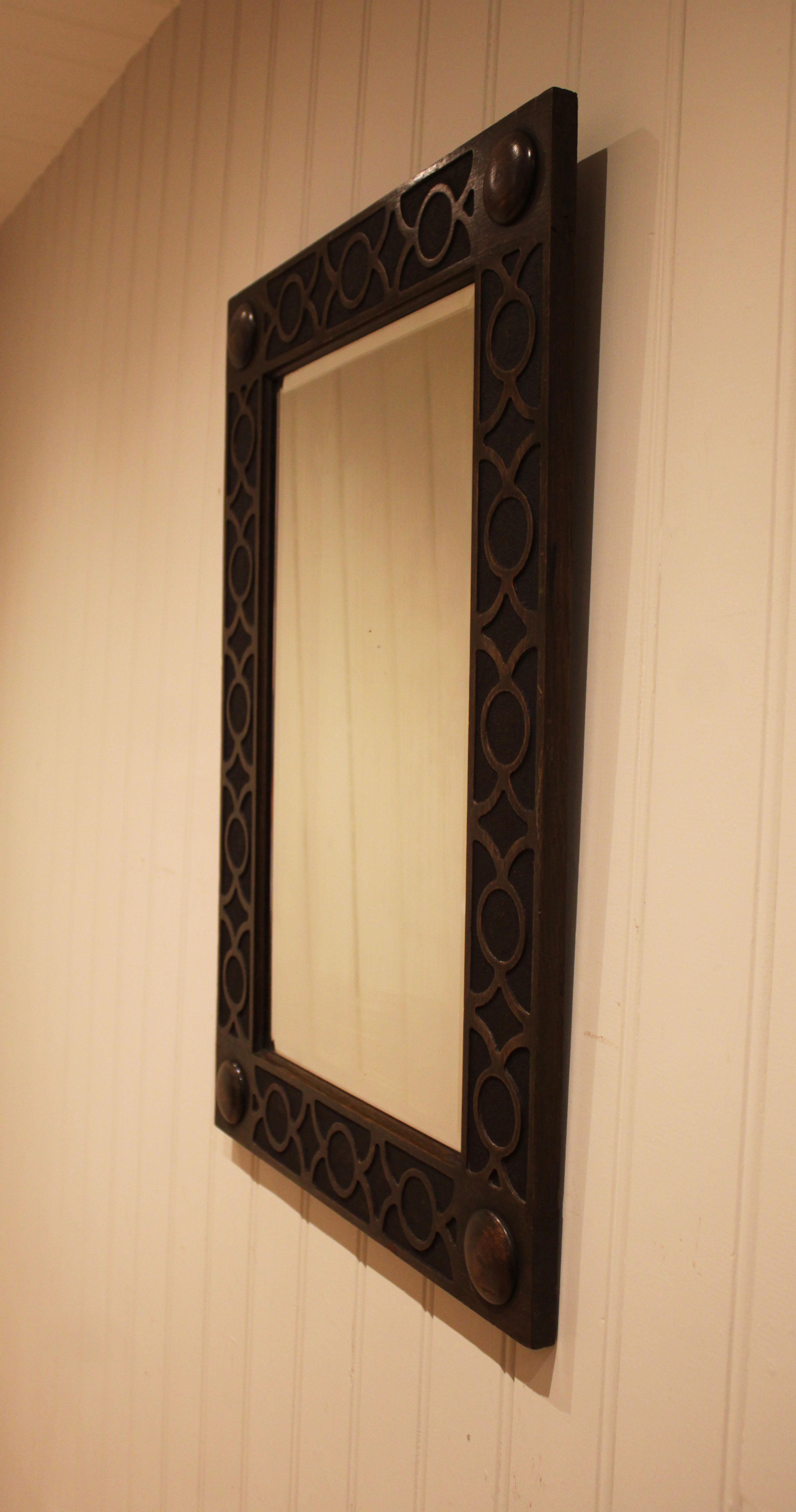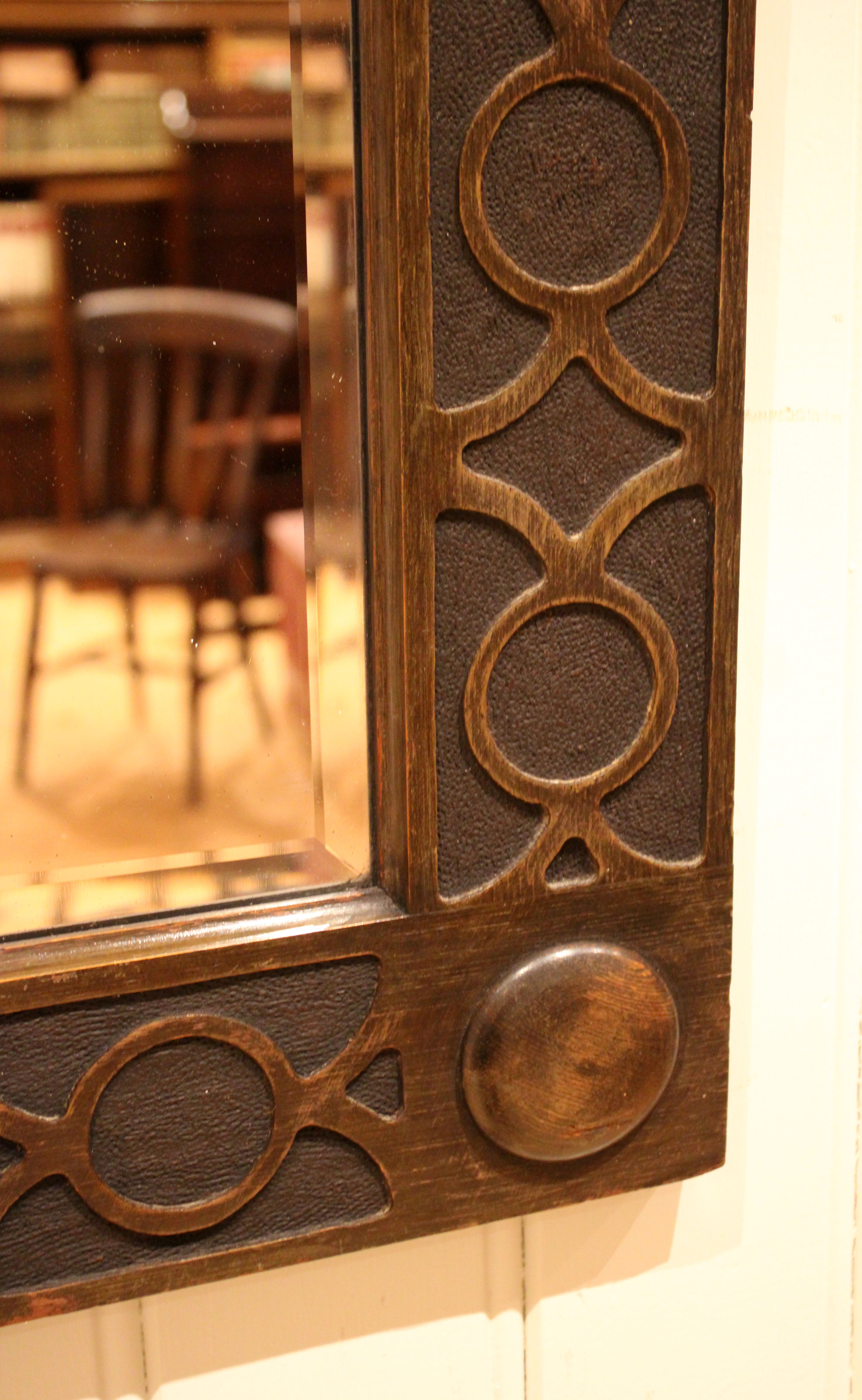 Edwardian solid oak wall mirror having a decorative carved decoration , with an inset bevel edge mirror.
