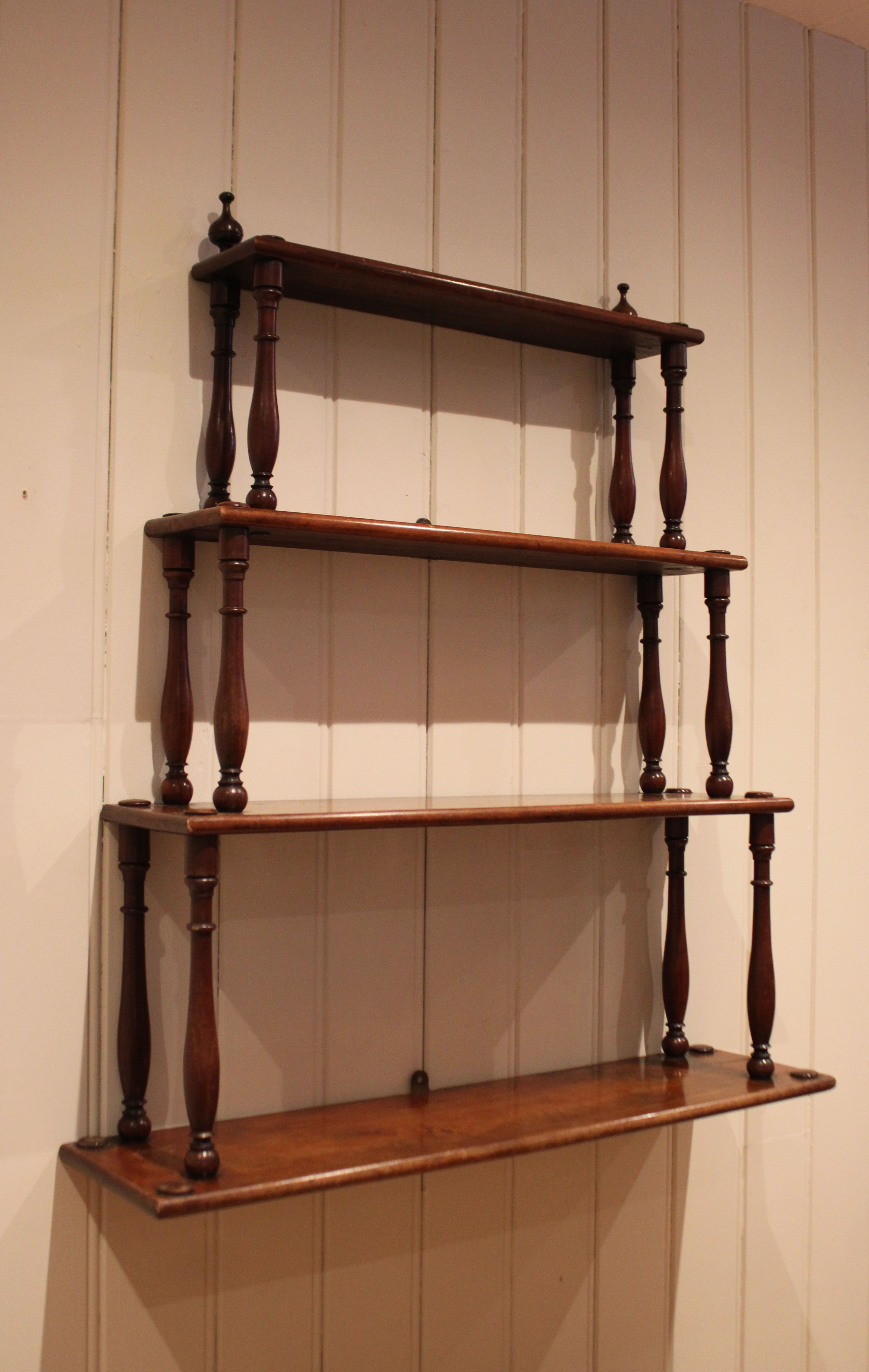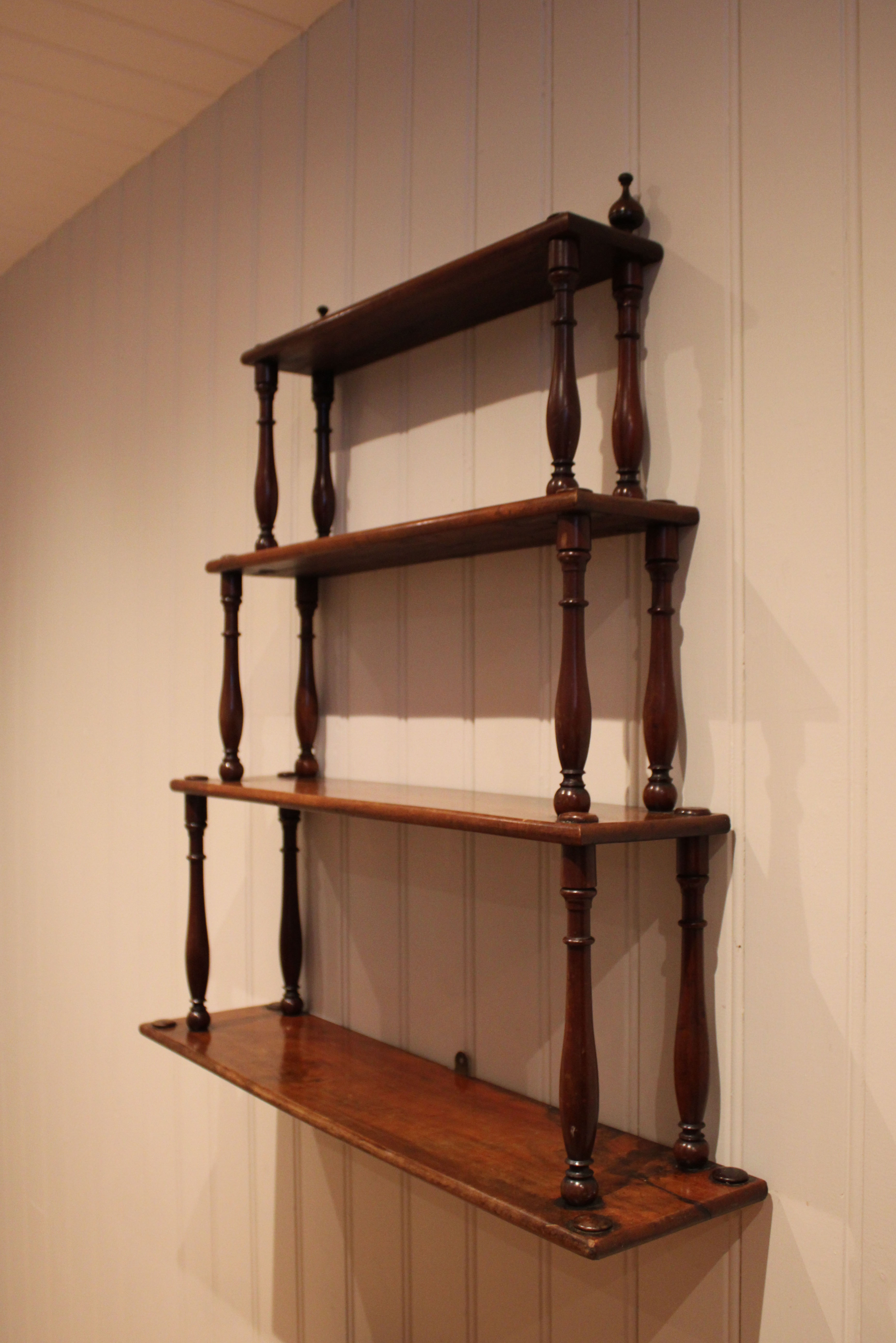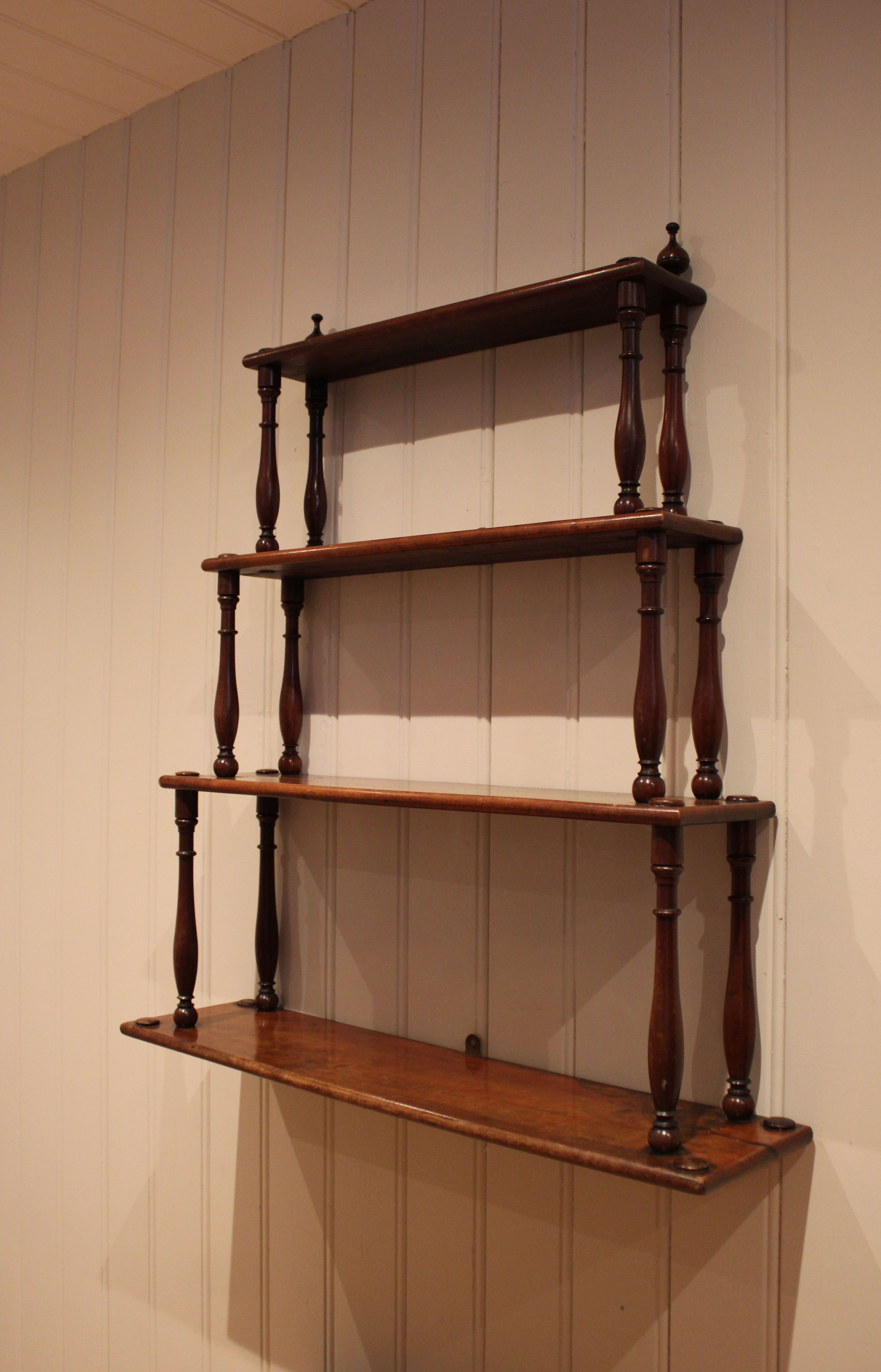 Late 19th century French mahogany waterfall wall shelves having three tiers , on turned supports . The shelf dimensions are from the bottom up 27 cm high x 19 cm deep , 23 cm high x 16 cm deep , 21.5 cm high x 11ncm deep .