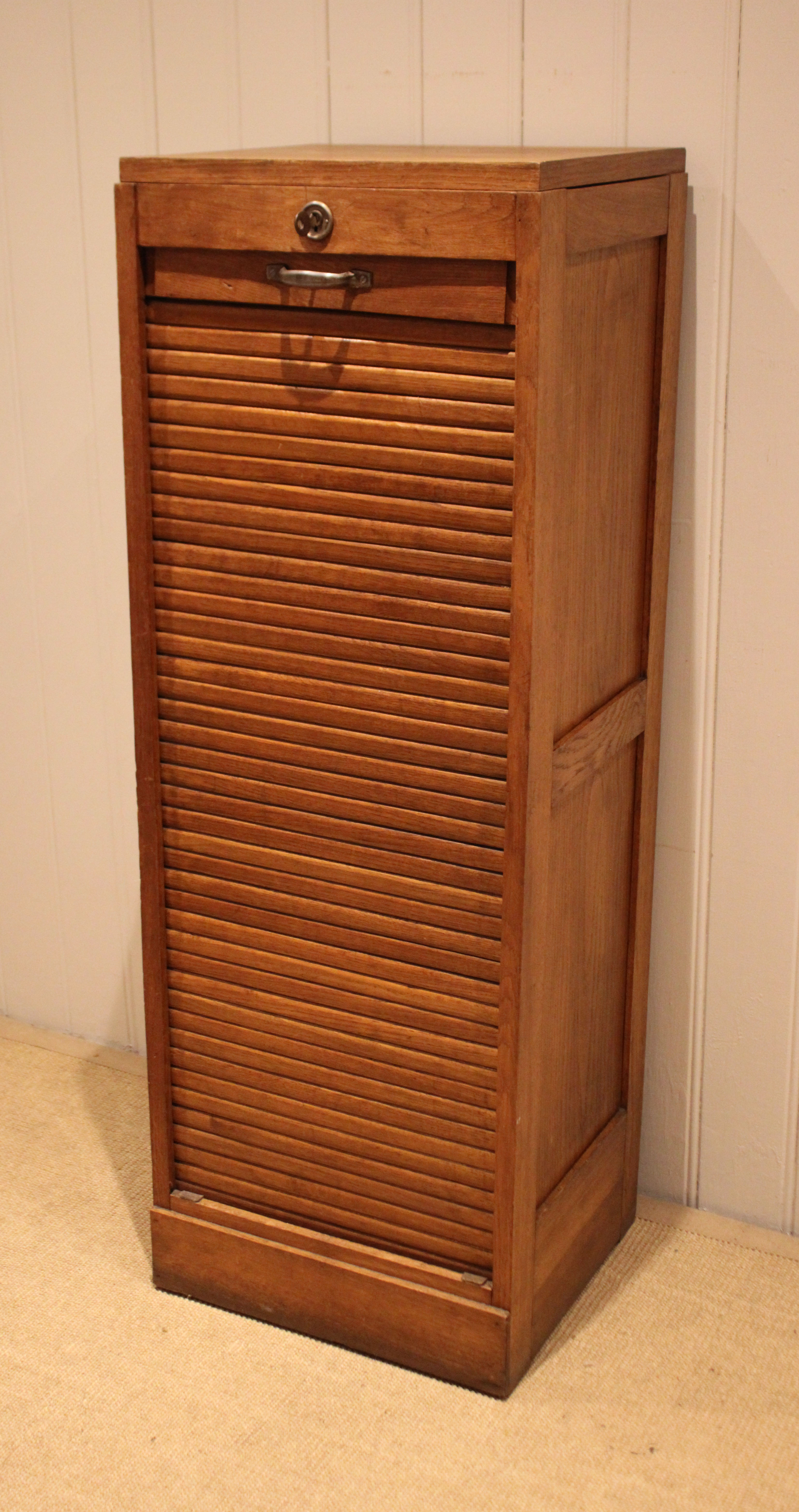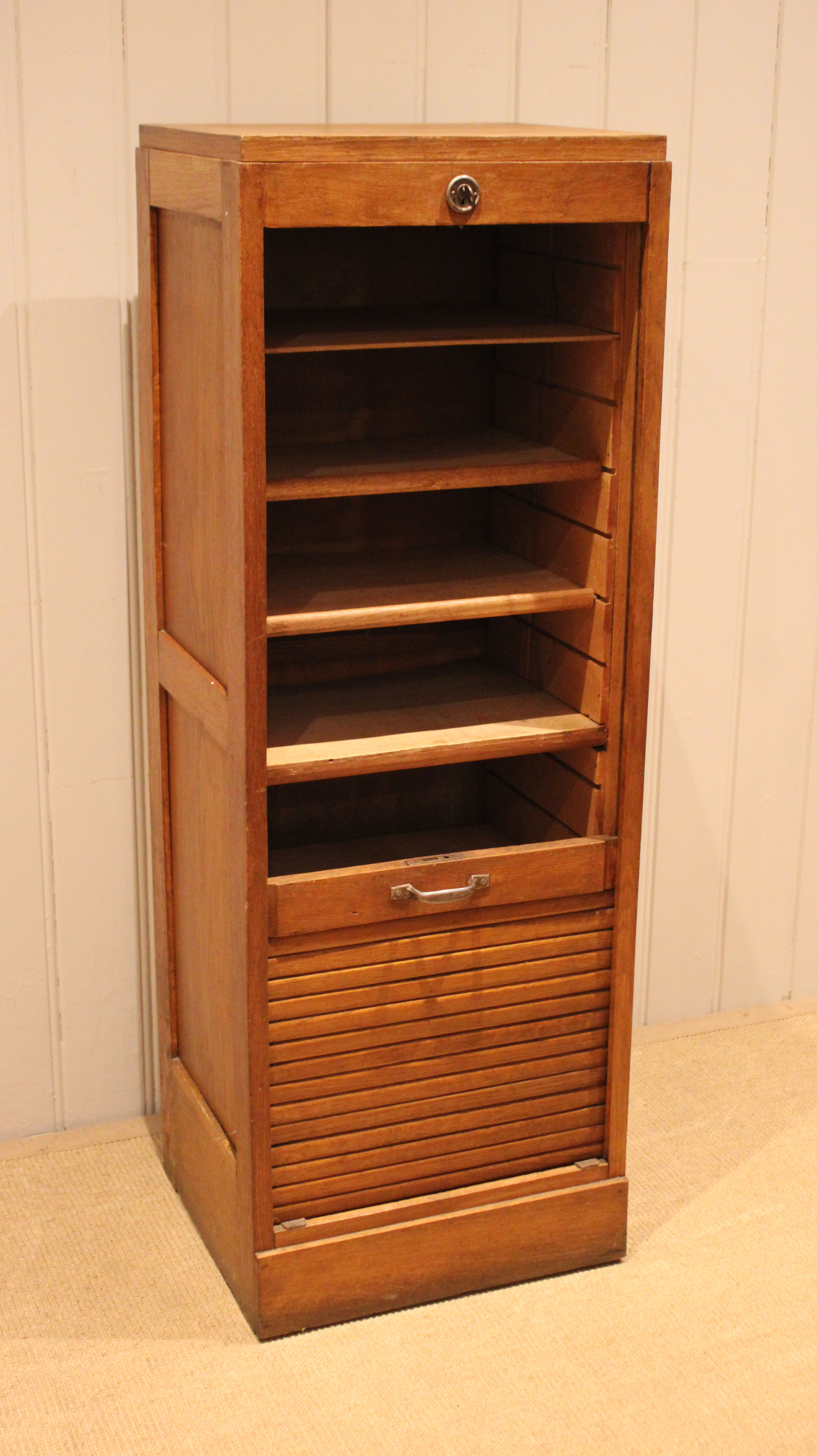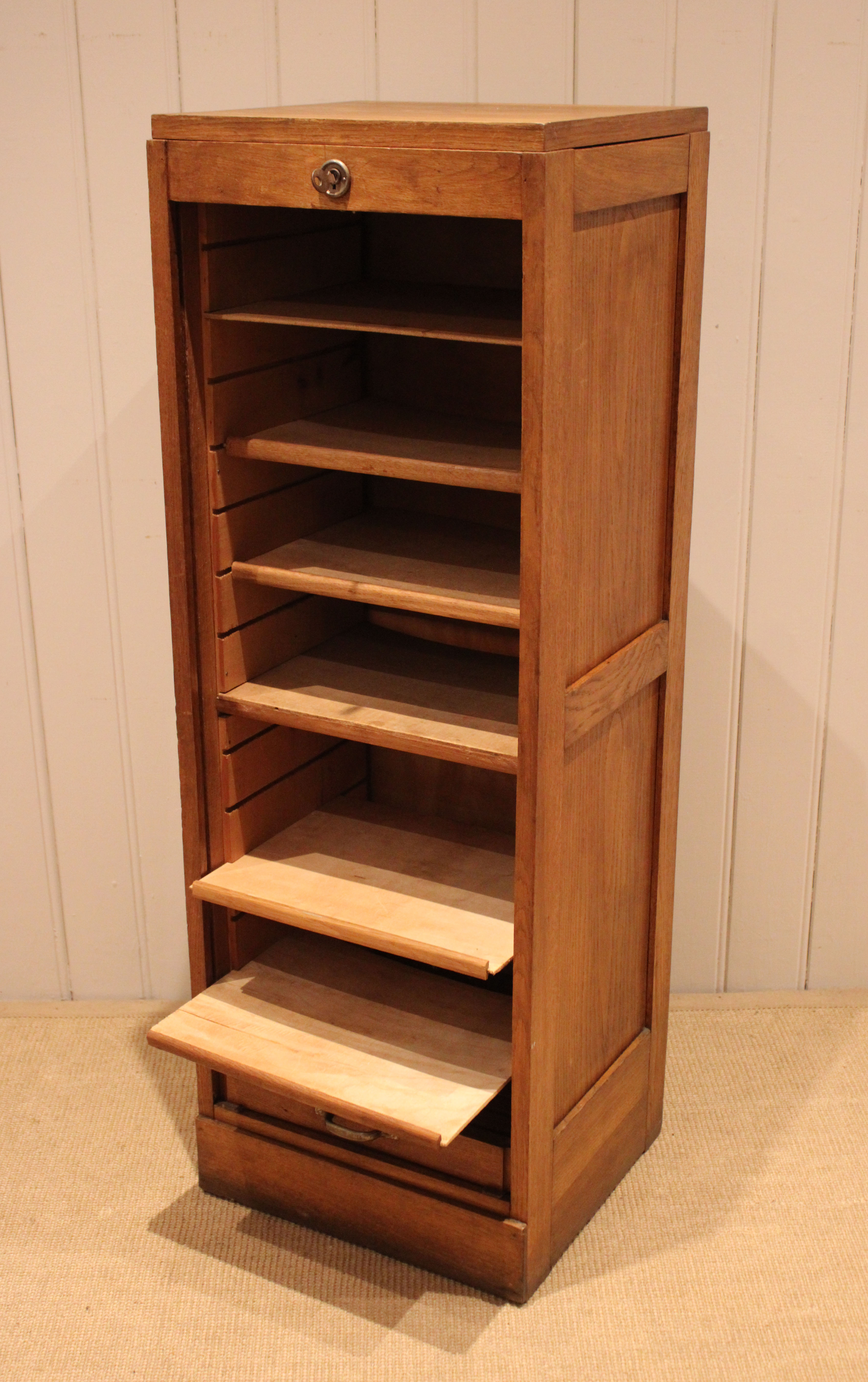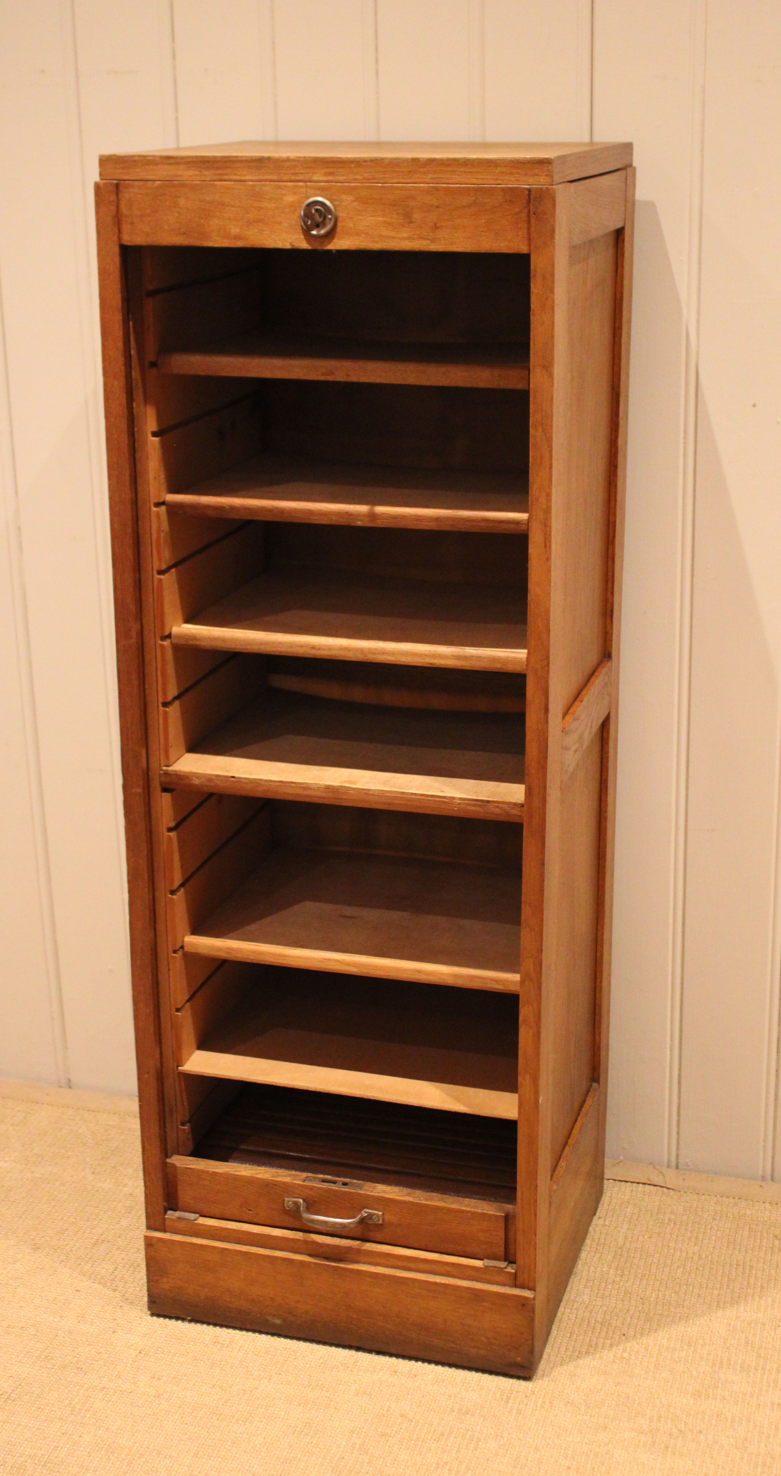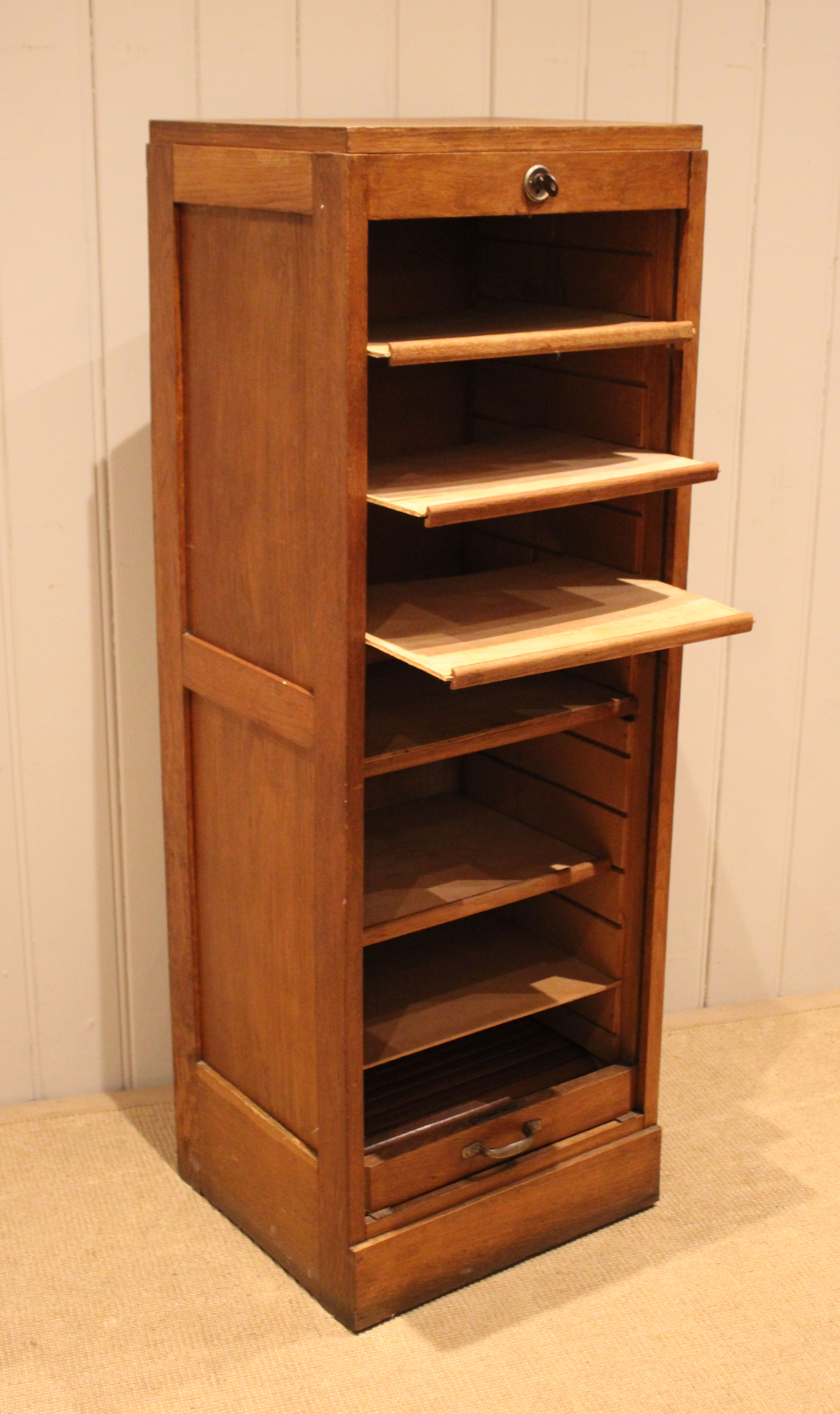 French oak single tambour front filing cabinet having six slide out plywood shelves , five of which can be removed , the middle shelf is fixed , raised on a plinth base , complete with lock & key . The shelves are 30cm deep and 35.5 cm wide .