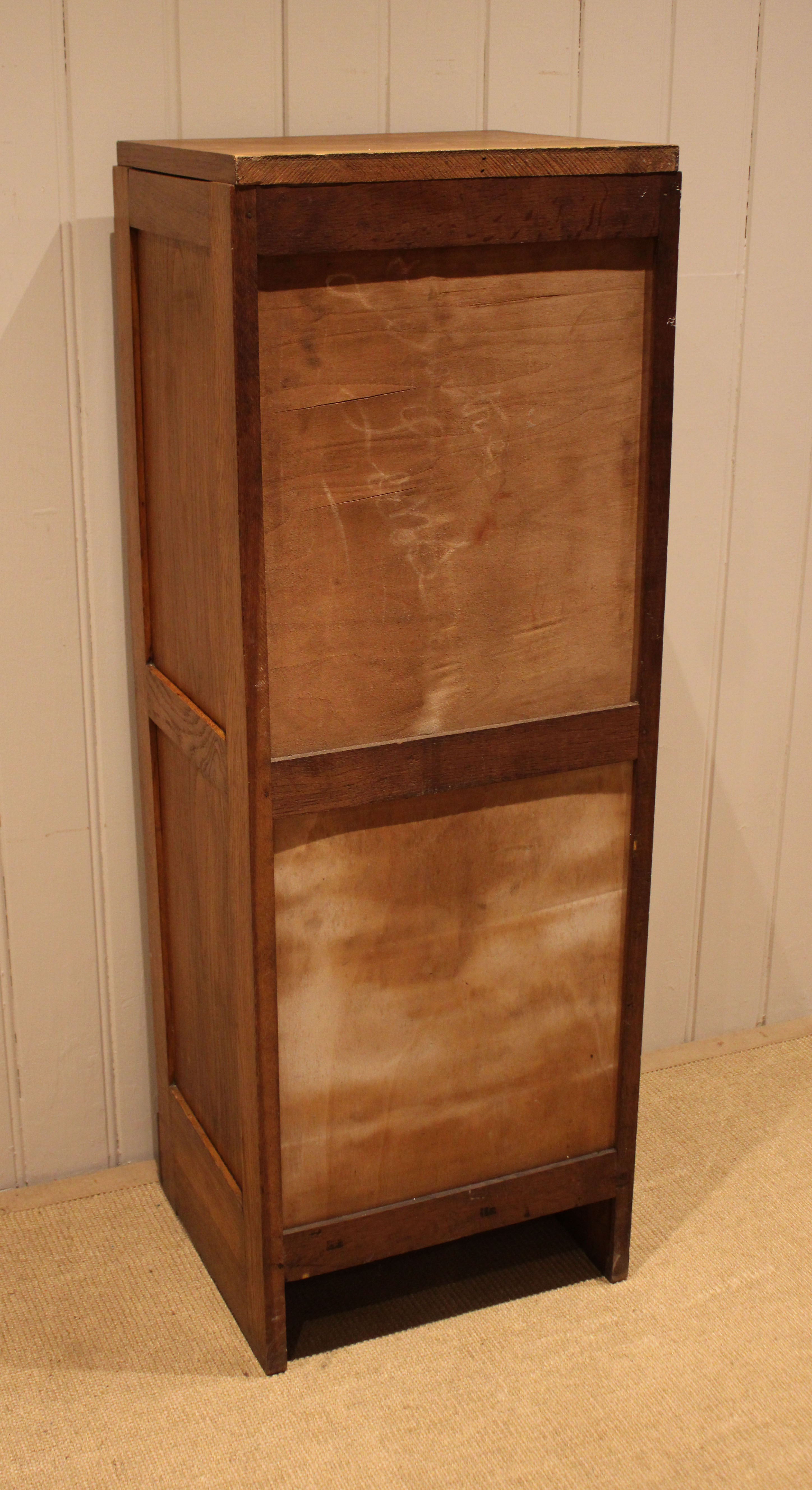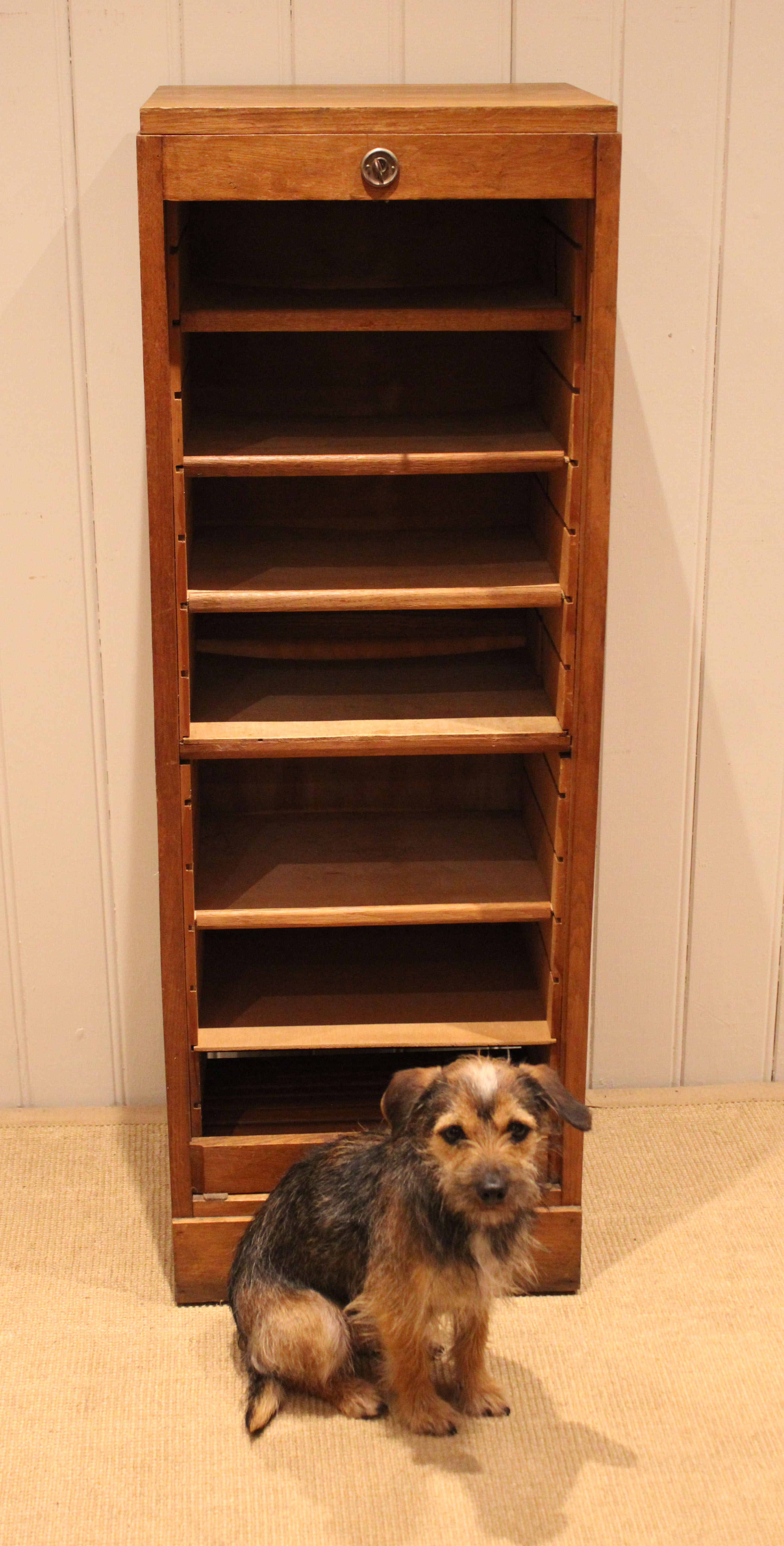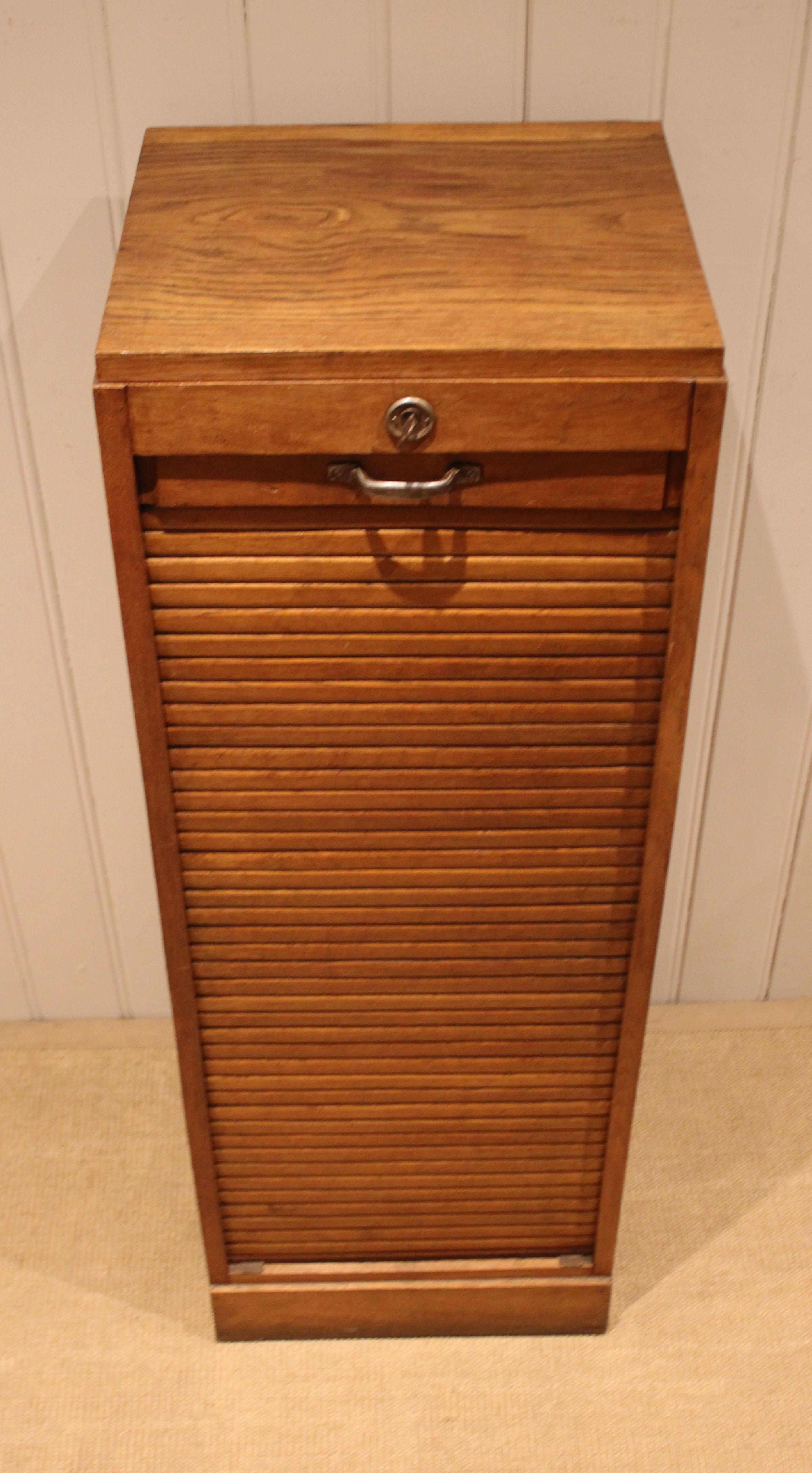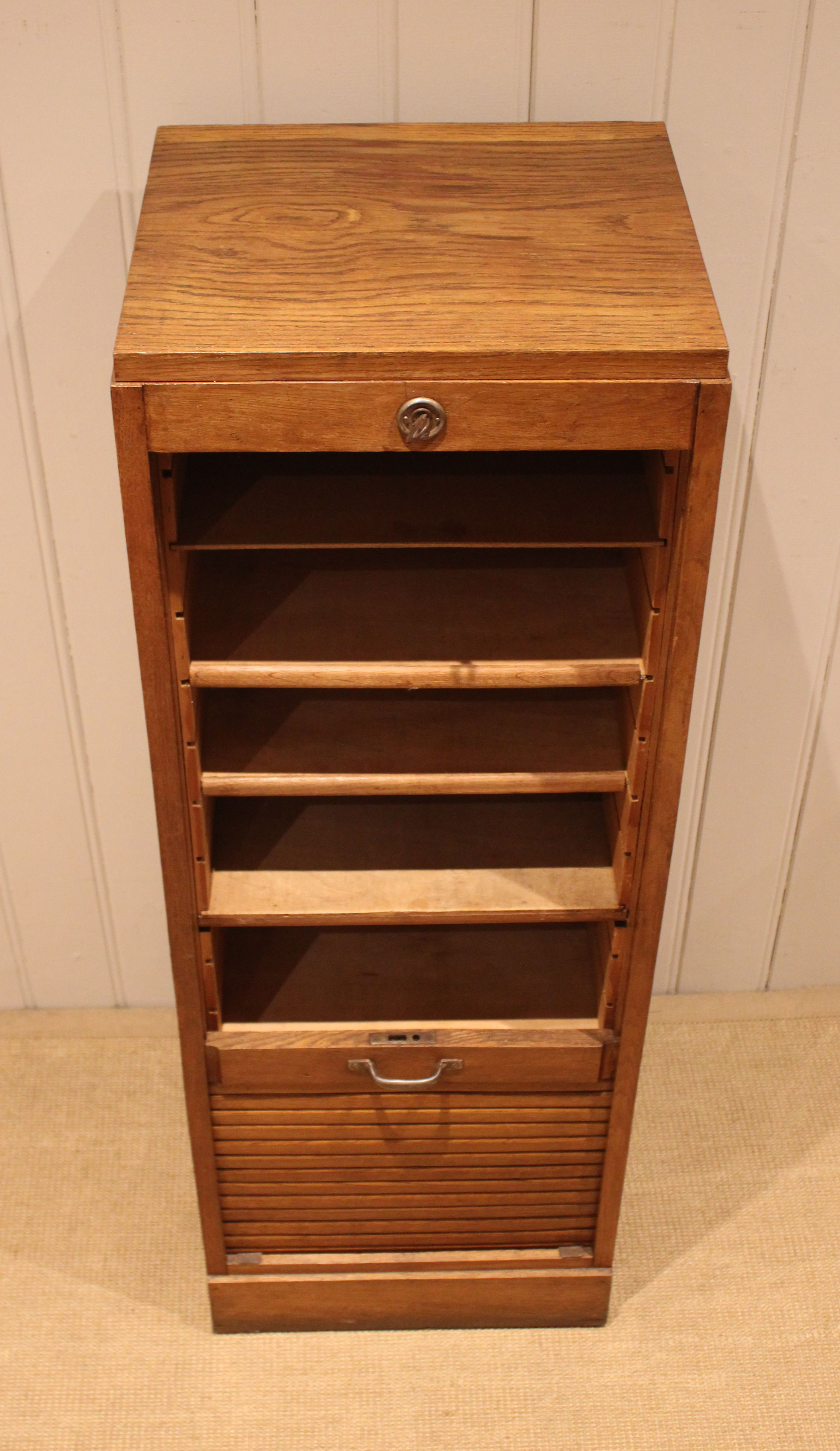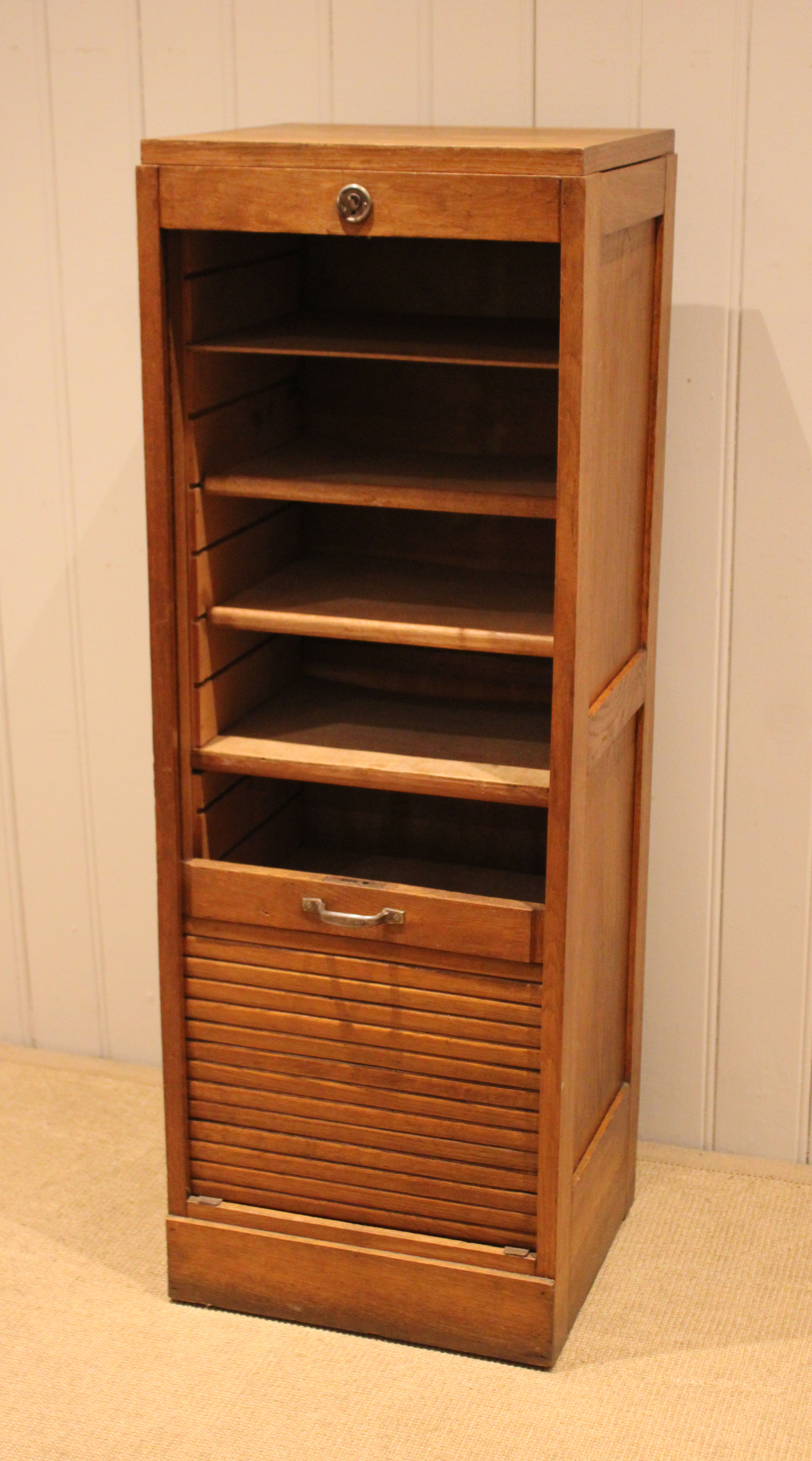 French oak single tambour front filing cabinet having six slide out plywood shelves , five of which can be removed , the middle shelf is fixed , raised on a plinth base , complete with lock & key . The shelves are 30cm deep and 35.5 cm wide .