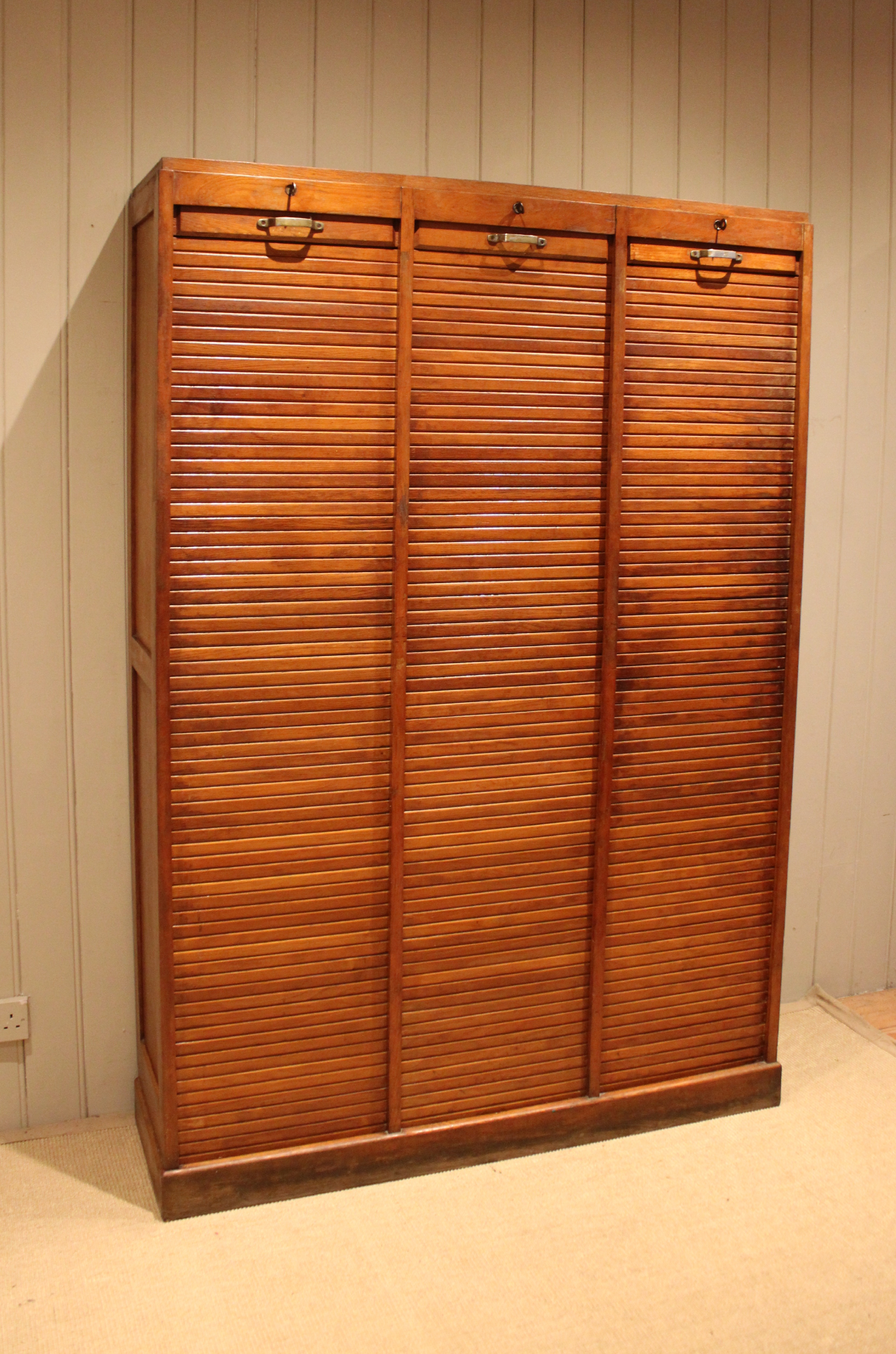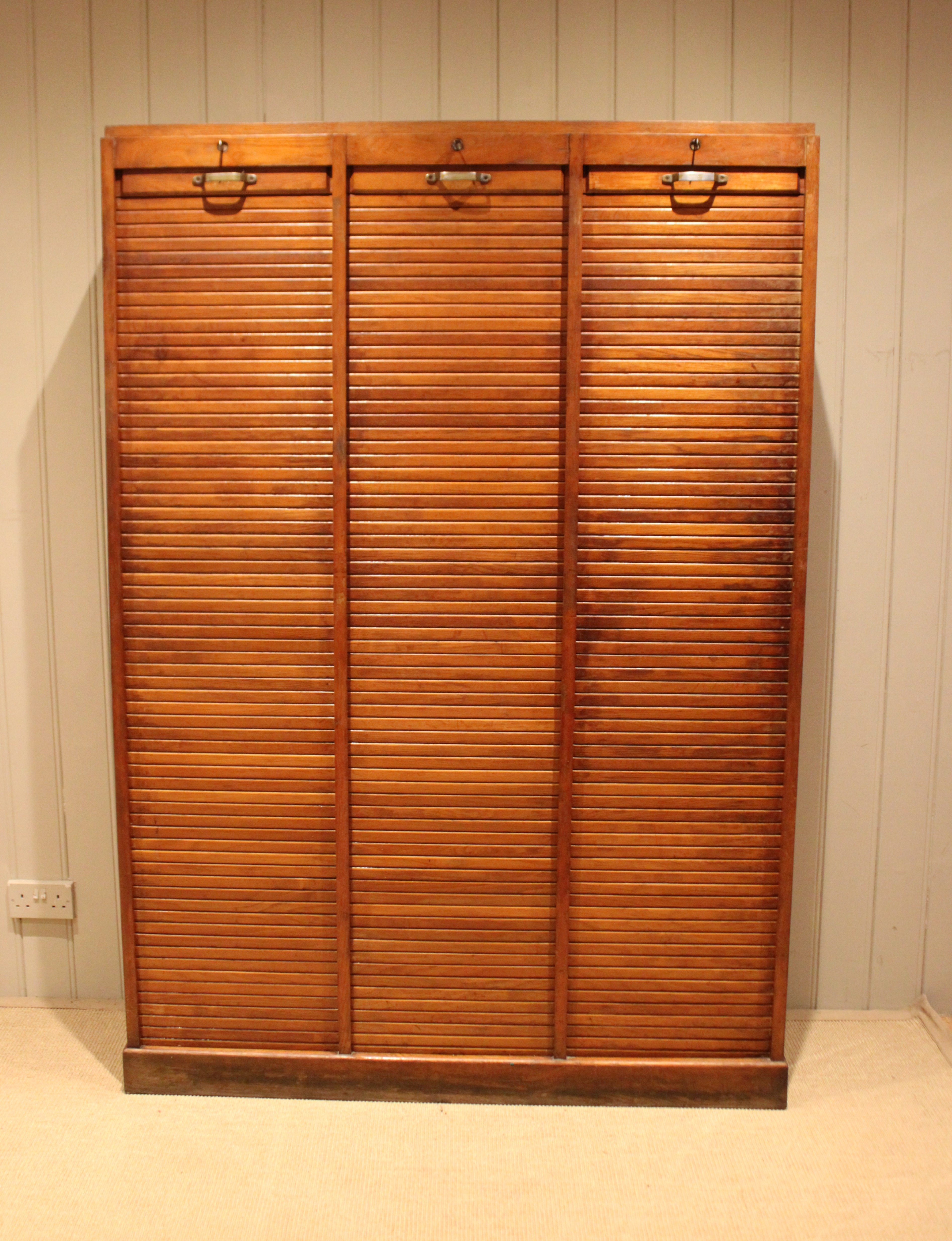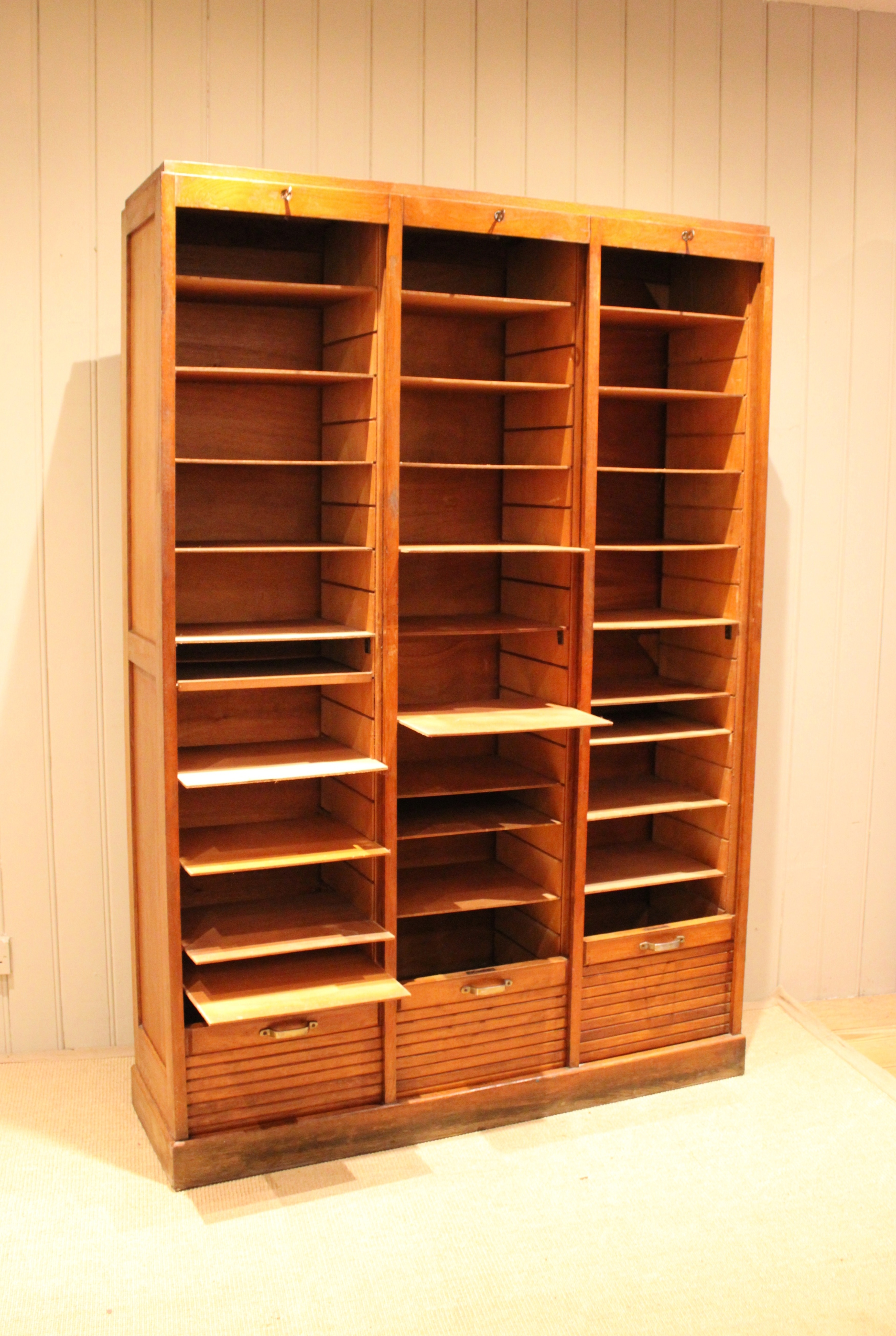 Early 20th century French oak filing cabinet having triple tambour front , all with keys and slide well , each section has 9 slide out plywood shelves , raised on a plinth base .