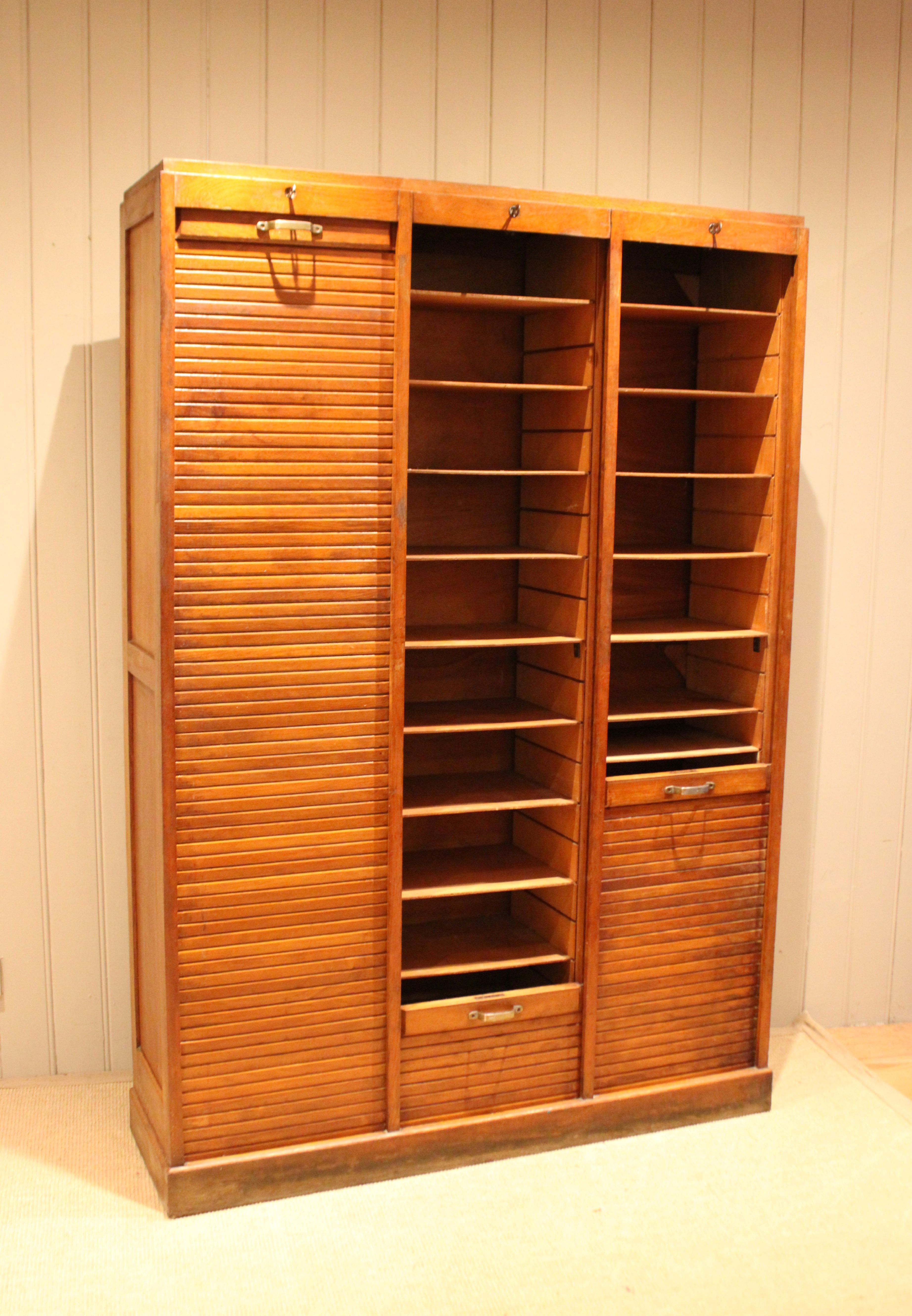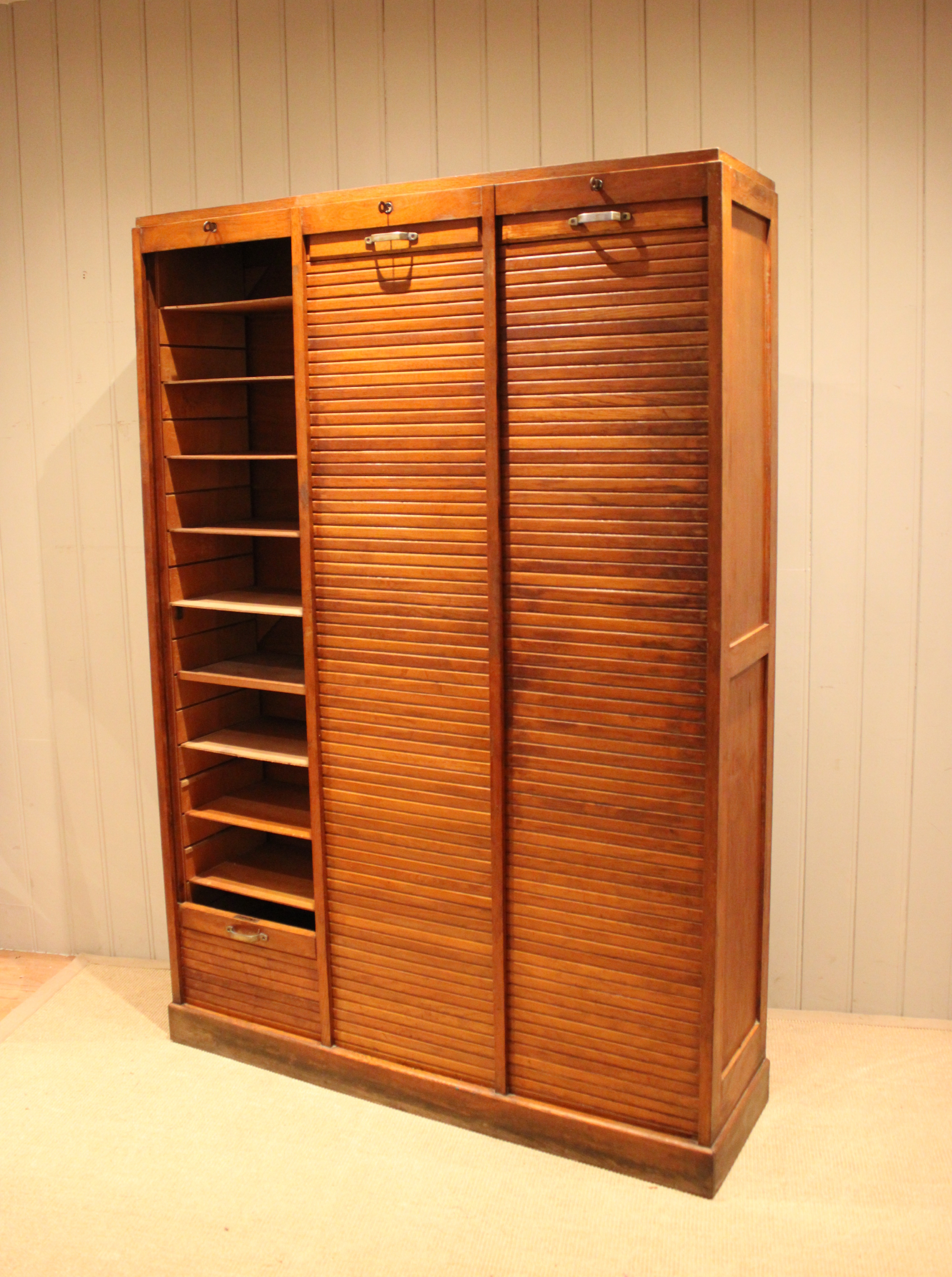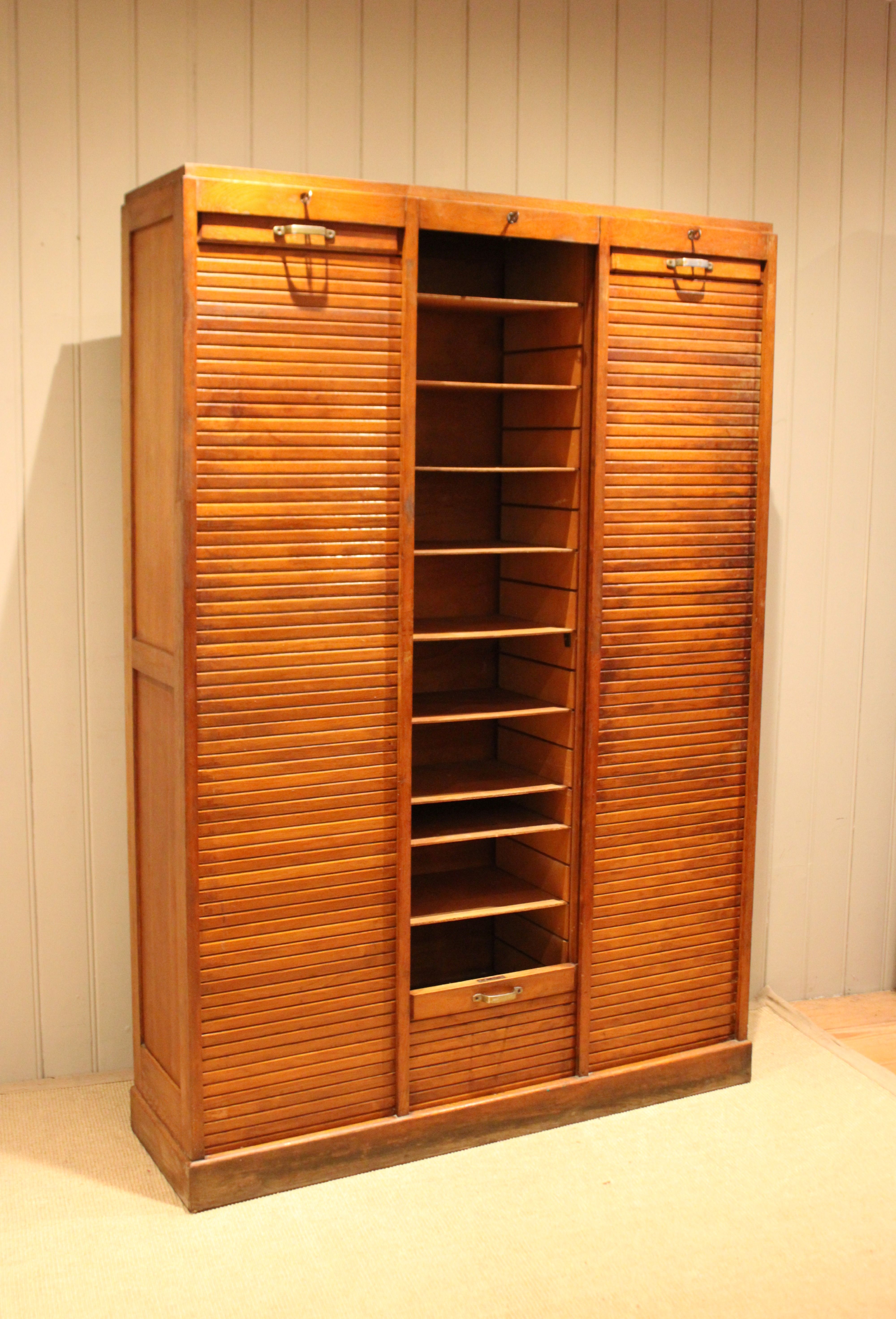 Early 20th century French oak filing cabinet having triple tambour front , all with keys and slide well , each section has 9 slide out plywood shelves , raised on a plinth base .