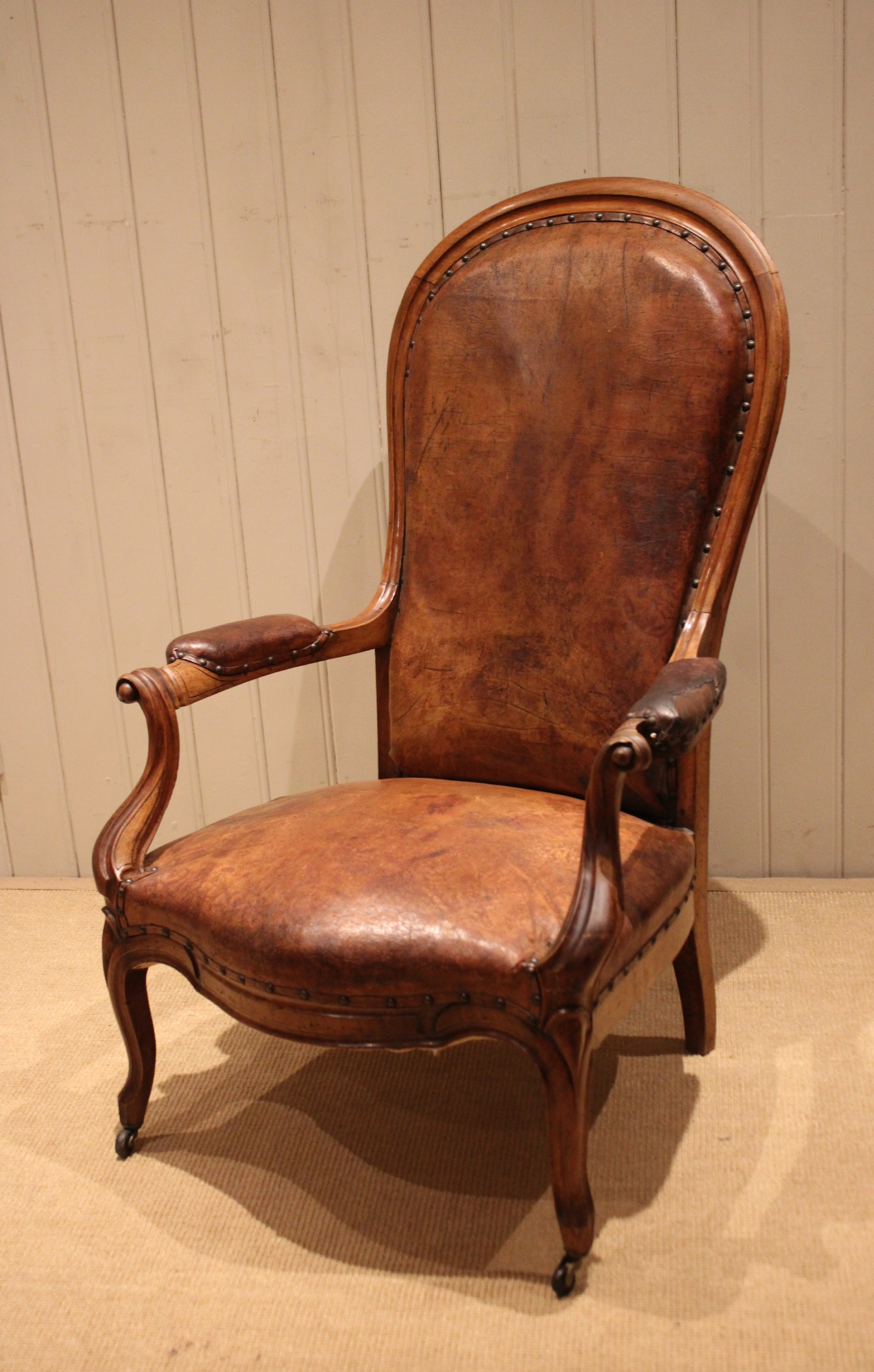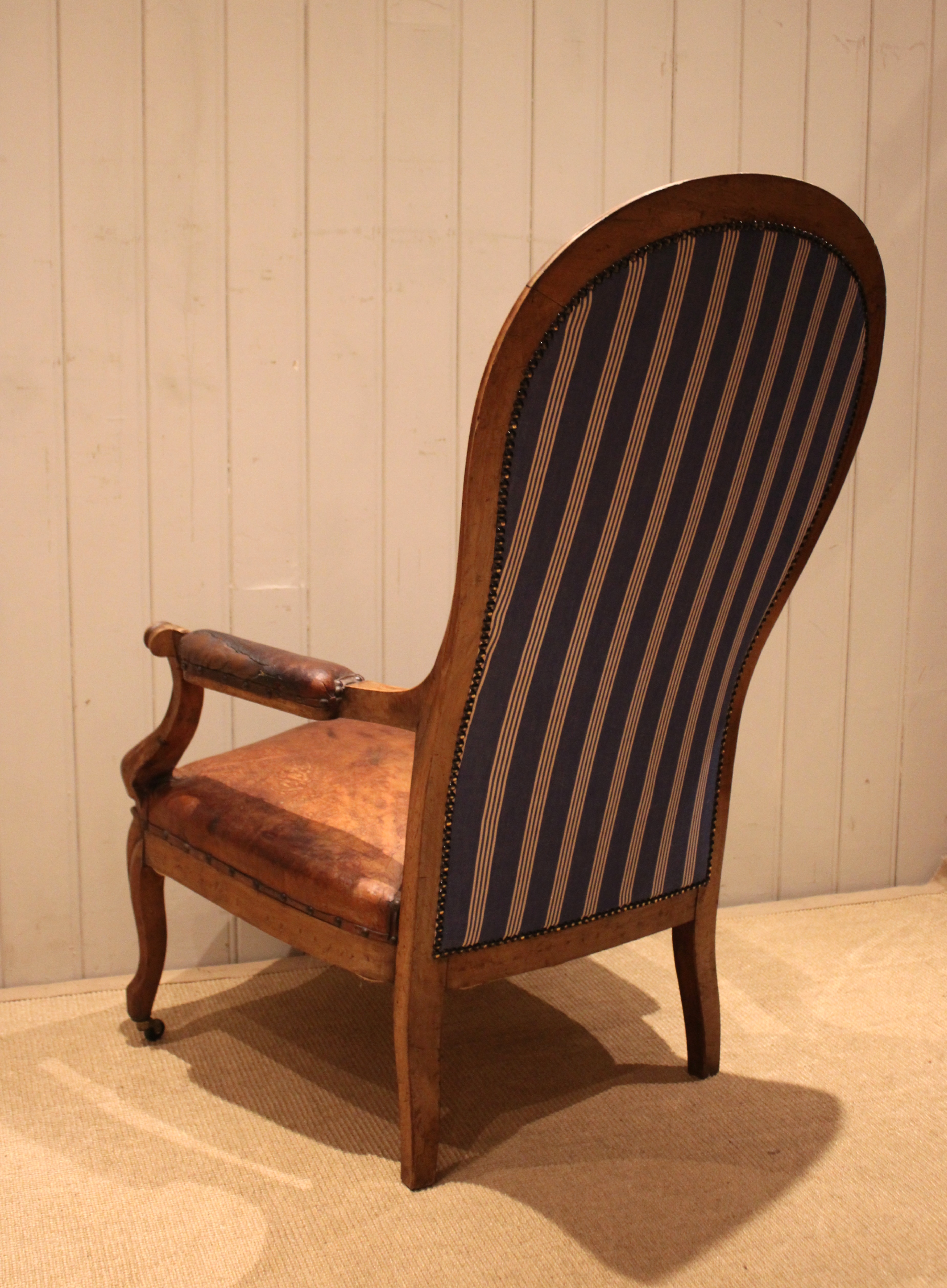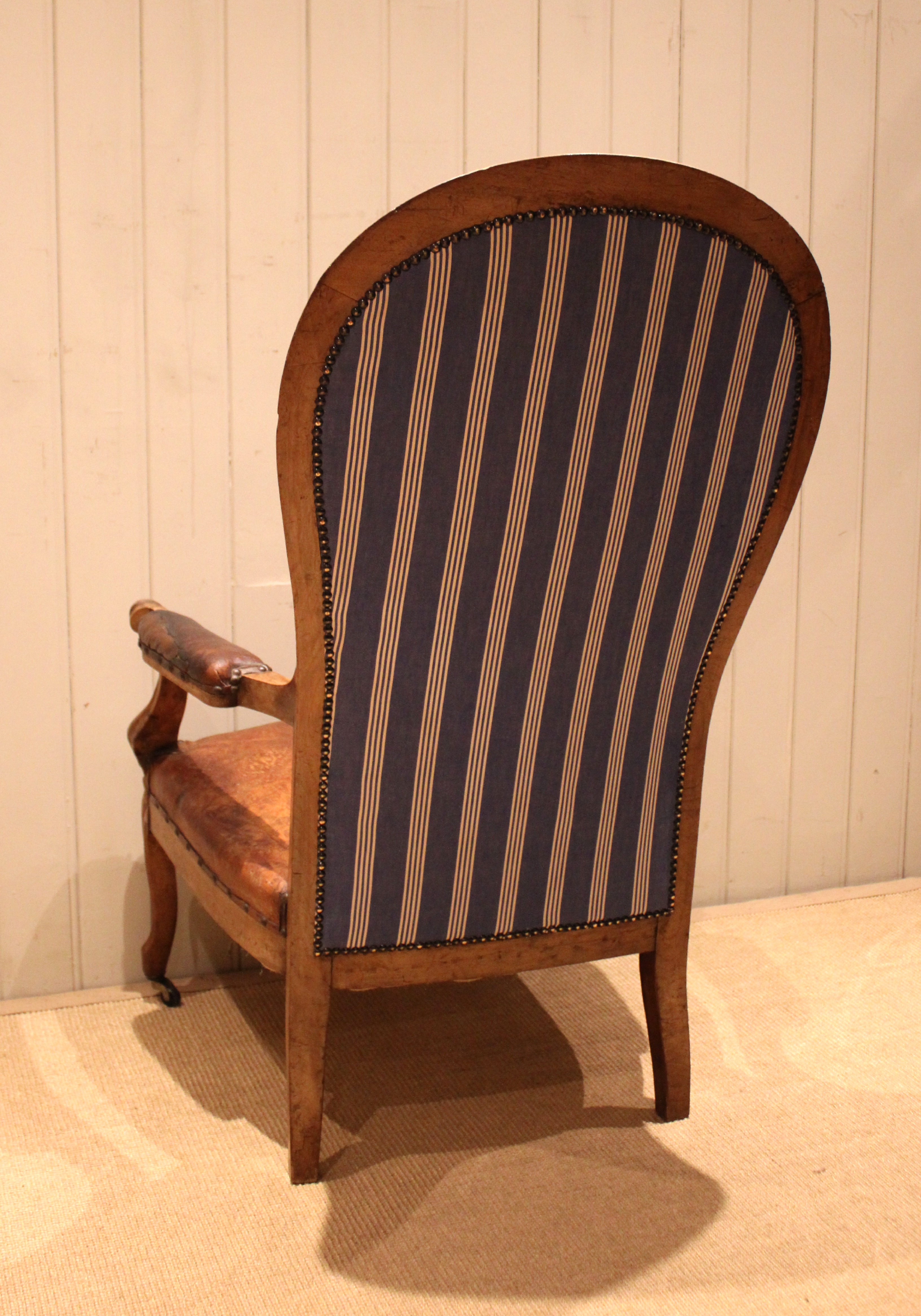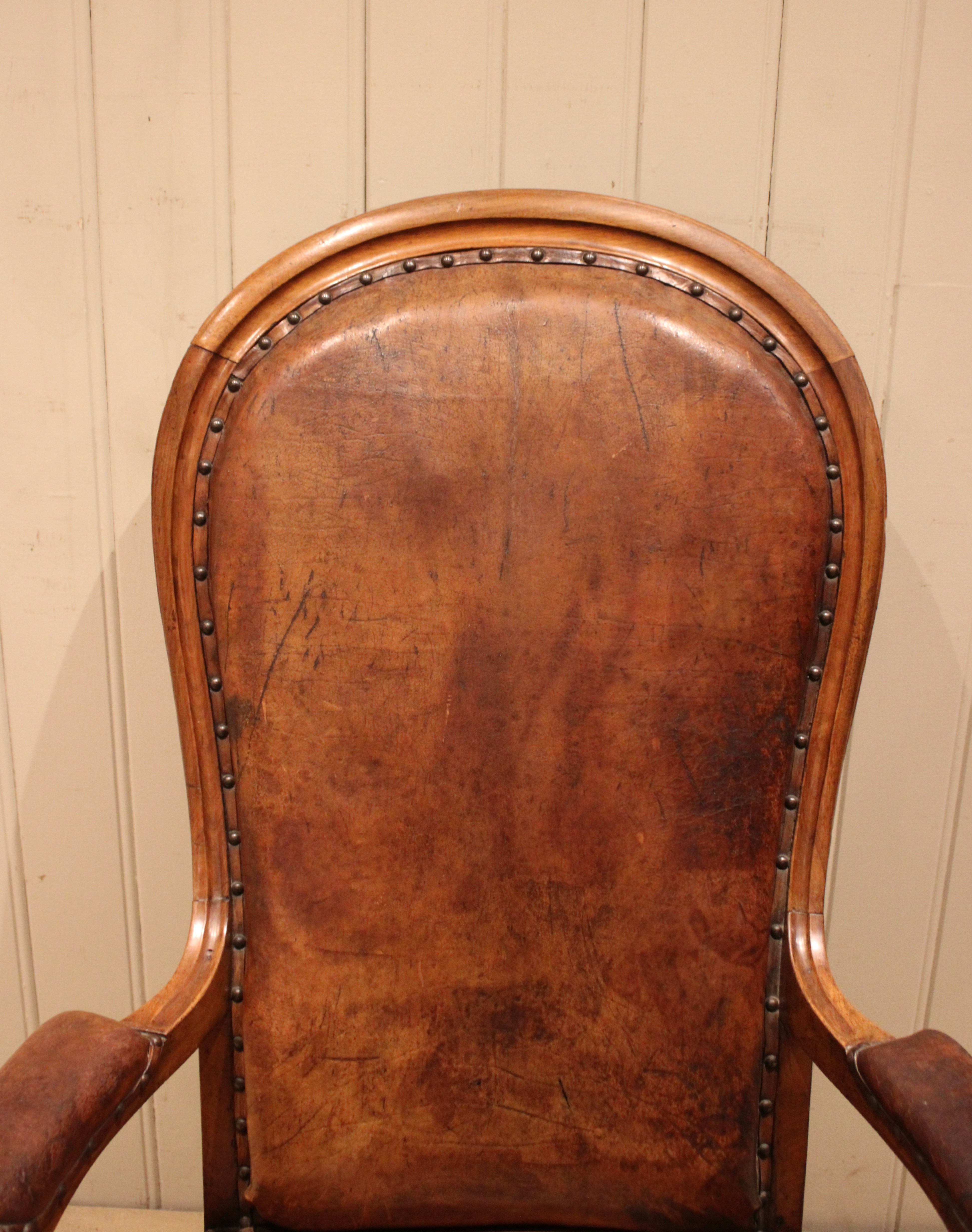 French walnut framed balloon back chair having the original distressed leather upholstery , with a contrasting stripe back , raised on front cabriole legs with castors .