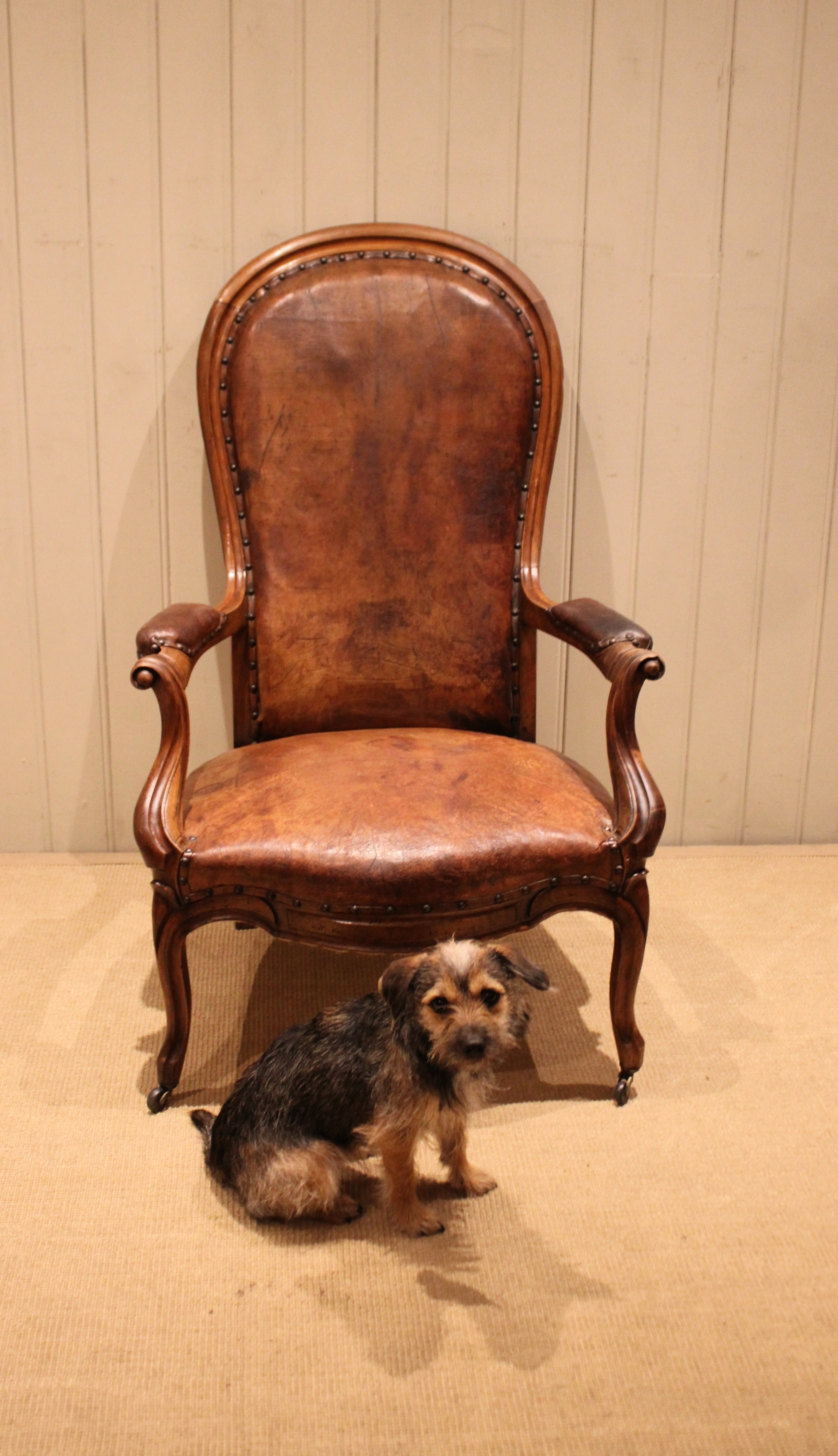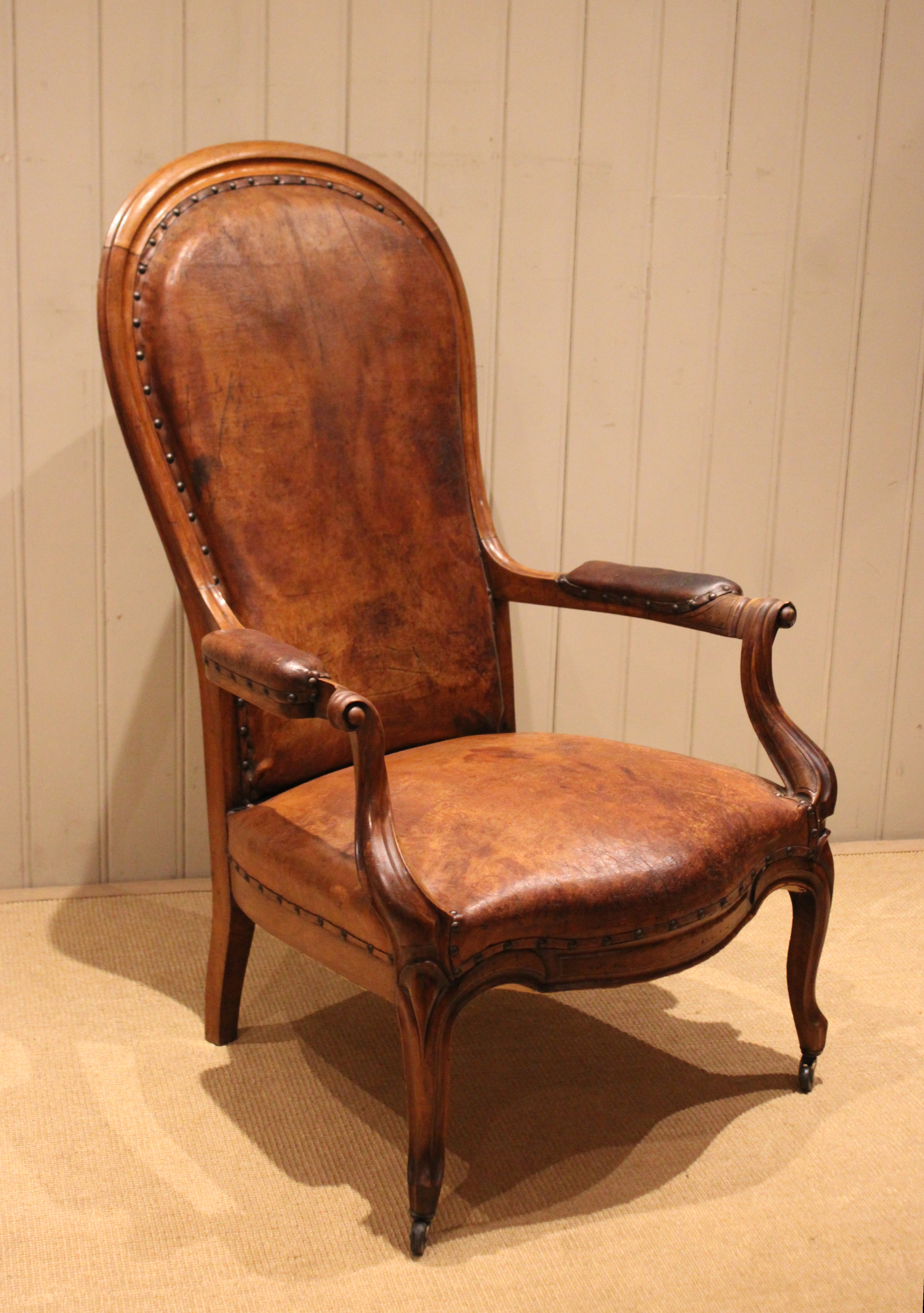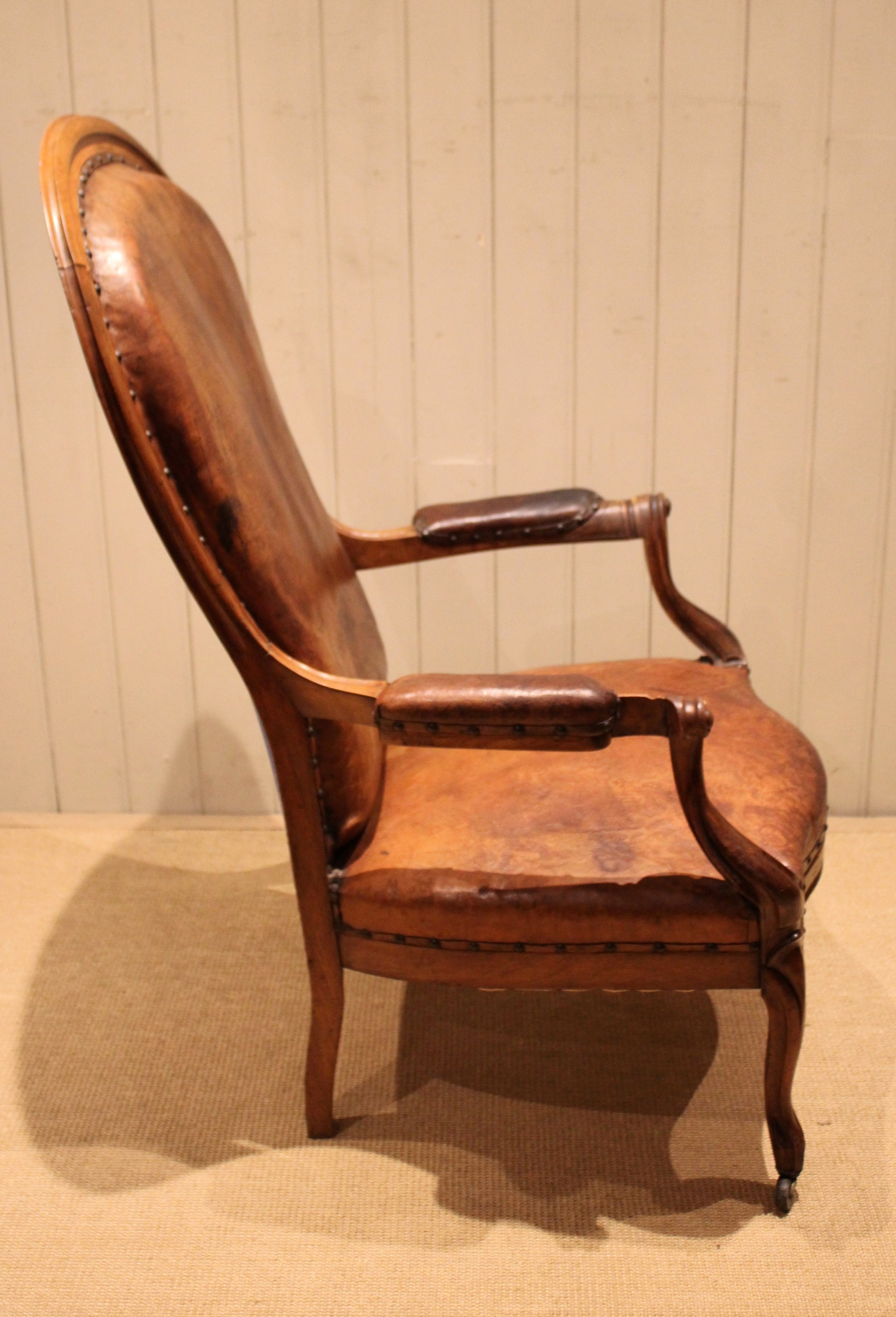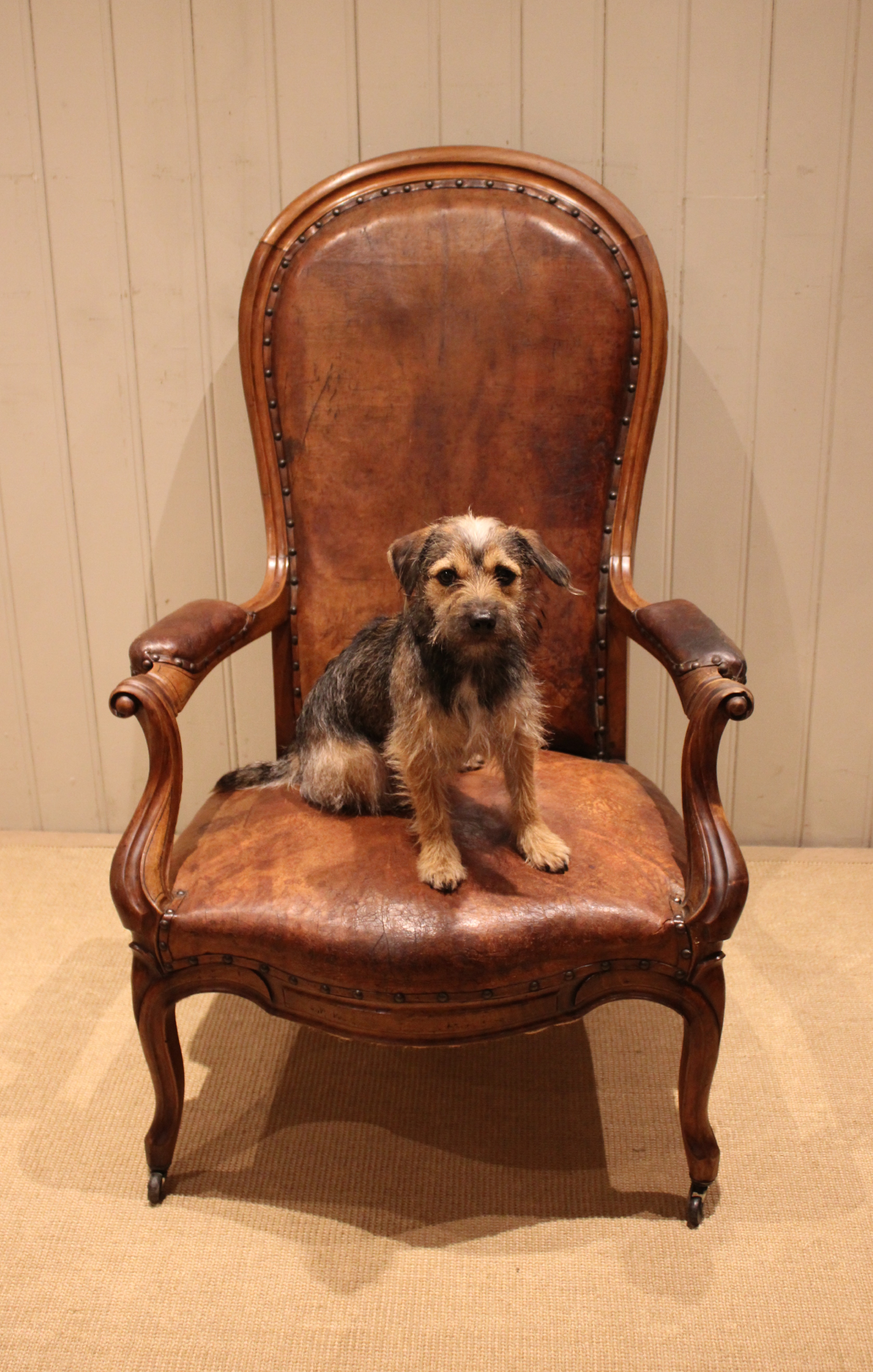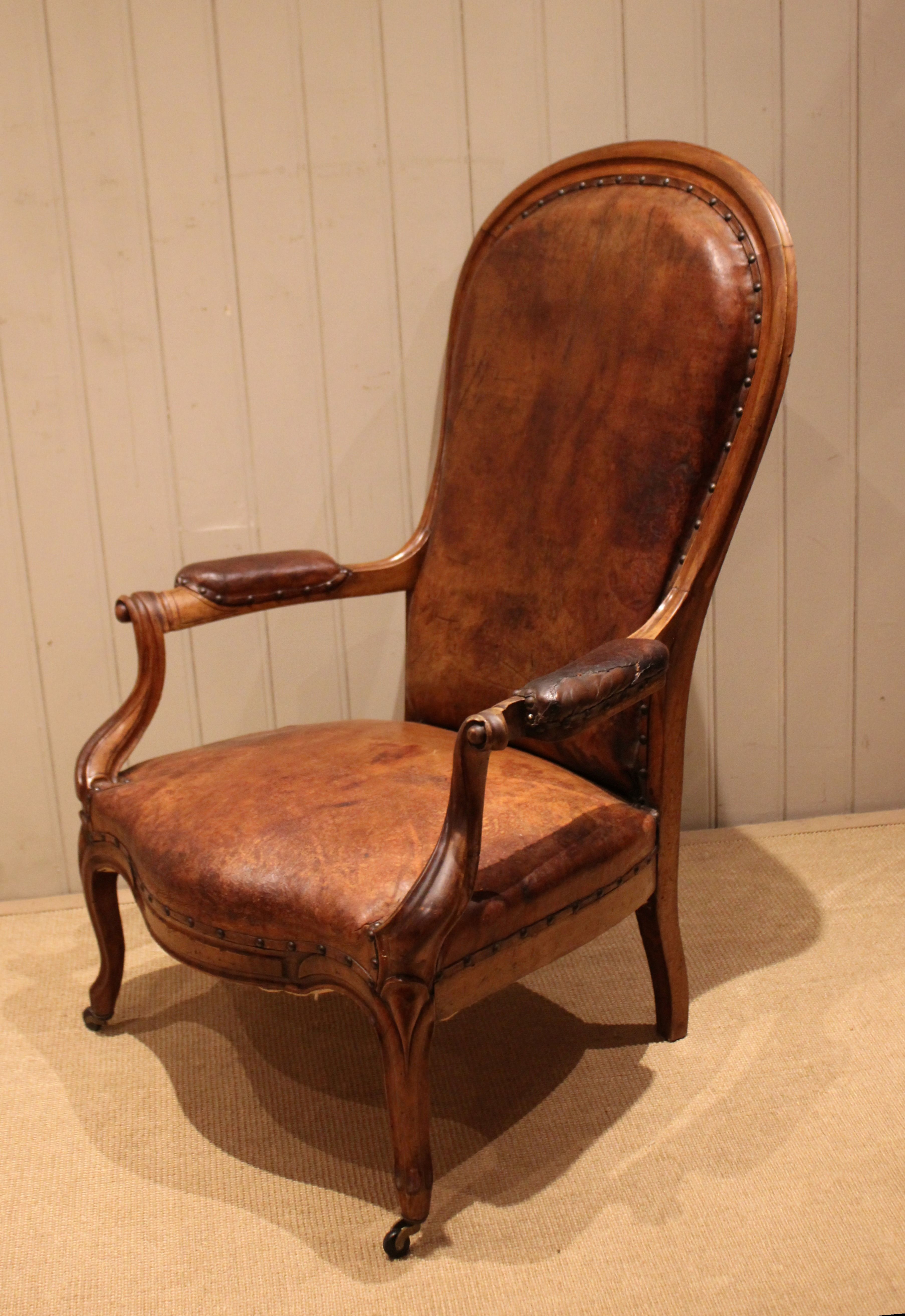 French walnut framed balloon back chair having the original distressed leather upholstery , with a contrasting stripe back , raised on front cabriole legs with castors .