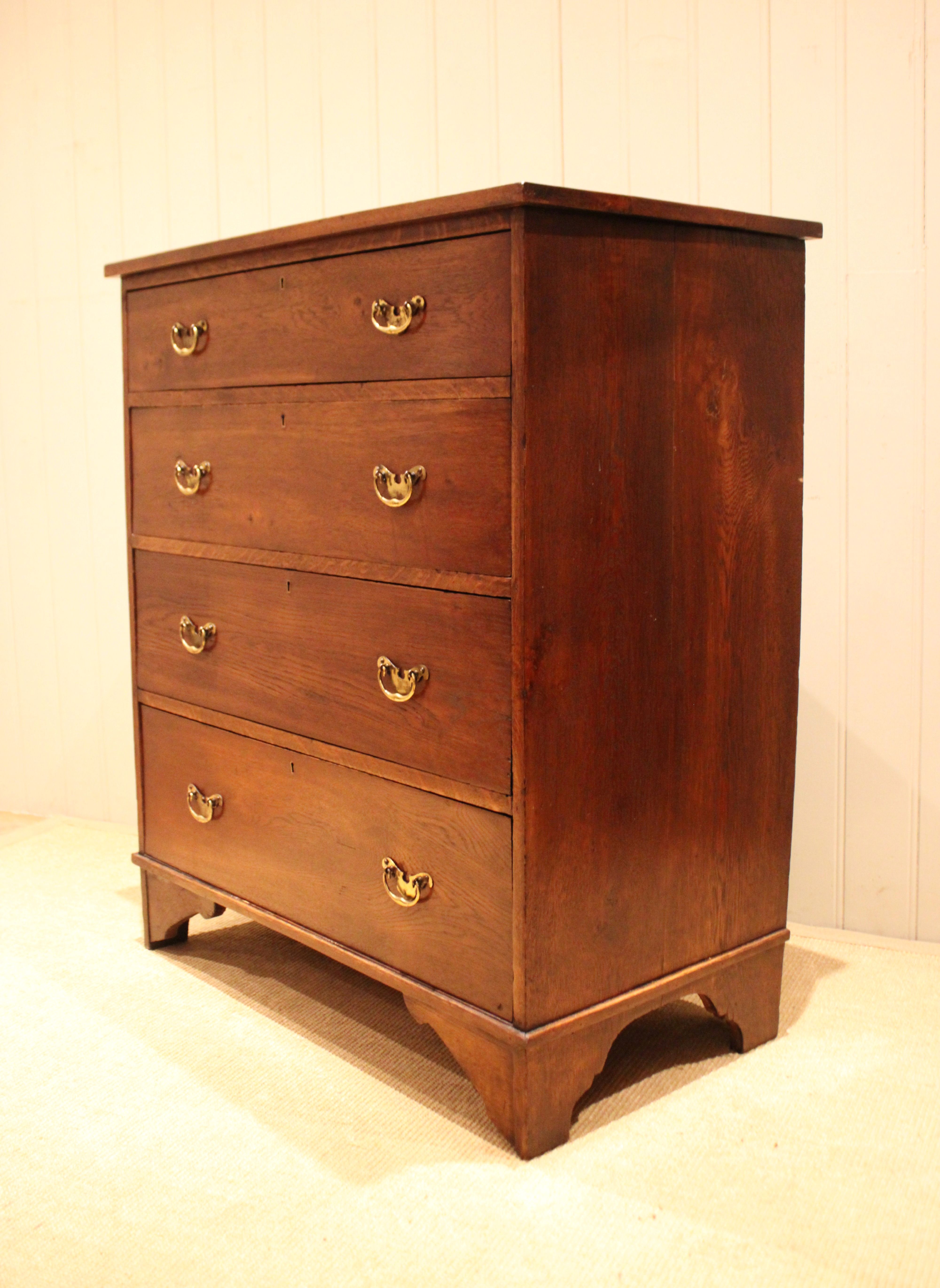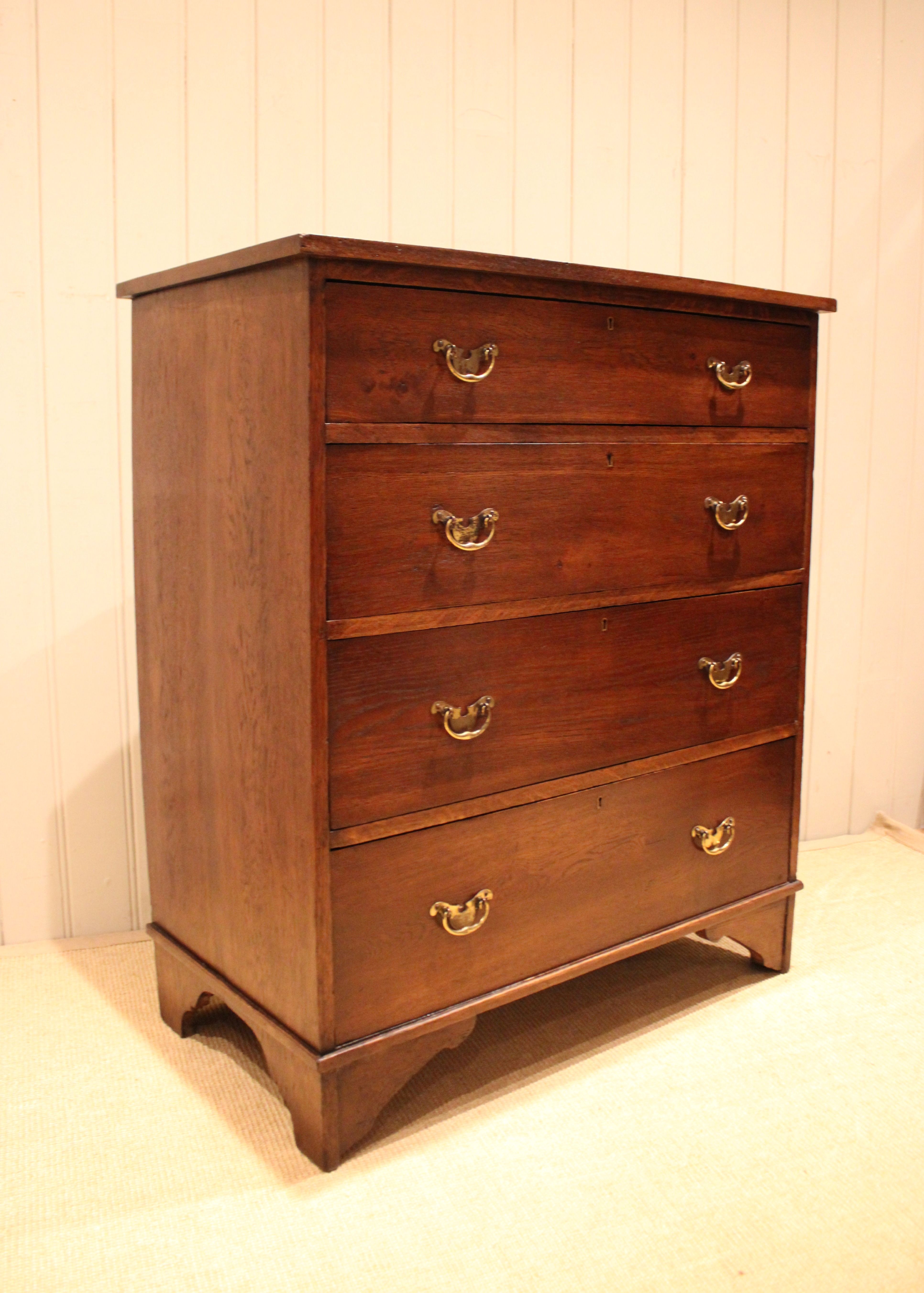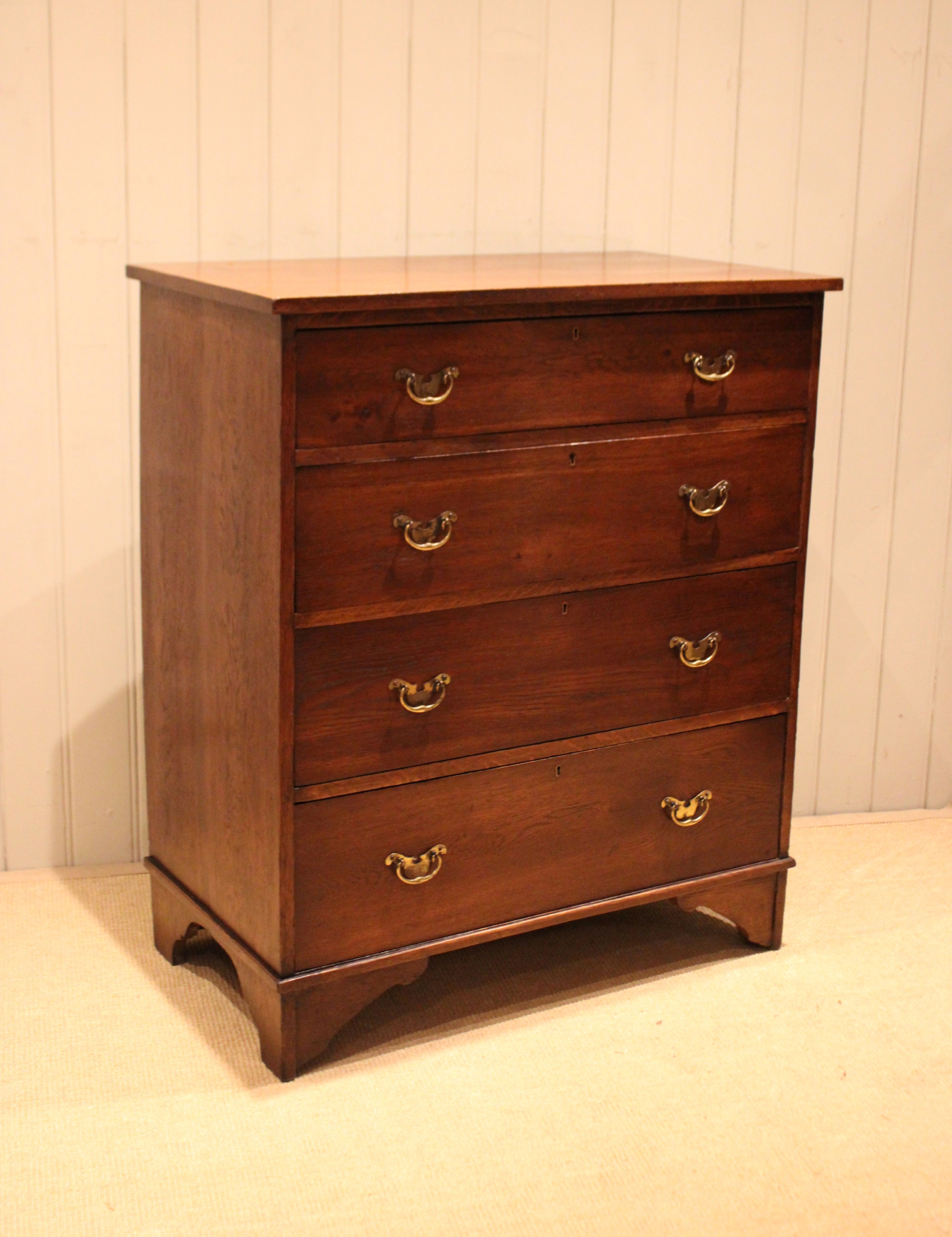 Large oak chest of four drawers with brass handles , raised on bracket feet . The drawer depths are from the bottom up 22 cm deep , 19.5 cm deep , 17.5 cm deep and at the top 13 cm deep .