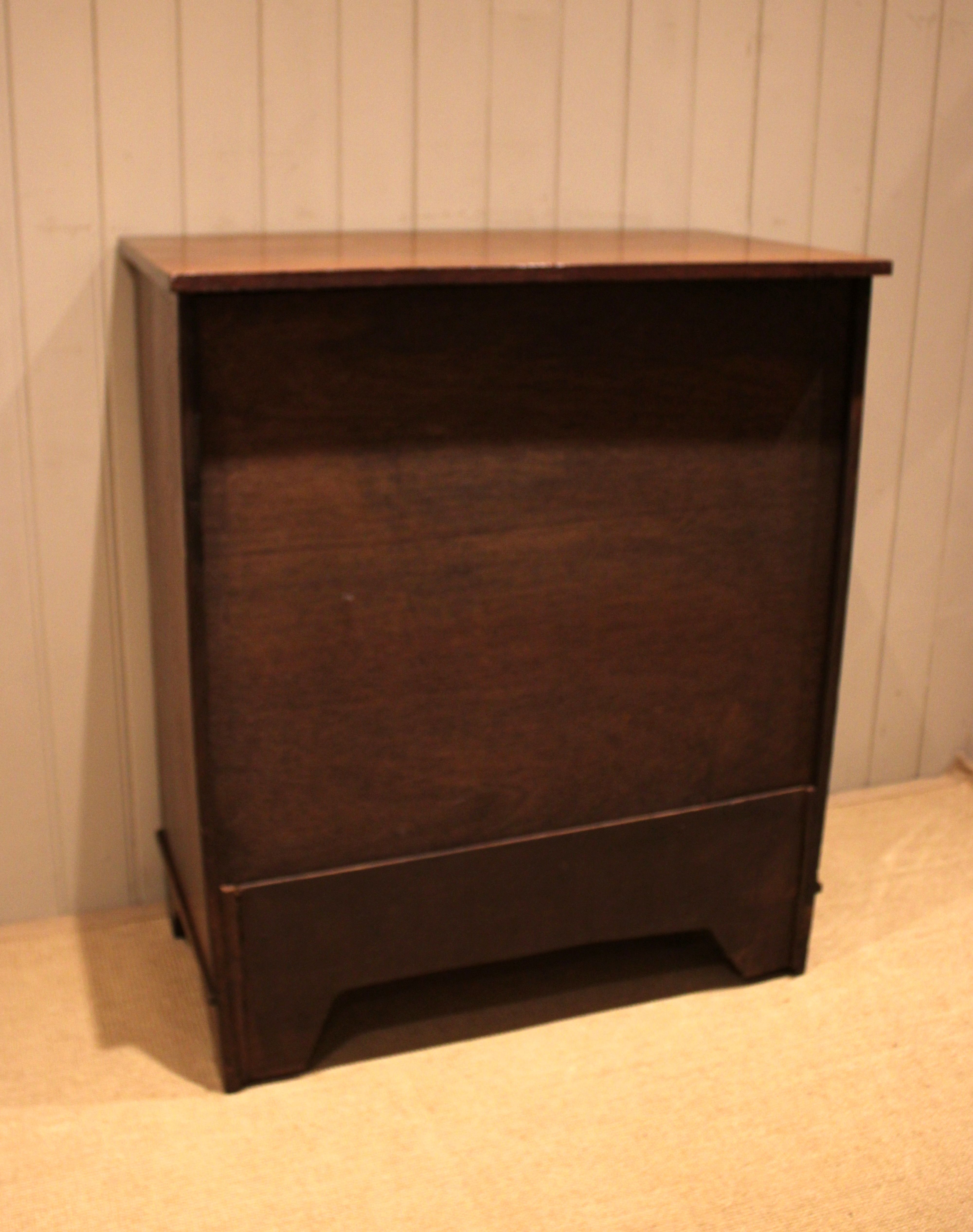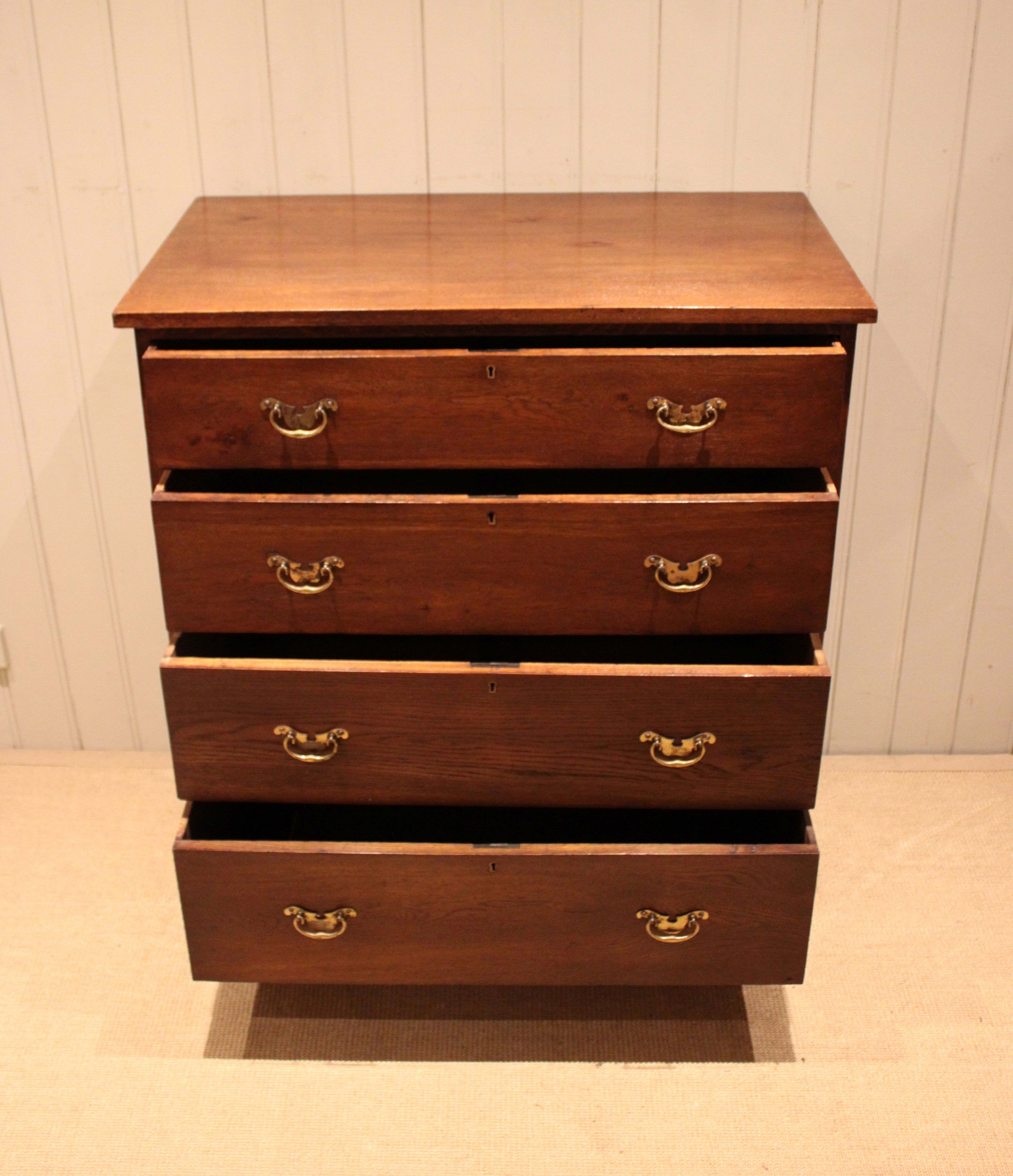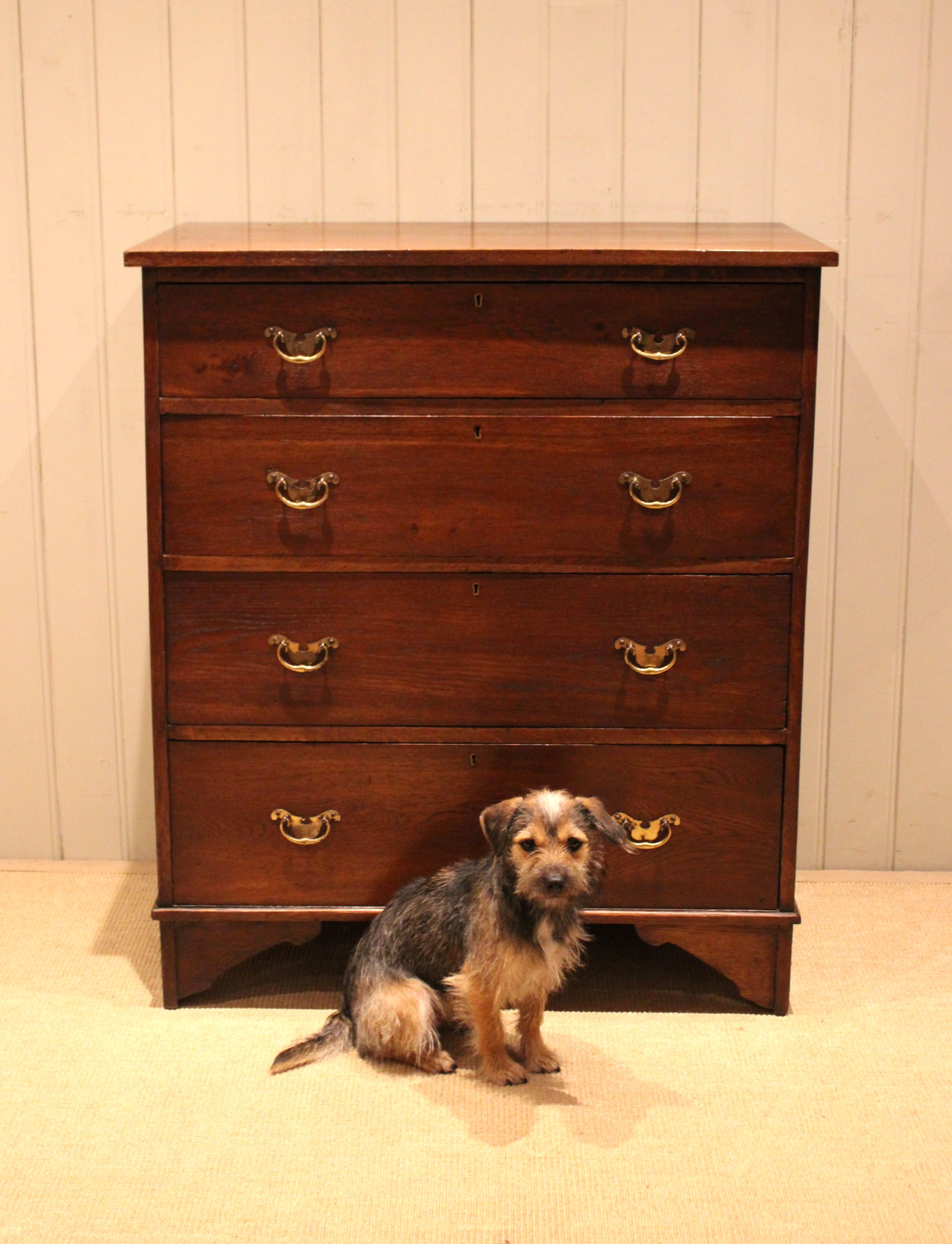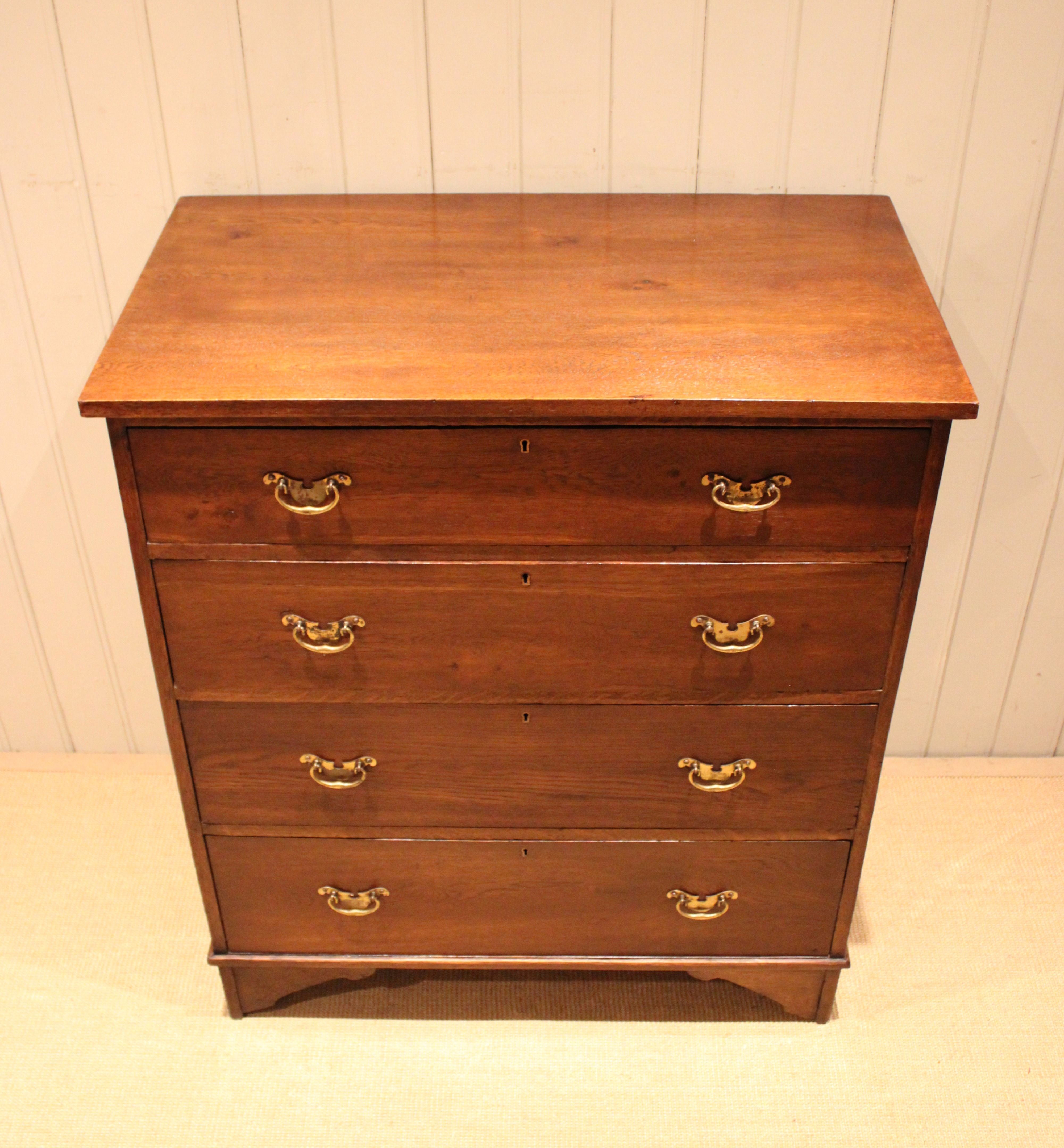 Large oak chest of four drawers with brass handles , raised on bracket feet . The drawer depths are from the bottom up 22 cm deep , 19.5 cm deep , 17.5 cm deep and at the top 13 cm deep .