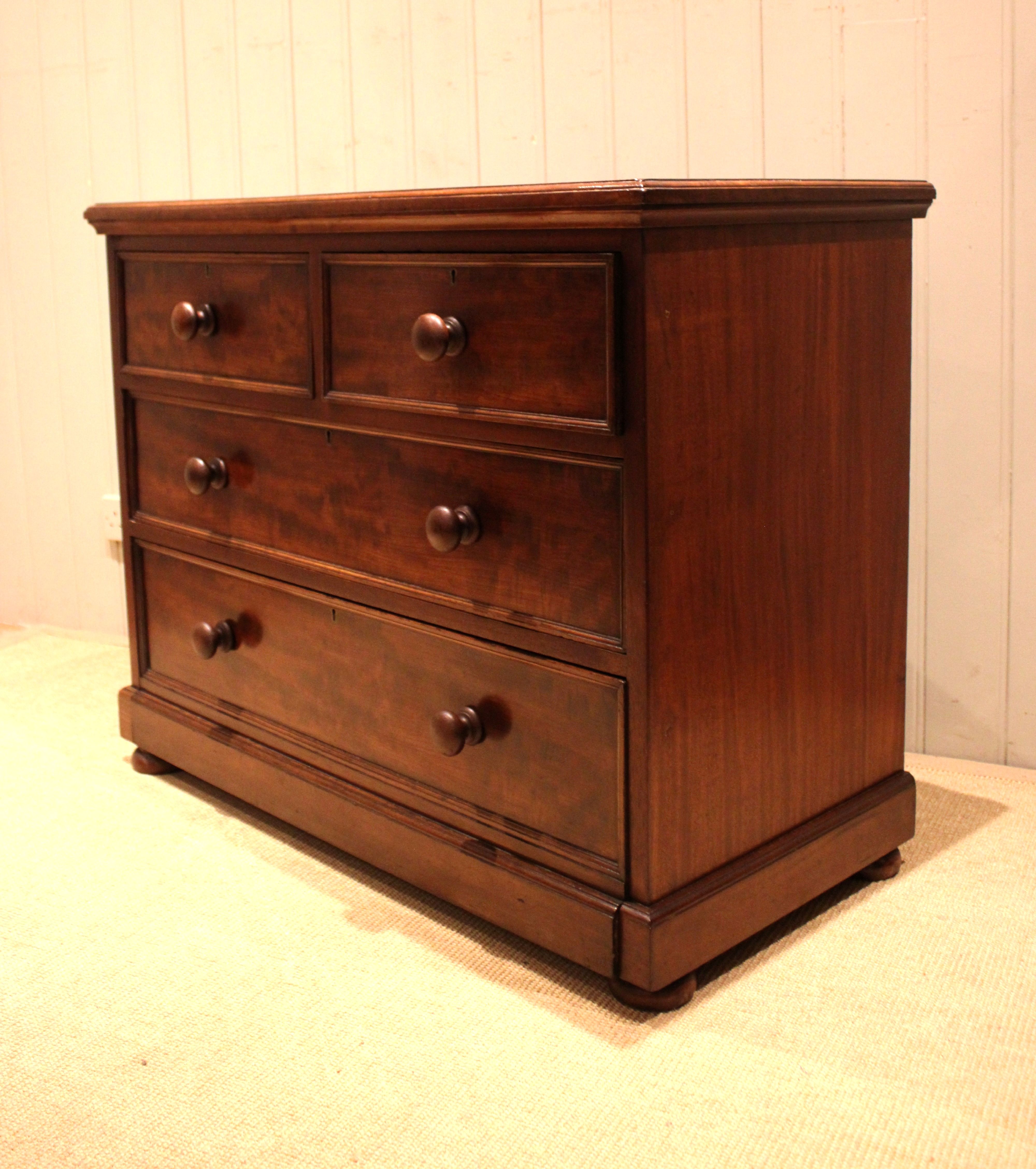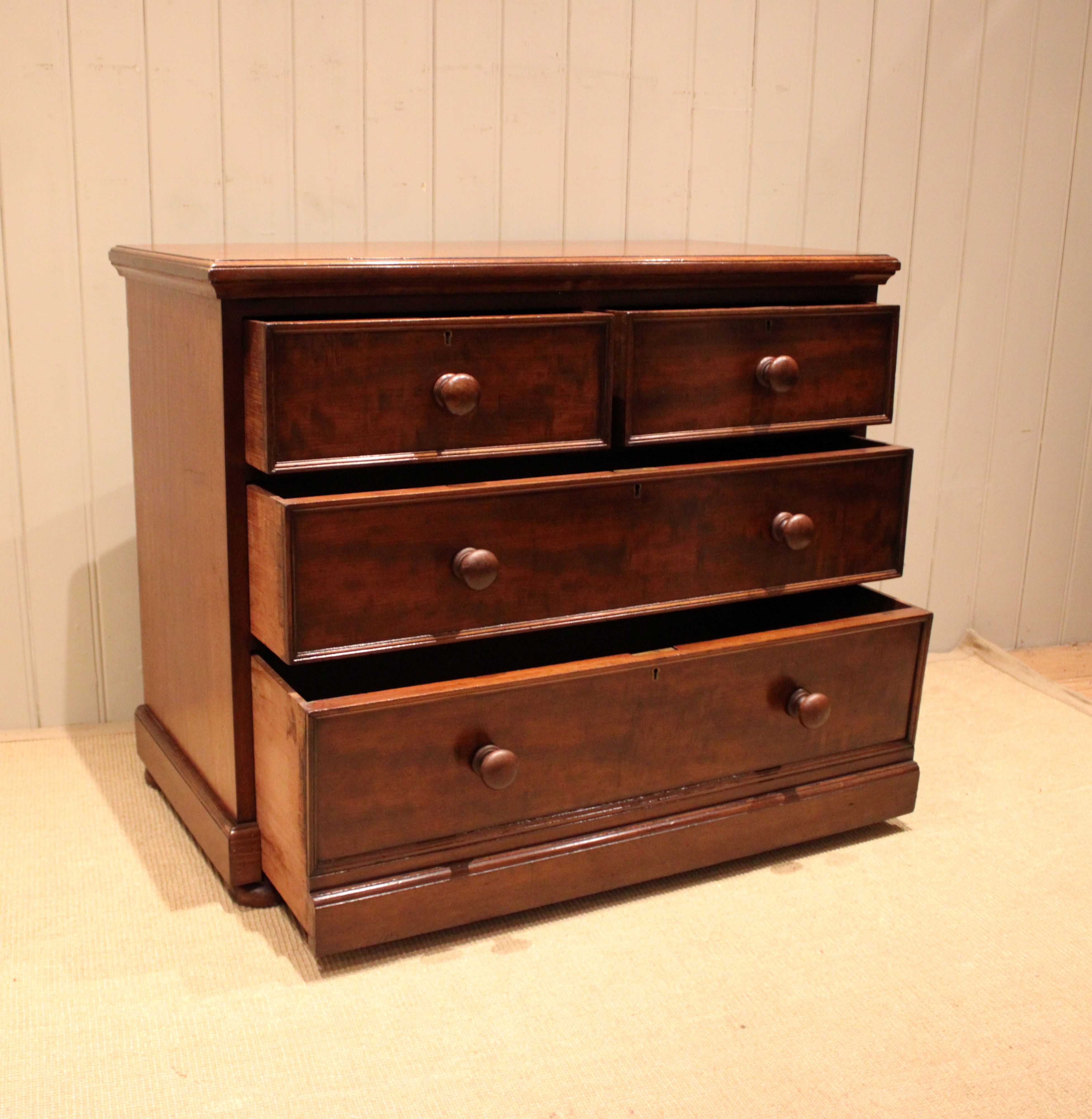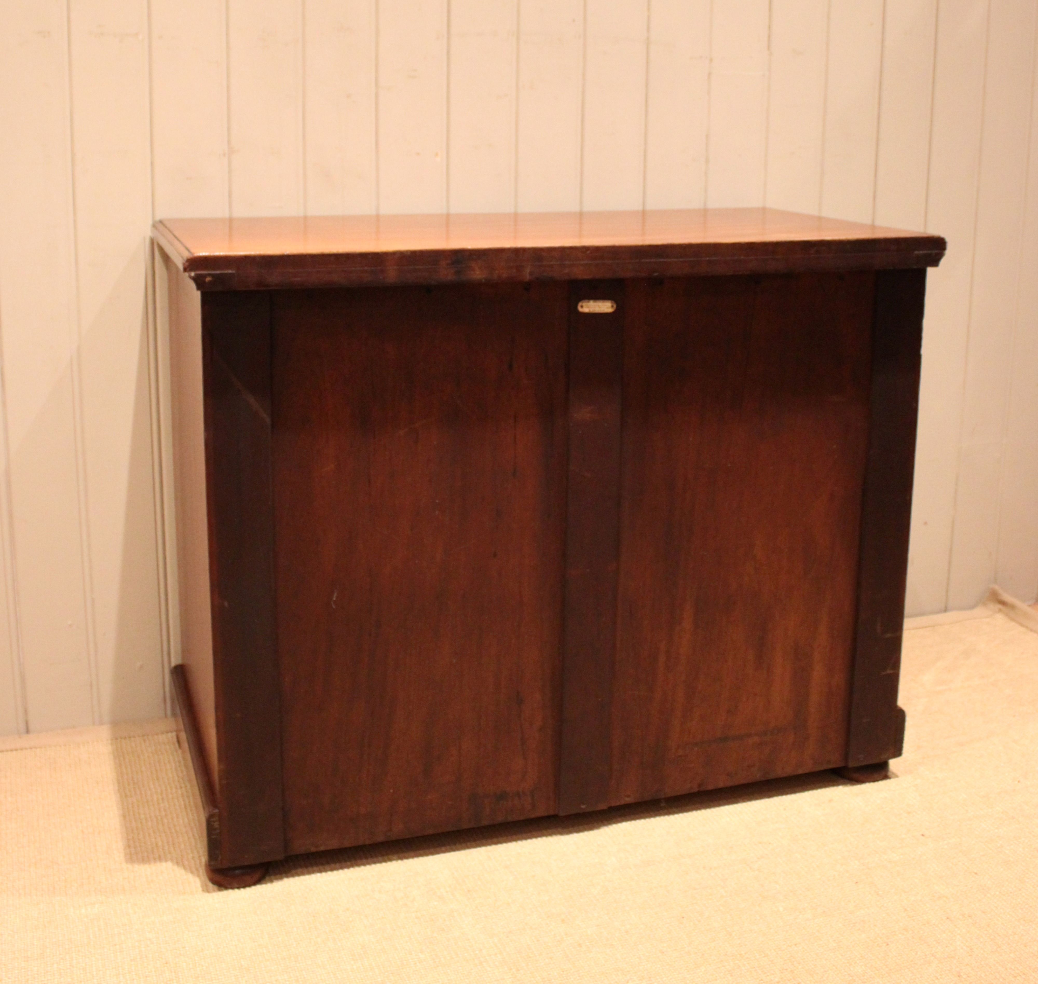 Late 19th century solid mahogany low chest of two short and two long drawers with turned wooden handles , raised on a plinth base . The drawer depths are from the bottom up 26.6 cm deep , 17 cm deep and at the top 15 cm deep . Still bearing the original makers label of James Shoolbred London