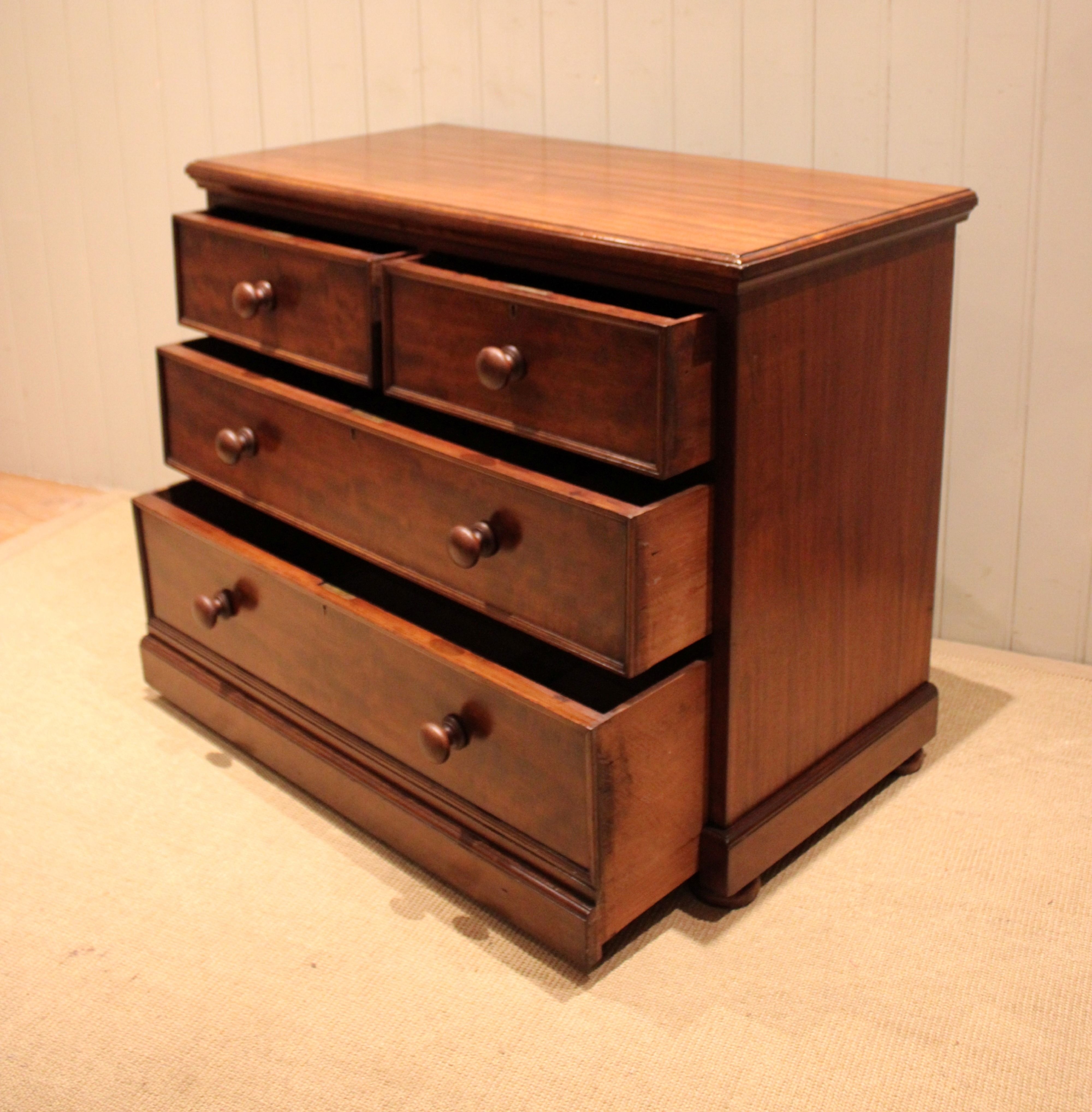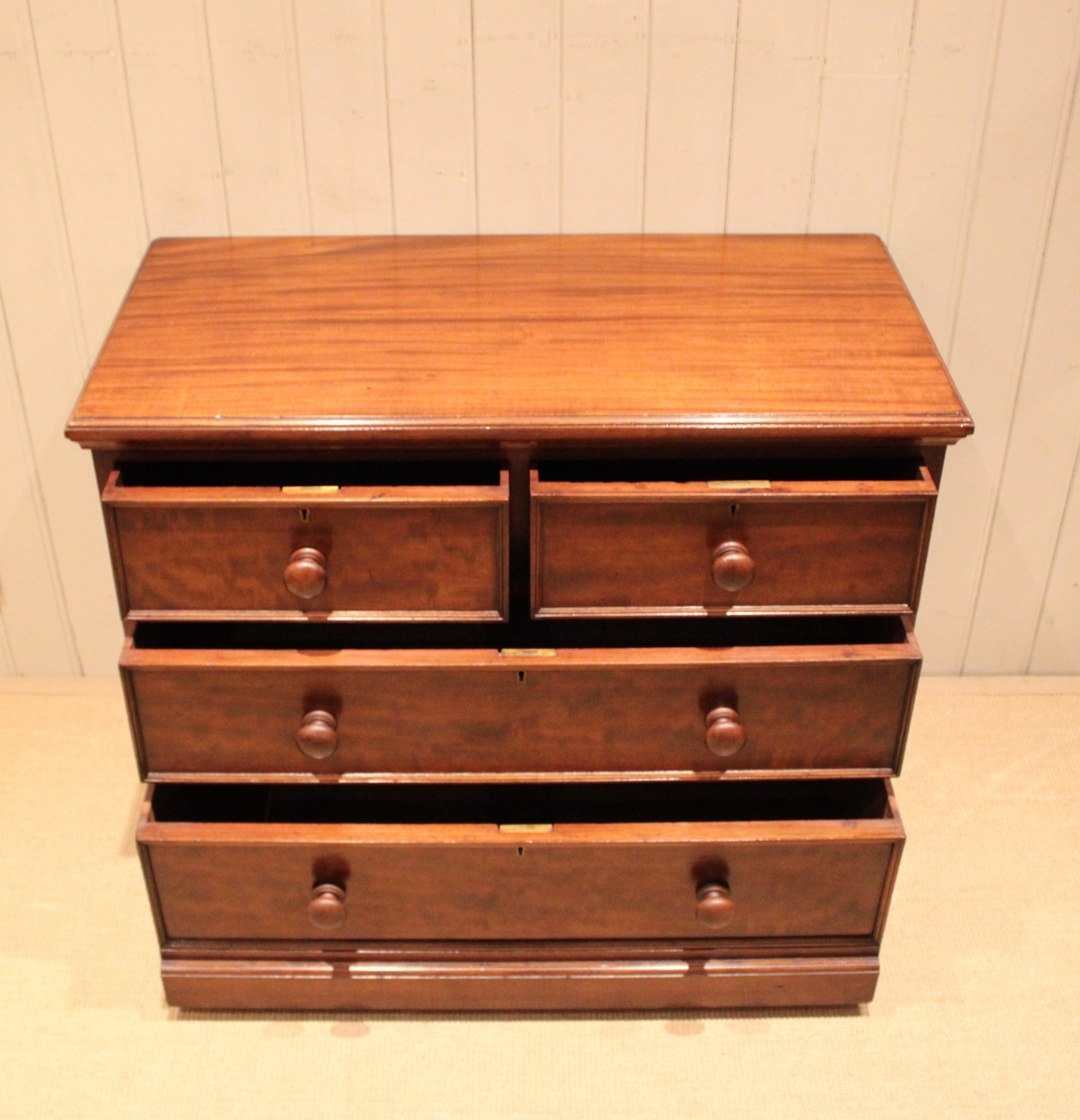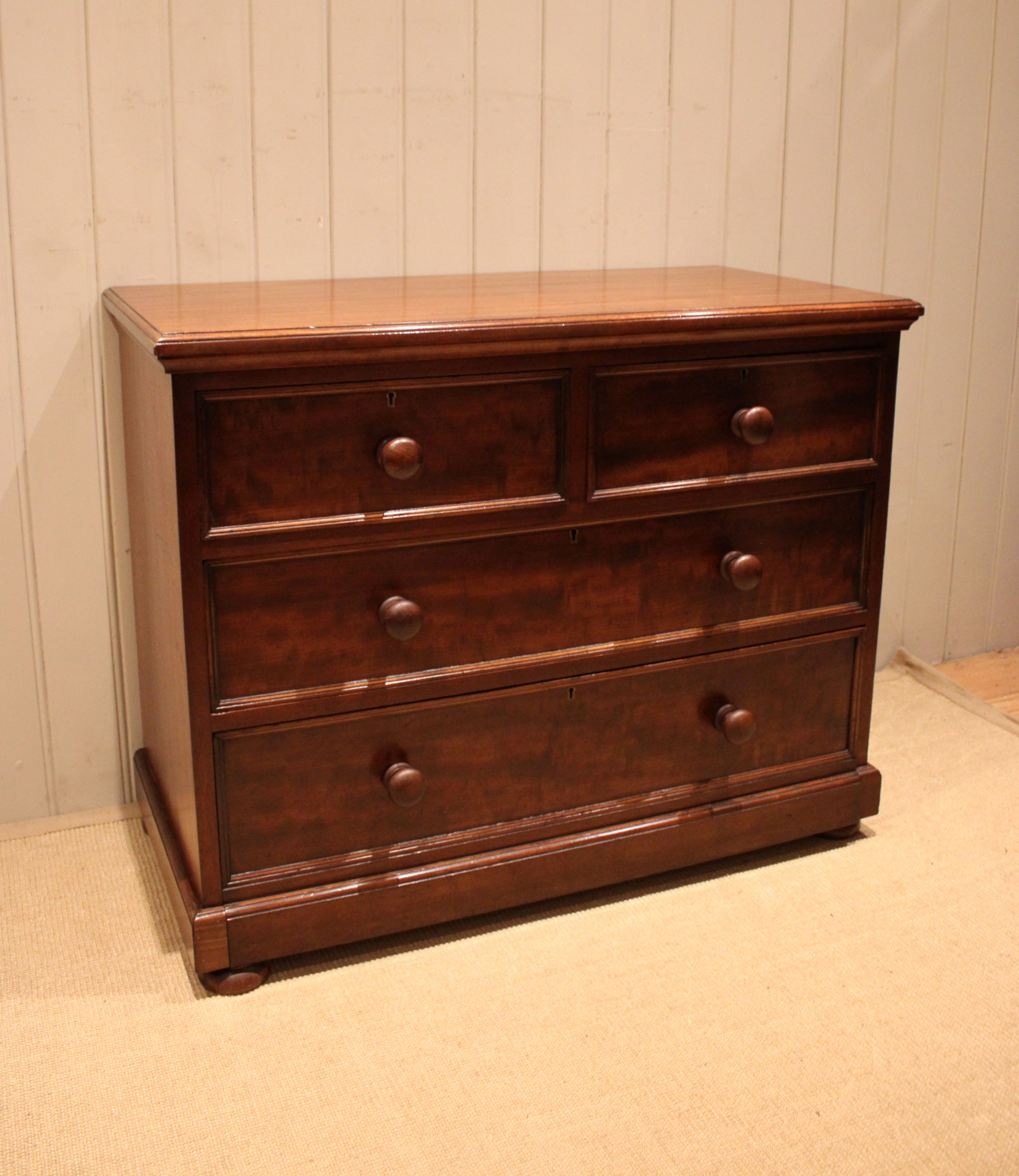 Late 19th century solid mahogany low chest of two short and two long drawers with turned wooden handles , raised on a plinth base . The drawer depths are from the bottom up 26.6 cm deep , 17 cm deep and at the top 15 cm deep . Still bearing the original makers label of James Shoolbred London