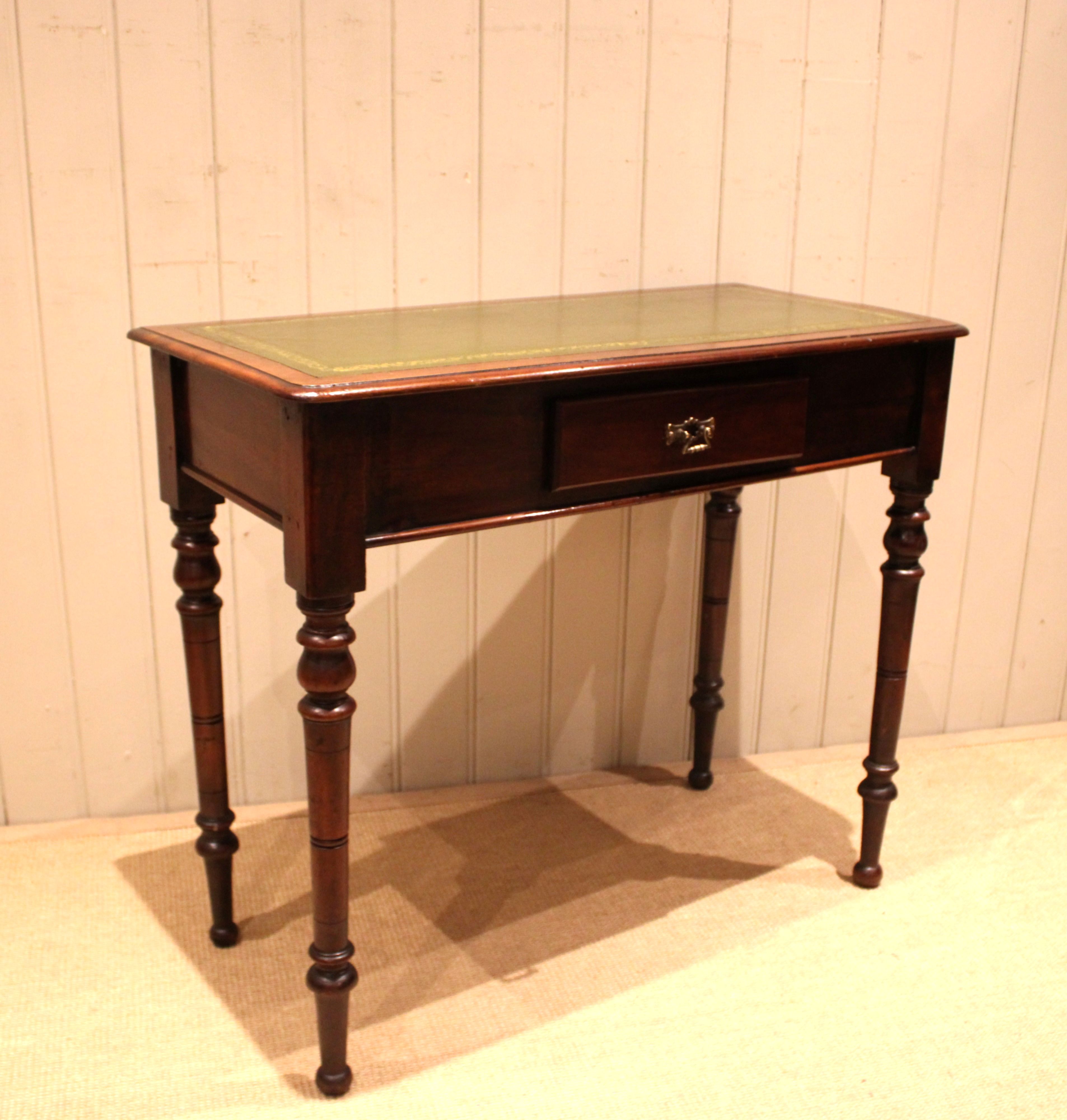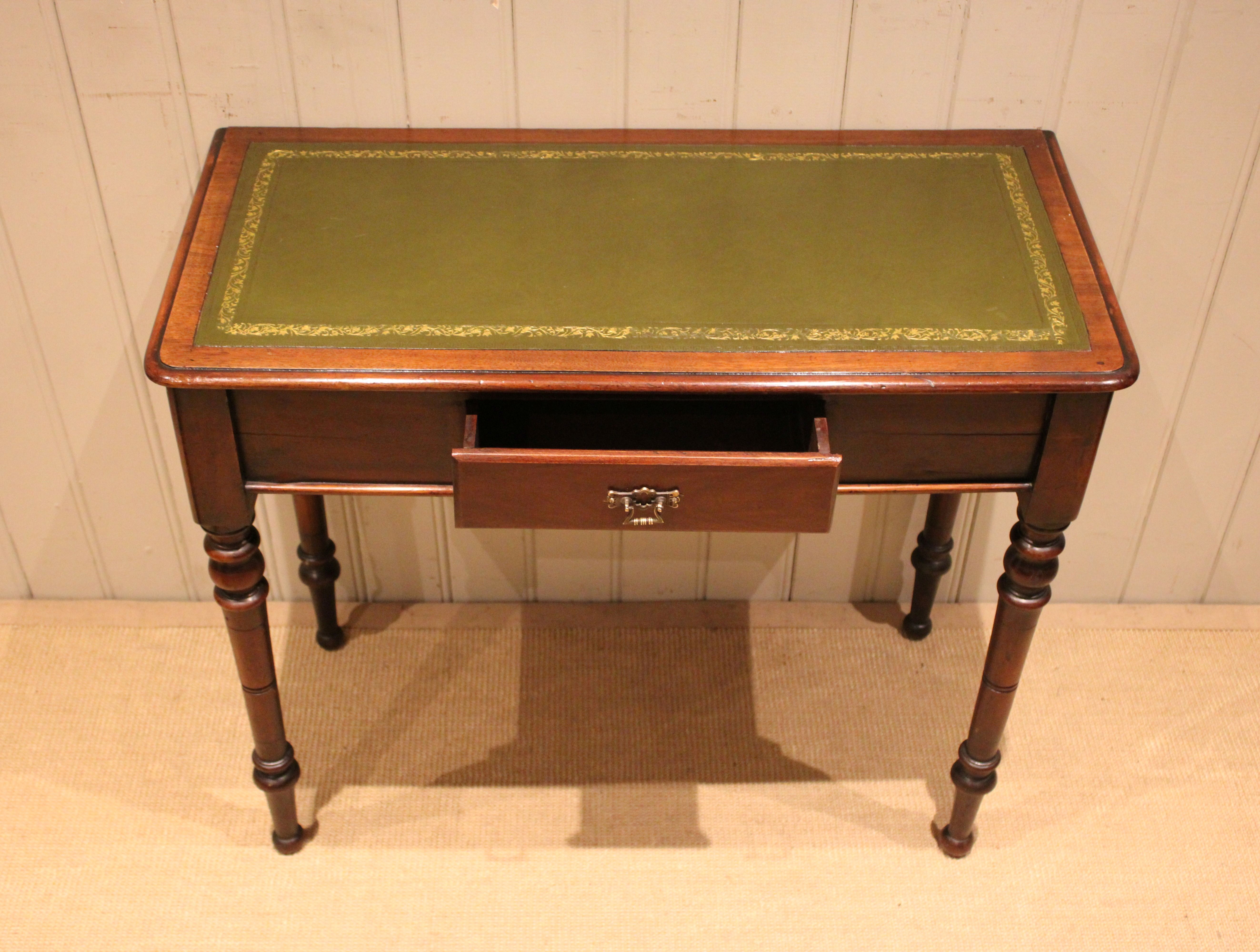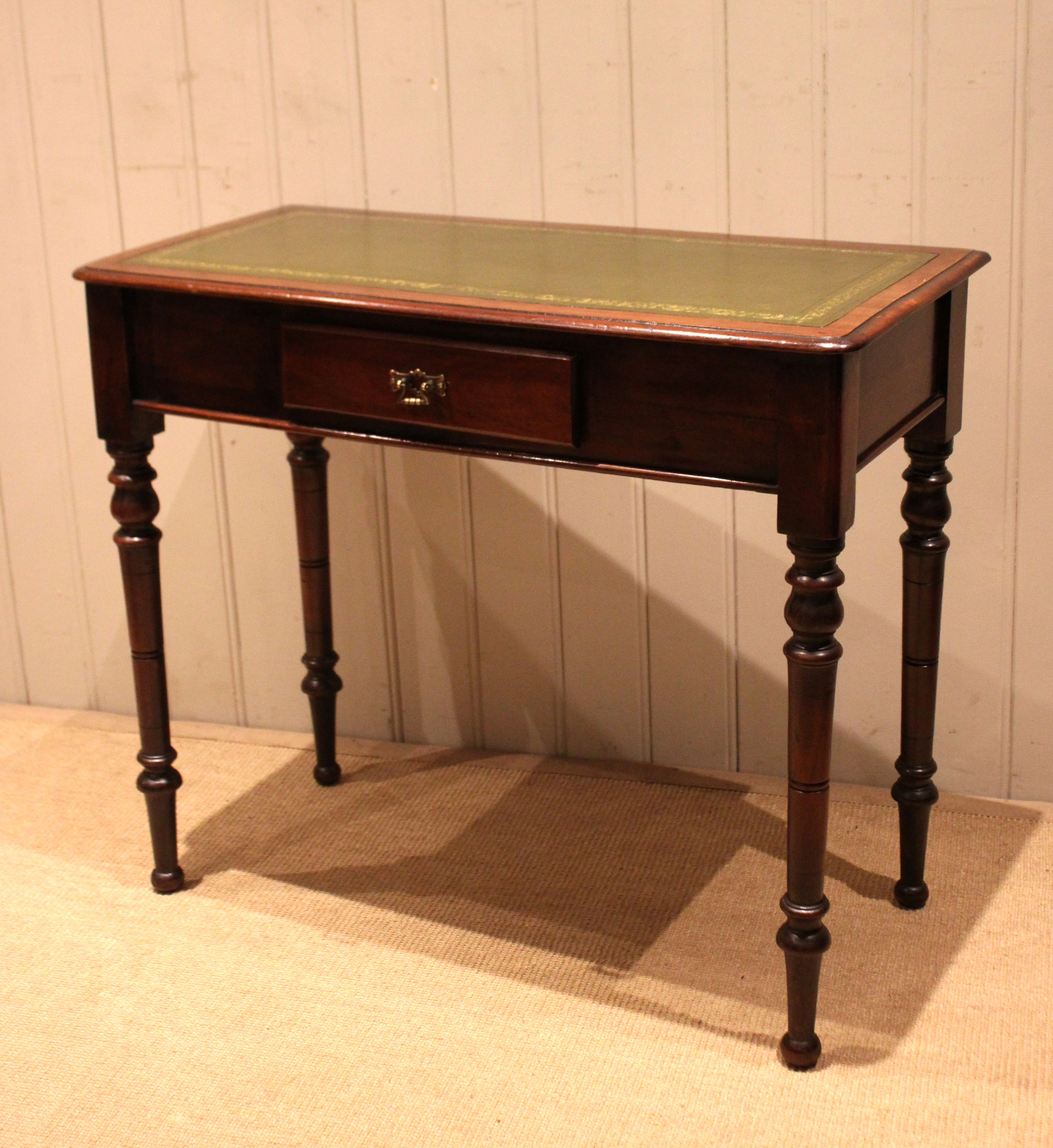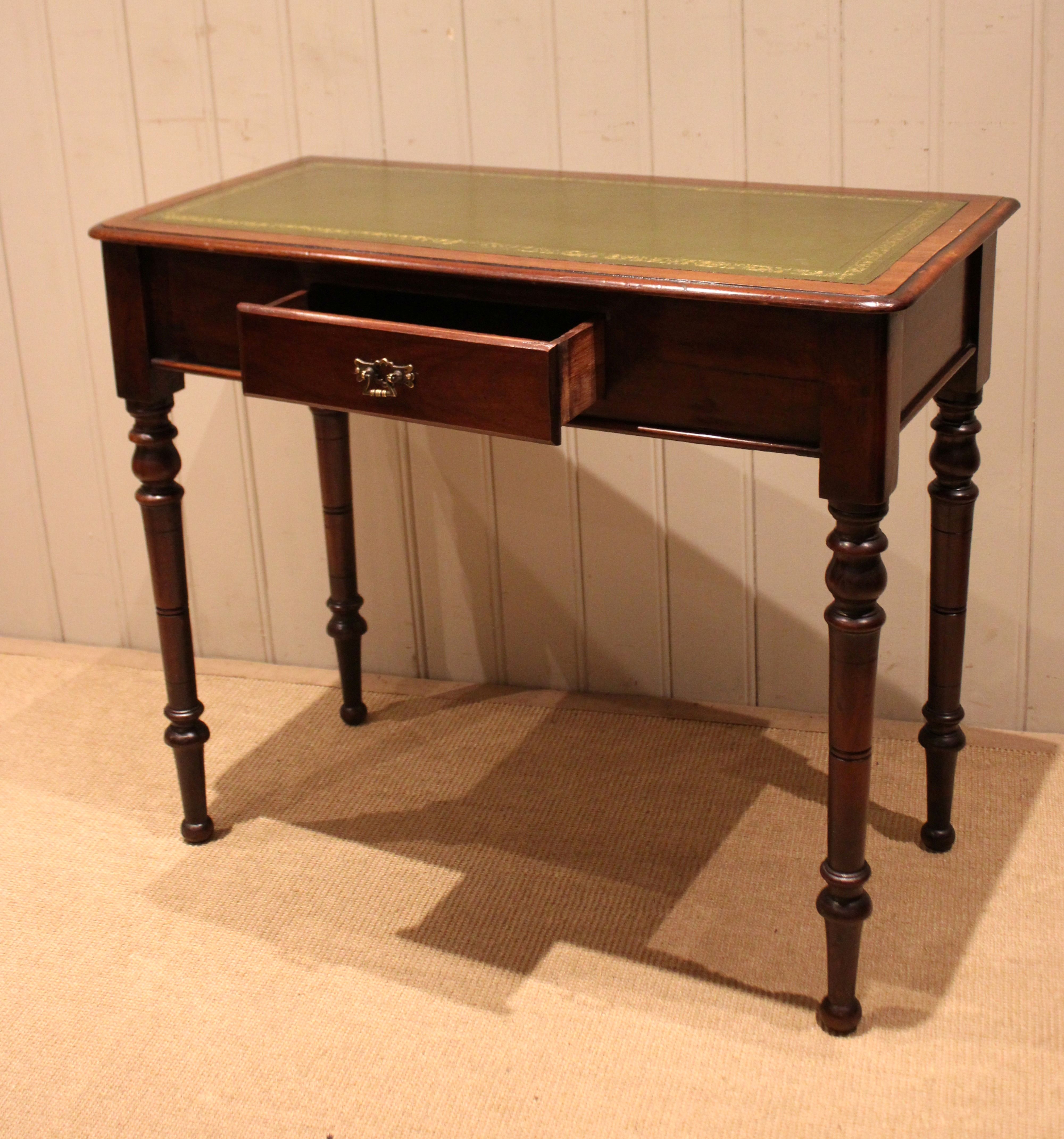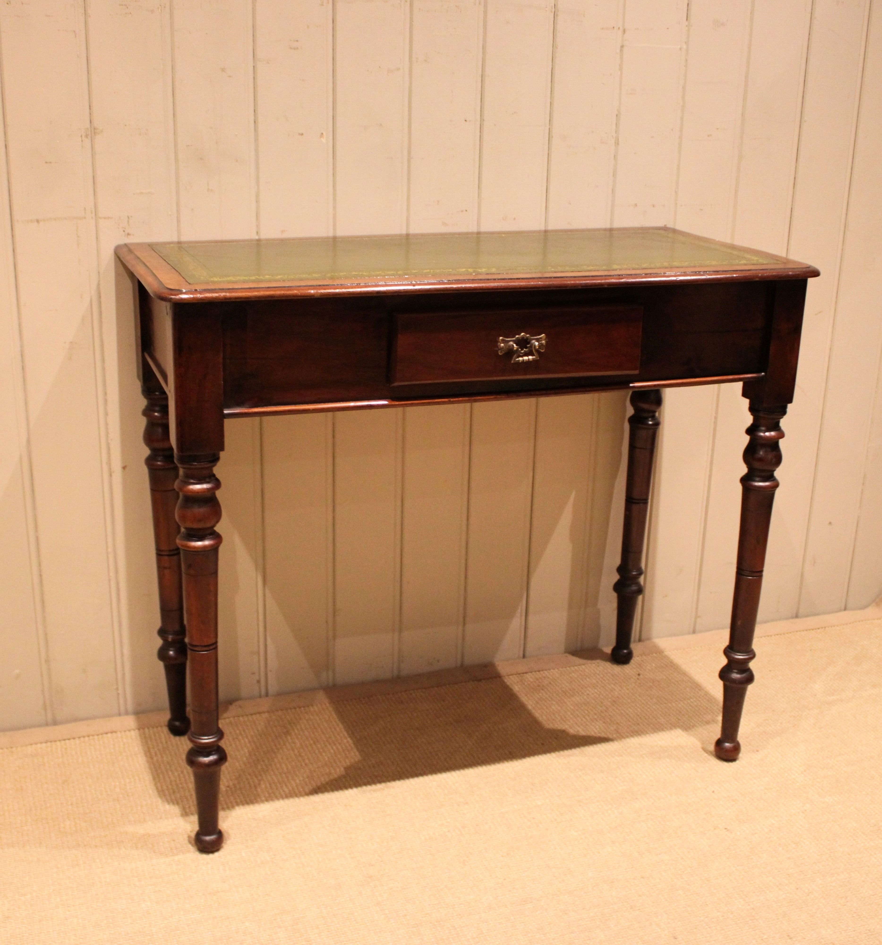 Late 19th century mahogany hall table having a leather top with a single drawer , raised on turned tapering legs . The height to the under tier is 59.5 cm
