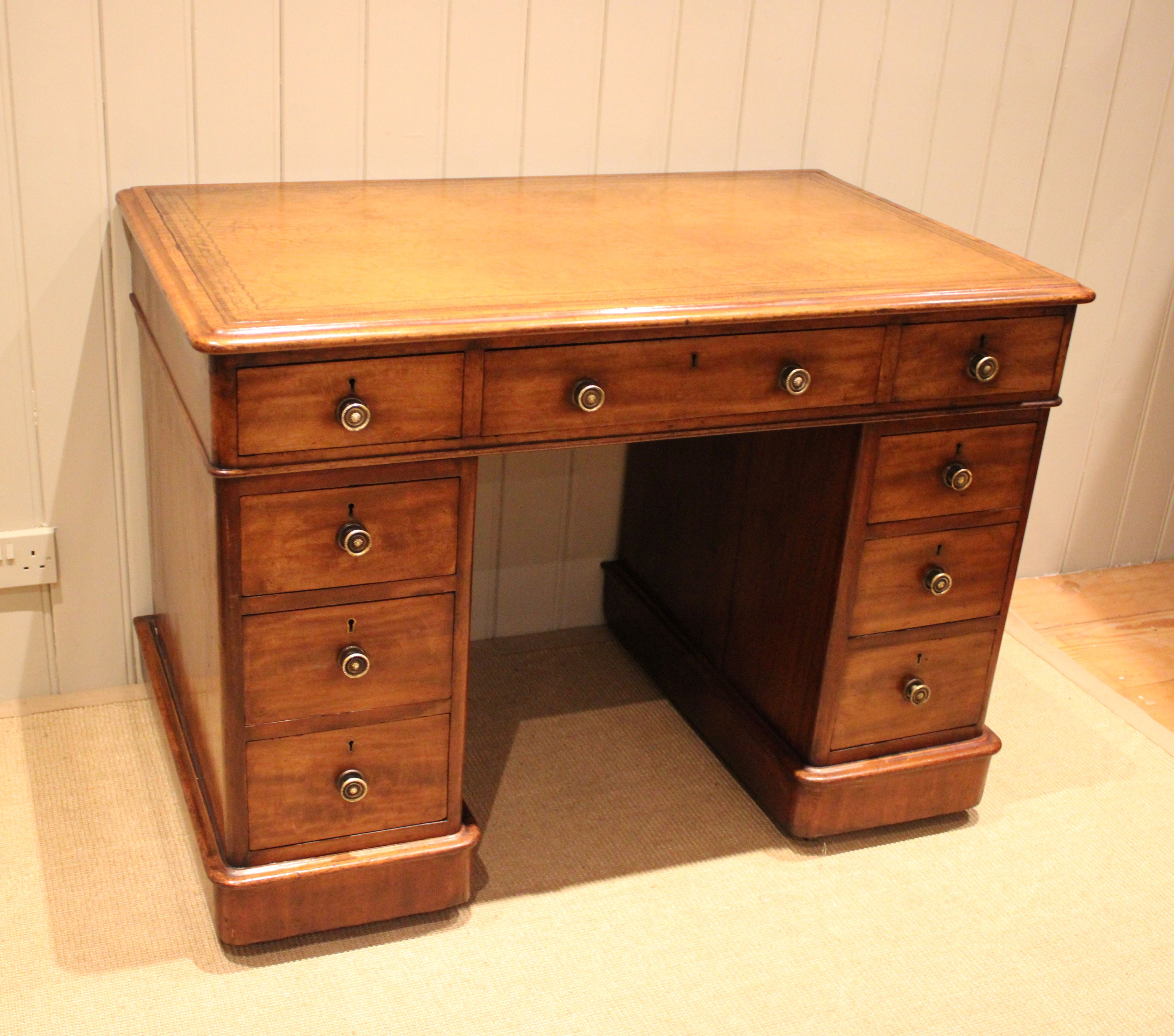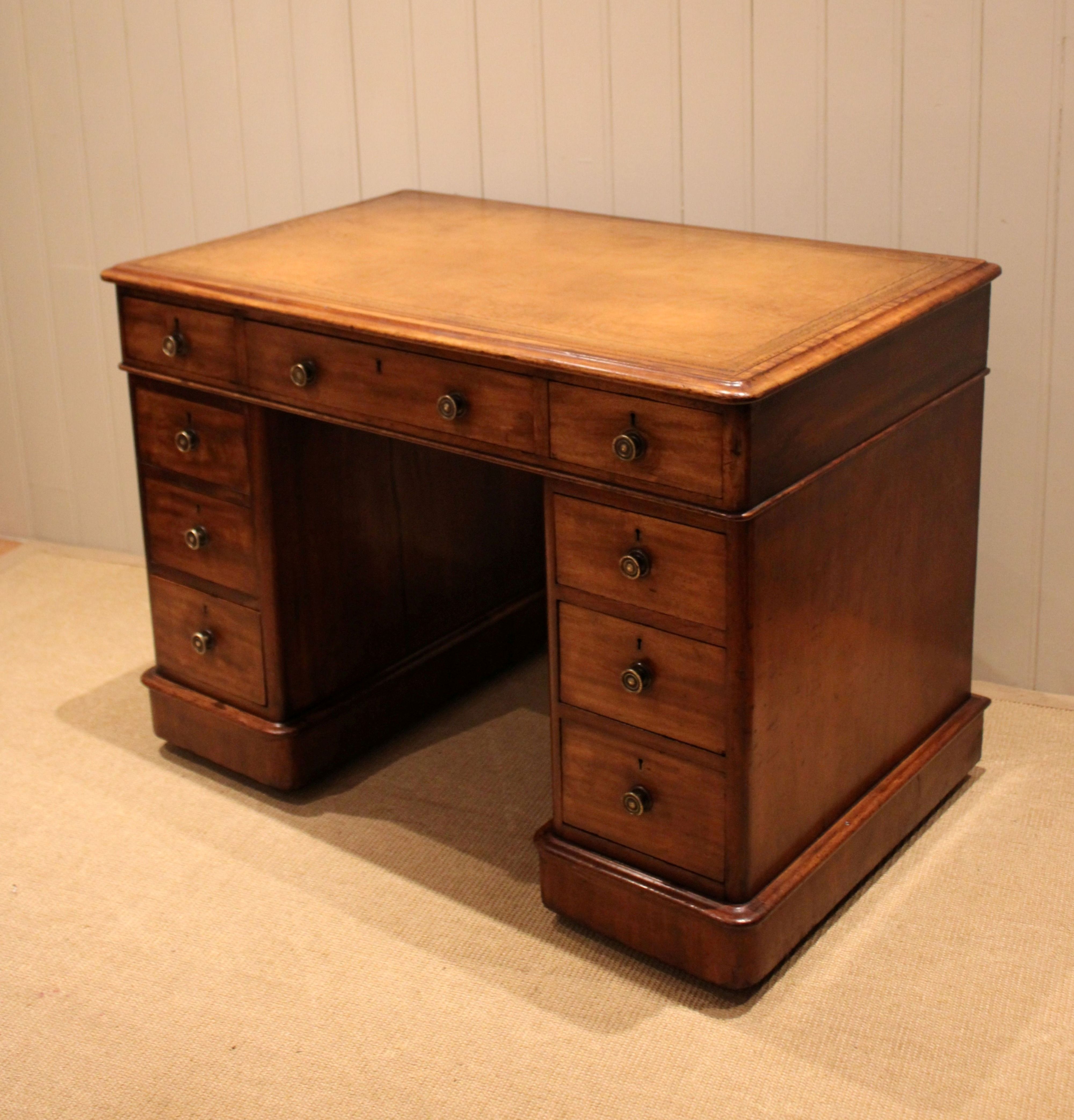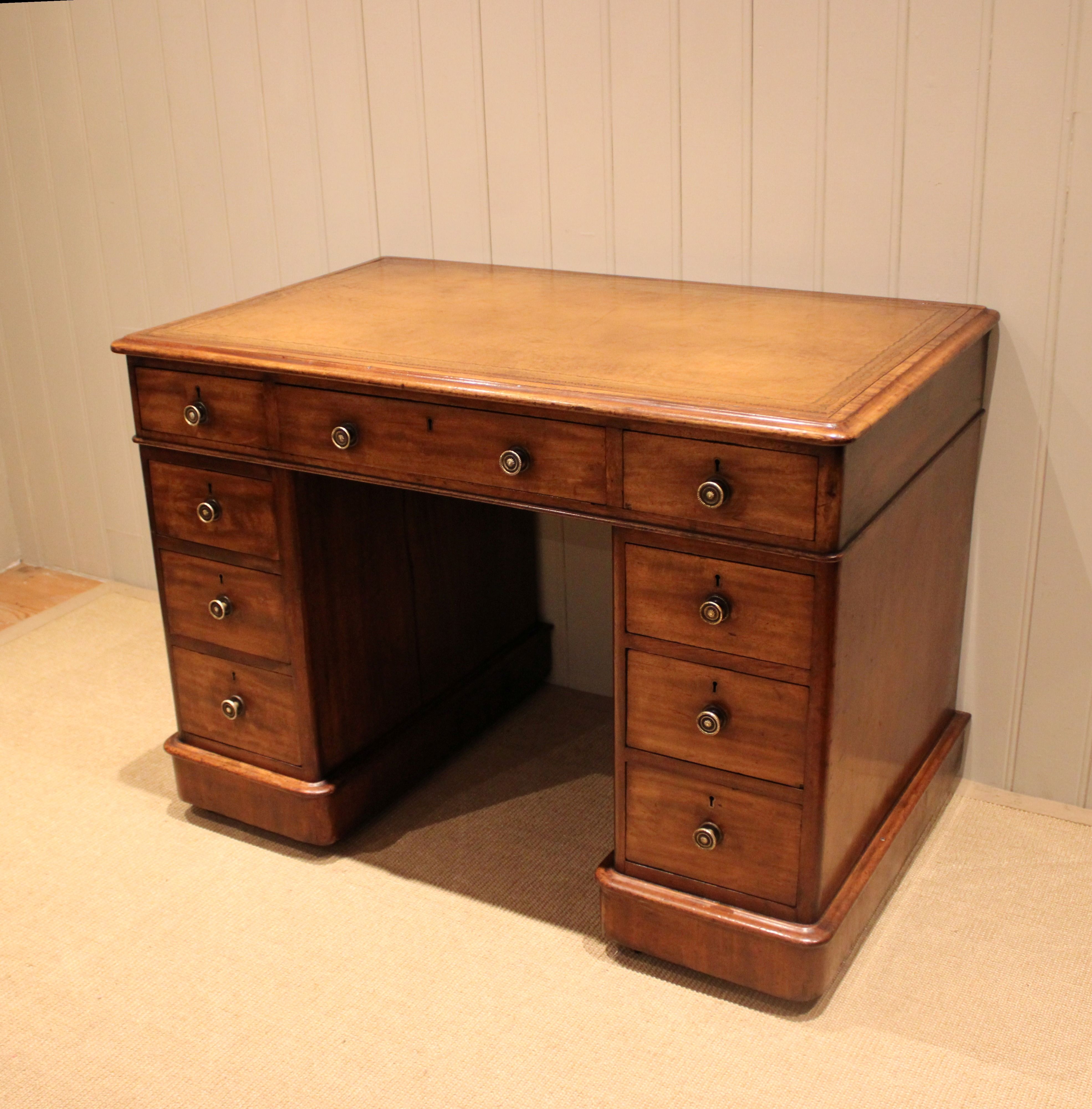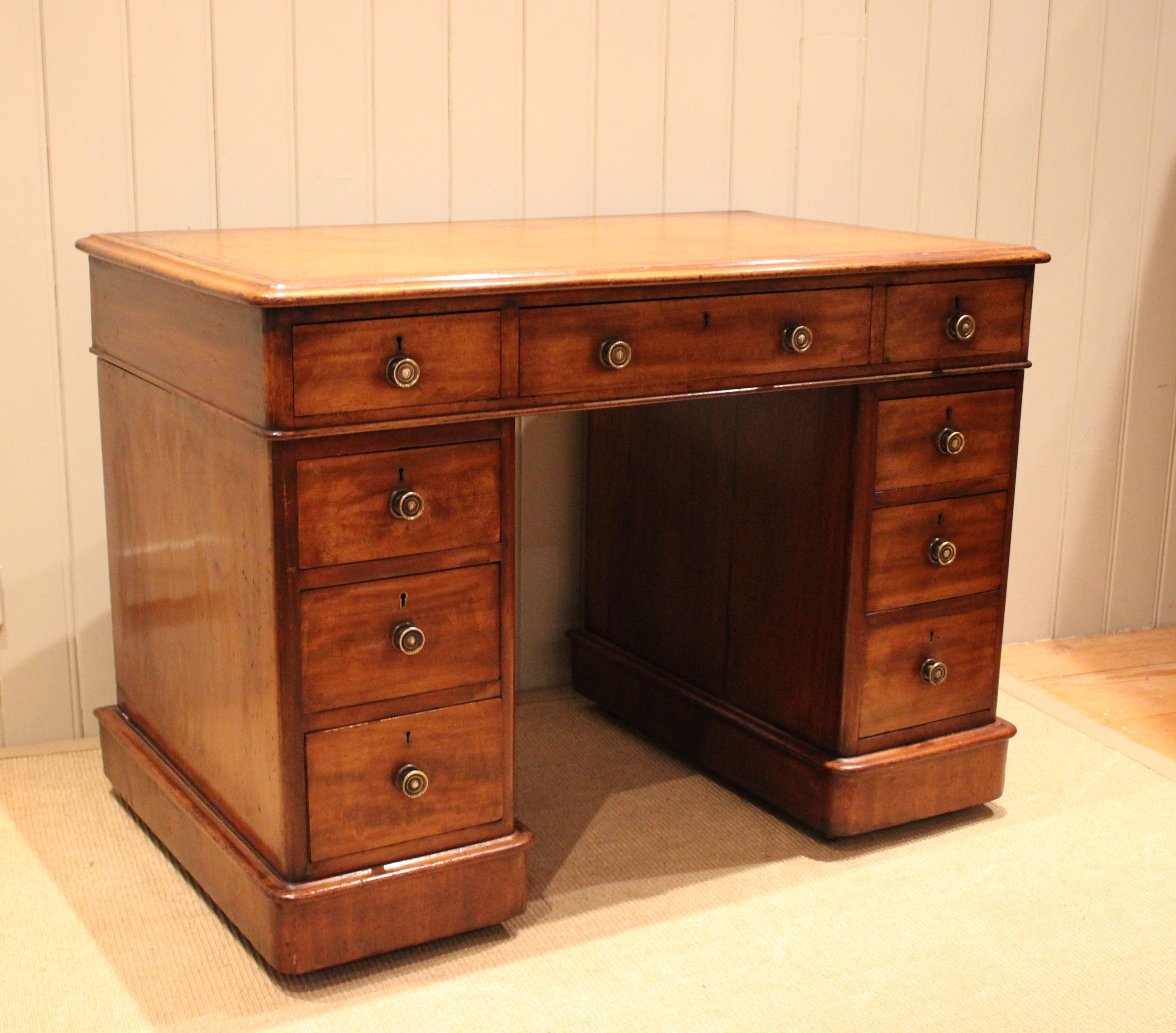 Late 19th century mahogany pedestal desk having a tooled leather top with a central drawer flanked by a further four to each side , raised on a plinth base with the original castors . The pedestal measures 43cm wide by 61 cm high .